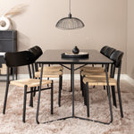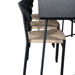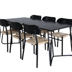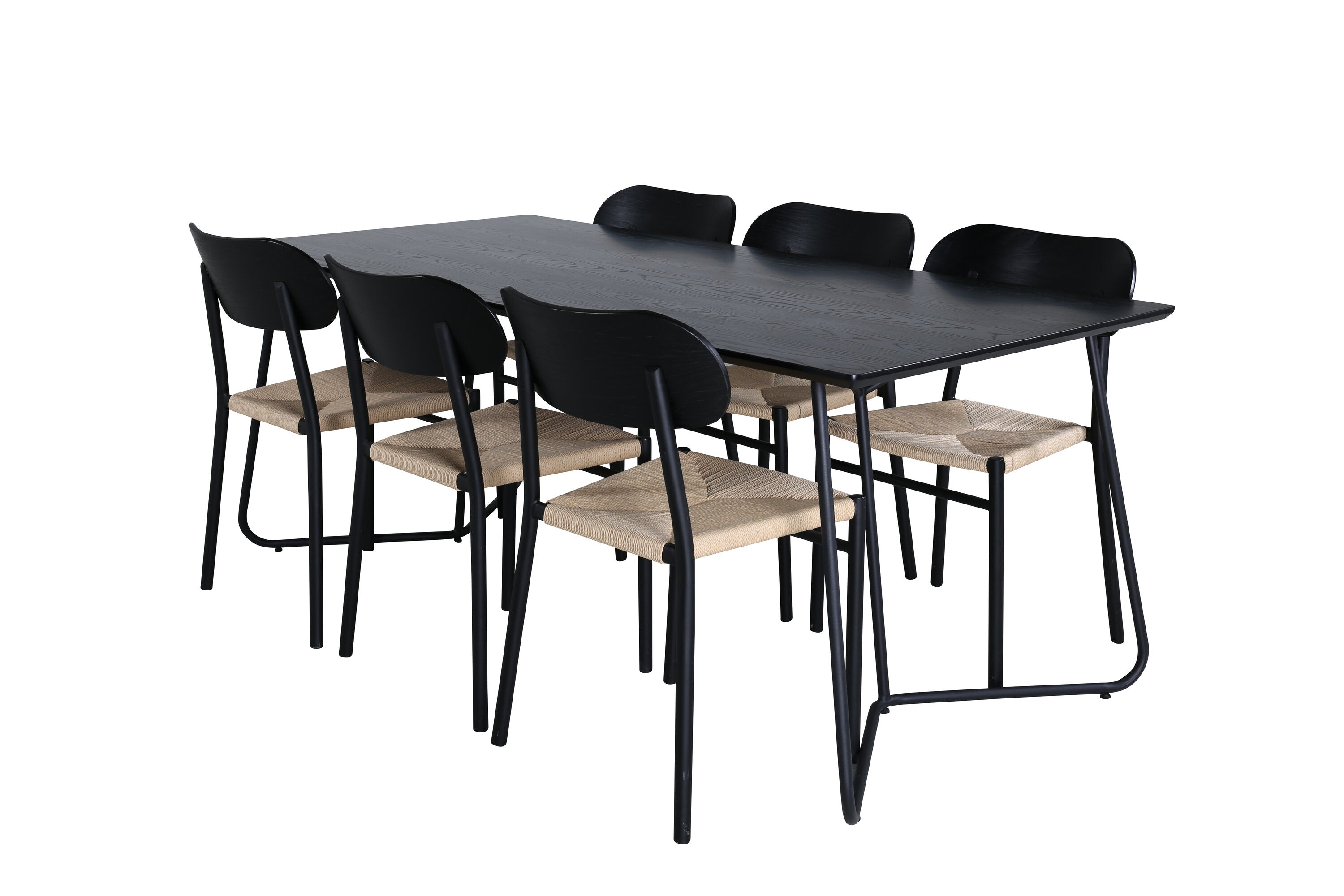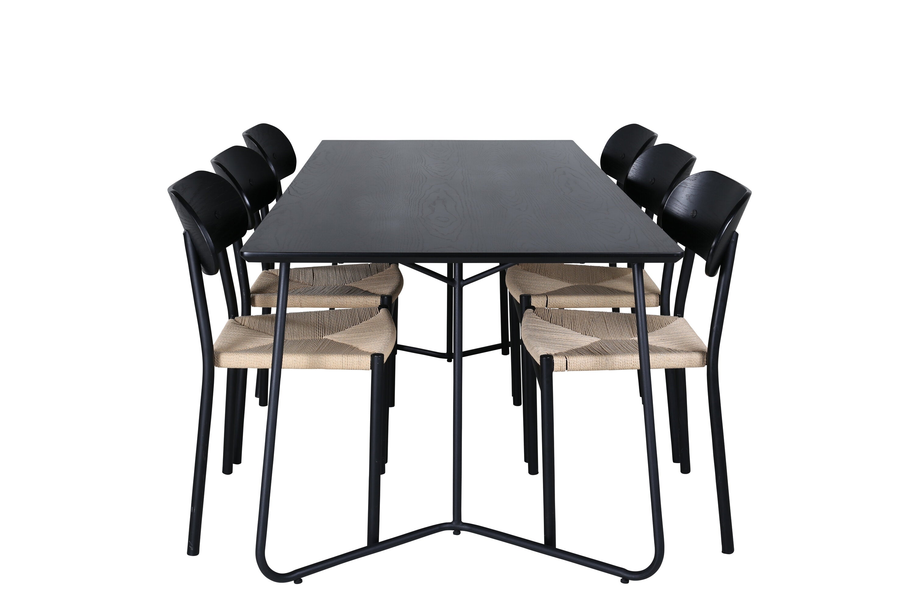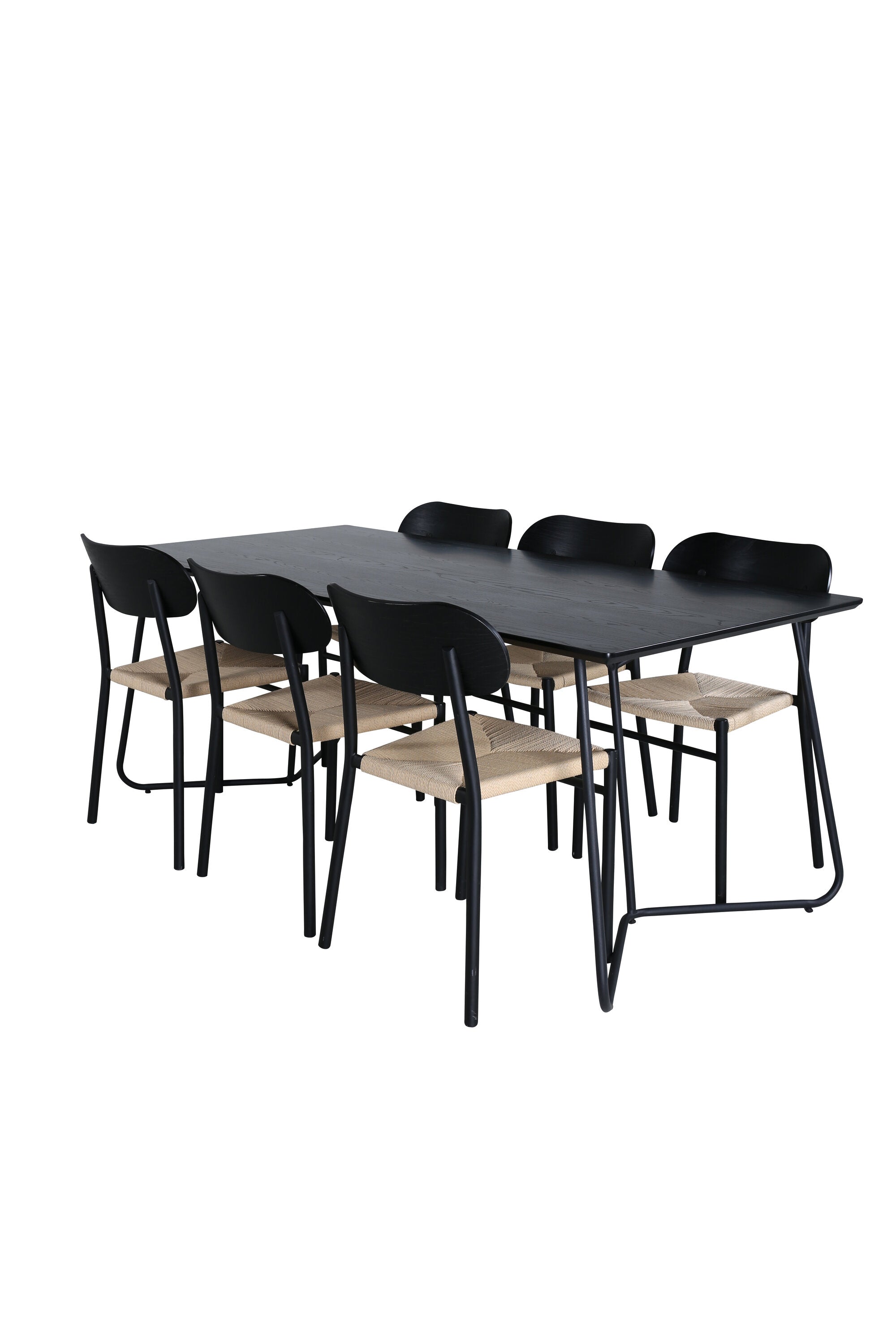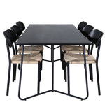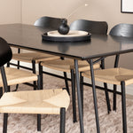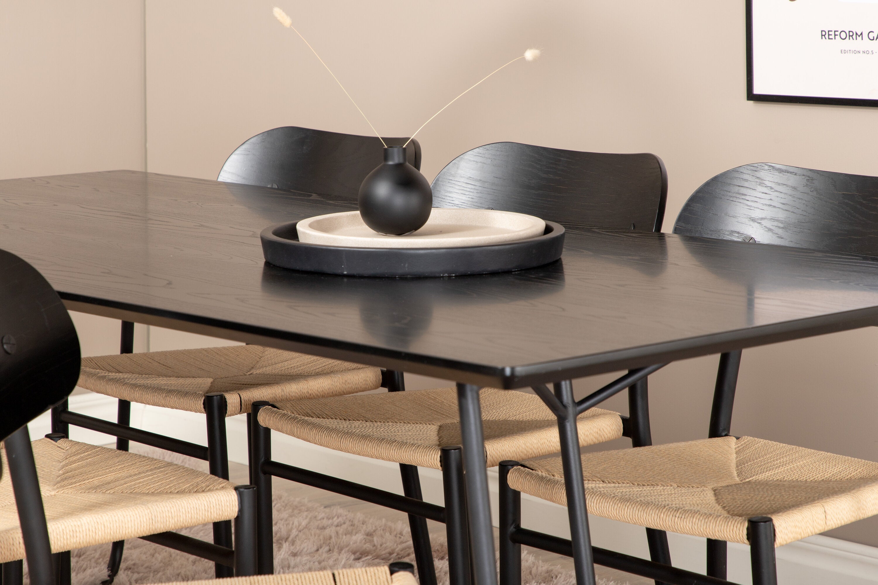 Módní skupina jídel, která se skvěle hodí do obývacího pokoje! Jídelní stůl Petra má promyšlený design se skandinávskými tvary, který působí stylově, úzké, lehce rozšířené nohy ze železa a stolní deska z černé MDF s dýhou. Rozměry stolu: Délka: 190 cm, Šířka: 90 cm, Výška: 75 cm. Zde v dokonalé kombinaci se 6 jídelními židlemi ze série Polly. Nohy židle jsou z černého kovu a sedáky v přírodní barvě z lan. Rozměry židle: výška: 88 cm, výška sedáku: 47 cm, šířka: 42 cm, hloubka: 55 cm. Nechte toto krásně sladěné jídlo s moderním nádechem stát se přirozeným místem setkávání u vás doma.