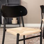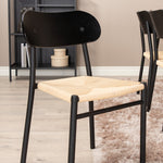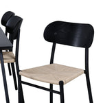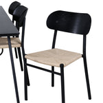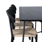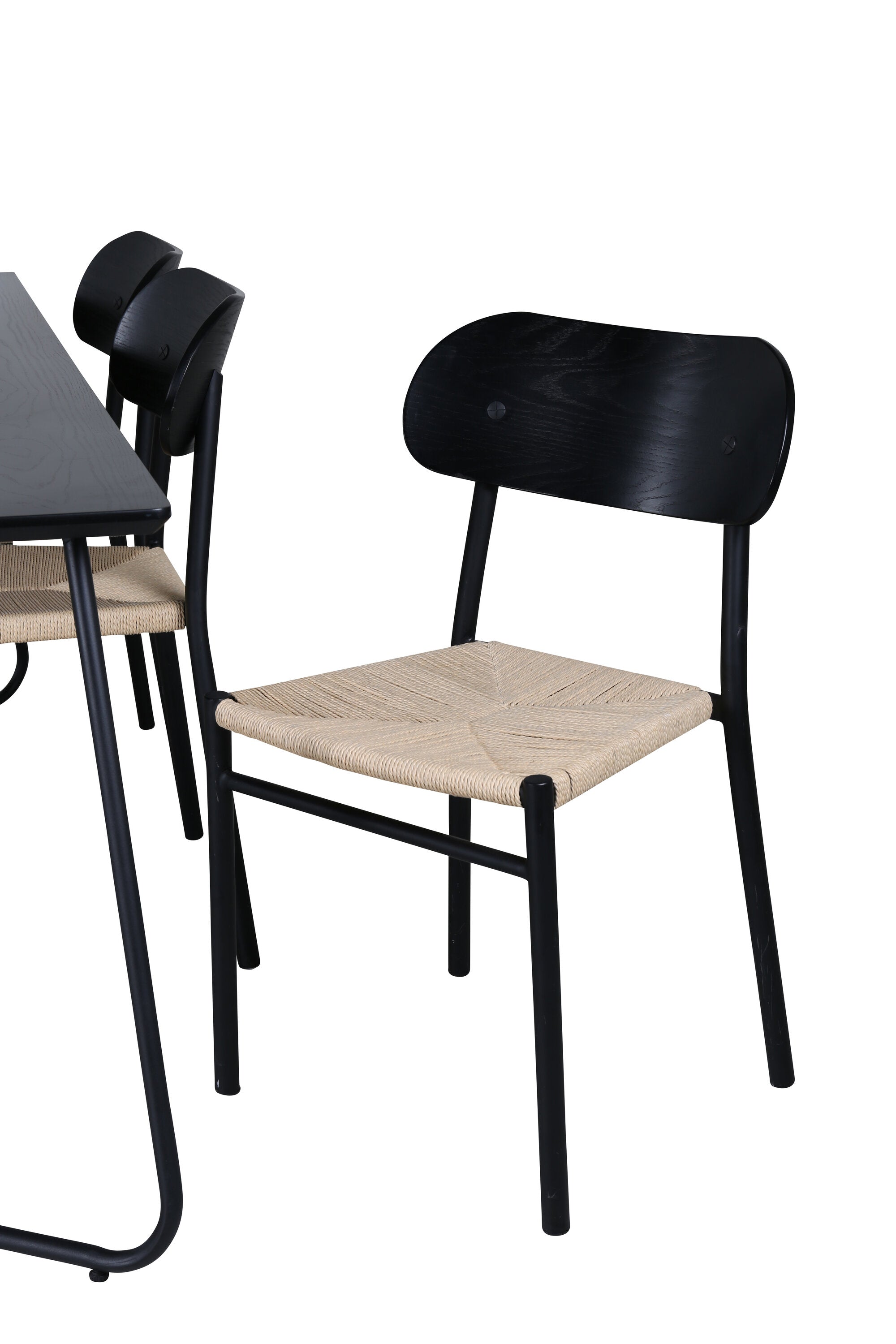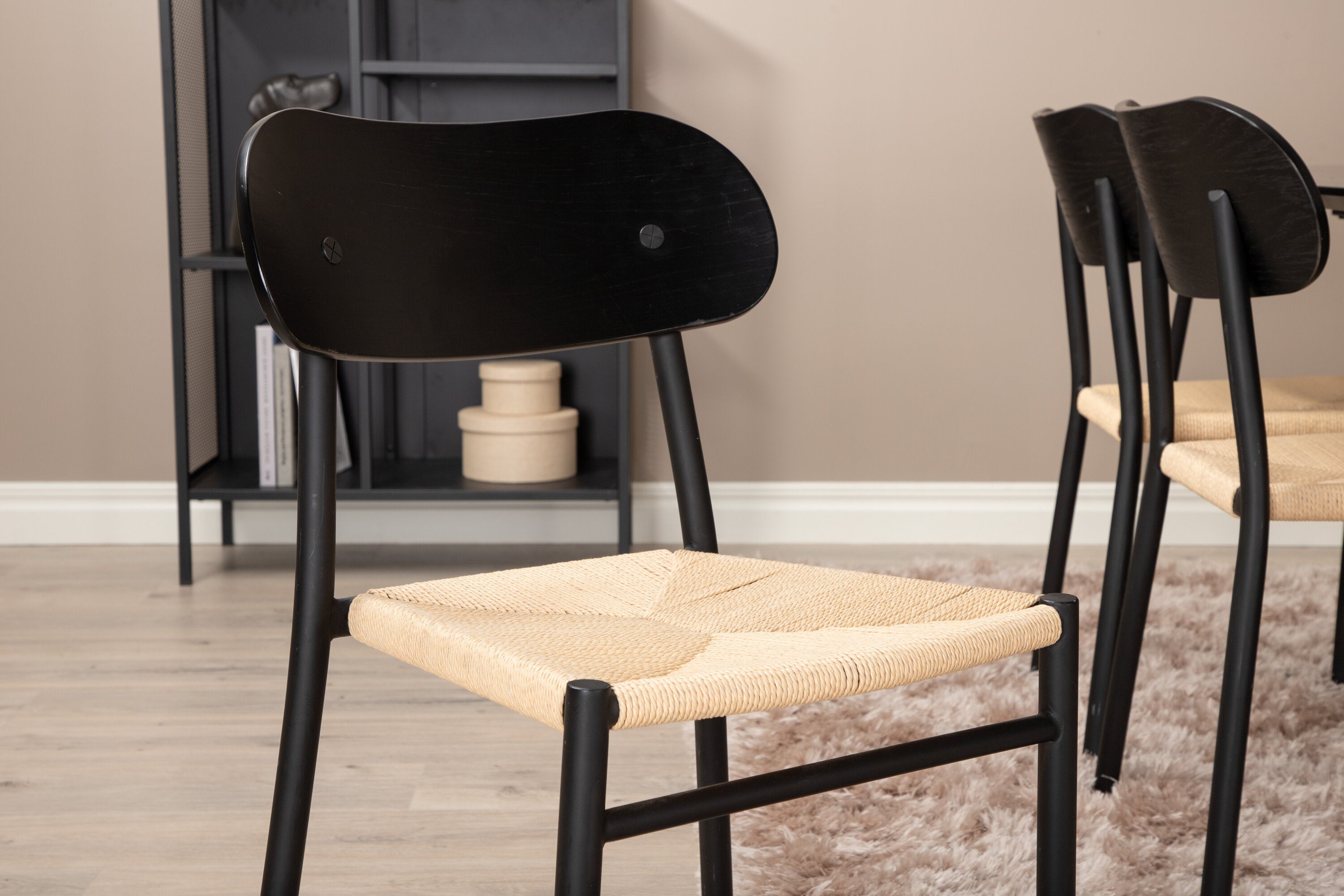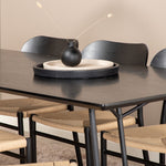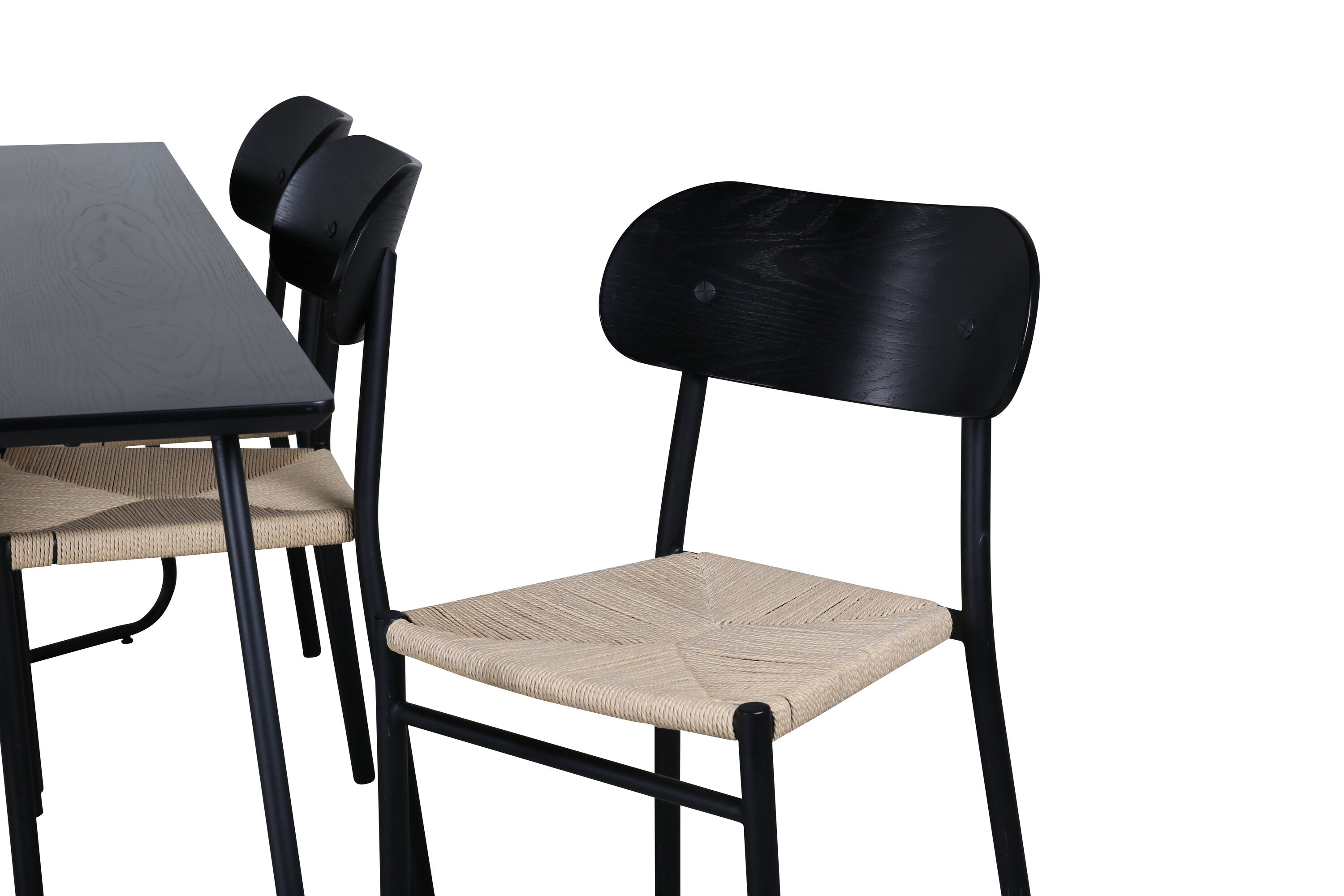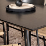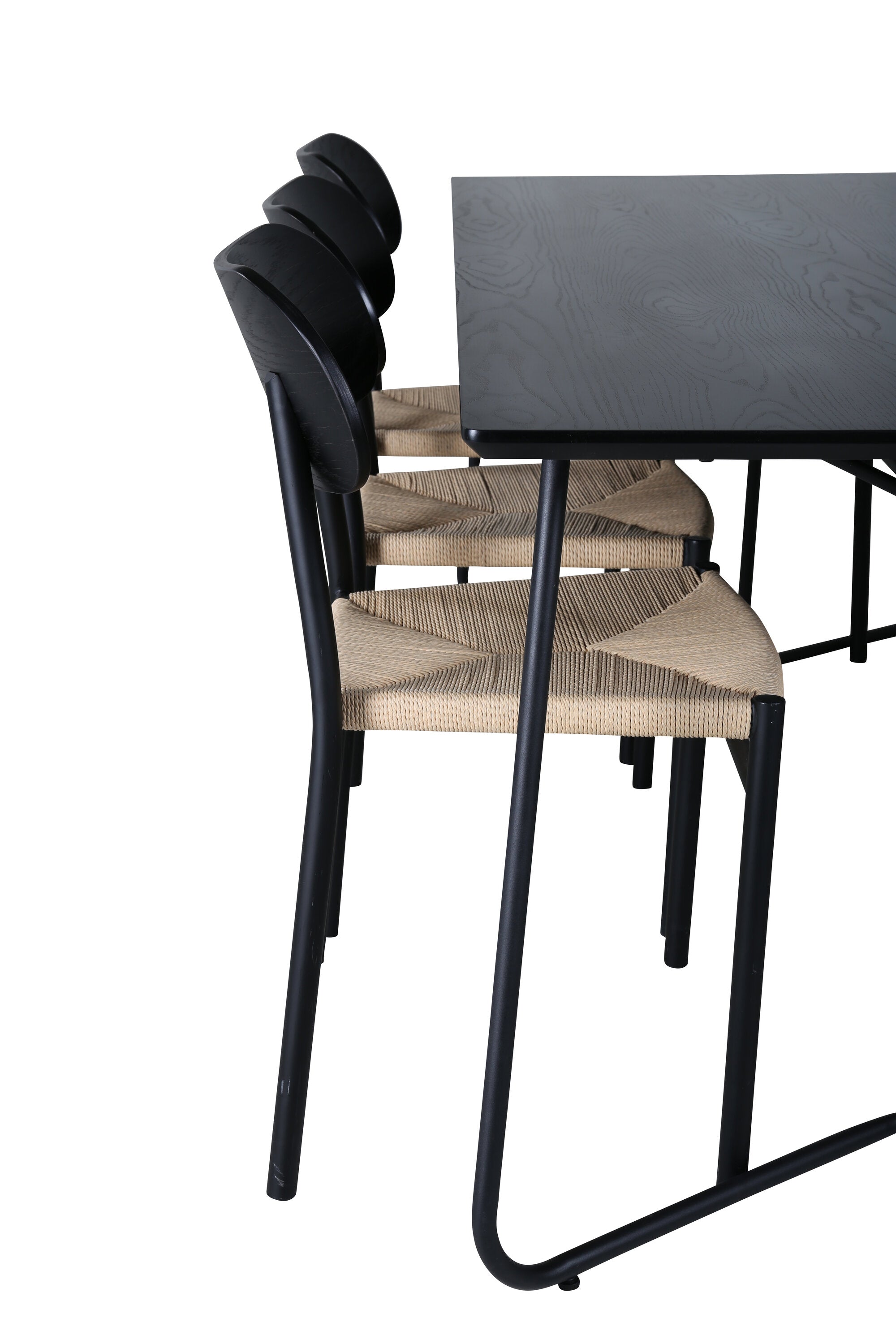 Módní skupina jídel, která se skvěle hodí do obývacího pokoje! Jídelní stůl Petra má promyšlený design se skandinávskými tvary, který působí stylově, úzké, lehce rozšířené nohy ze železa a stolní deska z černé MDF s dýhou. Rozměry stolu: Délka: 190 cm, Šířka: 90 cm, Výška: 75 cm. Zde v dokonalé kombinaci se 6 jídelními židlemi ze série Polly. Nohy židle jsou z černého kovu a sedáky v přírodní barvě z lan. Rozměry židle: výška: 88 cm, výška sedáku: 47 cm, šířka: 42 cm, hloubka: 55 cm. Nechte toto krásně sladěné jídlo s moderním nádechem stát se přirozeným místem setkávání u vás doma.