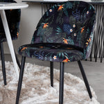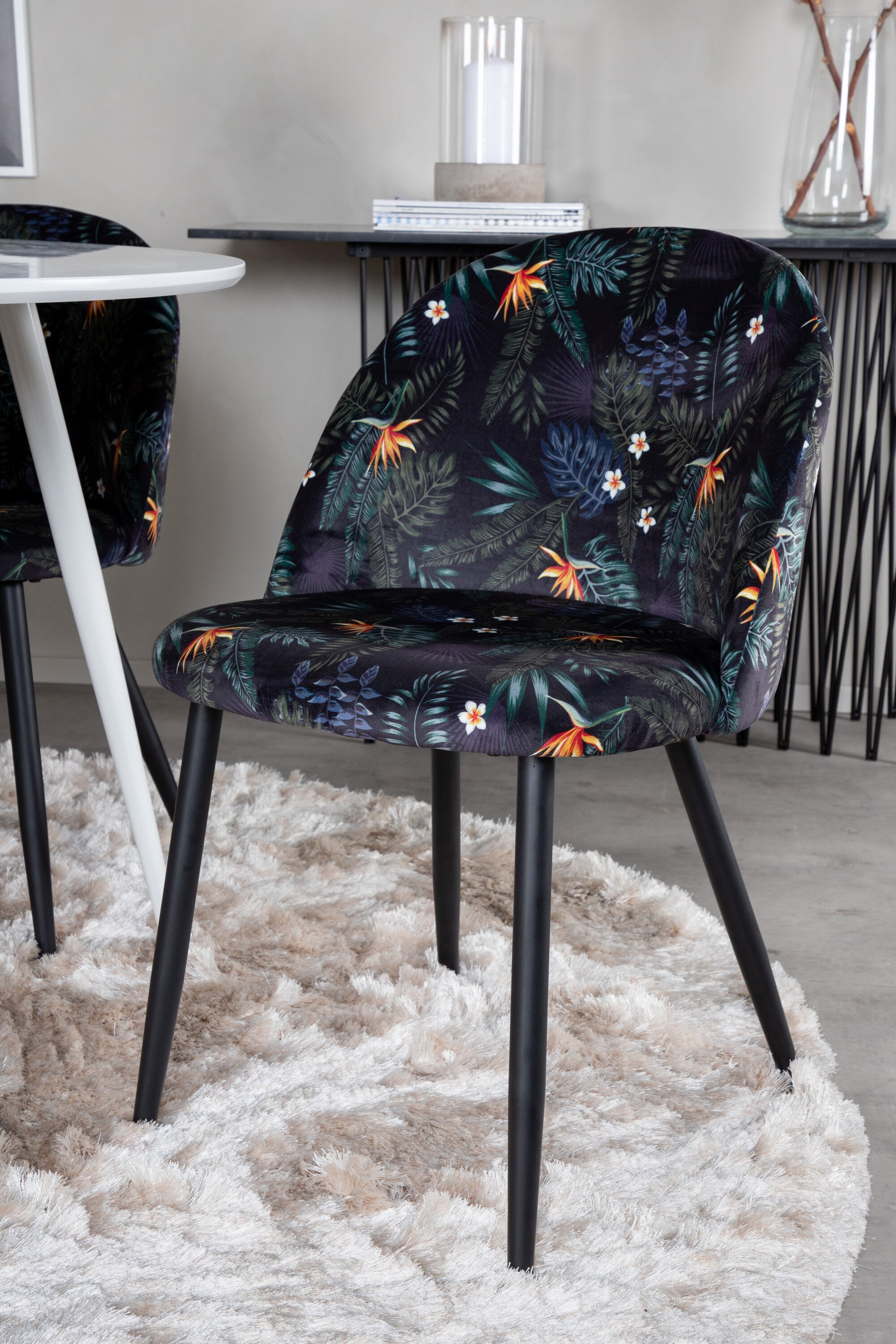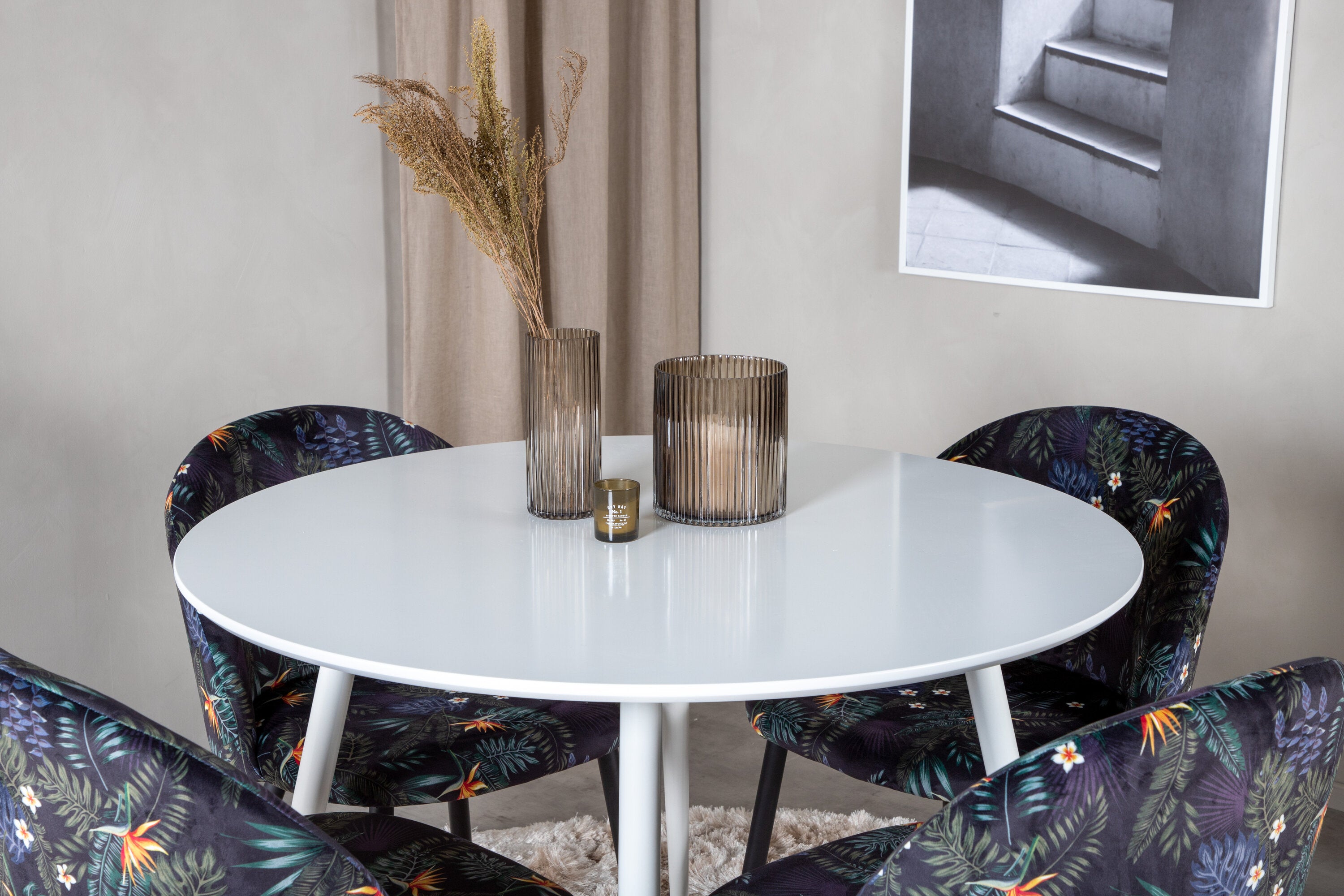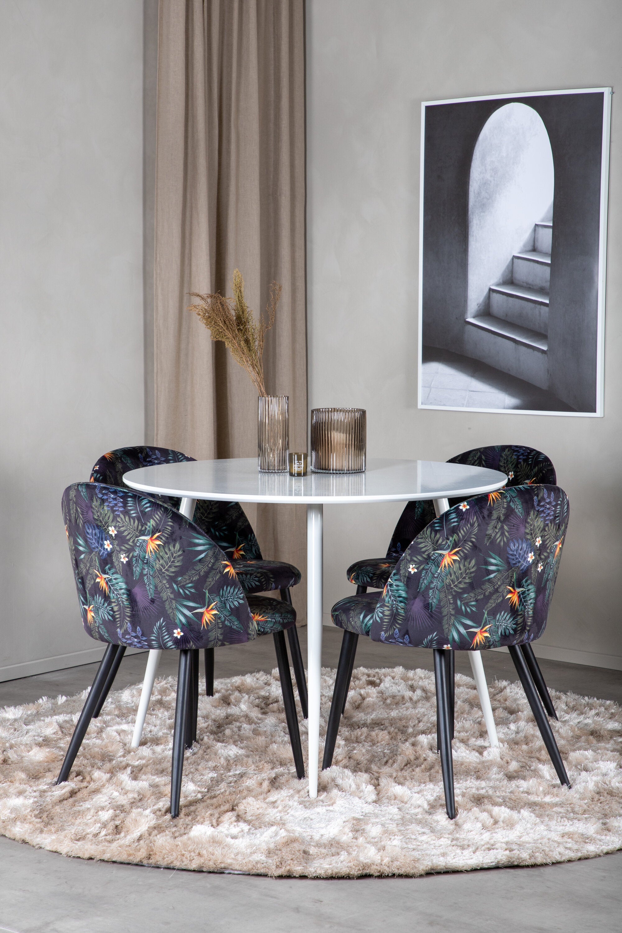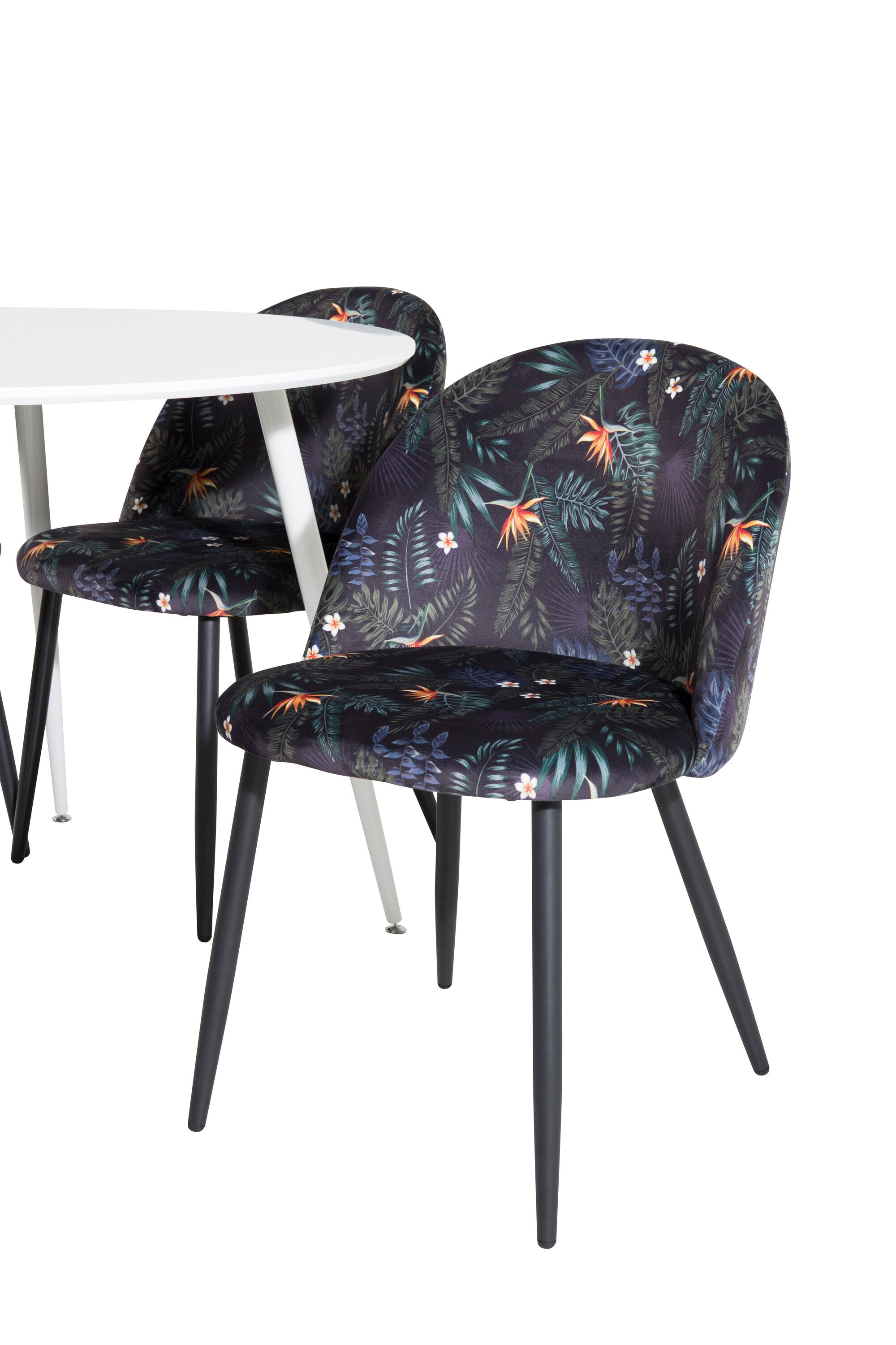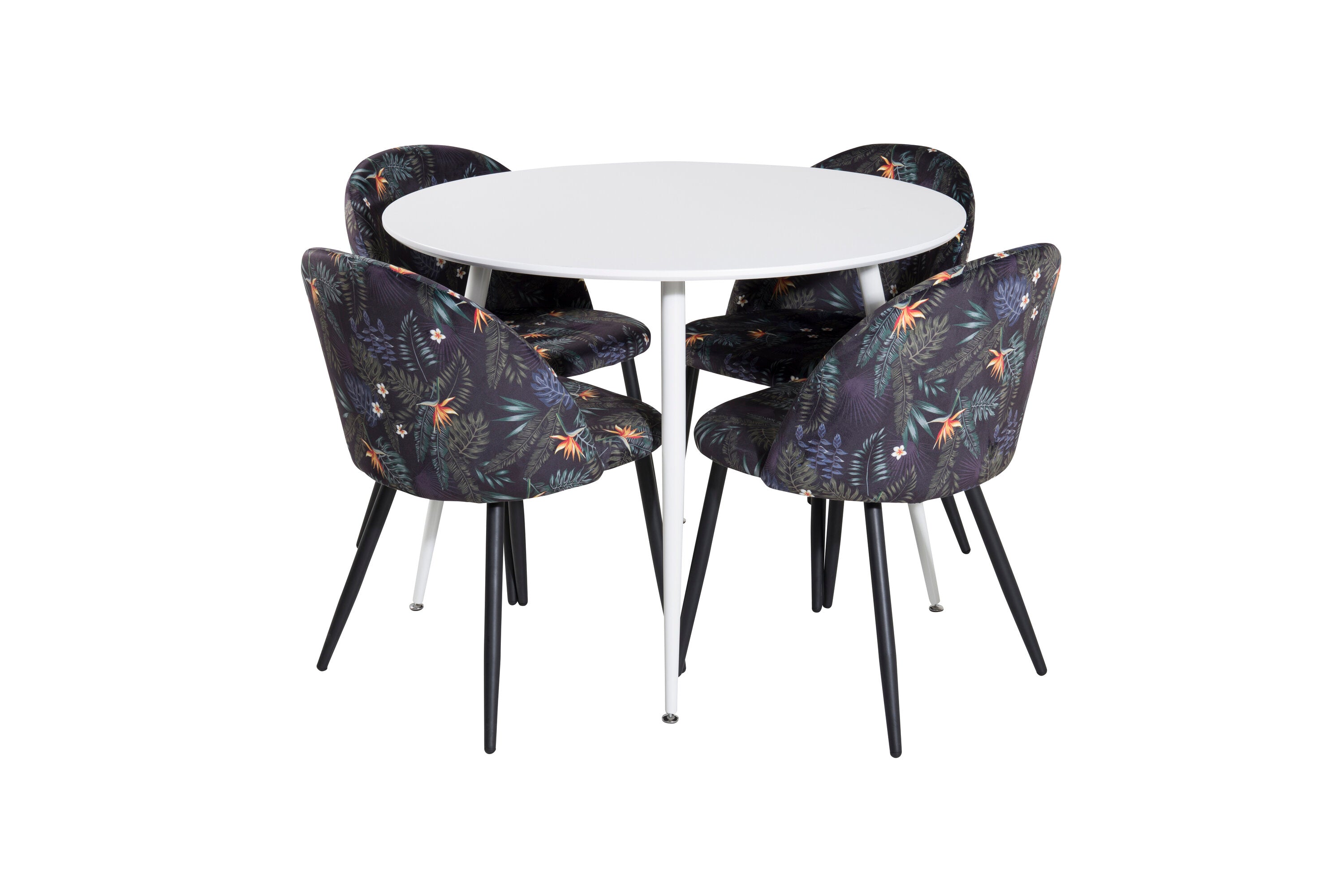 Plaza Kulatý stůl 100 cm - Bílá deska / Bílé nohy + Sametová jídelní židle - Black Flower fabric_4