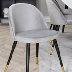 Nádherná a lákavá kombinace barev a materiálů. Jídelní stůl Polar Ellipse spolu s šedými sametovými jídelními židlemi je stylová a moderní skupina jídel, která zve k mnoha večeřím ve společnosti dobrých přátel.