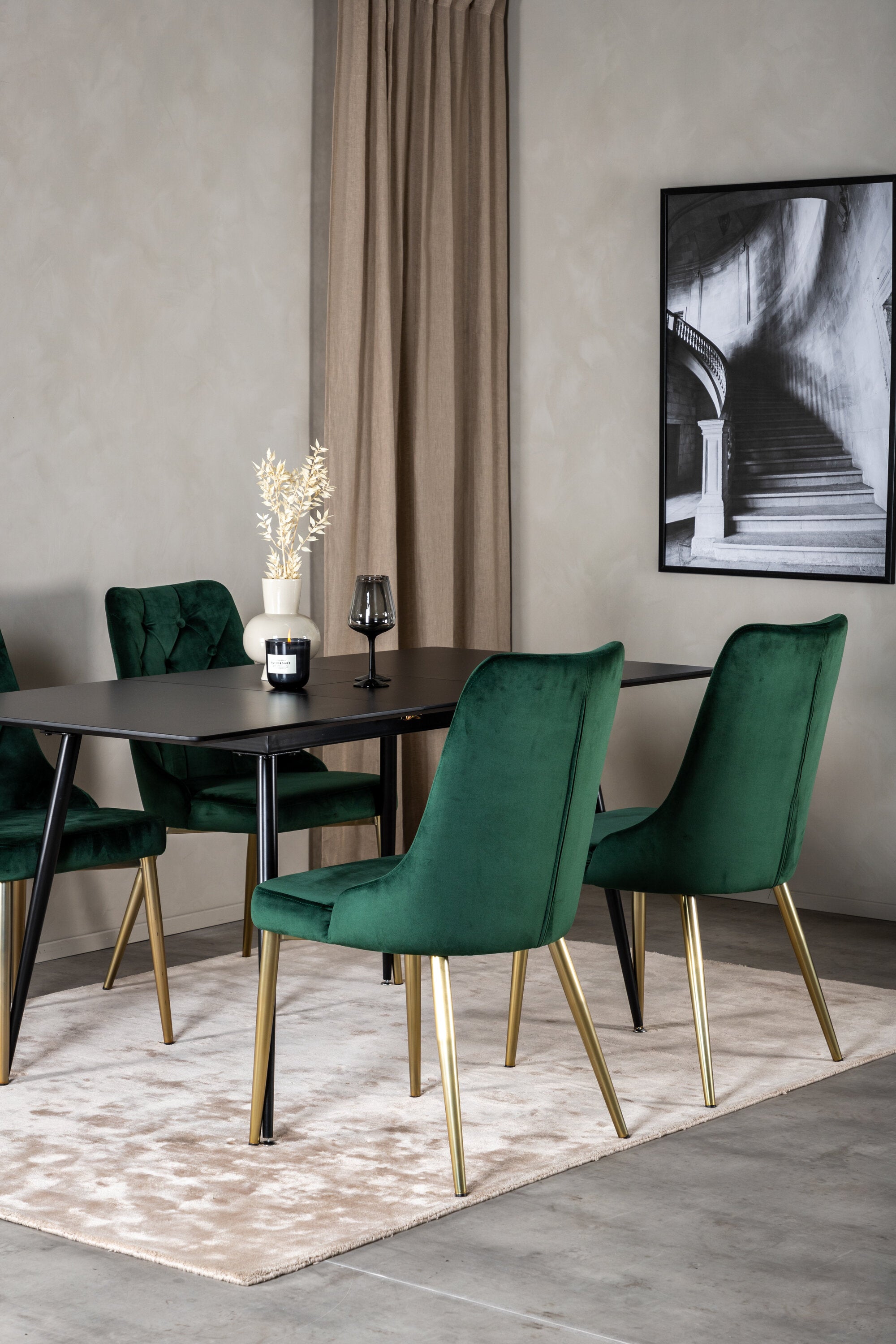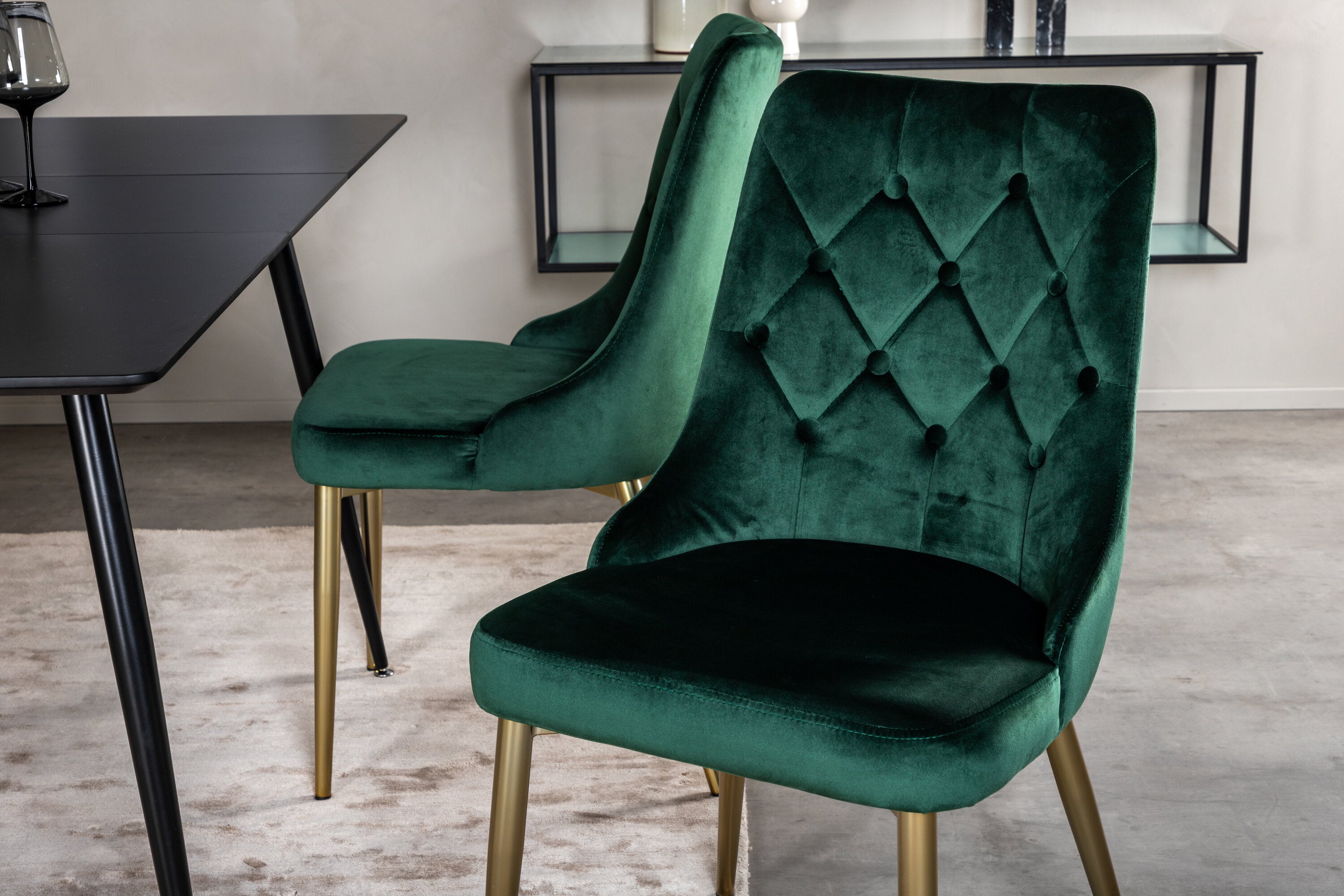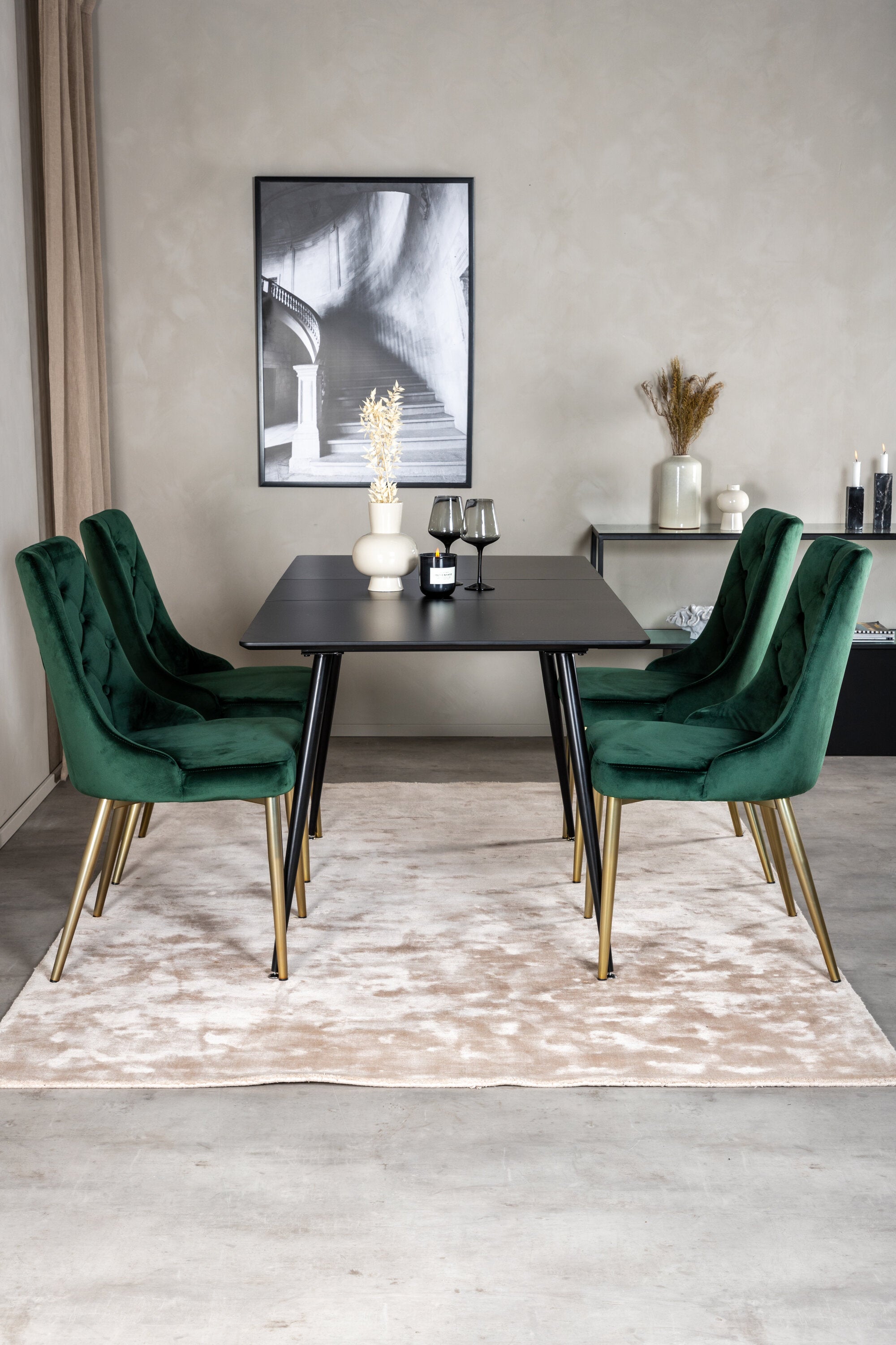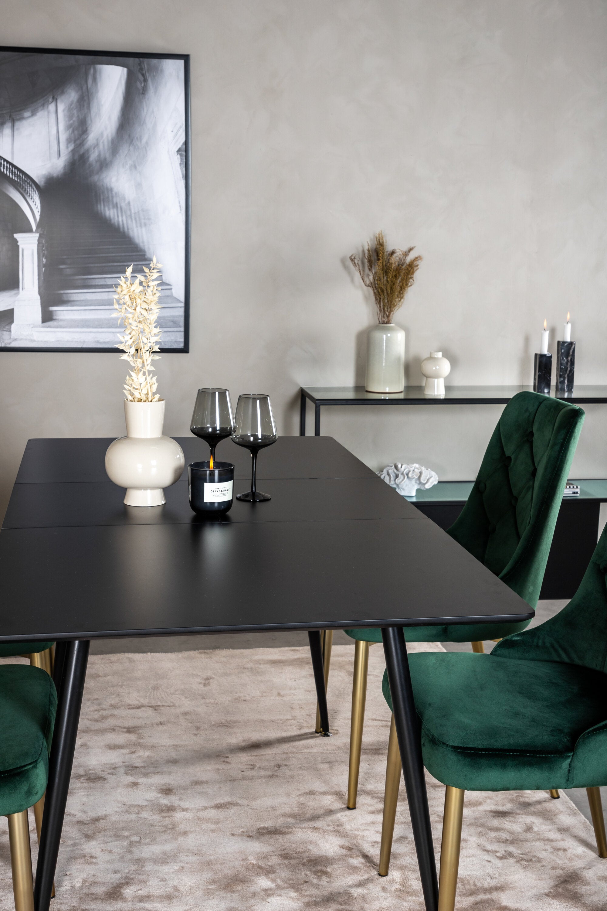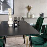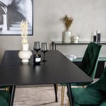 S klasickým a moderním jídelním stolem SILAR v černé barvě se může celá rodina sejít k večeři a společenskému setkání. Zde spolu s našimi pompézními zelenými jídelními židlemi Velvet. Krásné barvy, které vytvoří prostor v místnosti a zvou k mnoha nádherným společenským chvilkám.