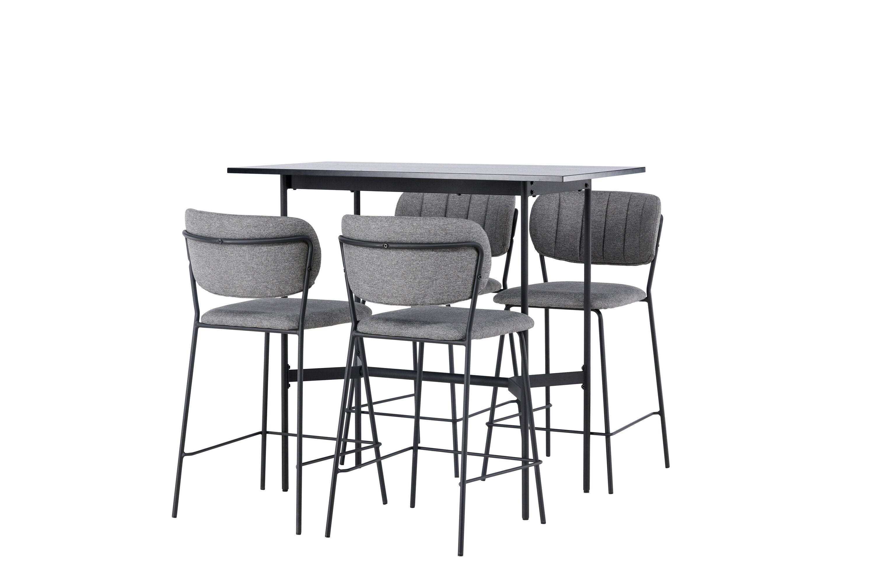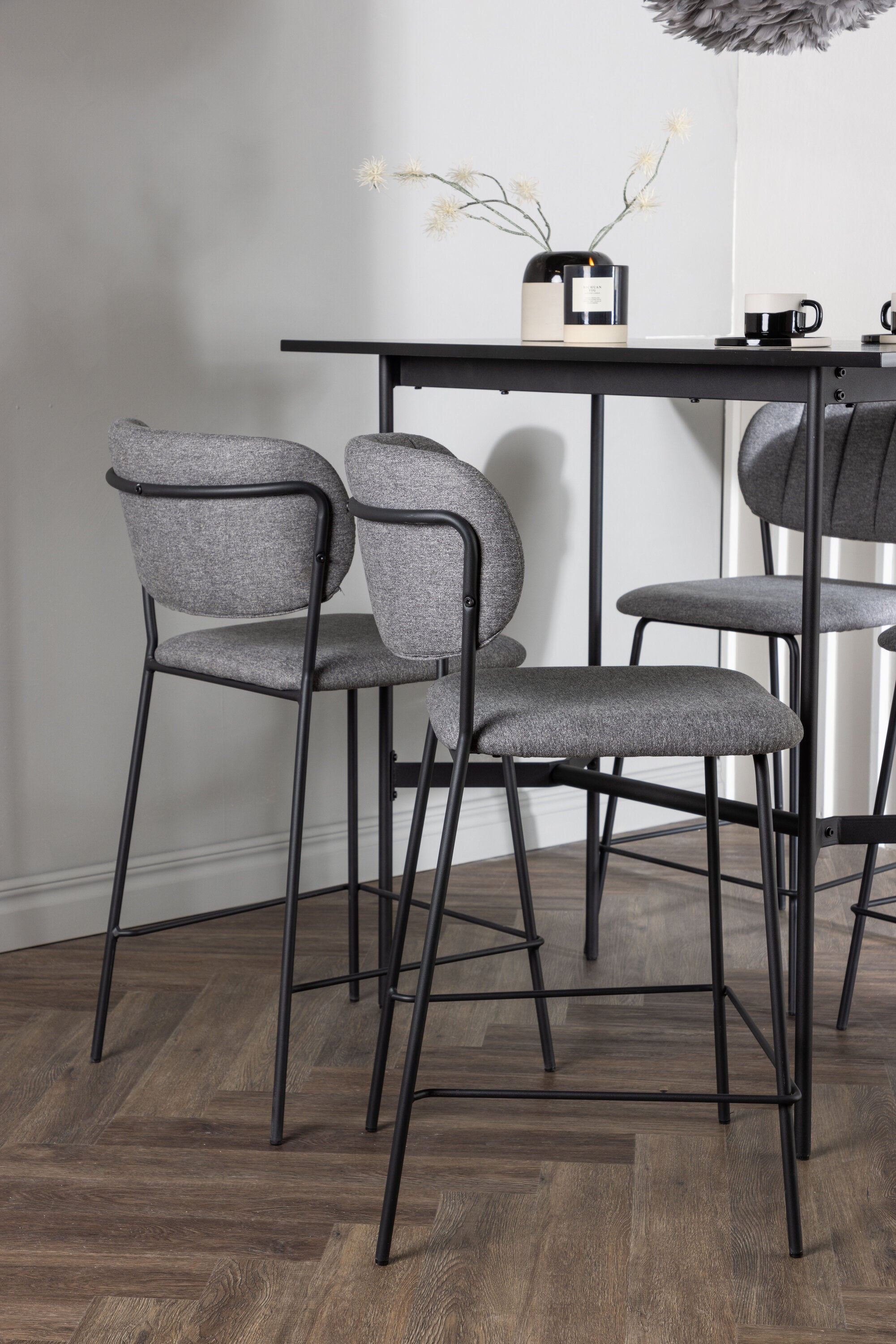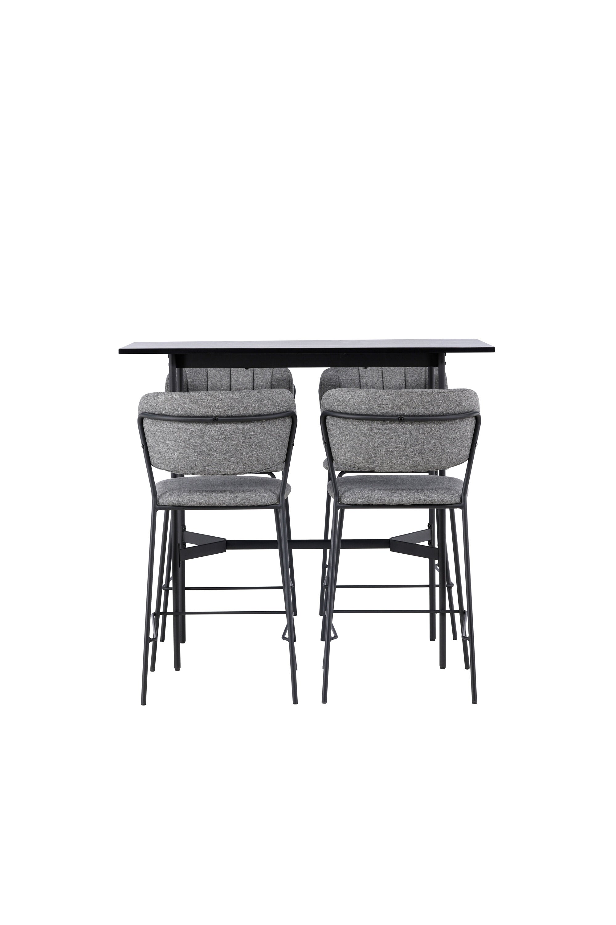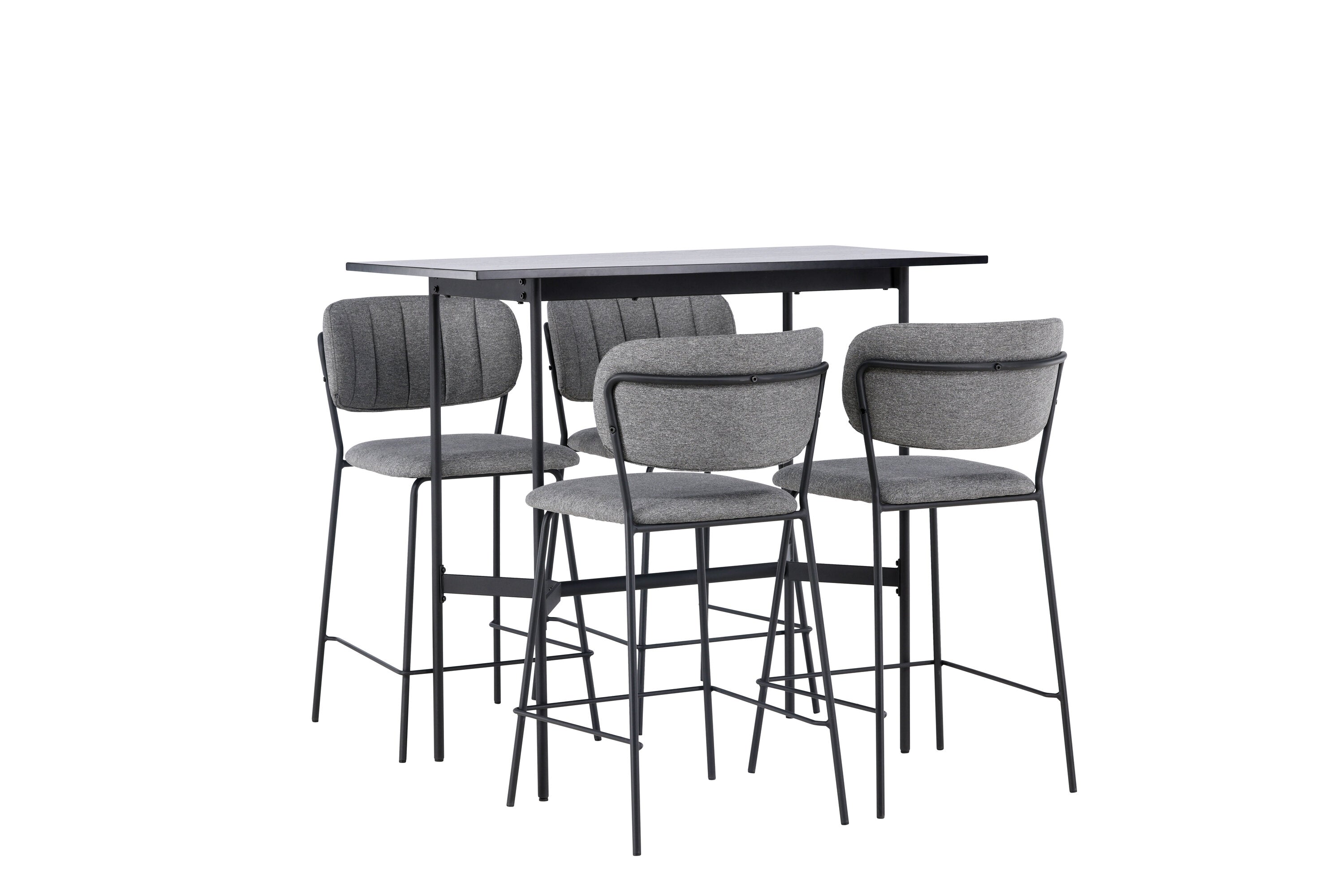 Stylové tvary a skandinávský design - dokonalá kombinace! Minimalistický barový stůl Rax má tenkou desku z černé MDF a úzké nohy stolu s integrovanou podnožkou v černém kovu. Zde spolu s šedými barovými židlemi ze série Bell. Židle má celočalouněný design s mírně zaobleným opěradlem a sedákem z šedé polyesterové látky se stylovými ozdobnými švy a úzké nohy židle v černé oceli s integrovanou podnožkou. Sotva to bude lepší než tohle! Rozměry stolu: 120x60cm.