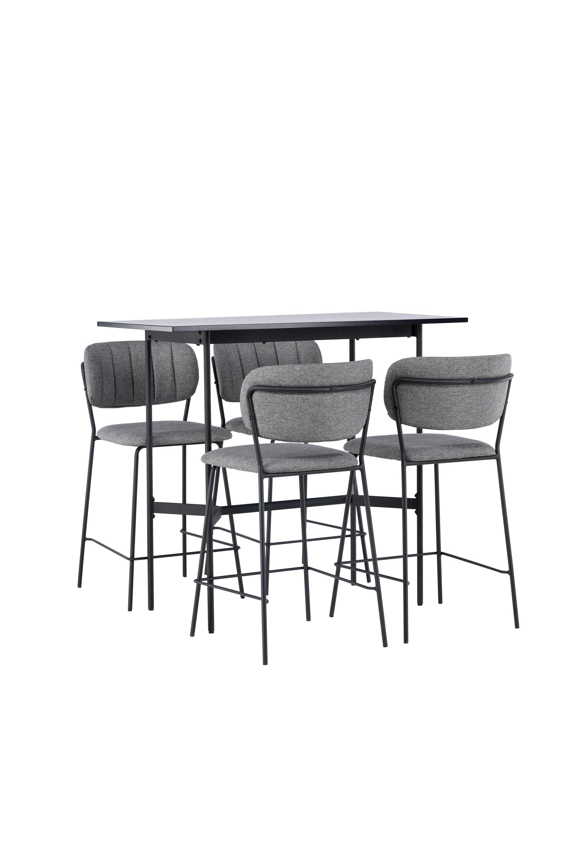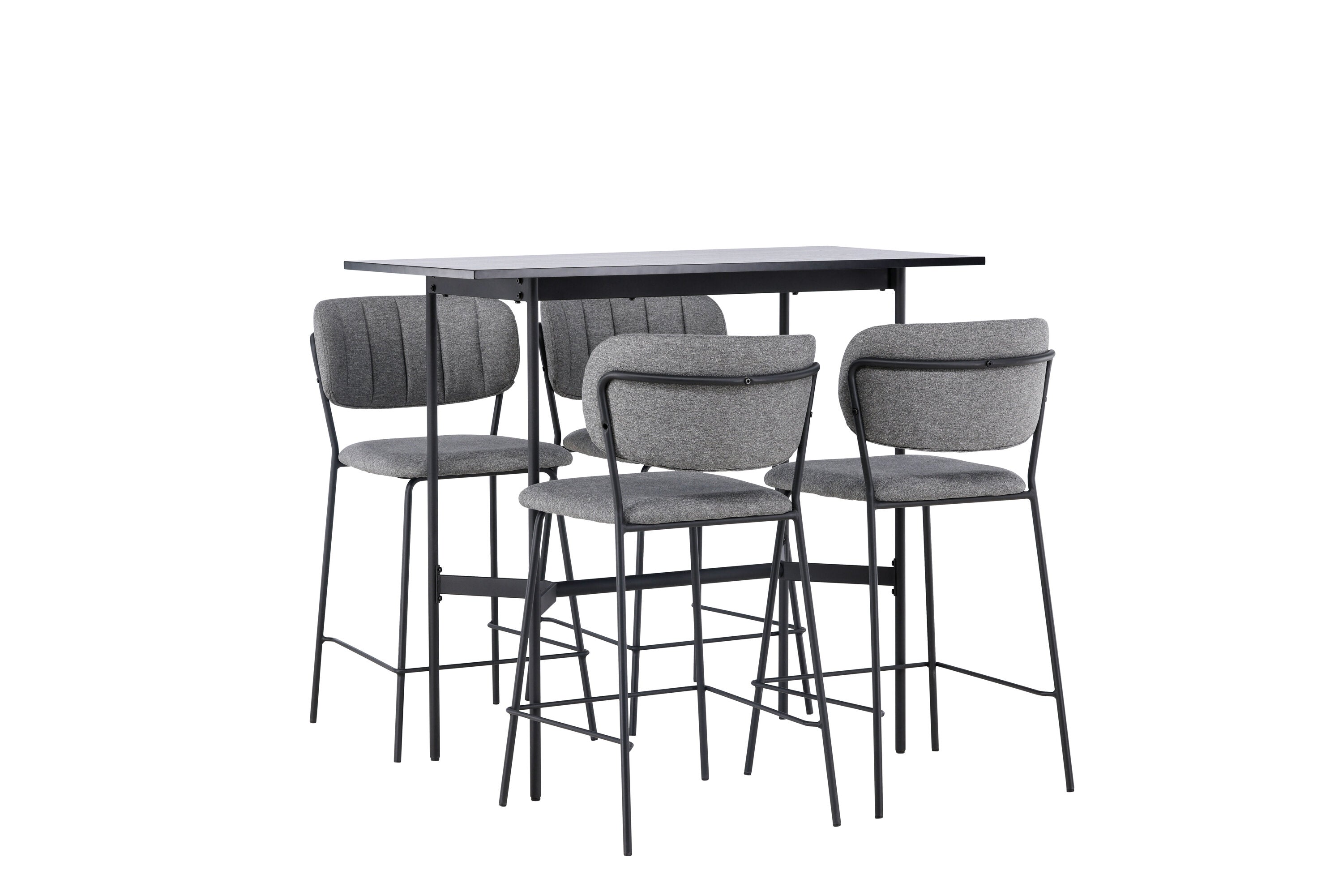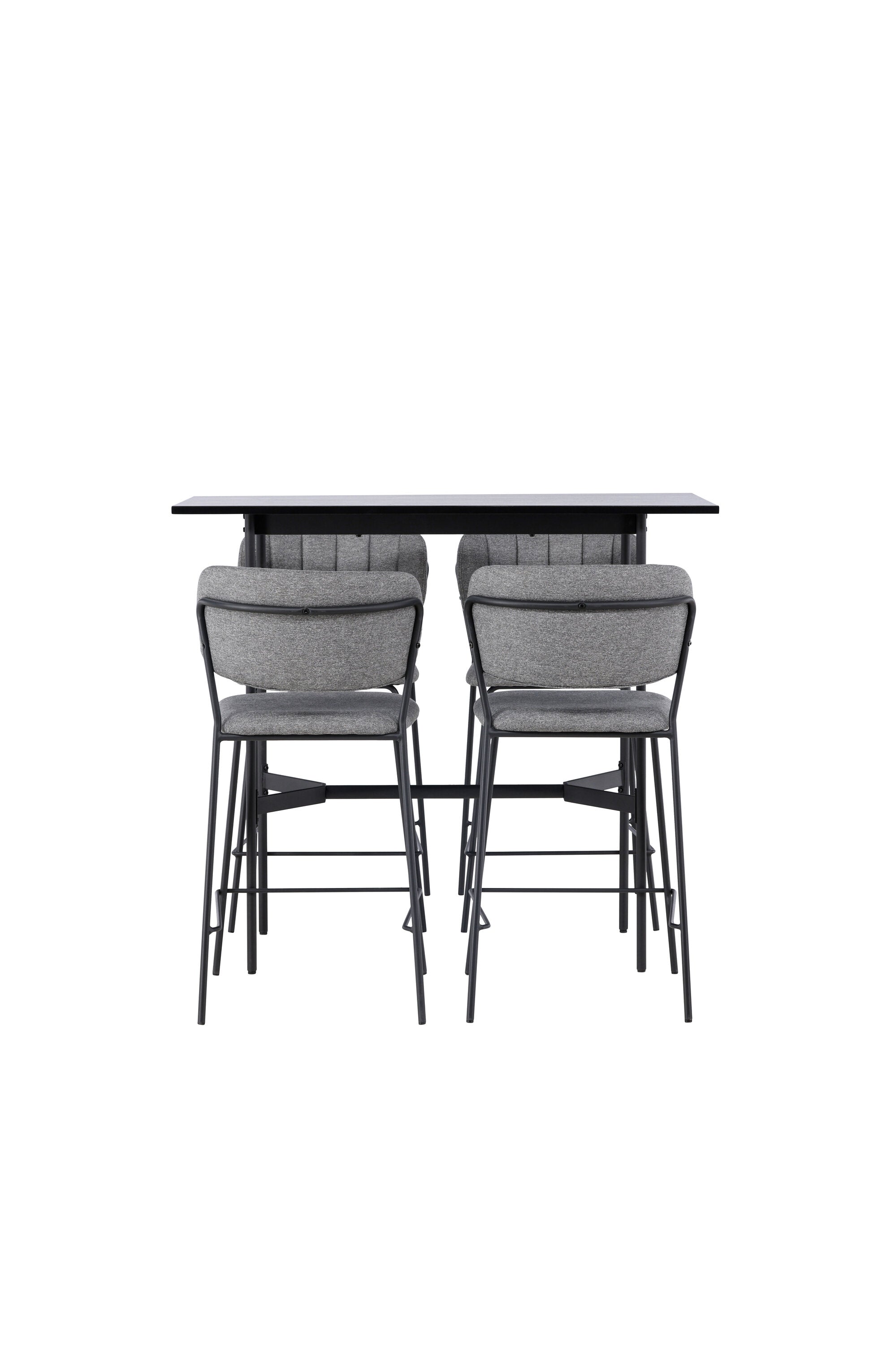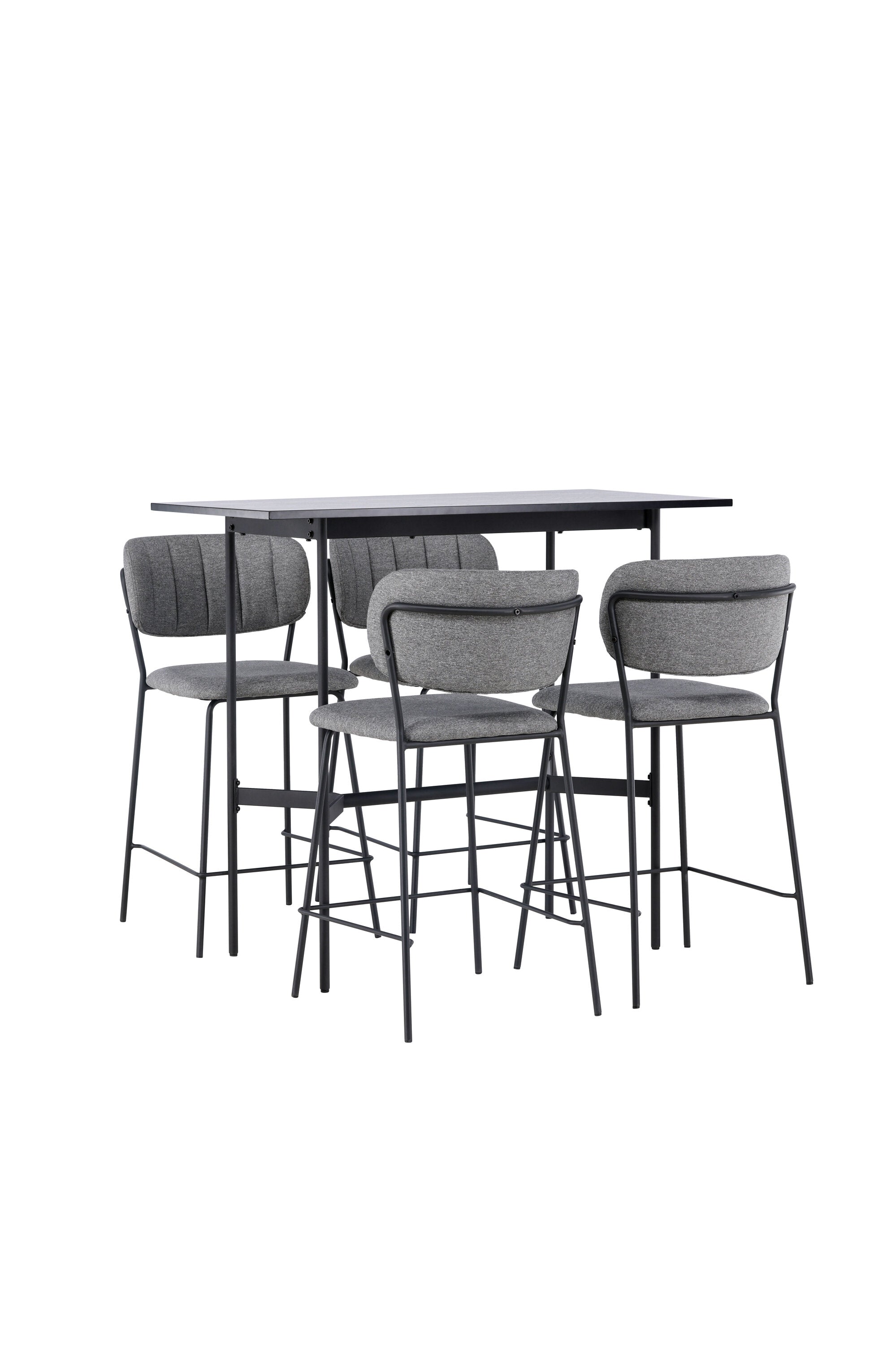 Stylové tvary a skandinávský design - dokonalá kombinace! Minimalistický barový stůl Rax má tenkou desku z černé MDF a úzké nohy stolu s integrovanou podnožkou v černém kovu. Zde spolu s šedými barovými židlemi ze série Bell. Židle má celočalouněný design s mírně zaobleným opěradlem a sedákem z šedé polyesterové látky se stylovými ozdobnými švy a úzké nohy židle v černé oceli s integrovanou podnožkou. Sotva to bude lepší než tohle! Rozměry stolu: 120x60cm.