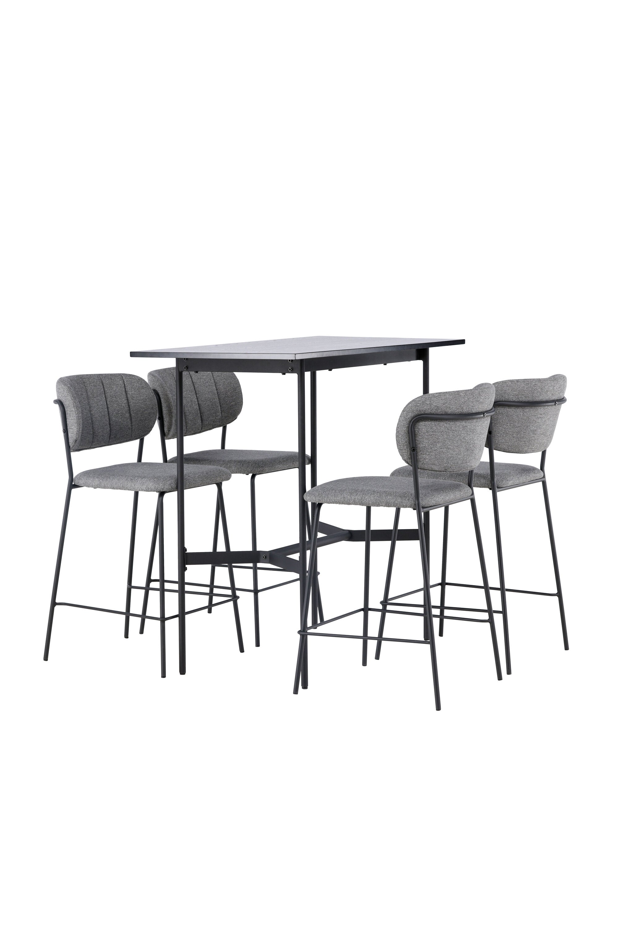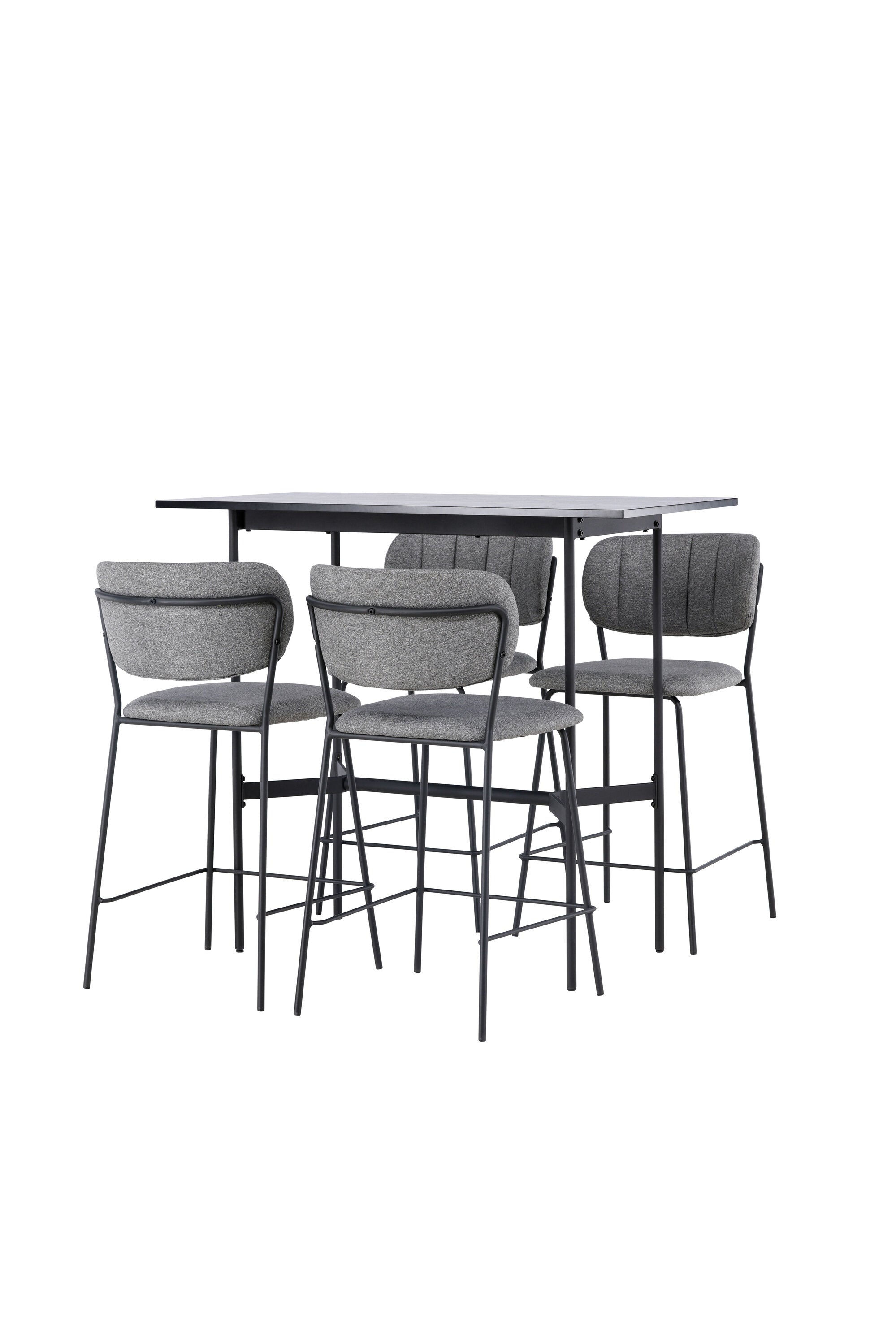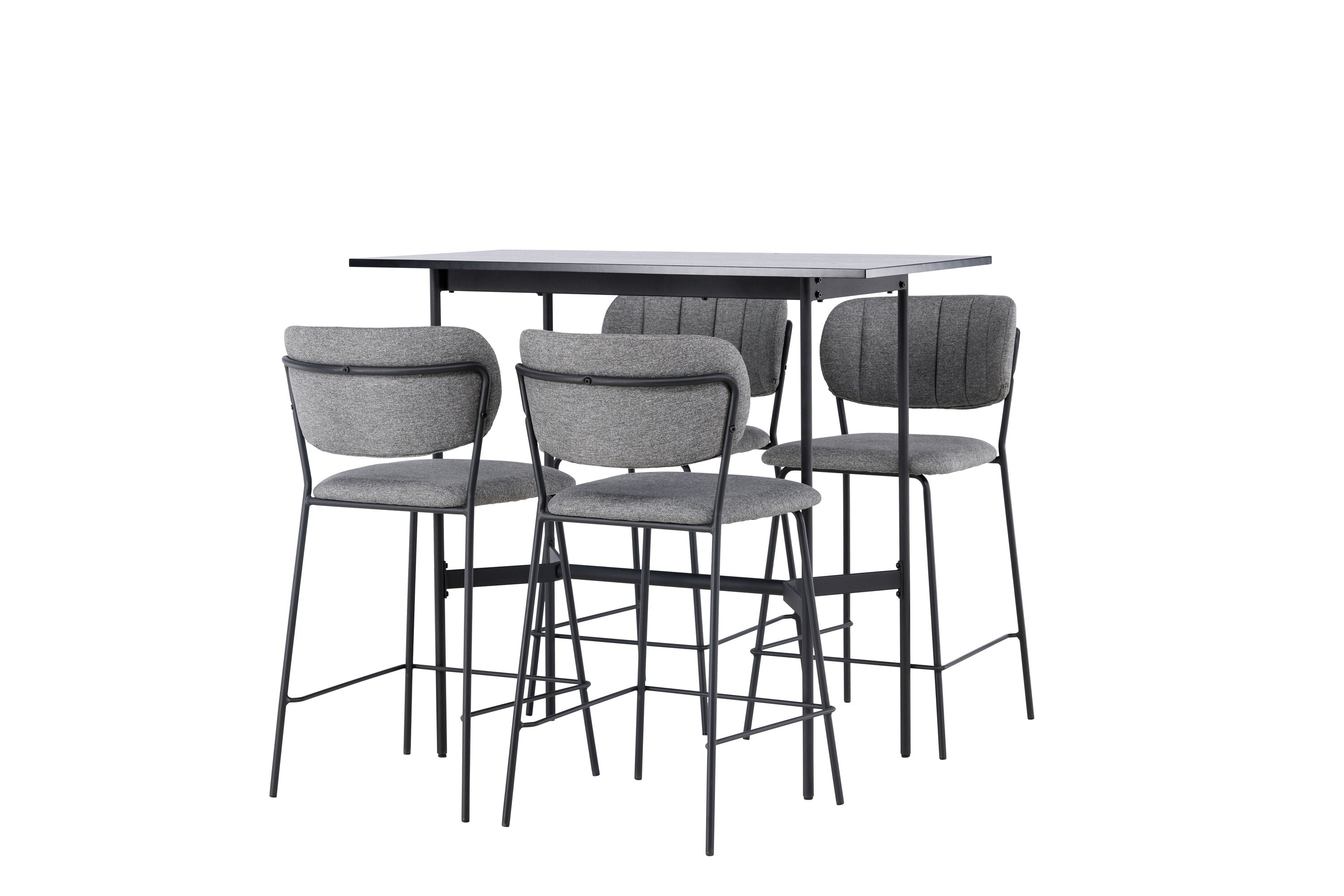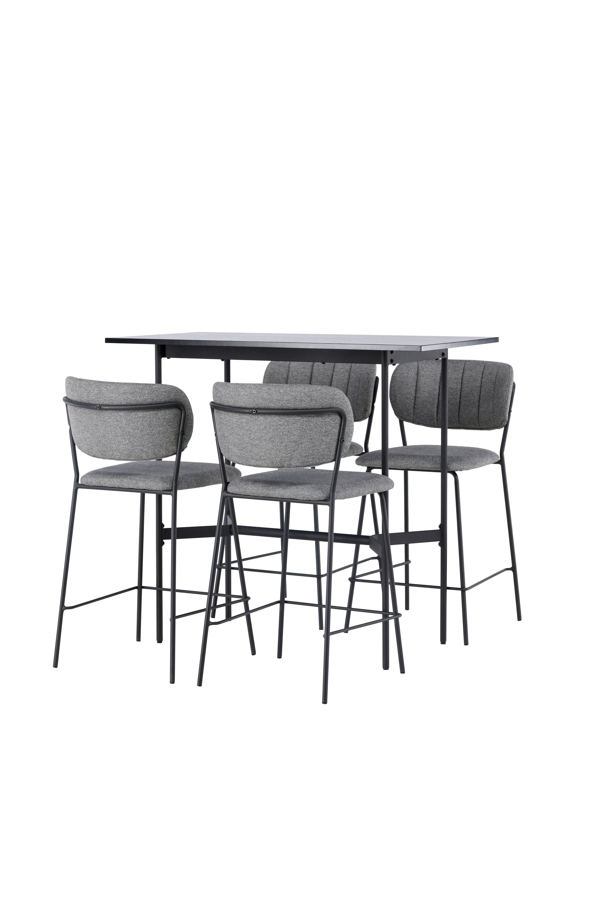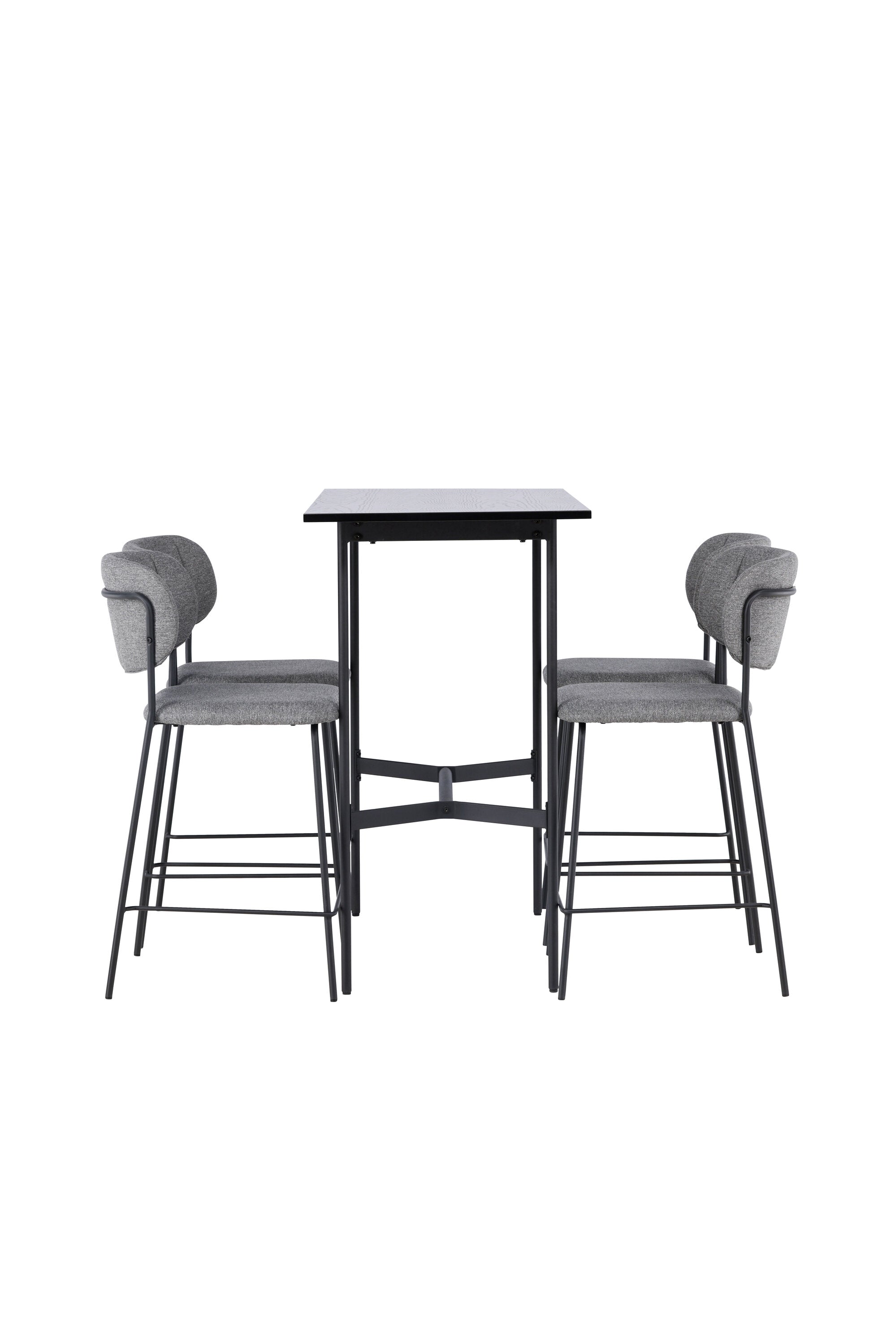 Stylové tvary a skandinávský design - dokonalá kombinace! Minimalistický barový stůl Rax má tenkou desku z černé MDF a úzké nohy stolu s integrovanou podnožkou v černém kovu. Zde spolu s šedými barovými židlemi ze série Bell. Židle má celočalouněný design s mírně zaobleným opěradlem a sedákem z šedé polyesterové látky se stylovými ozdobnými švy a úzké nohy židle v černé oceli s integrovanou podnožkou. Sotva to bude lepší než tohle! Rozměry stolu: 120x60cm.