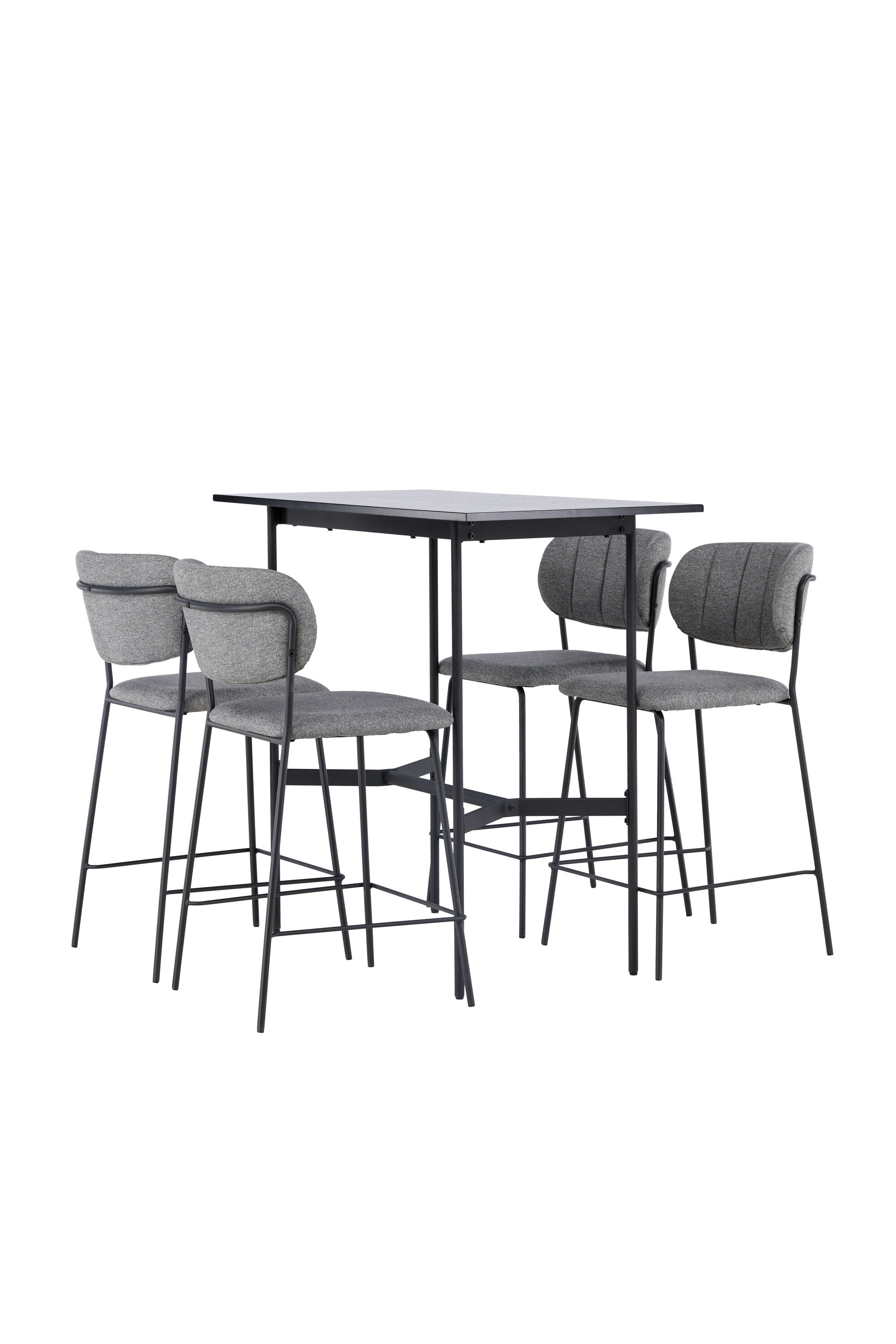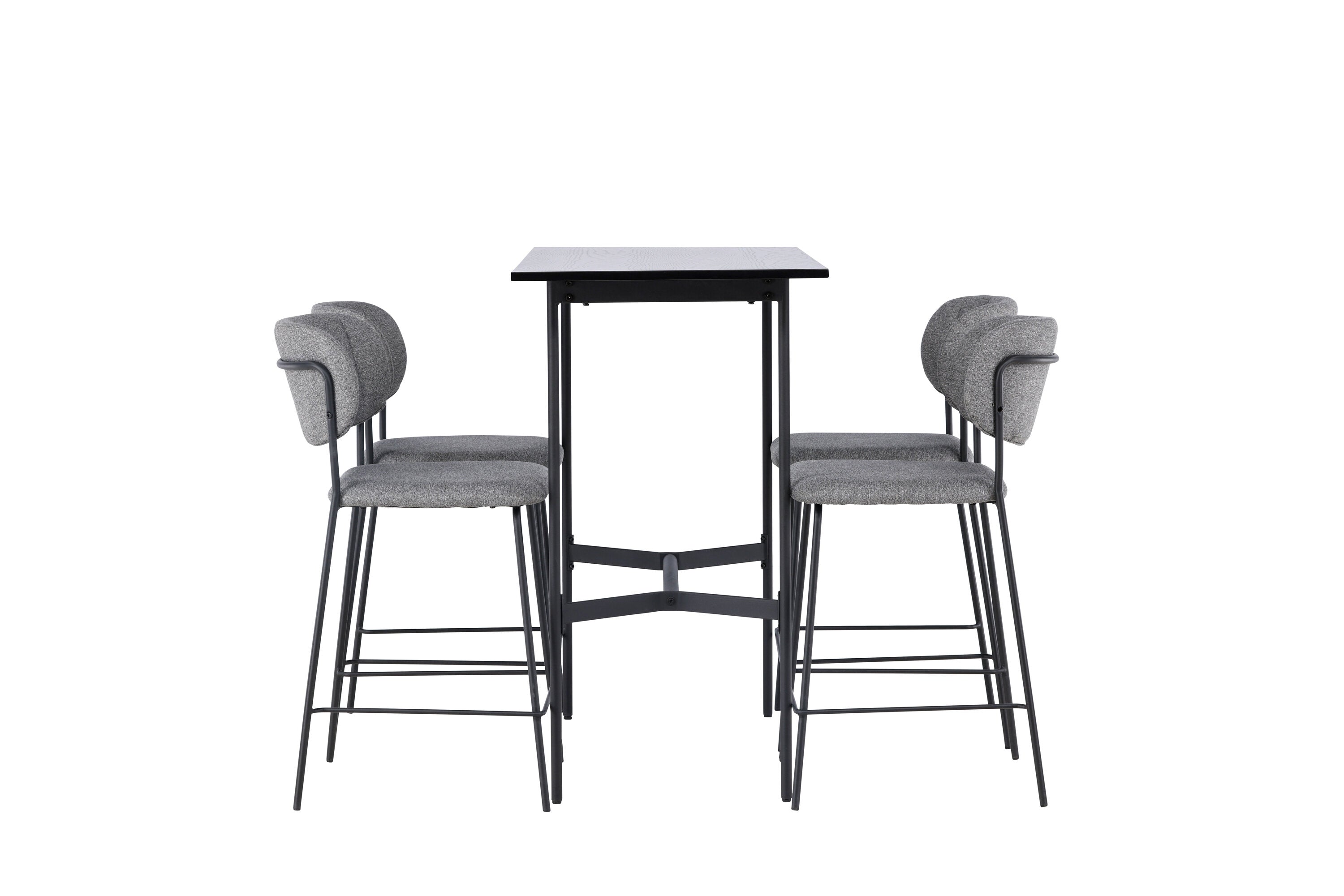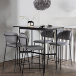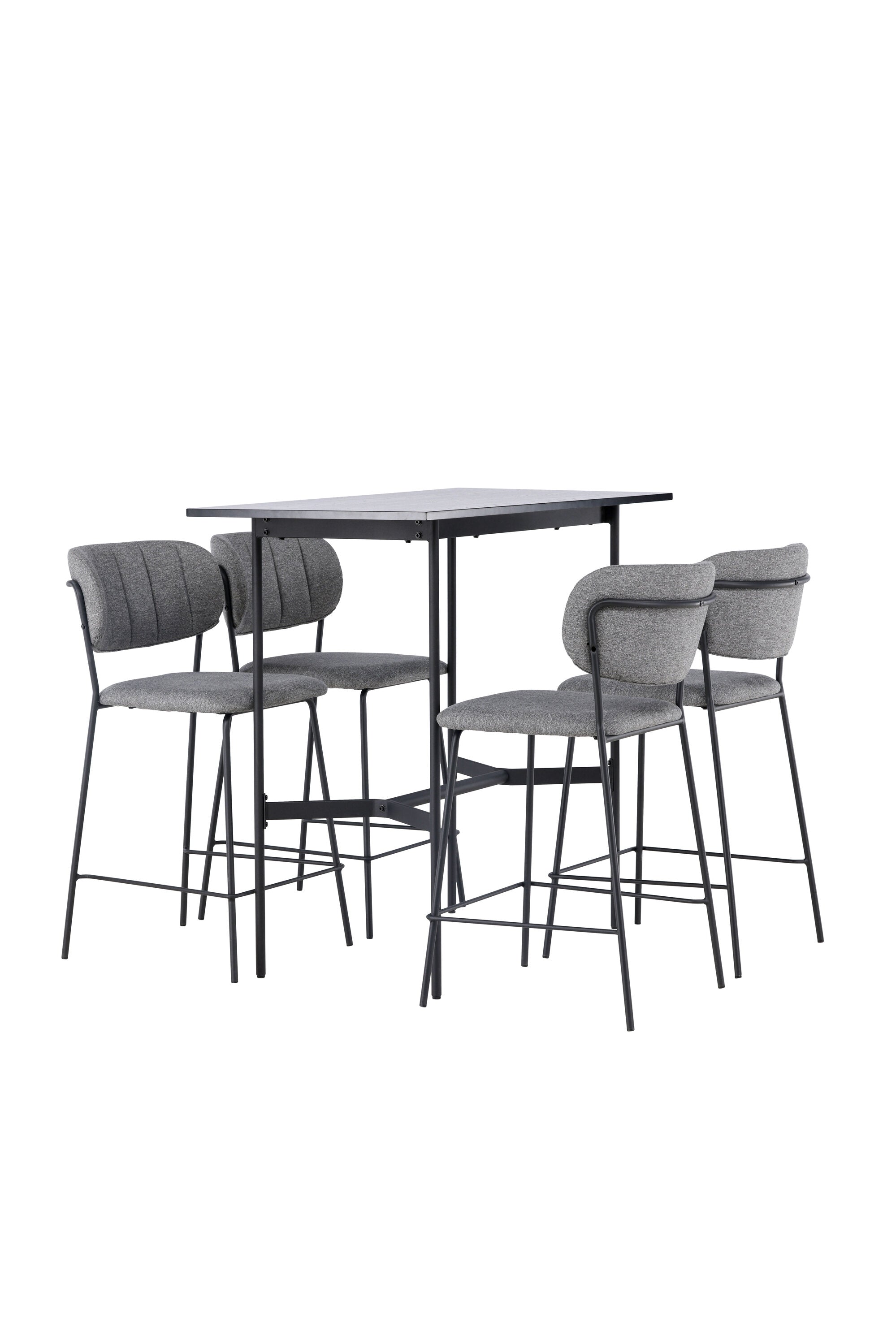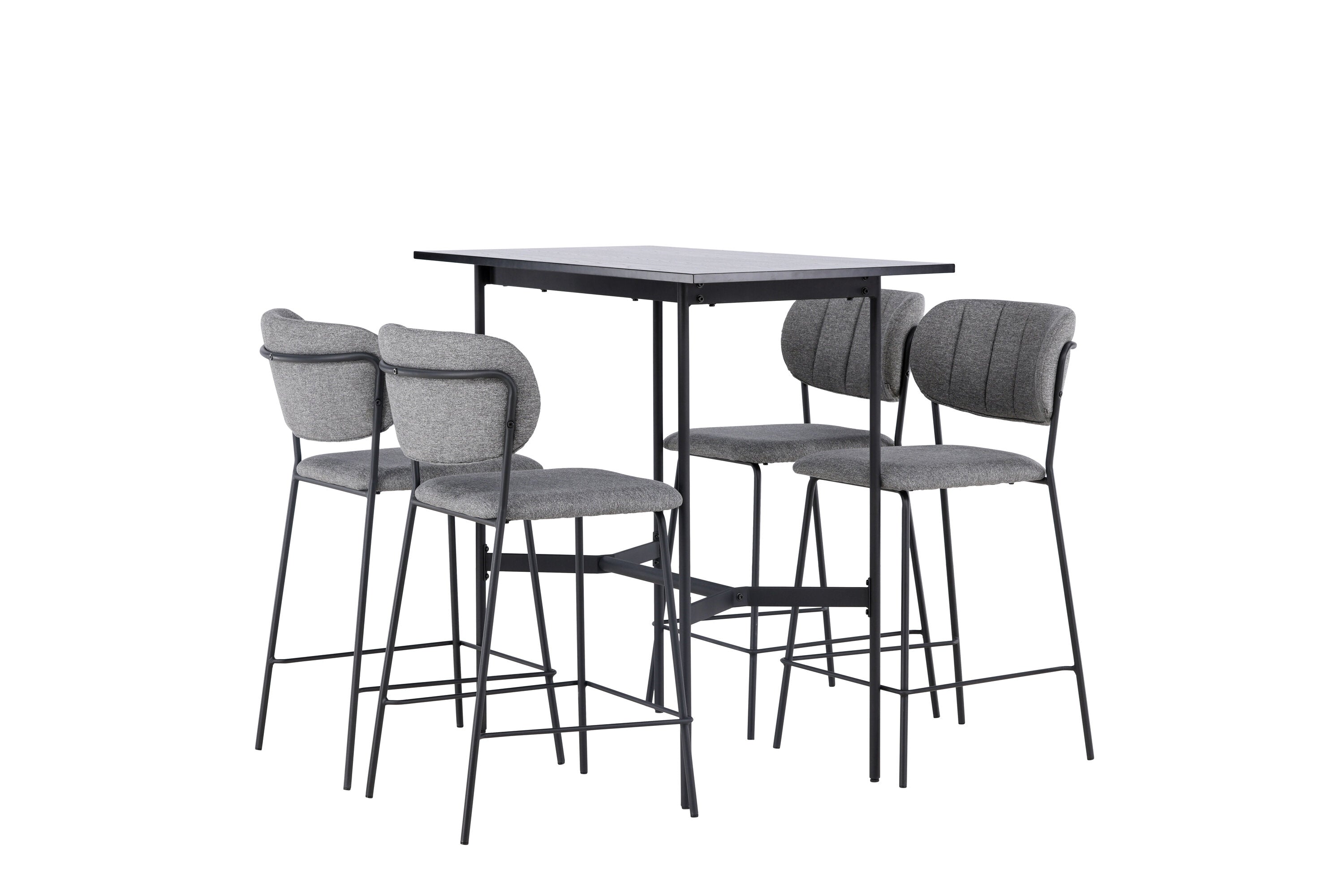 Stylové tvary a skandinávský design - dokonalá kombinace! Minimalistický barový stůl Rax má tenkou desku z černé MDF a úzké nohy stolu s integrovanou podnožkou v černém kovu. Zde spolu s šedými barovými židlemi ze série Bell. Židle má celočalouněný design s mírně zaobleným opěradlem a sedákem z šedé polyesterové látky se stylovými ozdobnými švy a úzké nohy židle v černé oceli s integrovanou podnožkou. Sotva to bude lepší než tohle! Rozměry stolu: 120x60cm.