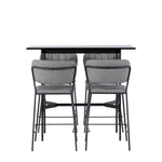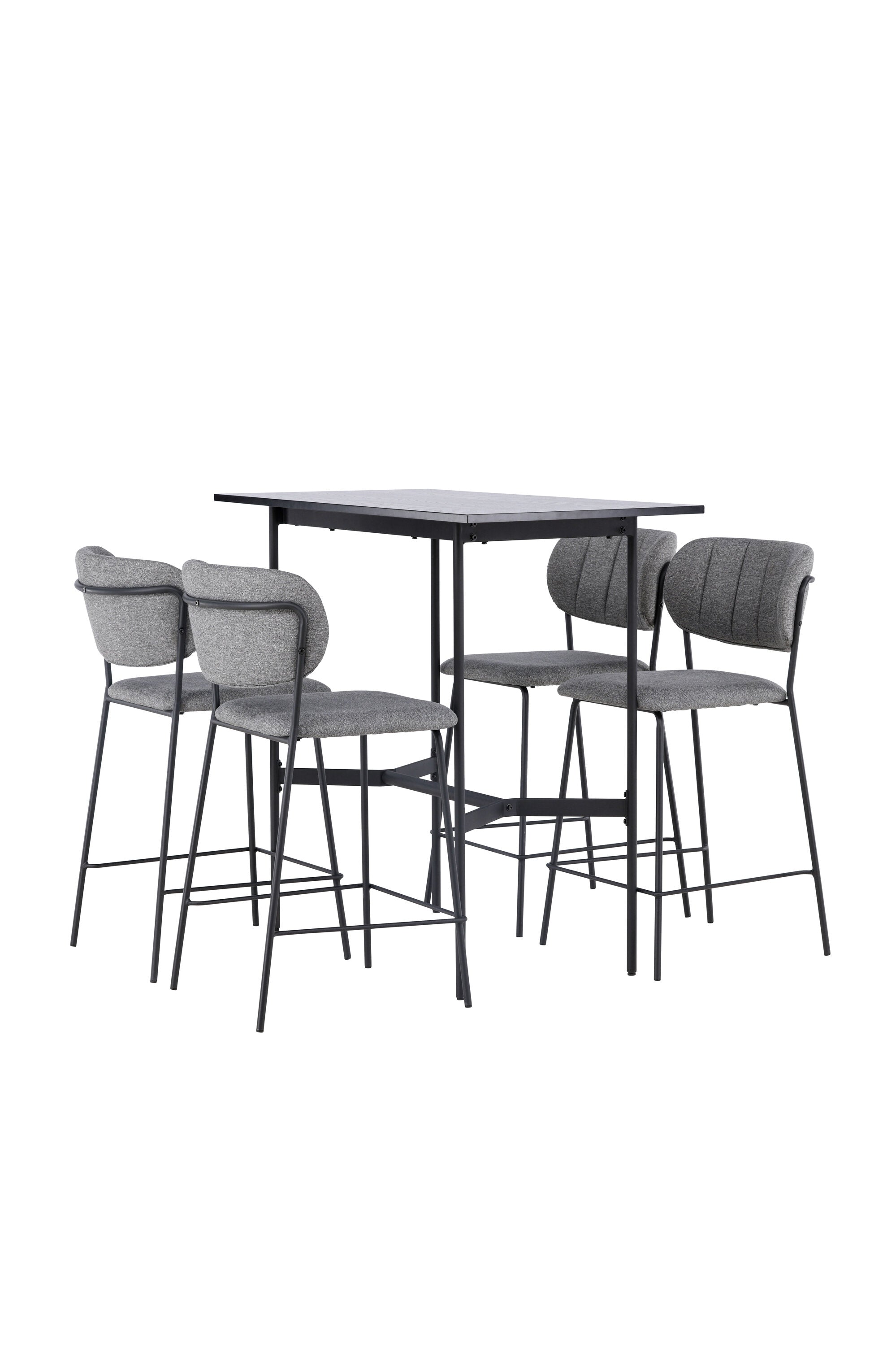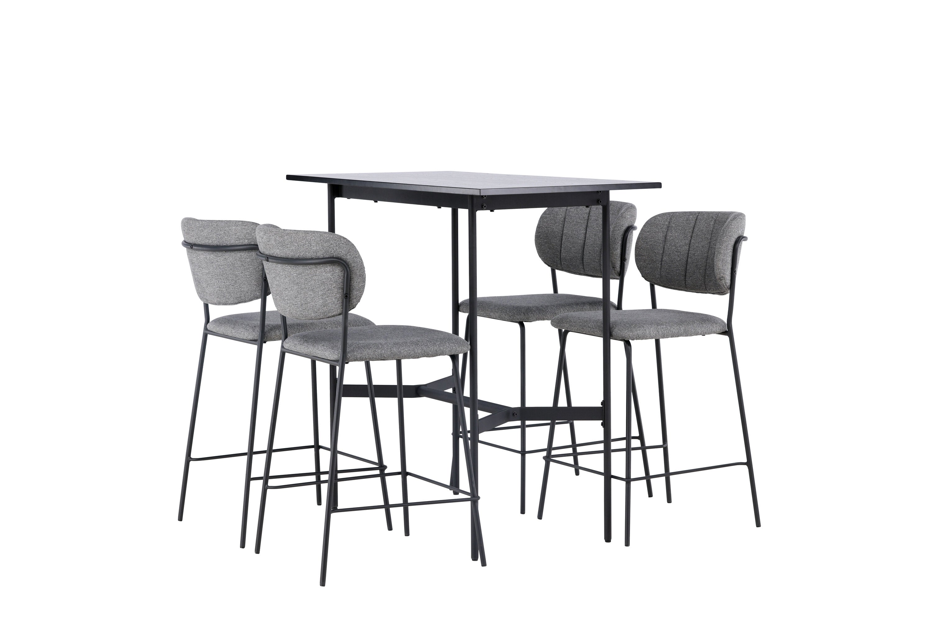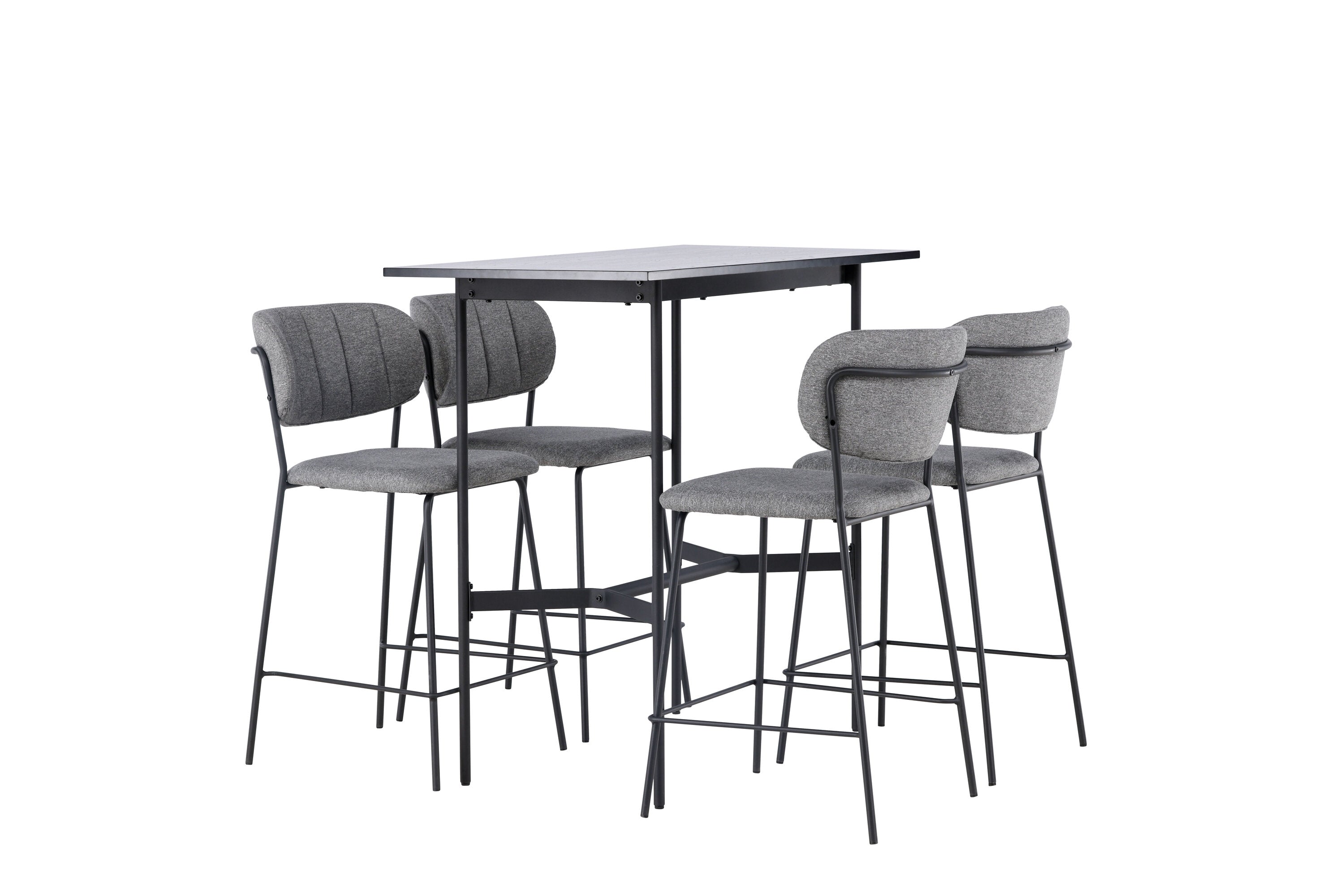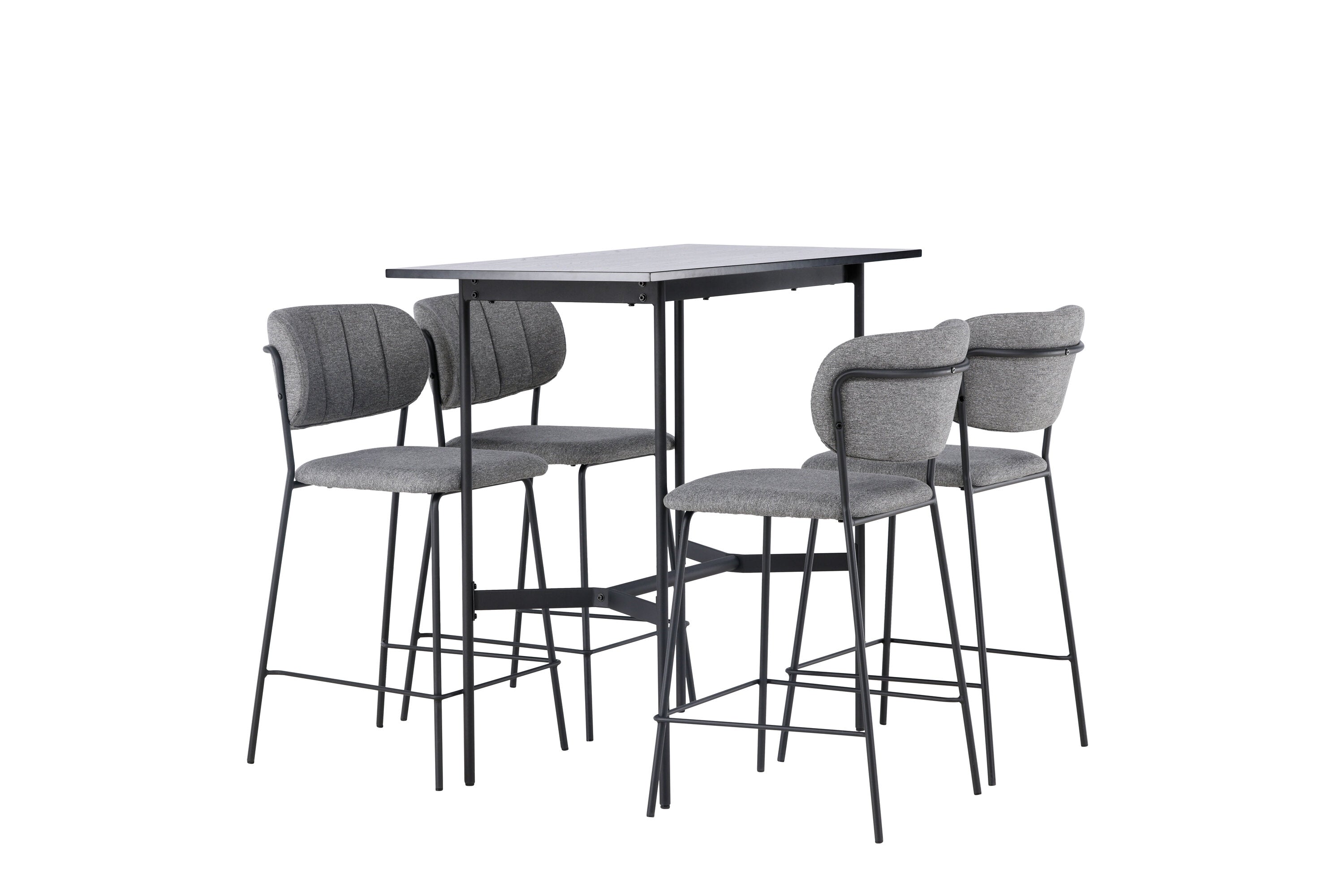 Stylové tvary a skandinávský design - dokonalá kombinace! Minimalistický barový stůl Rax má tenkou desku z černé MDF a úzké nohy stolu s integrovanou podnožkou v černém kovu. Zde spolu s šedými barovými židlemi ze série Bell. Židle má celočalouněný design s mírně zaobleným opěradlem a sedákem z šedé polyesterové látky se stylovými ozdobnými švy a úzké nohy židle v černé oceli s integrovanou podnožkou. Sotva to bude lepší než tohle! Rozměry stolu: 120x60cm.