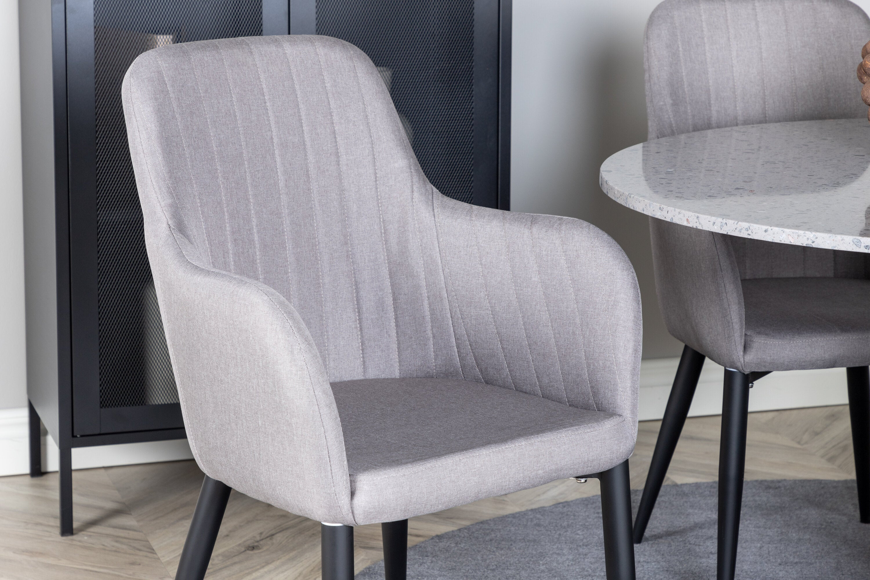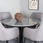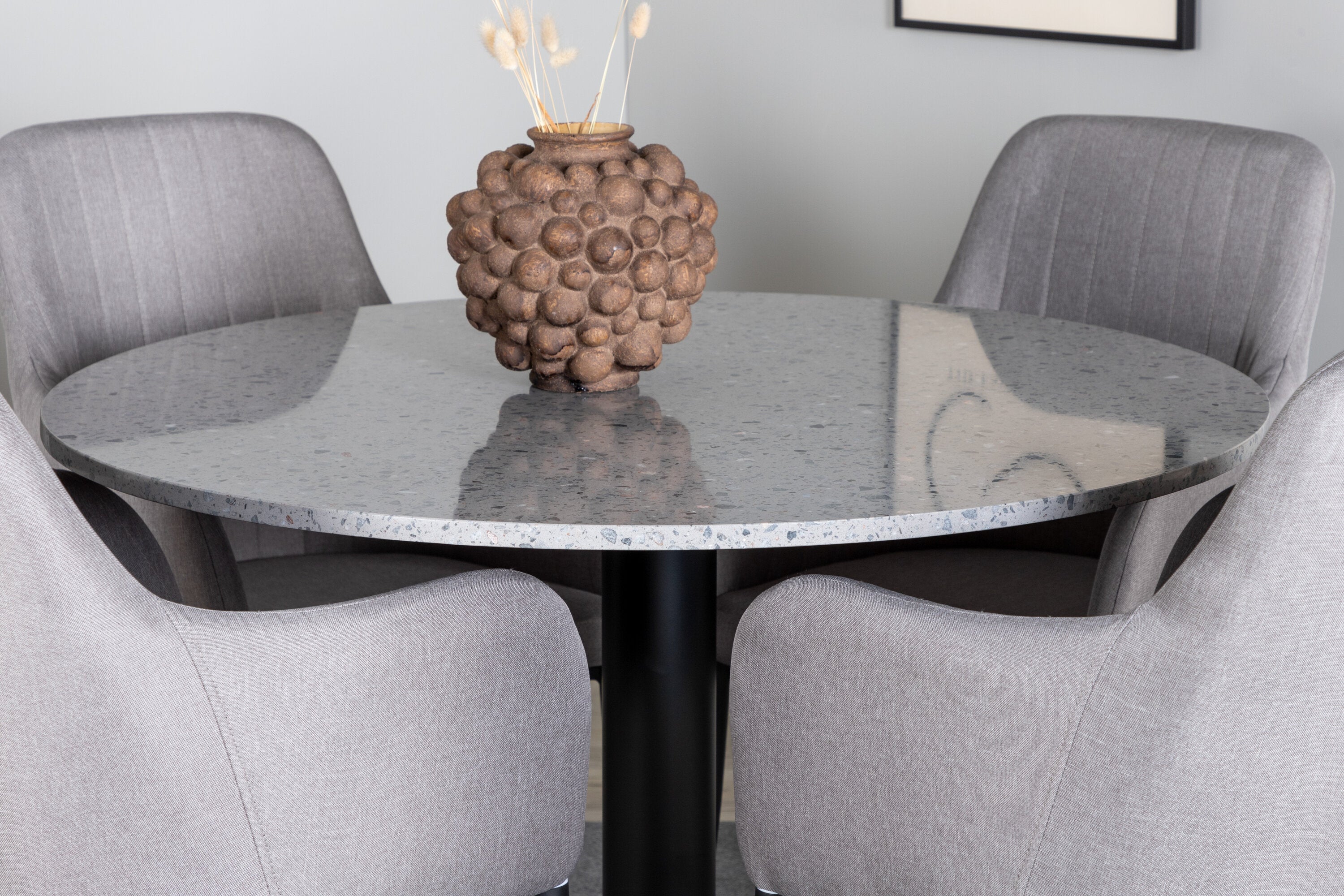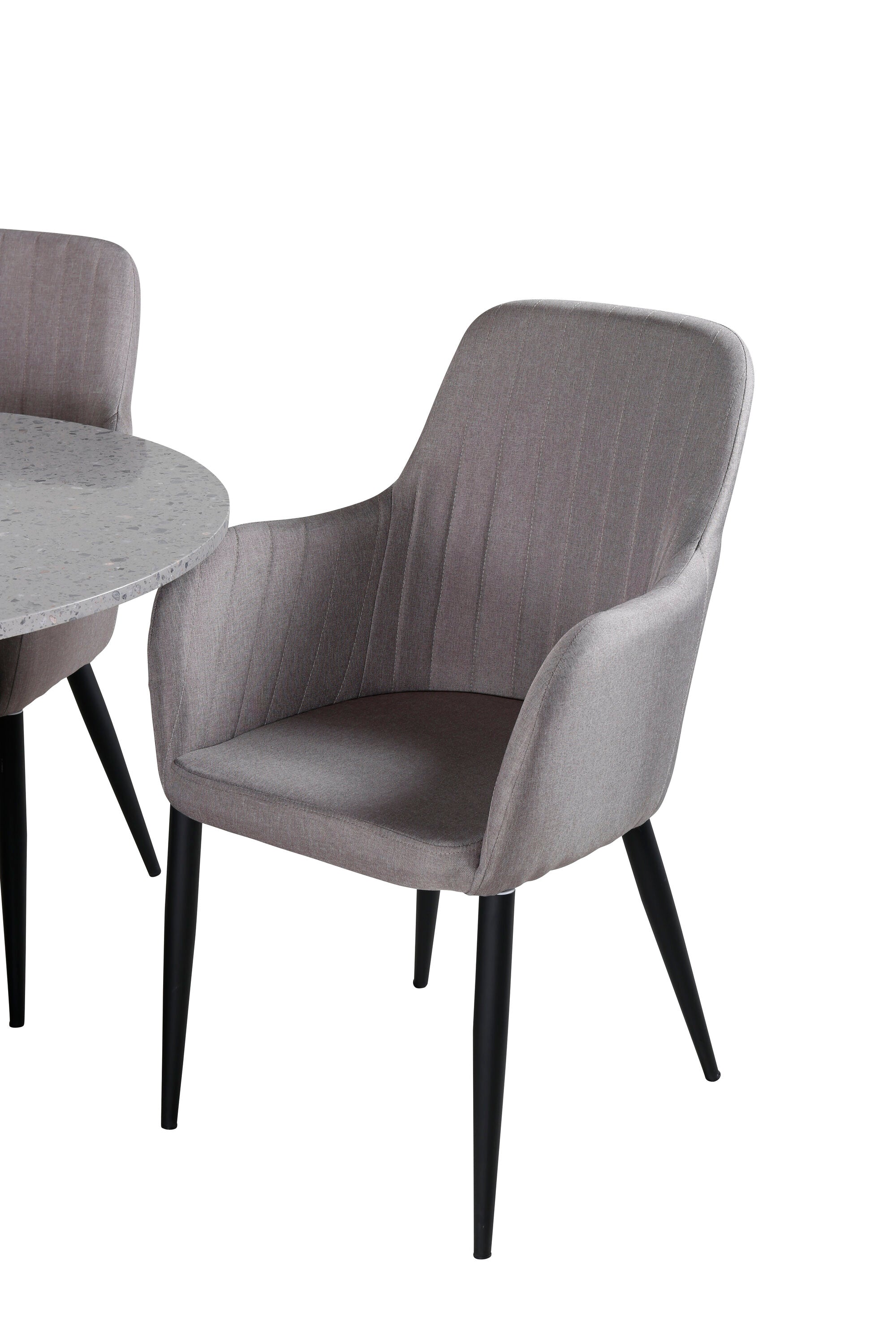 Robustní design se zde snoubí s úhlednými tvary. Razzia je náš kulatý jídelní stůl z krásného terazza s šedým povrchem a rámem z černého kovu. Kulatá deska stolu působí v místnosti útulným a příjemným dojmem – zde nikdo nekončí na okraji! Zde v dokonalé kombinaci s jídelními židlemi ze série Comfort. Židle má celopotahový design v šedé polyesterové látce a dekorační stehy na vnitřní straně opěradla a područek, které se mění v pěkný detail. Nohy jsou z kovu s černou práškovou barvou. Posaďte se pohodlně a zvou!