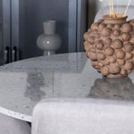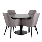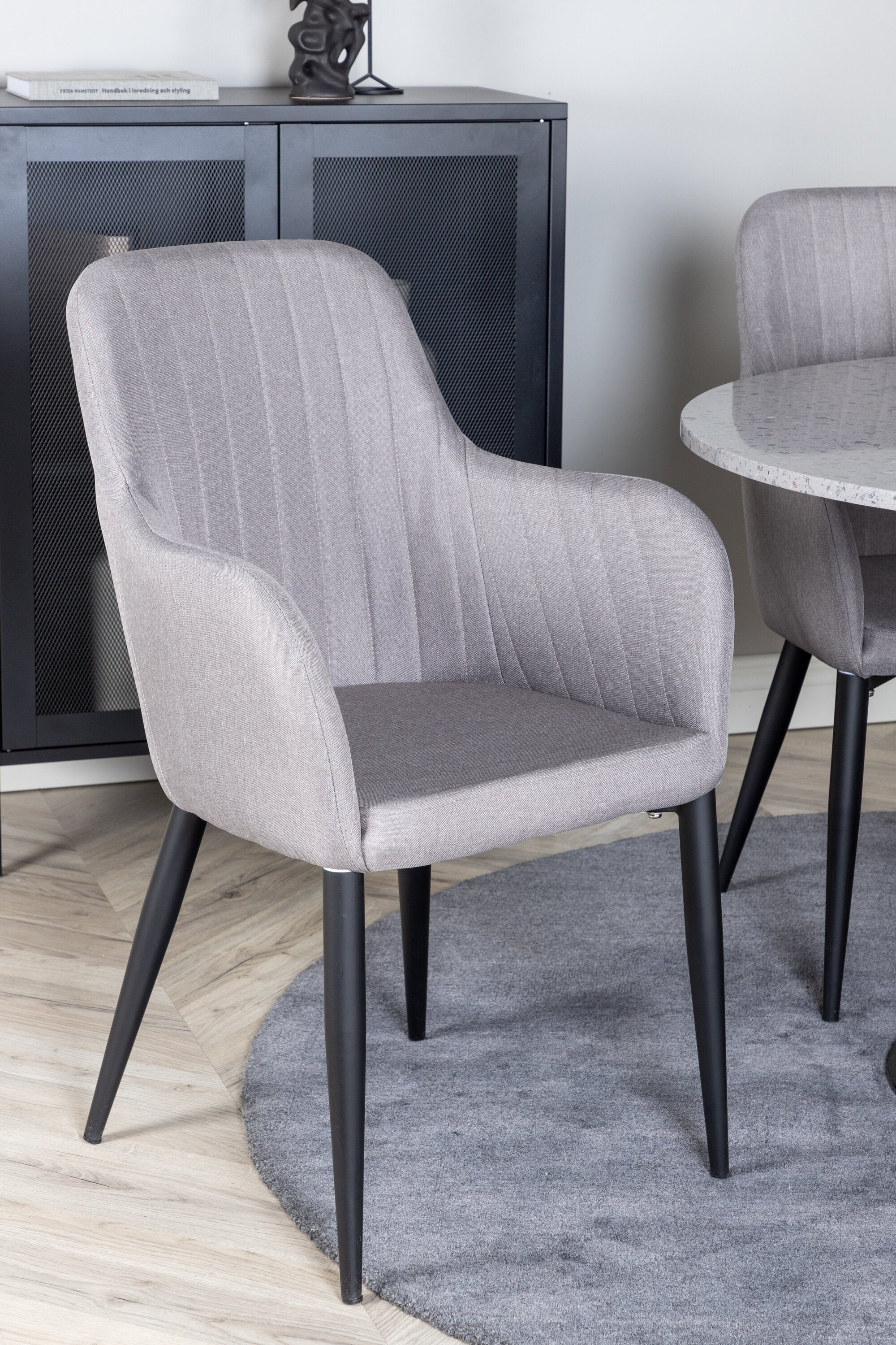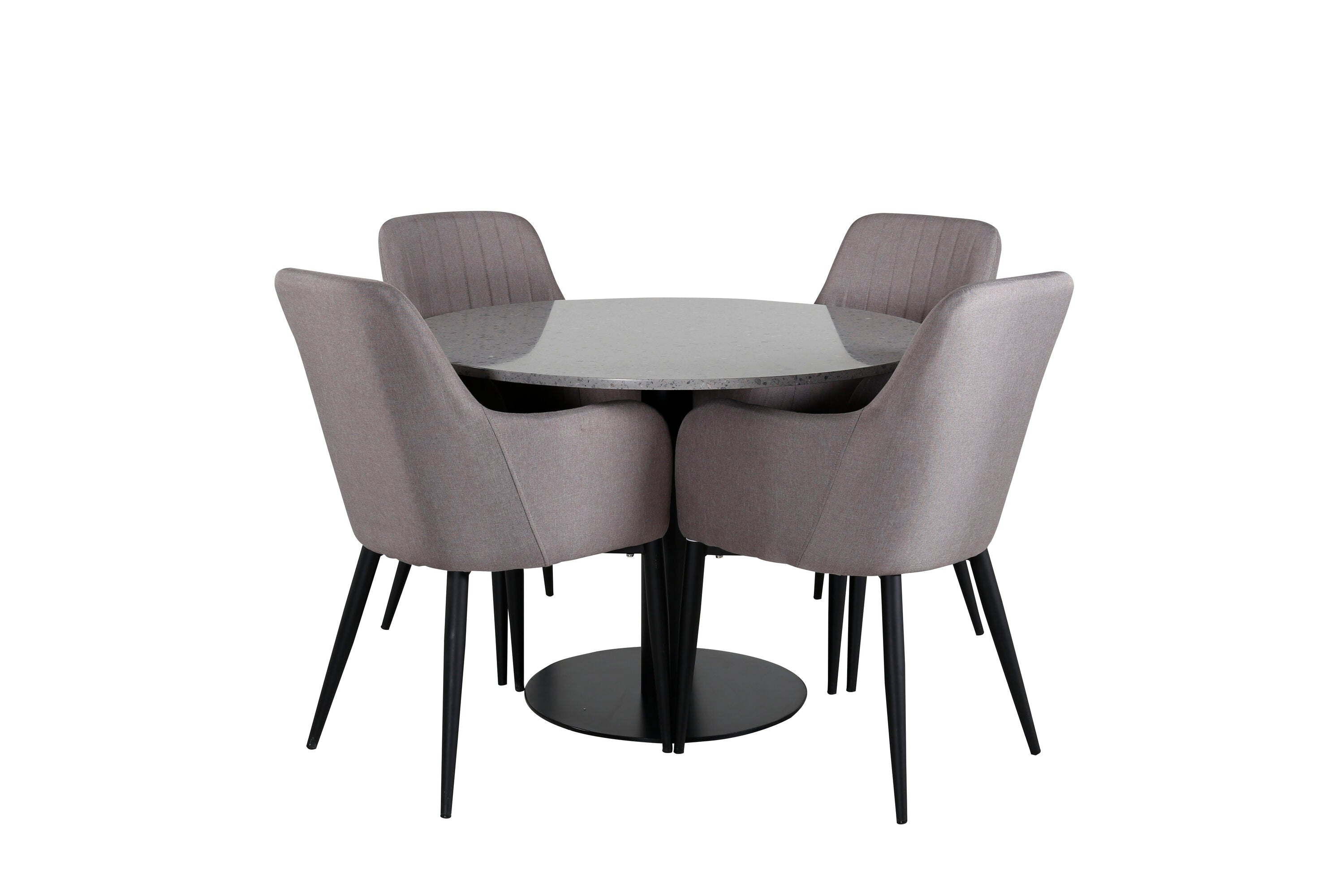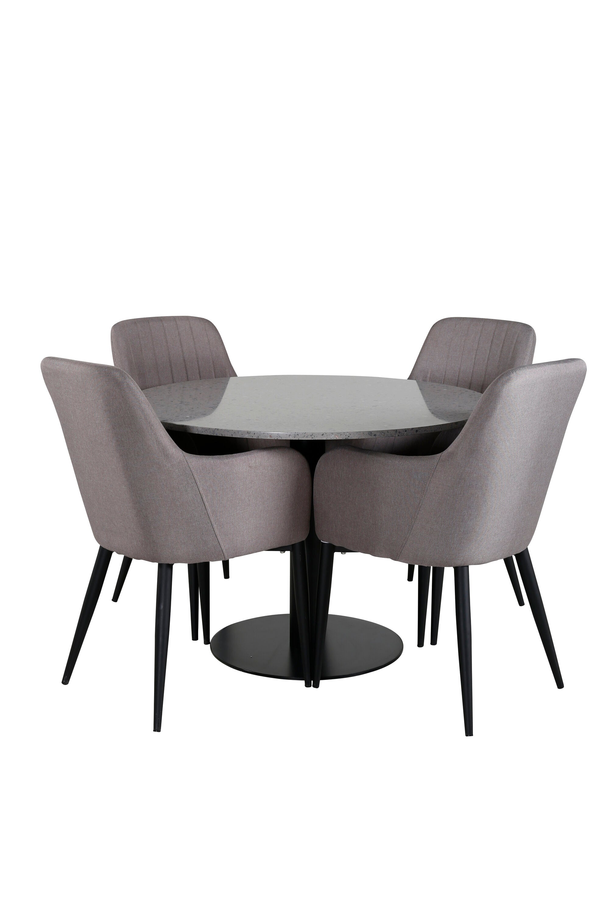 Robustní design se zde snoubí s úhlednými tvary. Razzia je náš kulatý jídelní stůl z krásného terazza s šedým povrchem a rámem z černého kovu. Kulatá deska stolu působí v místnosti útulným a příjemným dojmem – zde nikdo nekončí na okraji! Zde v dokonalé kombinaci s jídelními židlemi ze série Comfort. Židle má celopotahový design v šedé polyesterové látce a dekorační stehy na vnitřní straně opěradla a područek, které se mění v pěkný detail. Nohy jsou z kovu s černou práškovou barvou. Posaďte se pohodlně a zvou!