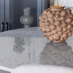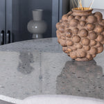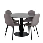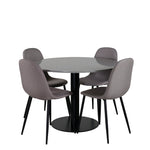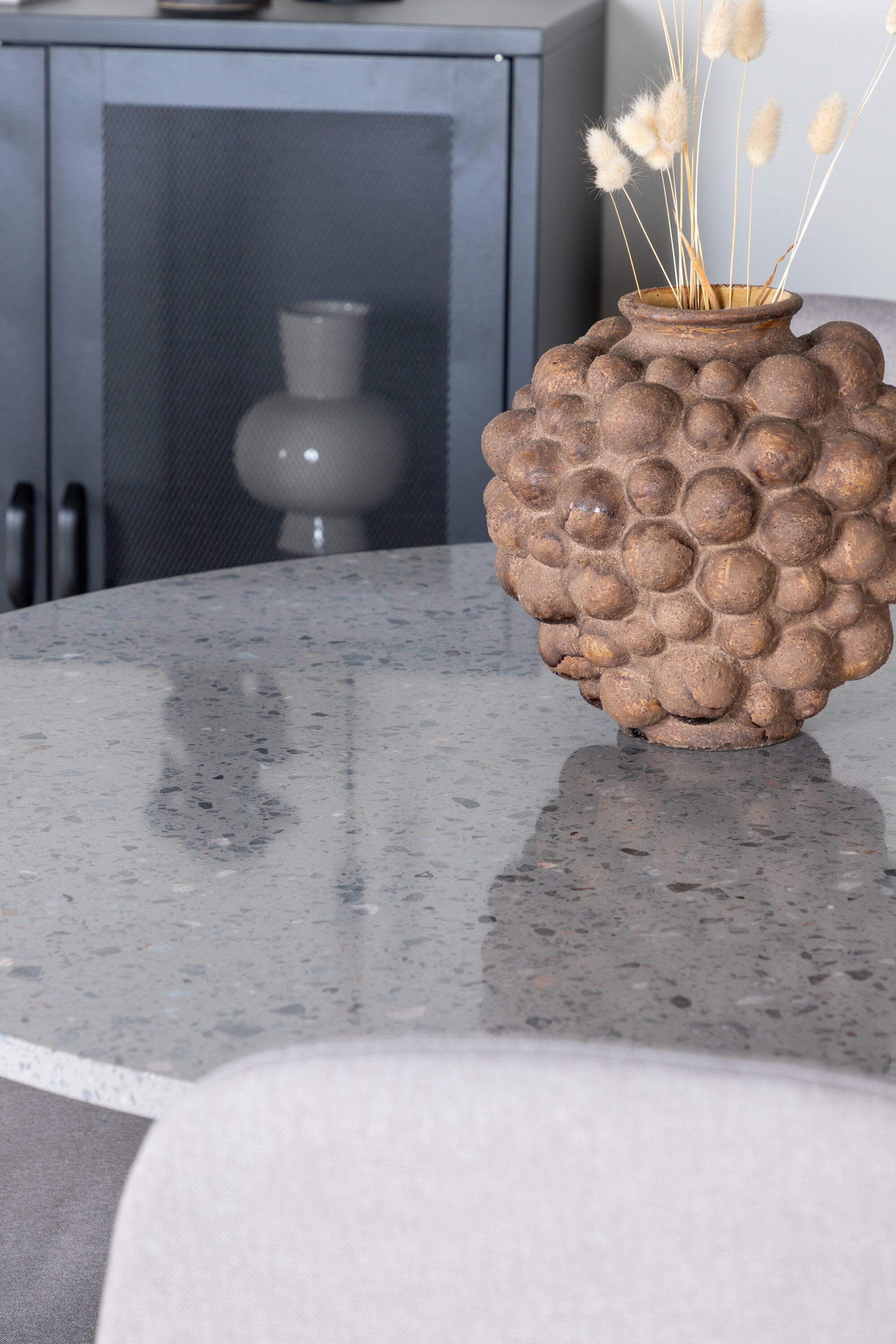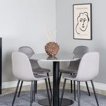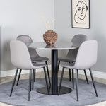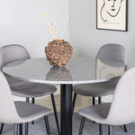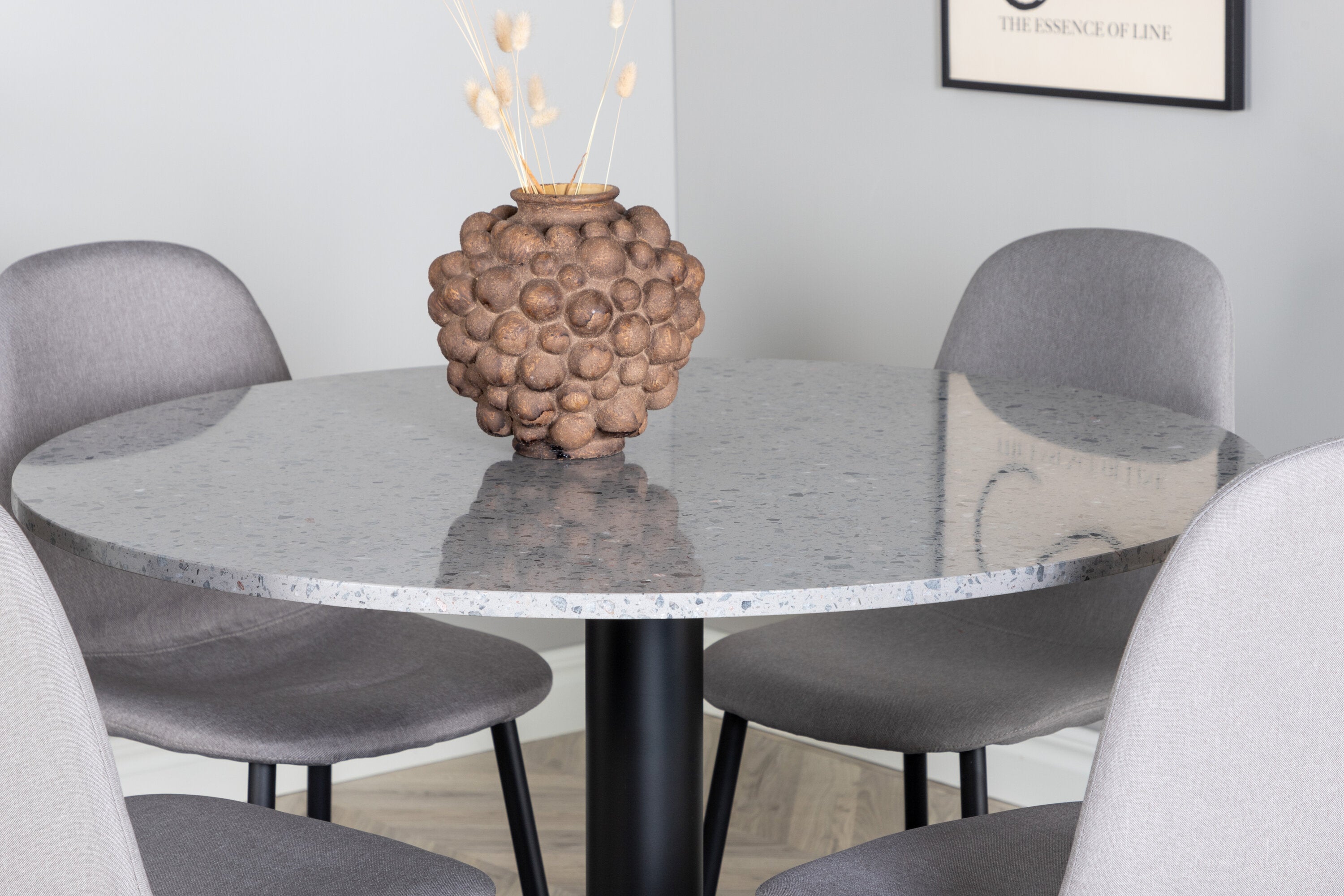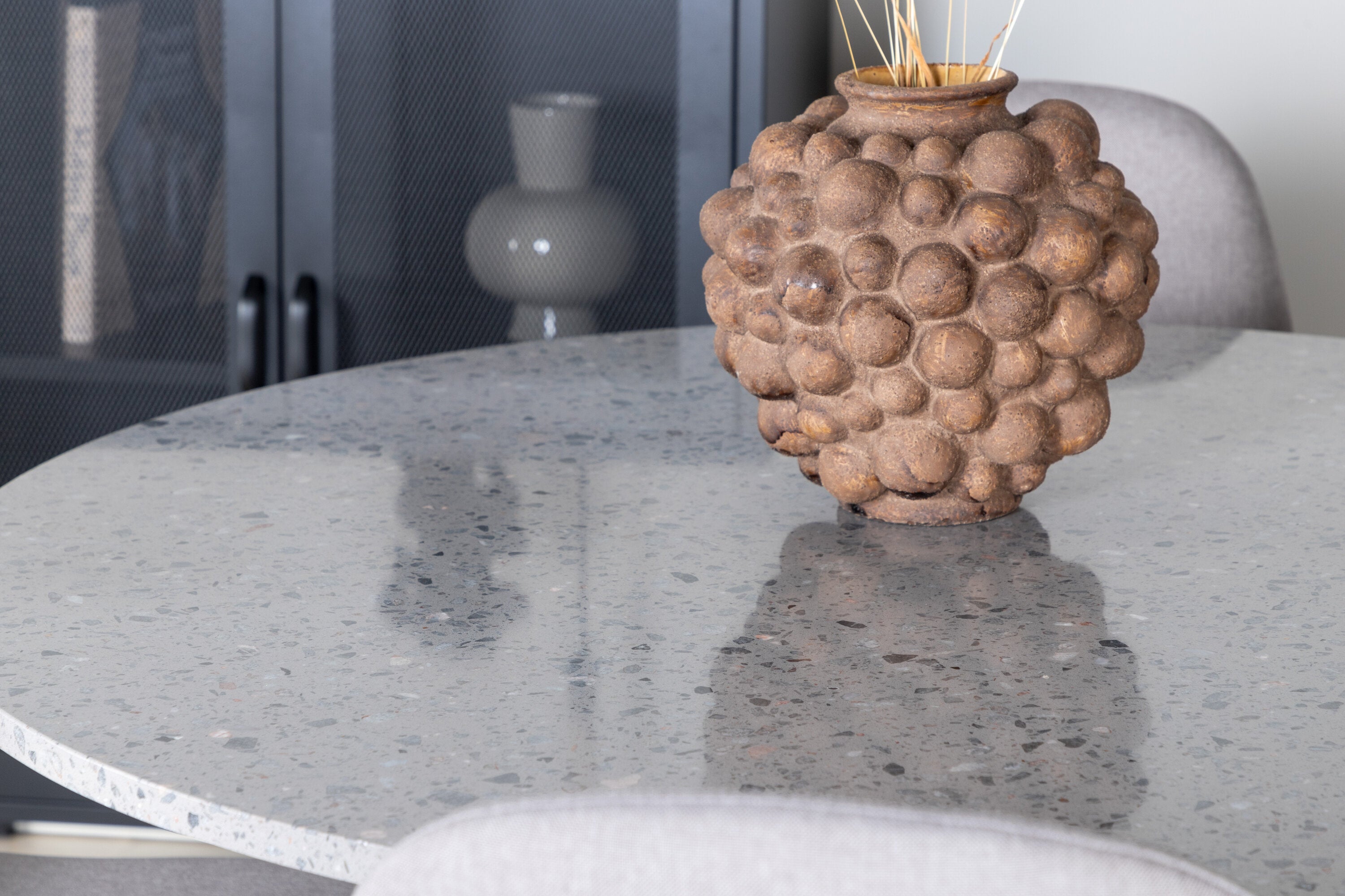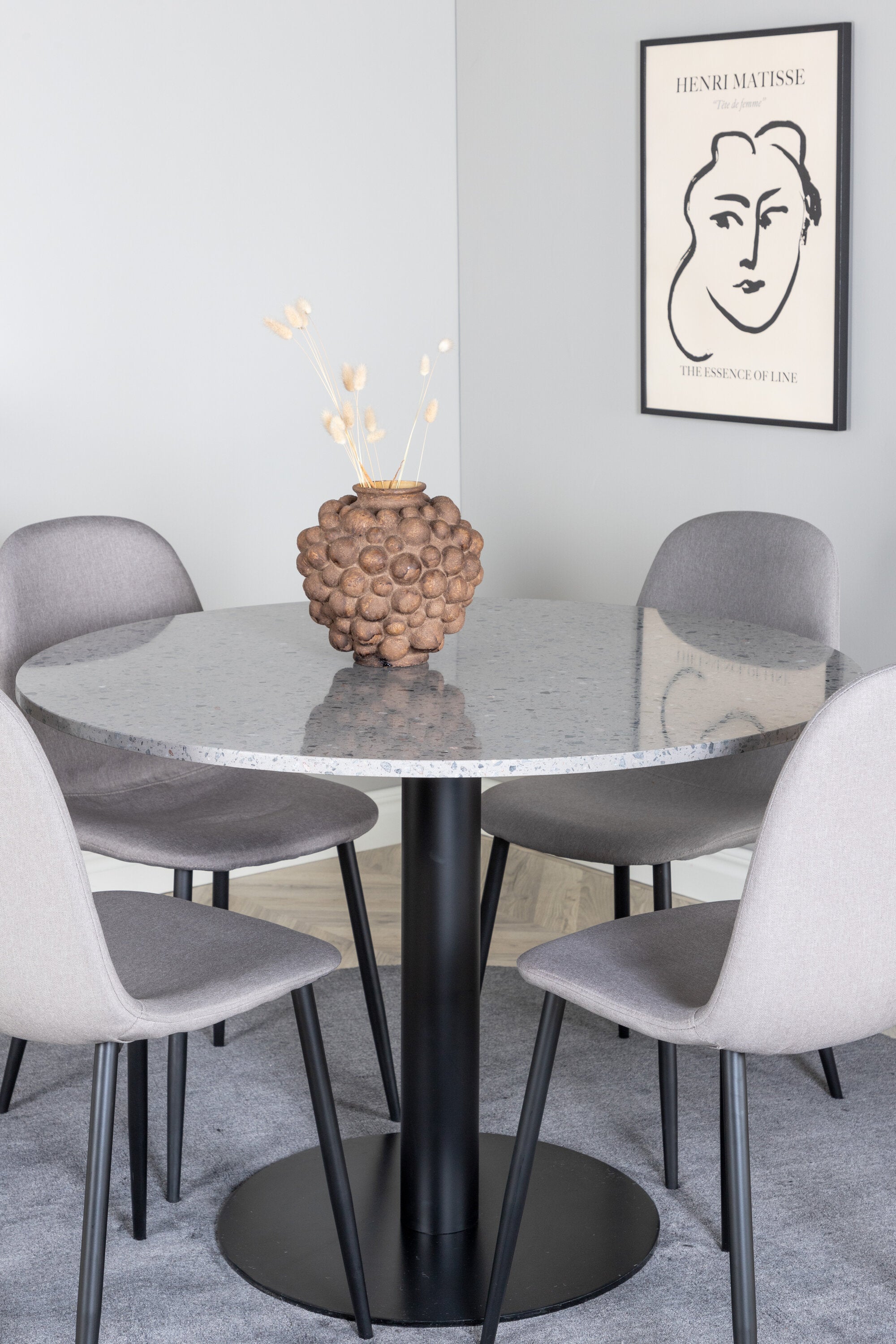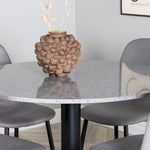 Klasická skupina jídel, která vytváří příjemnou atmosféru! Jídelní stůl Razzia má kulatou stolní desku z krásného terazza s šedým povrchem a rám ve tvaru válce z černého kovu. Zde společně s moderními jídelními židlemi ze série Polar. Židle má plně oblečený design s nohami z černého kovu, mírně zaobleným opěradlem a sedákem z tenké šedé polyesterové tkaniny s měkkým polstrováním pro větší pohodlí. S touto skupinou potravin nemusíte dělat kompromisy mezi pohodlím a designem!