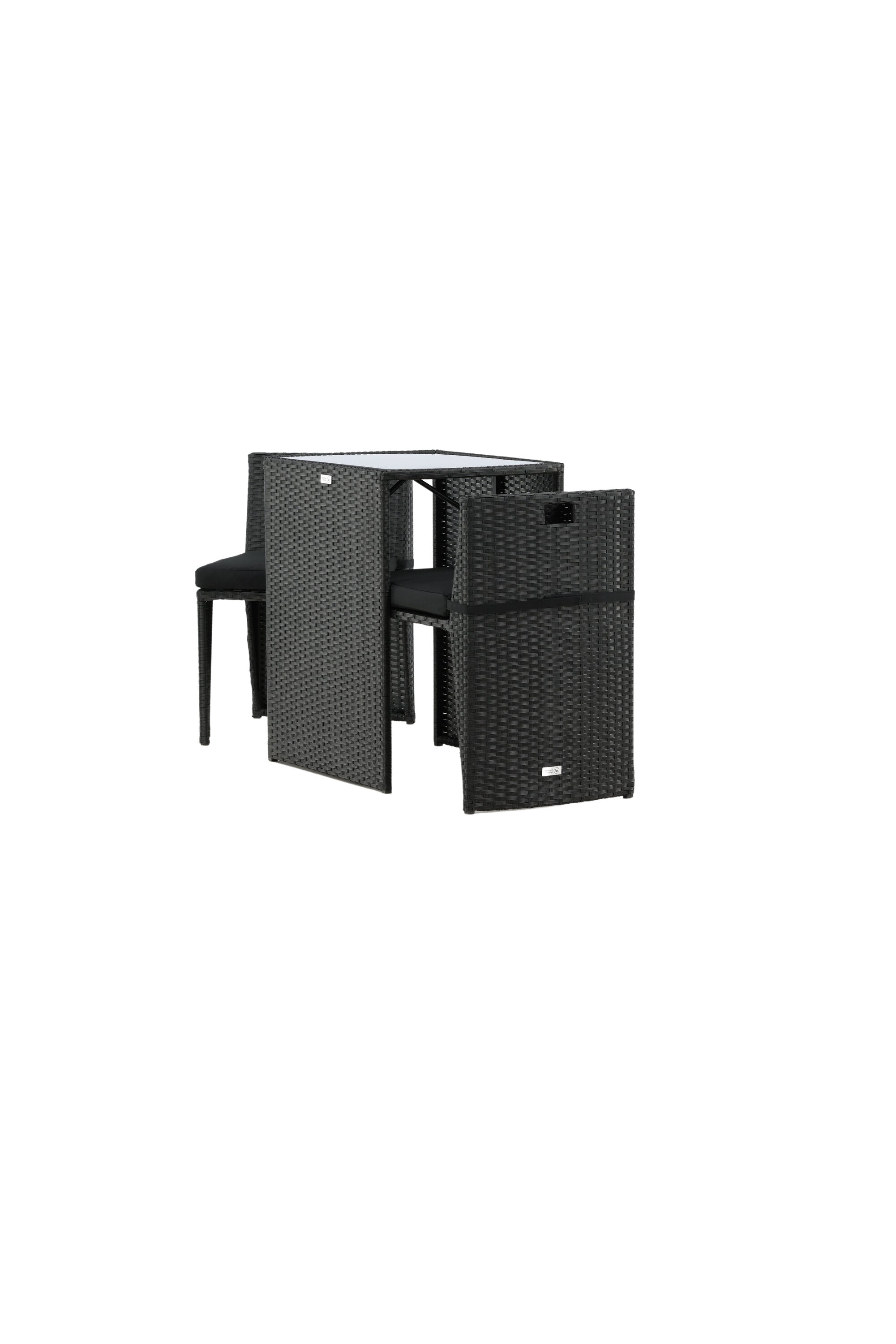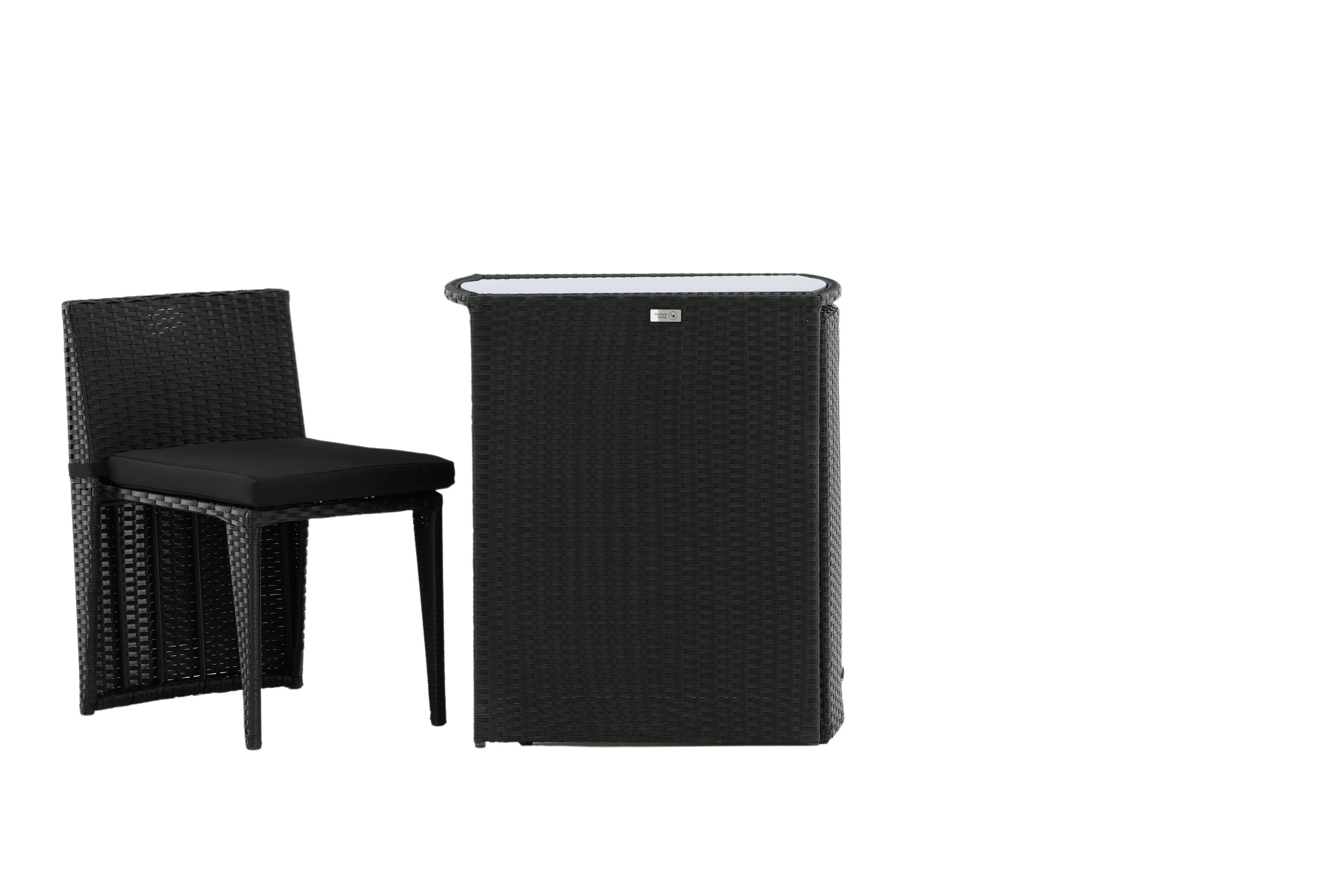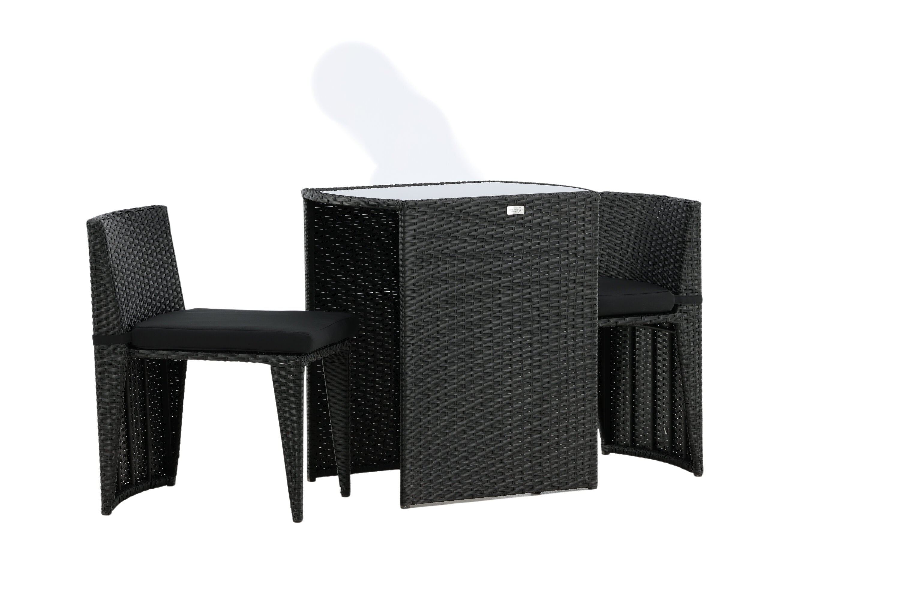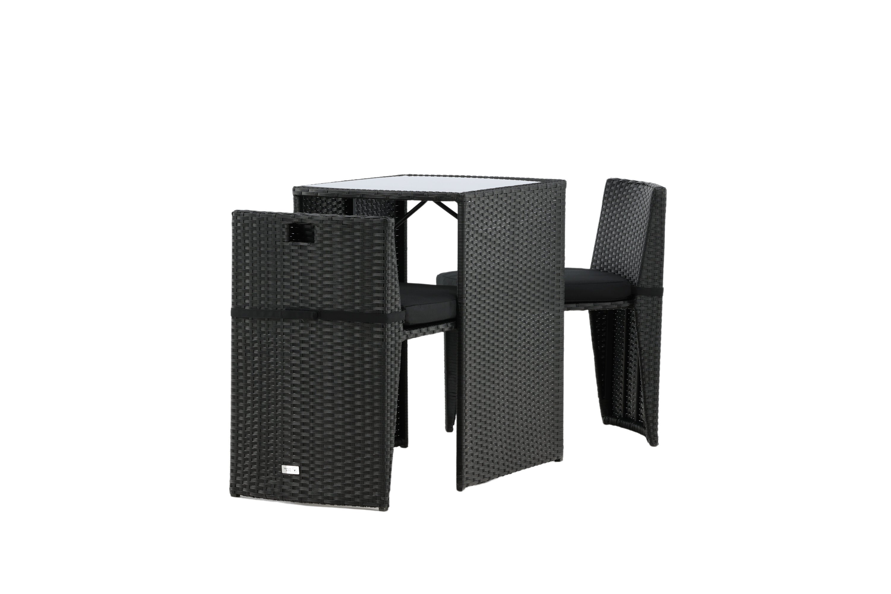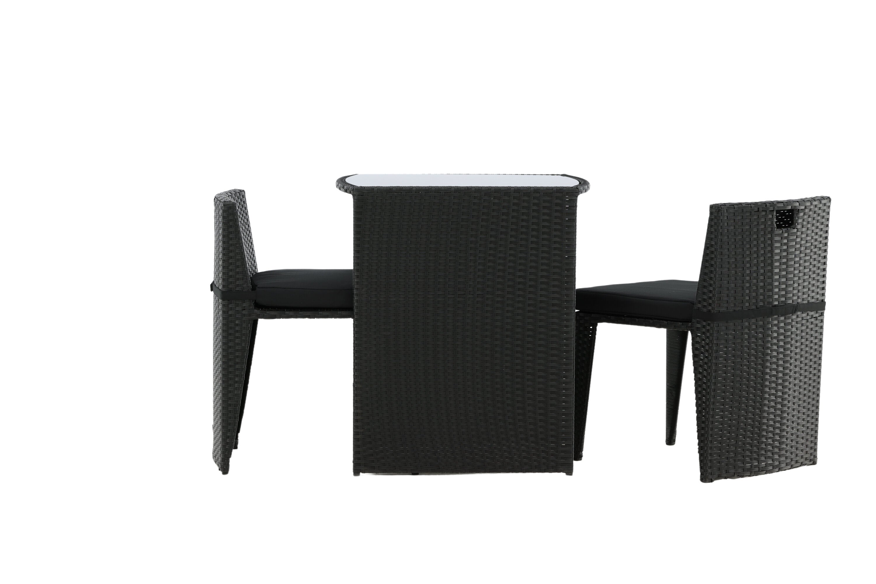 Útulný černý kavárenský set v hezkém designu vyrobený z odolného umělého ratanu, který se perfektně hodí na menší terasu. Kavárenský set se skládá ze dvou židlí a stolu s přidruženou skleněnou deskou, která zastupuje počasí i vítr, úhledné židle jsou dodávány s měkkými sedáky a židle můžete snadno zasunout pod stůl pro snadné skladování a úsporu místa.