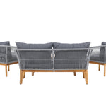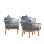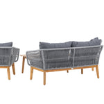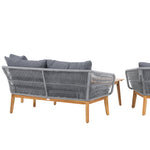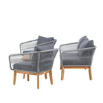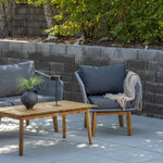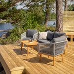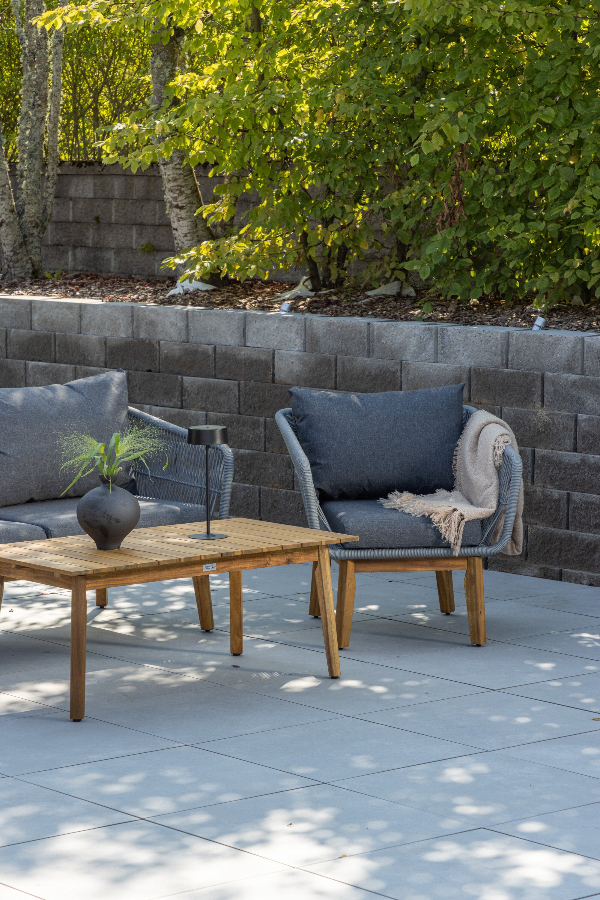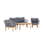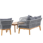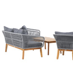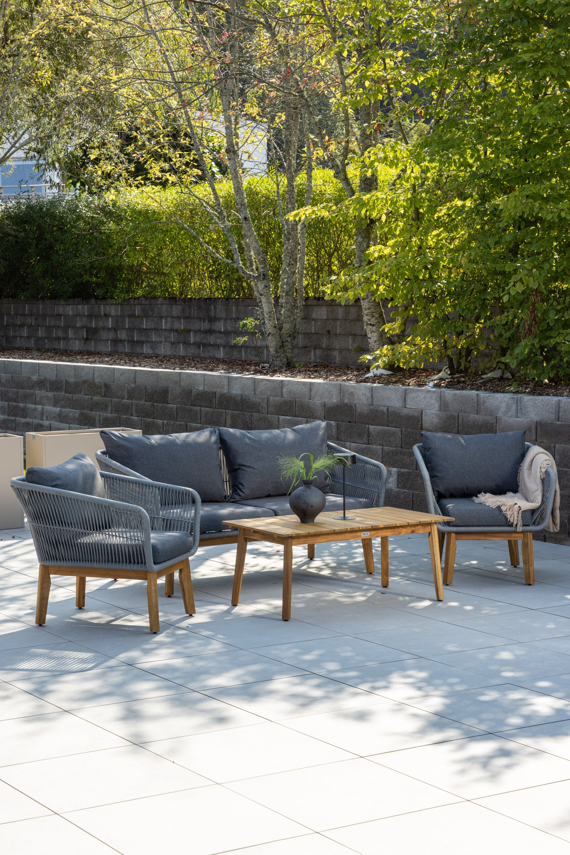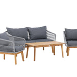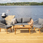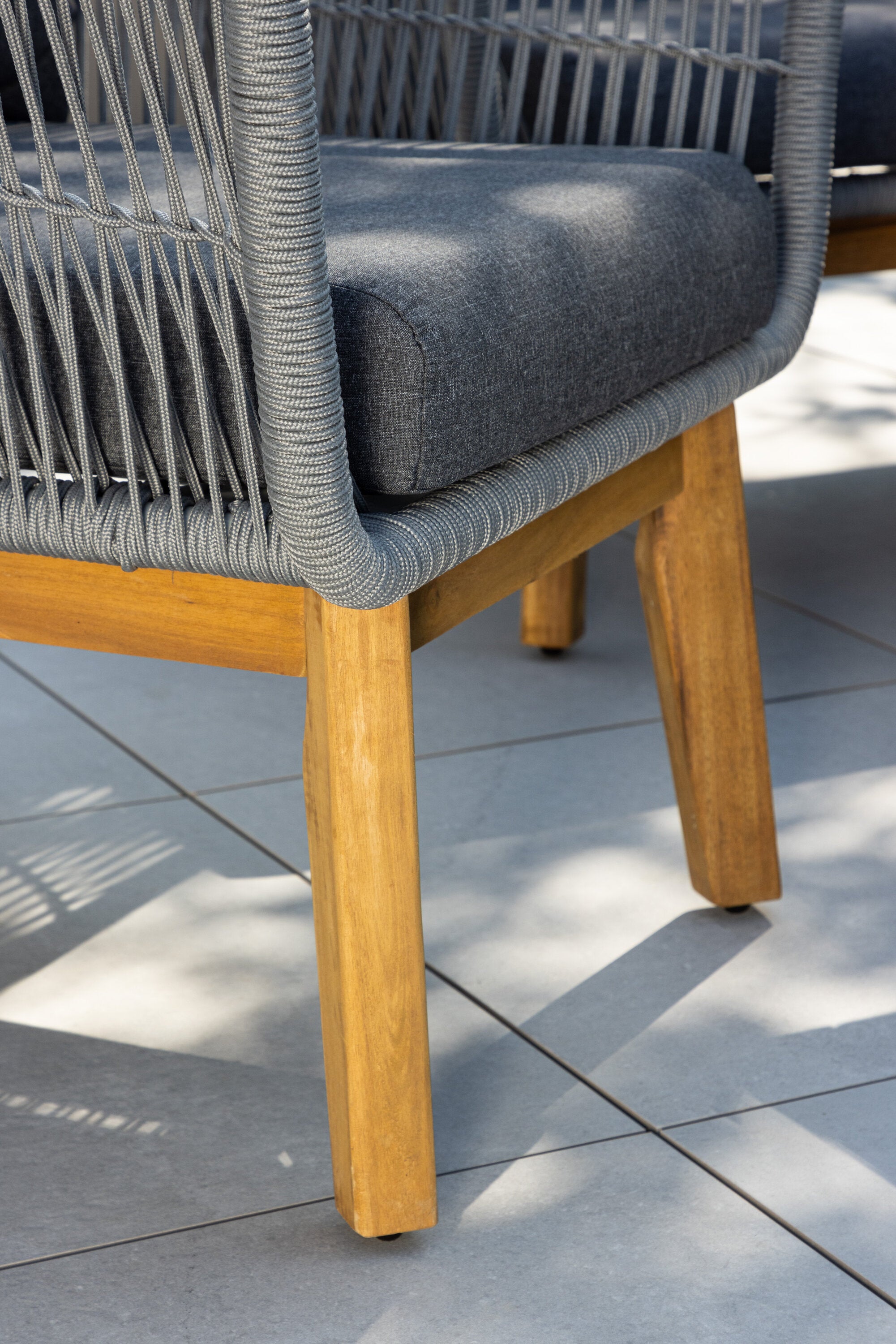 Chania – skupina trendy pohovek se zaměřením na pohodlí a poutavý design. Sedací souprava se skládá z dvoumístné pohovky, dvou rámových křesel včetně silných odolných tmavě šedých polštářů. Součástí pohovky je také nízký konferenční stolek vyrobený celý z krásné akácie. Sestava pohovek je vyrobena s rámem z hliníku a nohami z akácie a její zadní a boční strany jsou opleteny světle šedým provazem, který dodává stylový design. Detaily sedací soupravy v akátové barvě spolu s klasickým designem konferenčního stolku vytvářejí exkluzivní dojem celku.