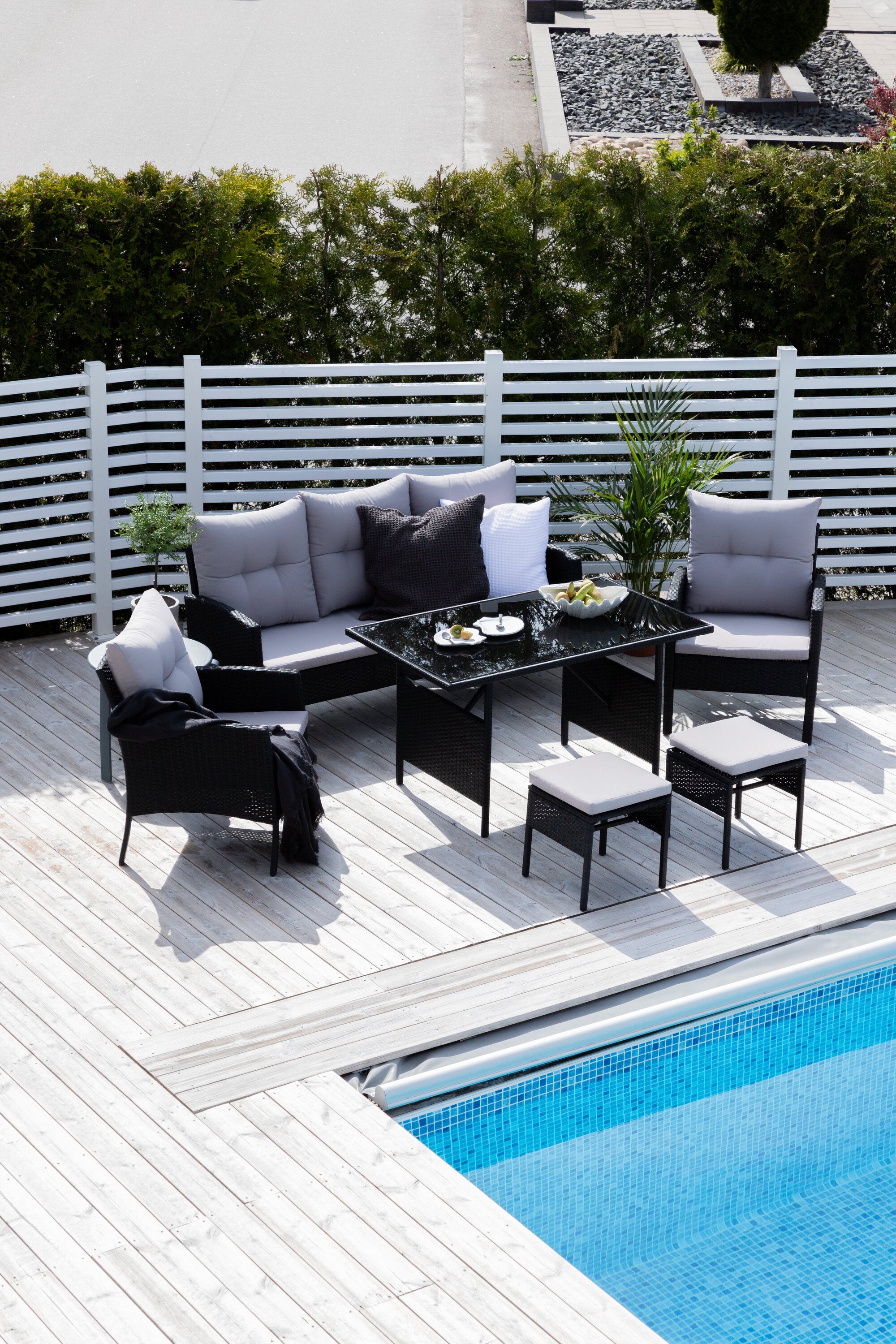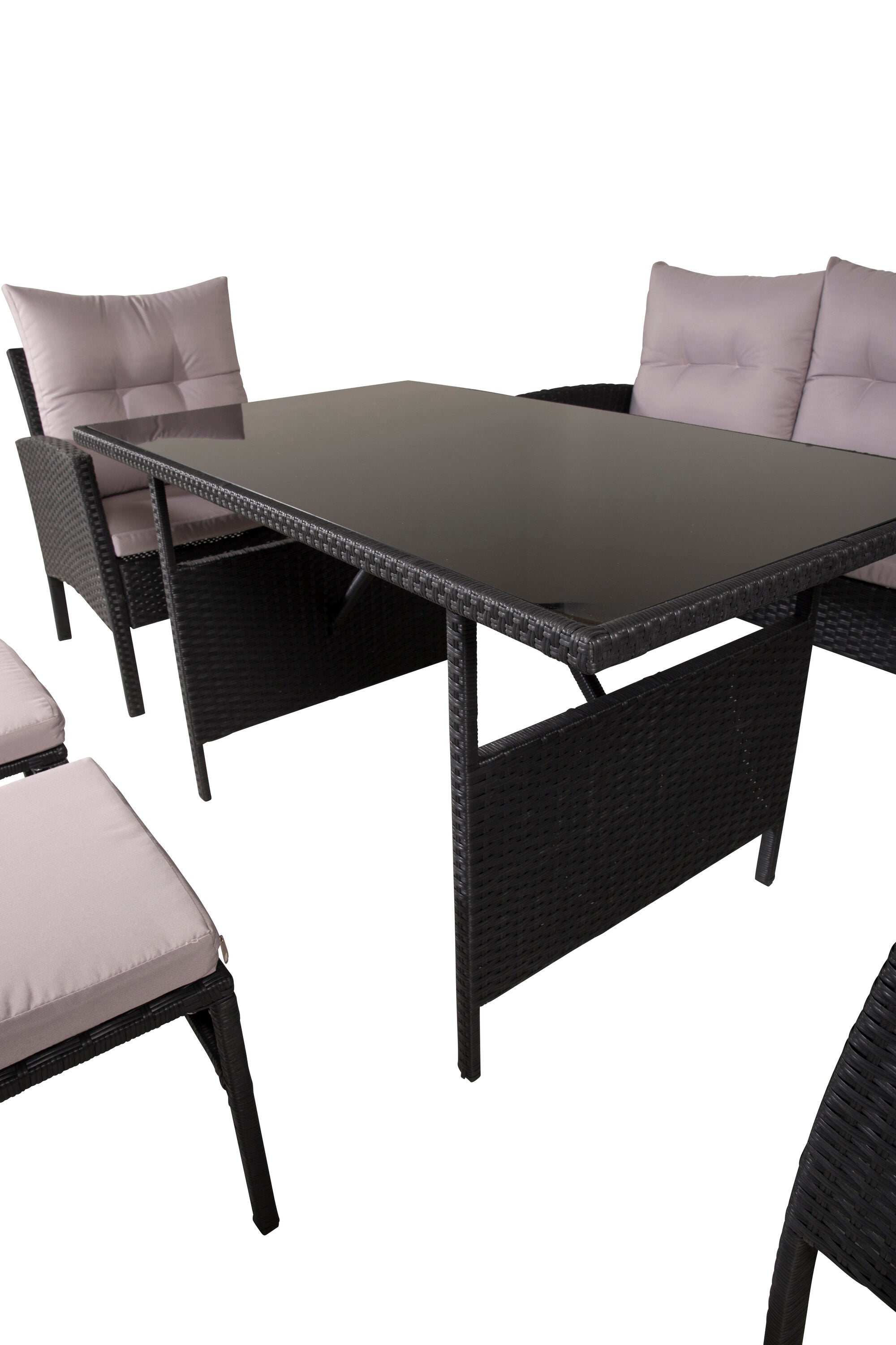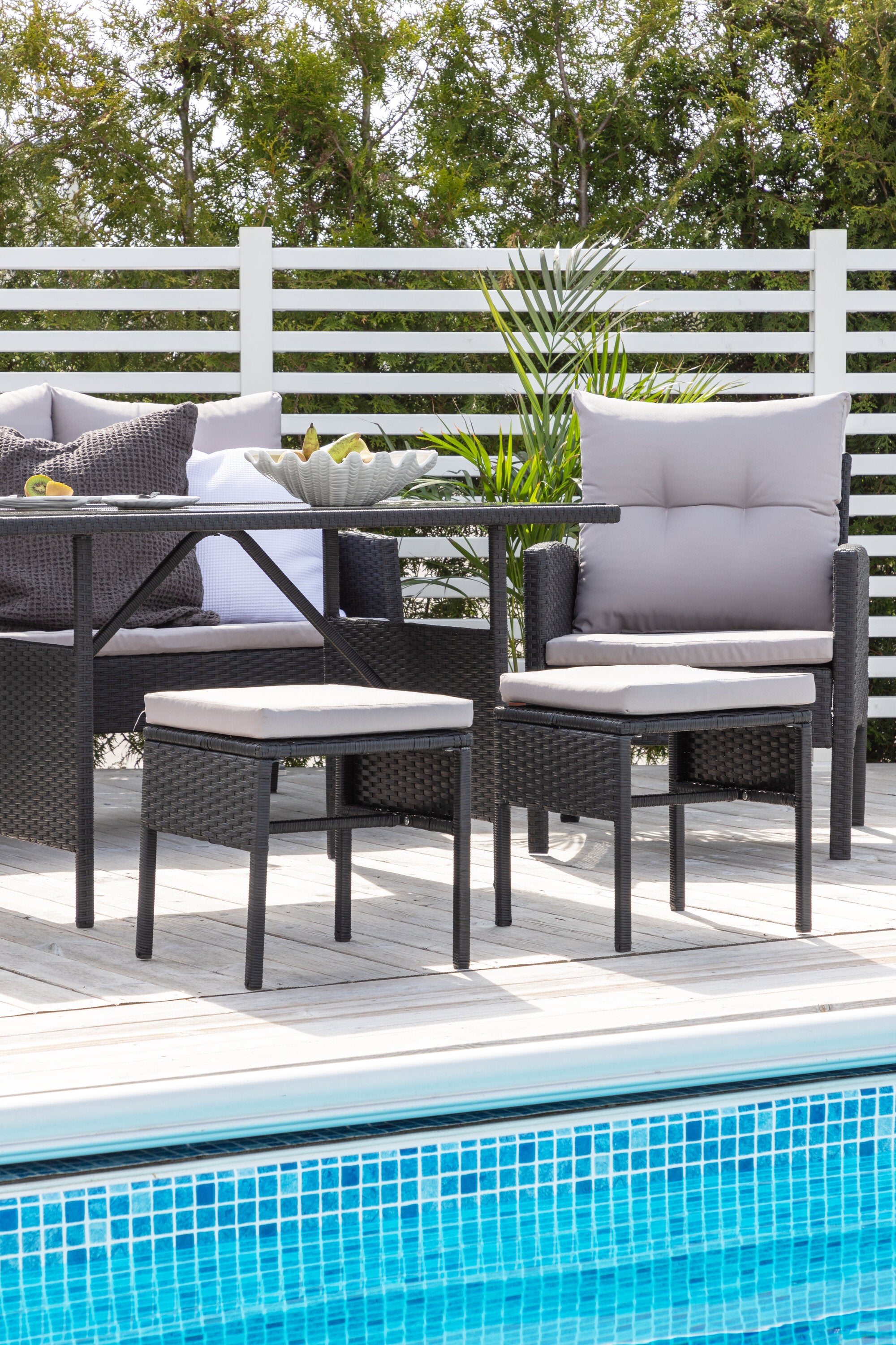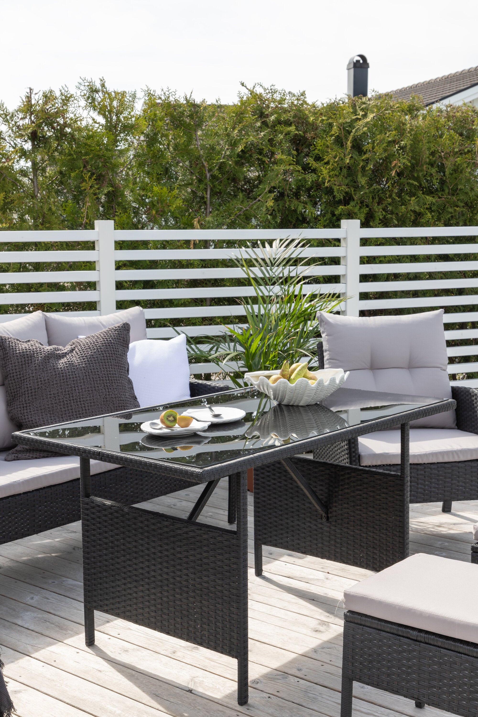 Knock vytváří lákavý poutač pro vaši terasu! Moderní všestranná pohovka z černého umělého ratanu, která se skvěle hodí jak na balkon, tak i do venkovního prostoru. Sedací souprava se skládá z třímístné pohovky, dvou rámových křesel a dvou palet, včetně šedých nakládaných měkkých polštářů a obdélníkového jídelního stolu s černou skleněnou deskou. Je vyžadována lehčí montáž. Tip: Palety lze použít jako další sedadlo nebo jako podnožku pro křesla nebo pohovku.