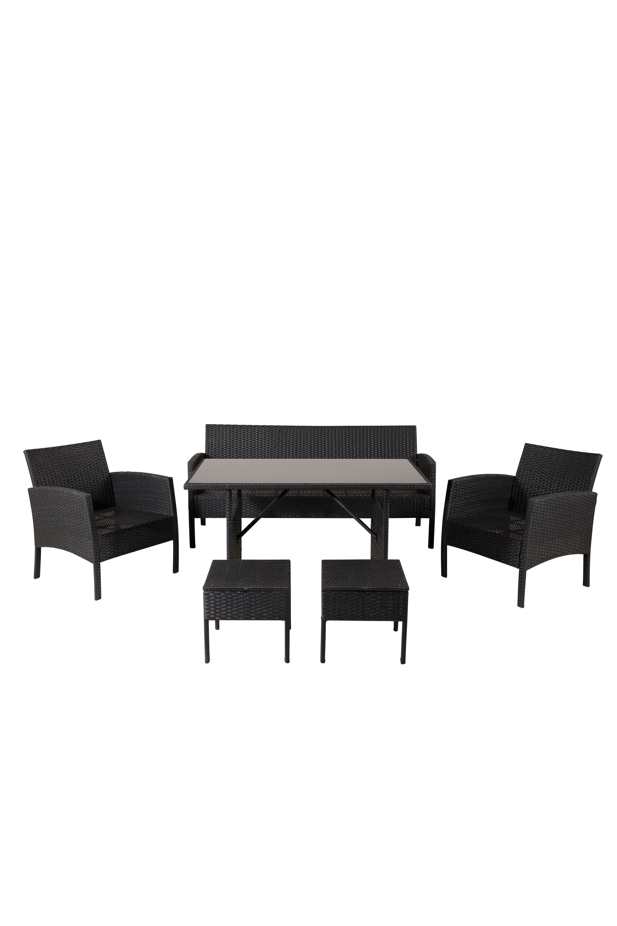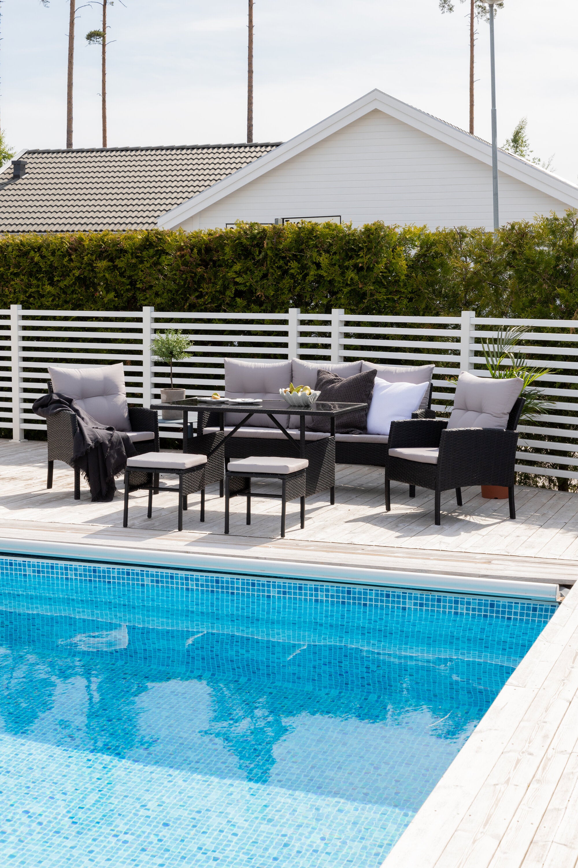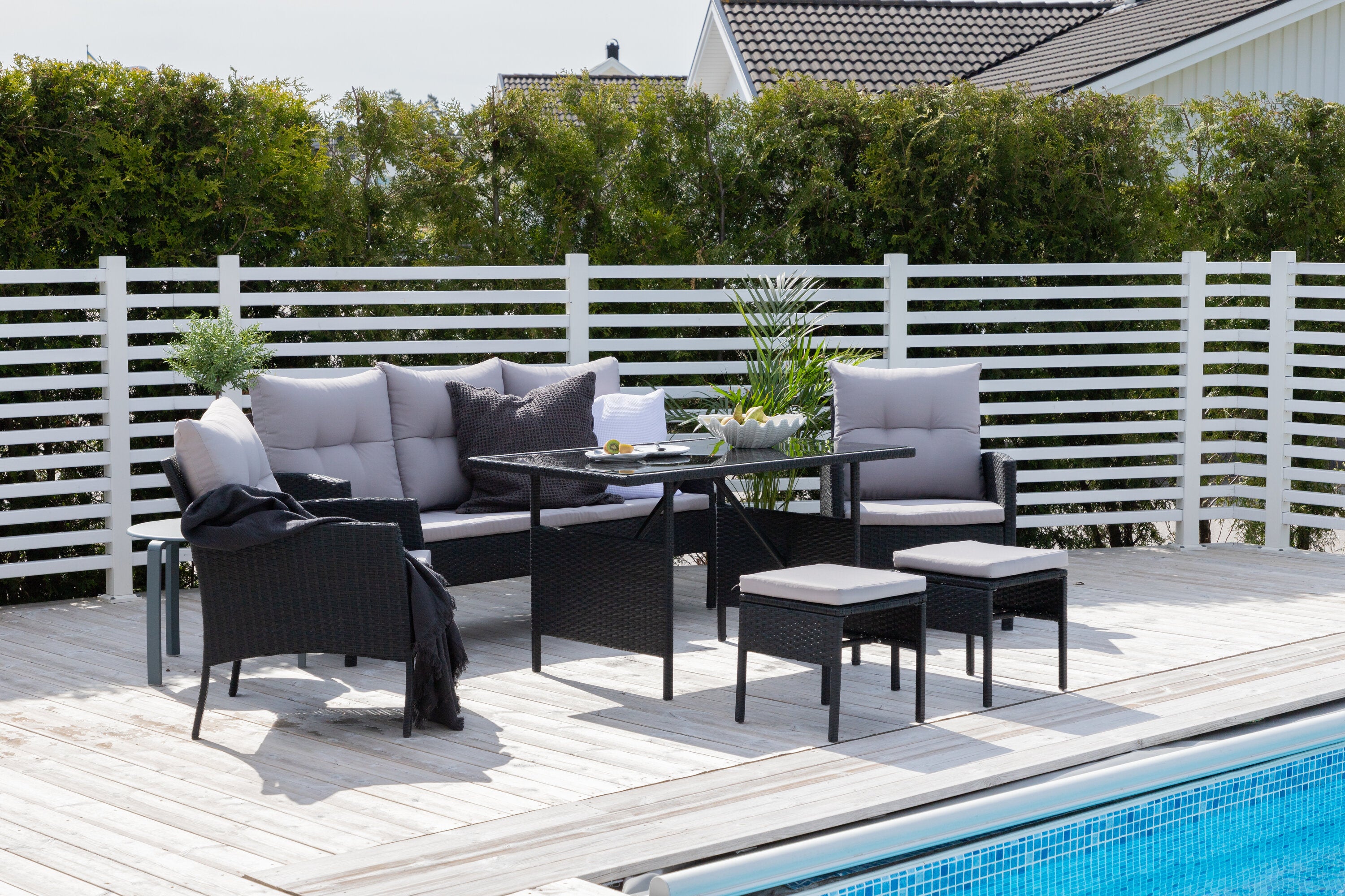 Knock vytváří lákavý poutač pro vaši terasu! Moderní všestranná pohovka z černého umělého ratanu, která se skvěle hodí jak na balkon, tak i do venkovního prostoru. Sedací souprava se skládá z třímístné pohovky, dvou rámových křesel a dvou palet, včetně šedých nakládaných měkkých polštářů a obdélníkového jídelního stolu s černou skleněnou deskou. Je vyžadována lehčí montáž. Tip: Palety lze použít jako další sedadlo nebo jako podnožku pro křesla nebo pohovku.