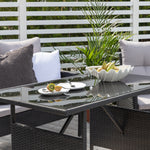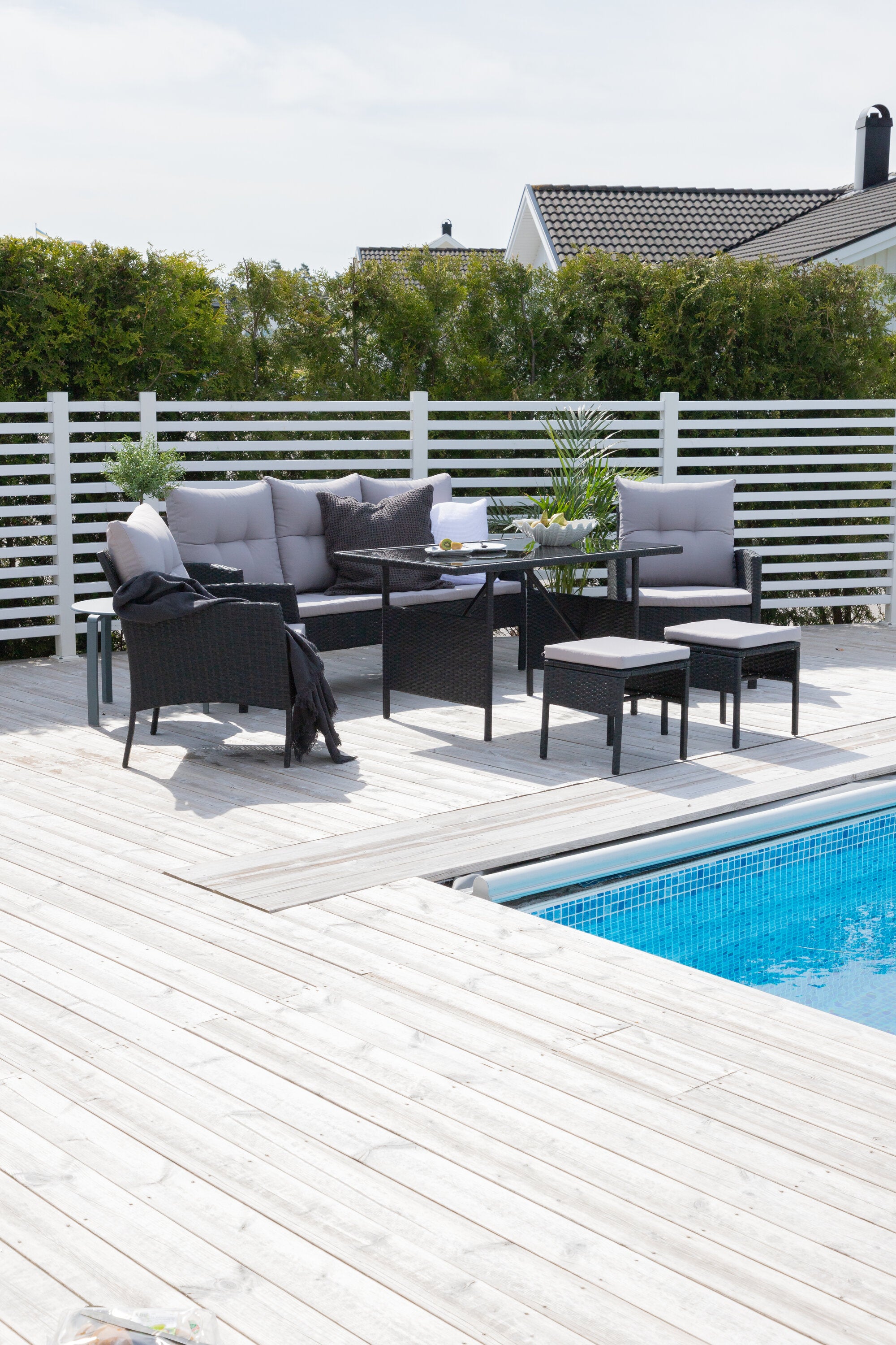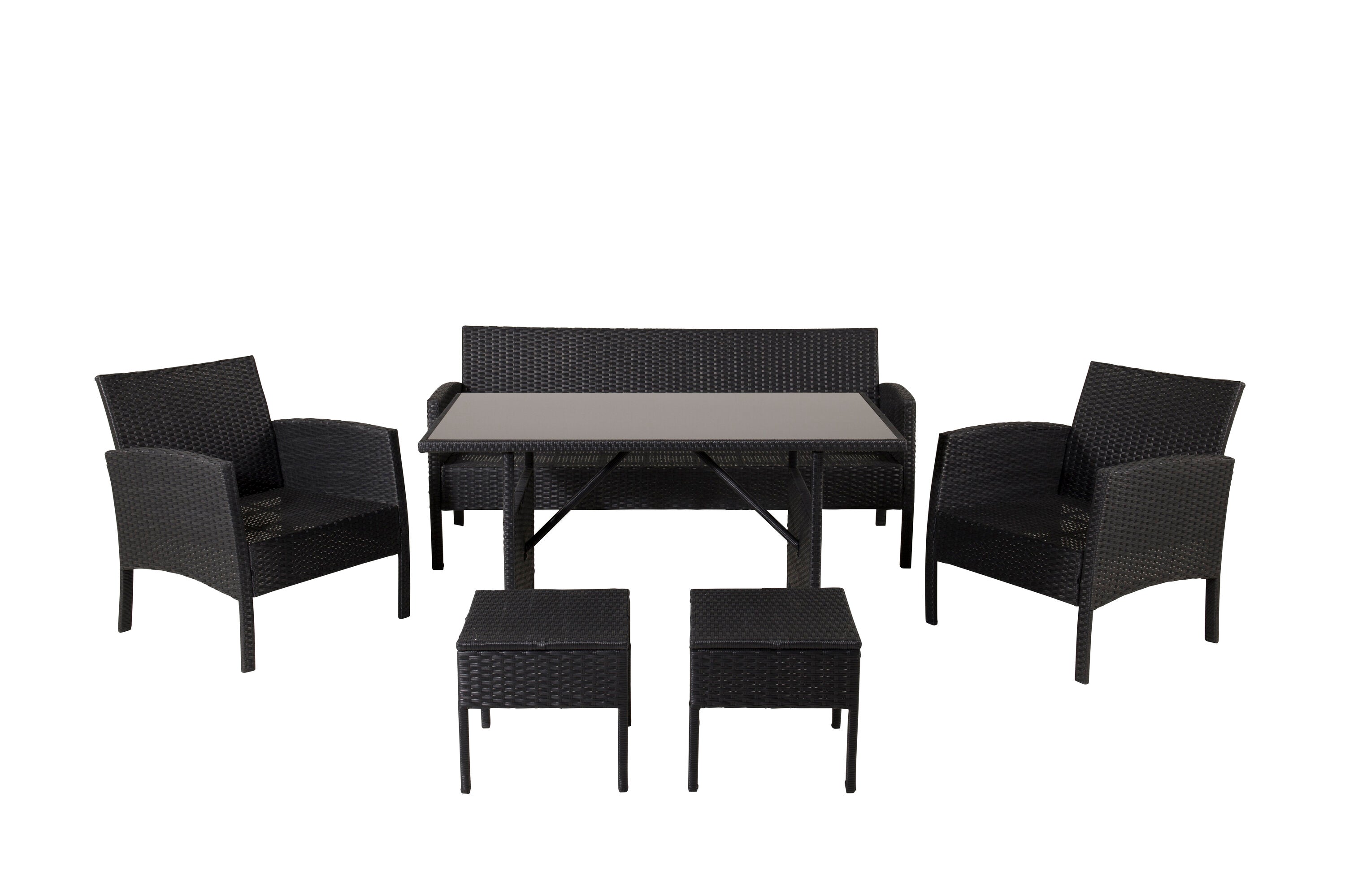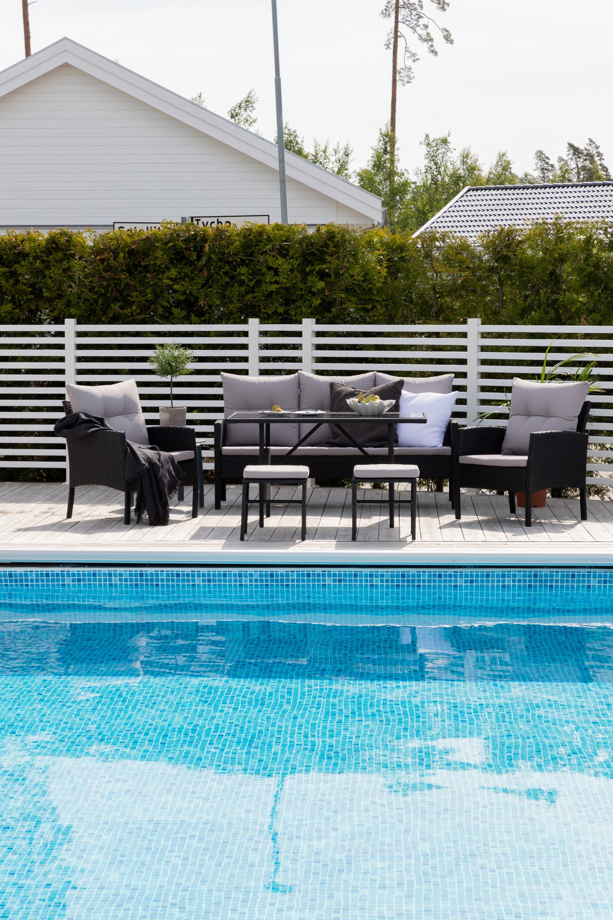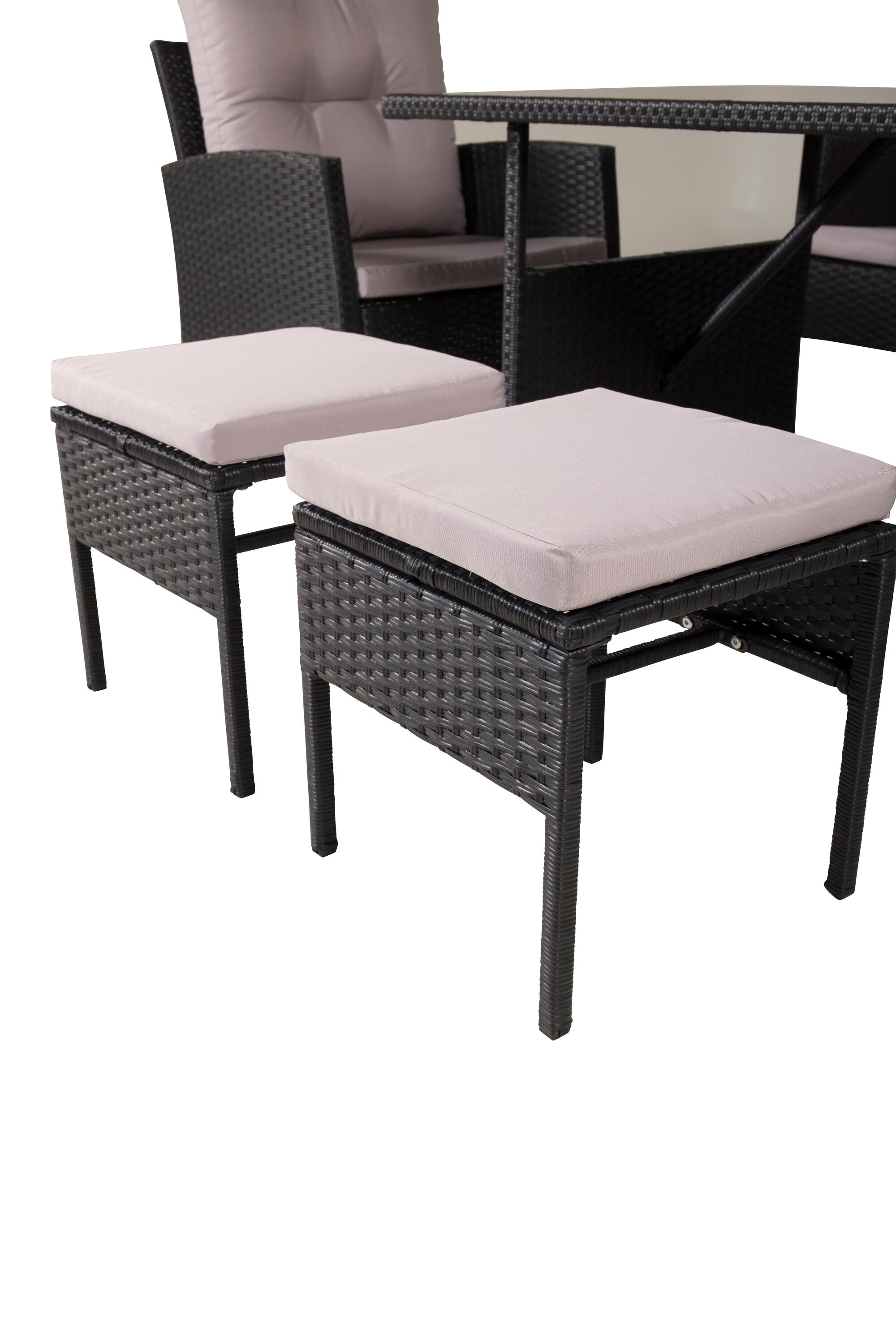 Knock vytváří lákavý poutač pro vaši terasu! Moderní všestranná pohovka z černého umělého ratanu, která se skvěle hodí jak na balkon, tak i do venkovního prostoru. Sedací souprava se skládá z třímístné pohovky, dvou rámových křesel a dvou palet, včetně šedých nakládaných měkkých polštářů a obdélníkového jídelního stolu s černou skleněnou deskou. Je vyžadována lehčí montáž. Tip: Palety lze použít jako další sedadlo nebo jako podnožku pro křesla nebo pohovku.