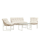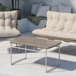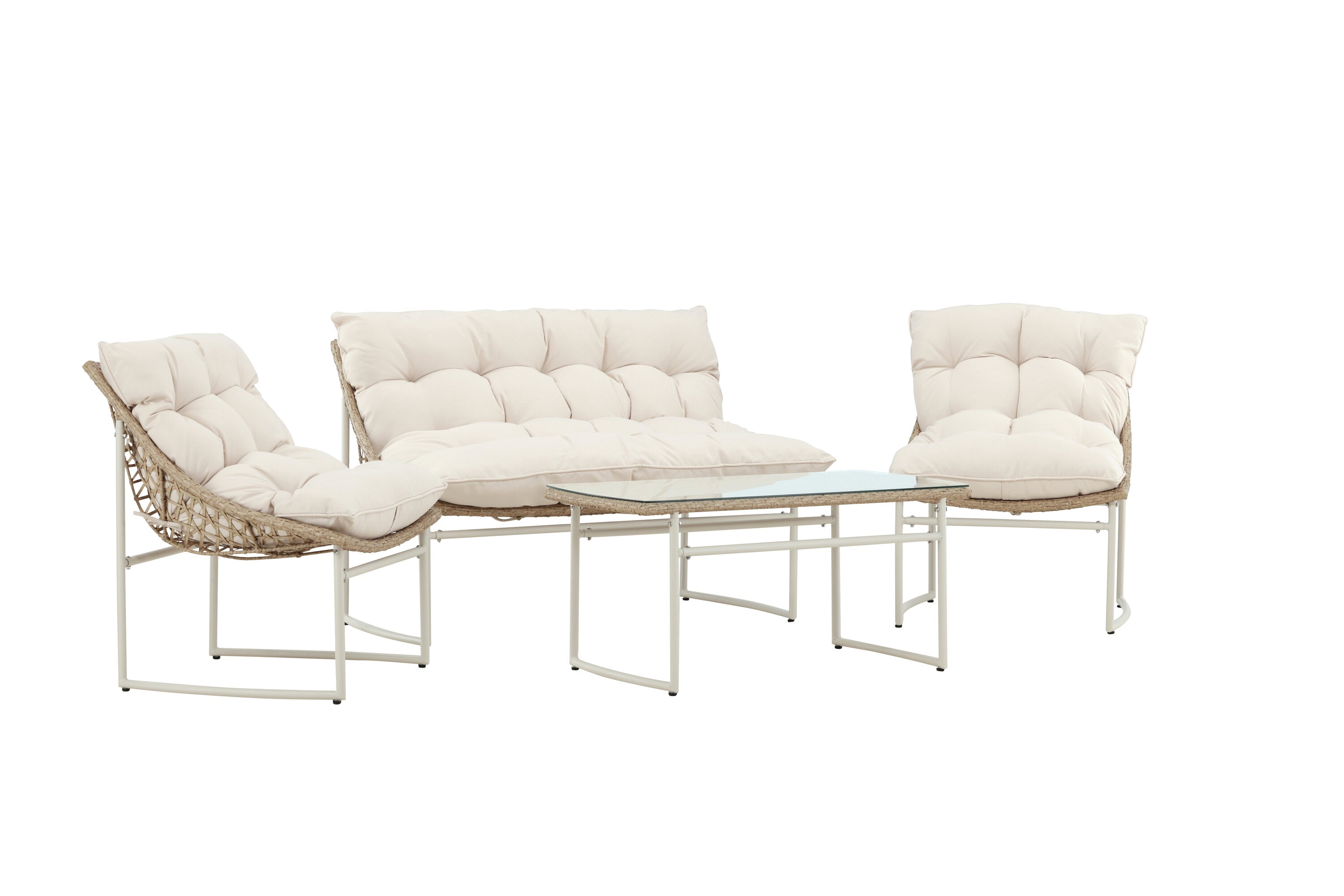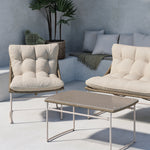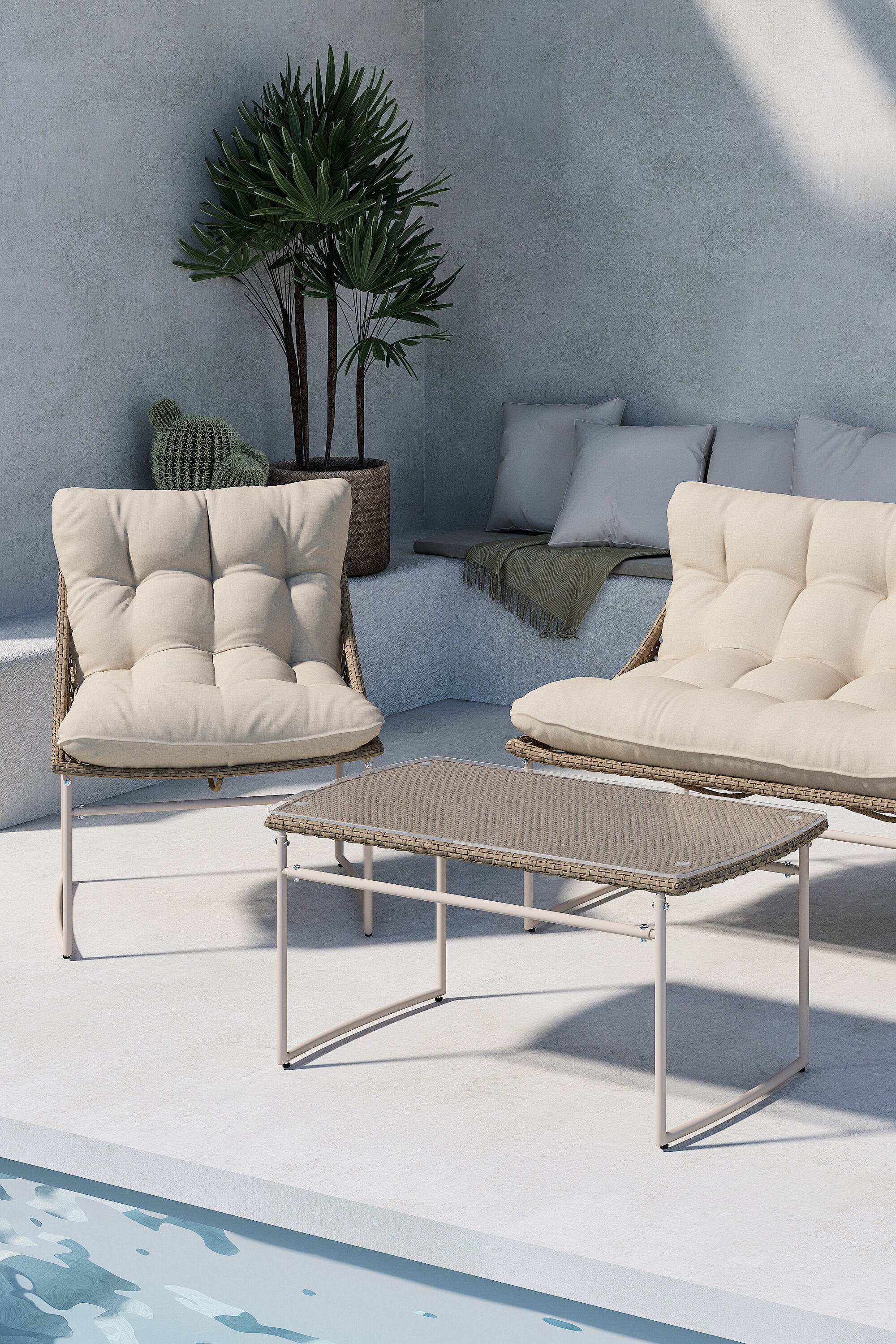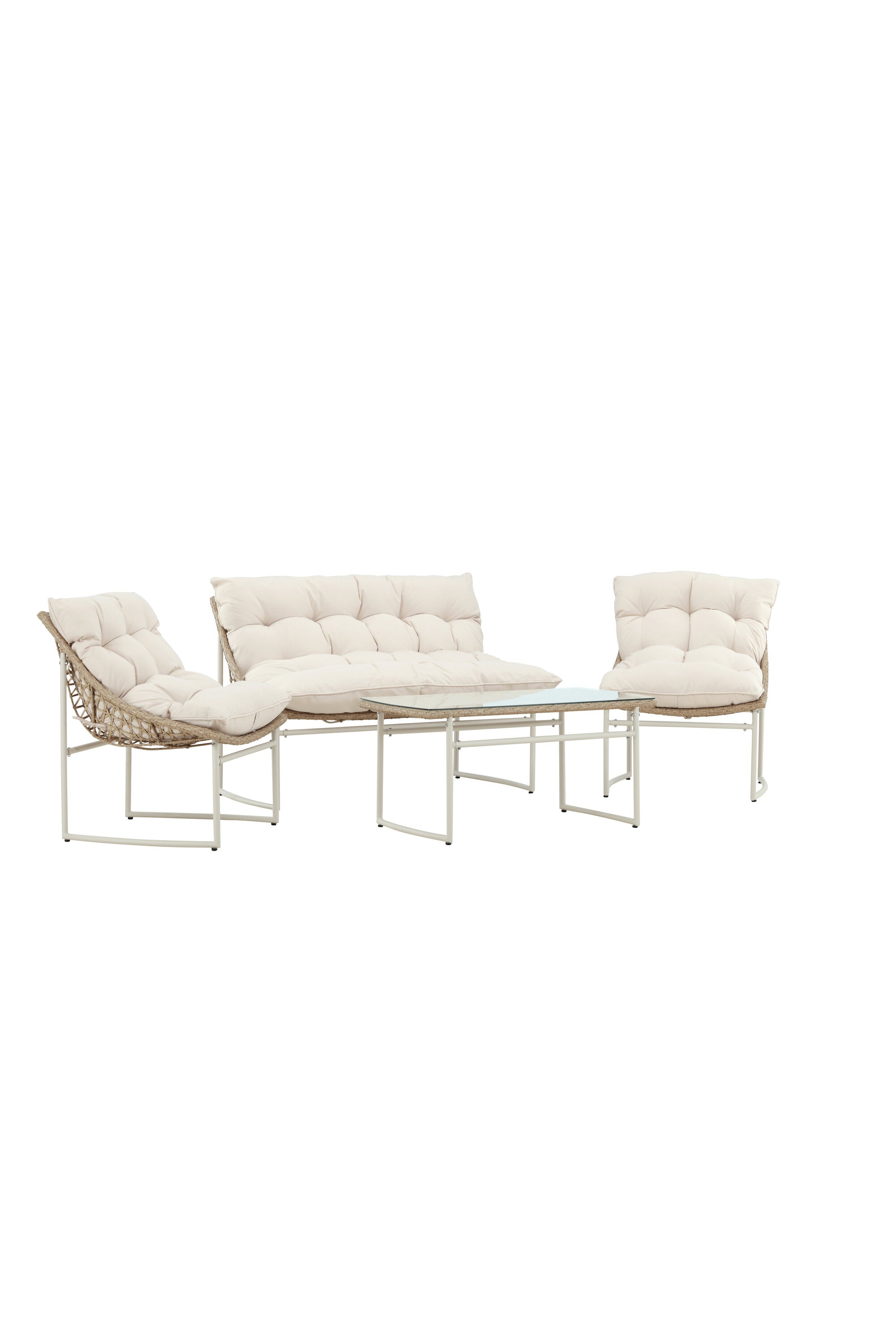 Sedací souprava Tina je lákavou kombinací stylu a pohodlí, ideální pro vaši terasu nebo terasu. Sestava se skládá z elegantní pohovky, dvou pohodlných křesel a stylového stolu, což vytváří kompletní prostředí obývacího pokoje. S ocelovým rámem a deskou ze syntetického ratanu se skleněným povrchem nabízí stůl stabilitu a luxusní pocit.