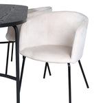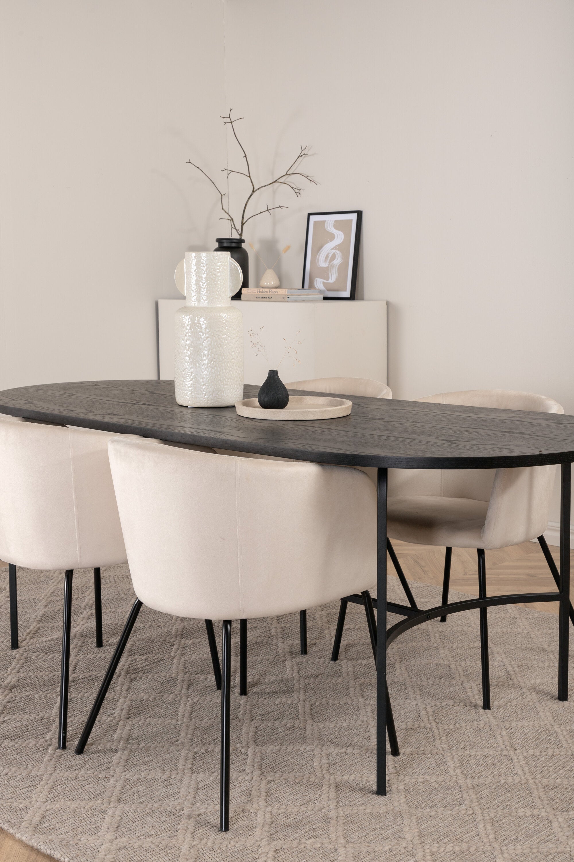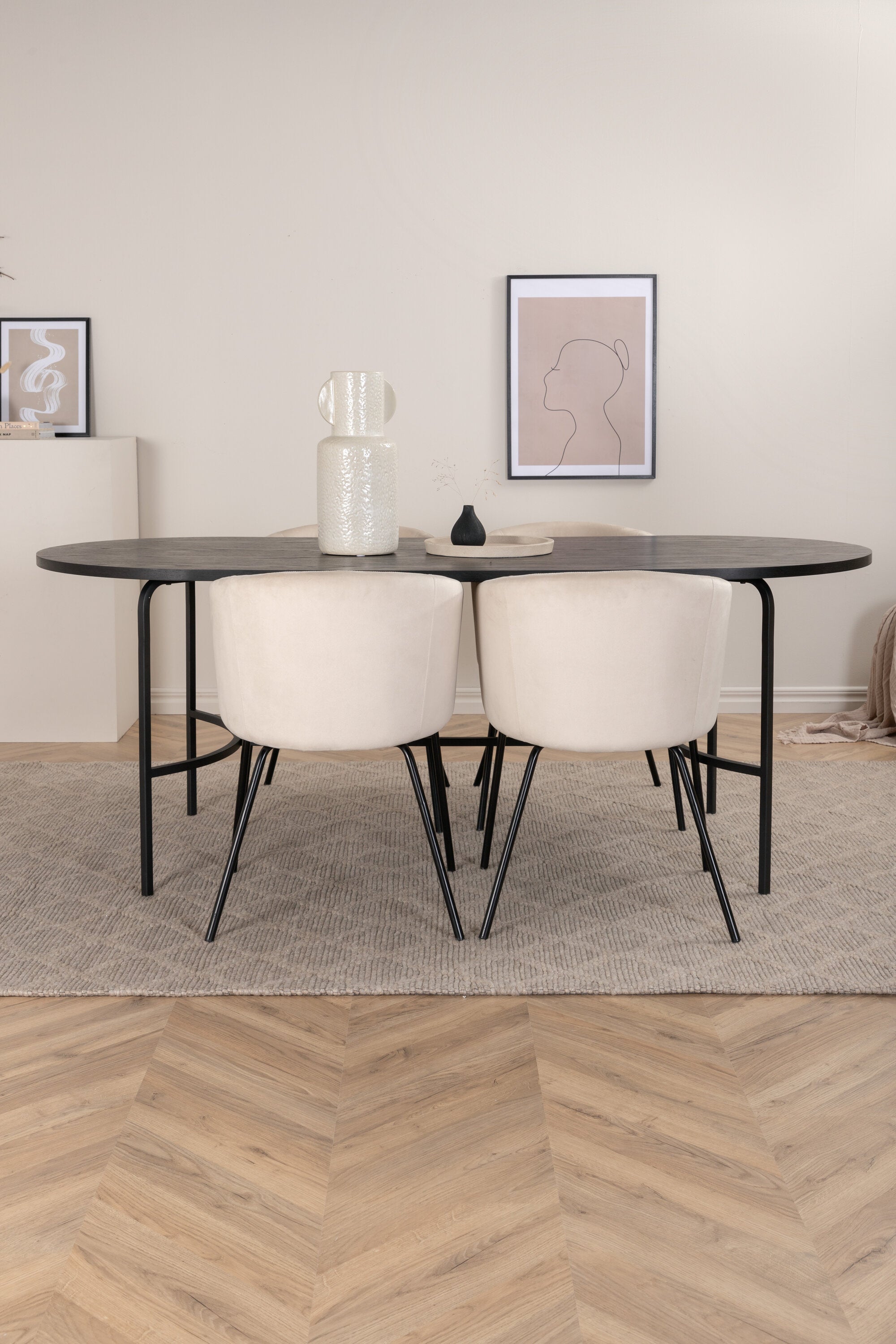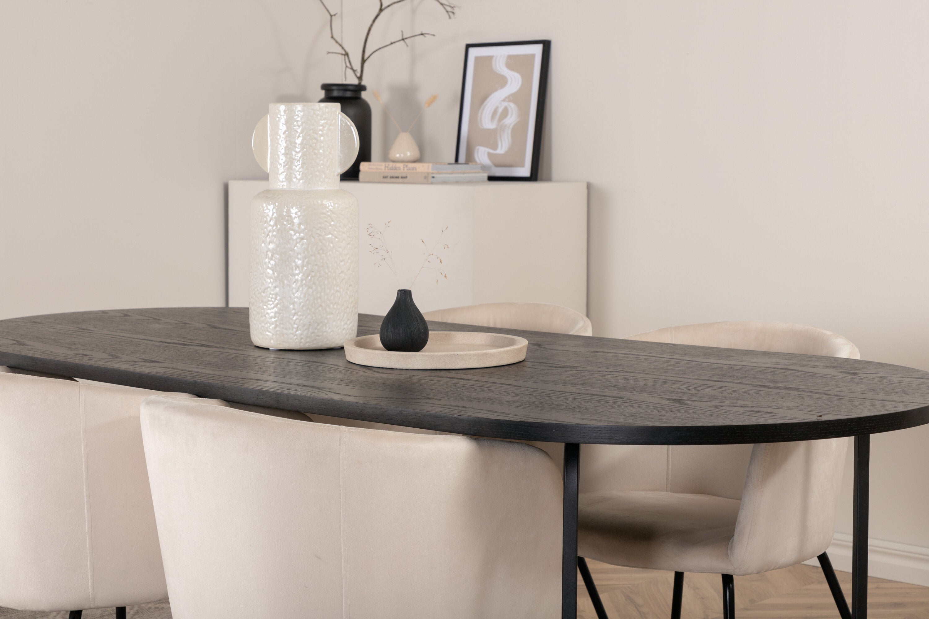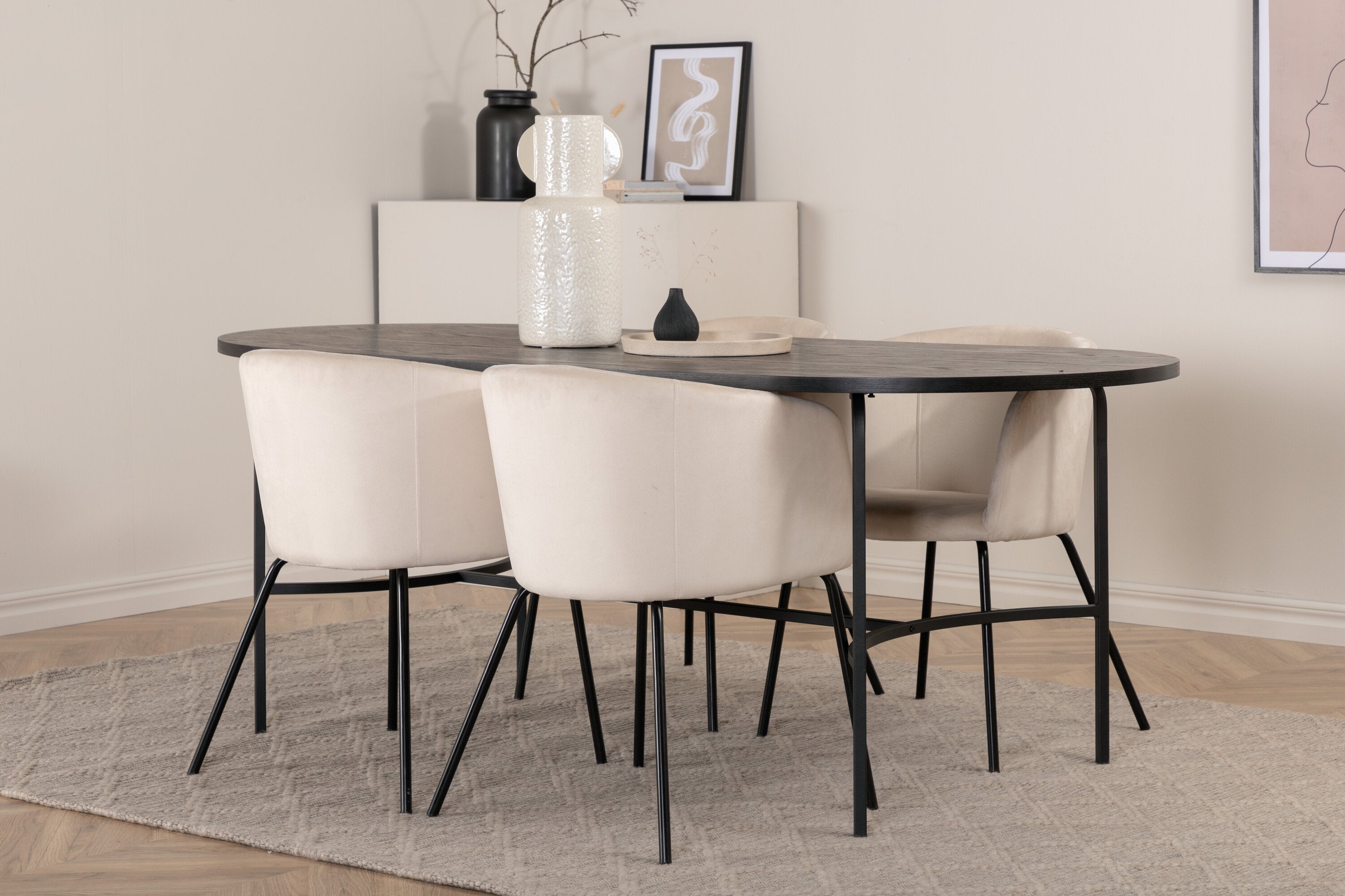 Pompézní a elegantní - skupina potravin zaměřující se na pohodlí a minimalismus! Naše oblíbené jídelní židle Berit jsou oblíbené v mnoha domácnostech. Mají příjemný design a teplou barvu v béžové, která je neuvěřitelně přitažlivá. Sedák je ze sametové látky a nohy židle jsou stylově úzké z černého železa. Rozměry židle: výška: 78 cm, výška sedáku: 49 cm, šířka: 55 cm, hloubka: 55 cm. Zde jsou 4 jídelní židle sladěny s naším oválným jídelním stolem skate. Celkový design stolu je velmi promyšlený s tenkou horní deskou v černé MDF s dýhou a černými nohami stolu v kovu. Rozměry stolu: Délka: 200 cm, Šířka: 90 cm, Výška: 75 cm.