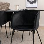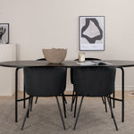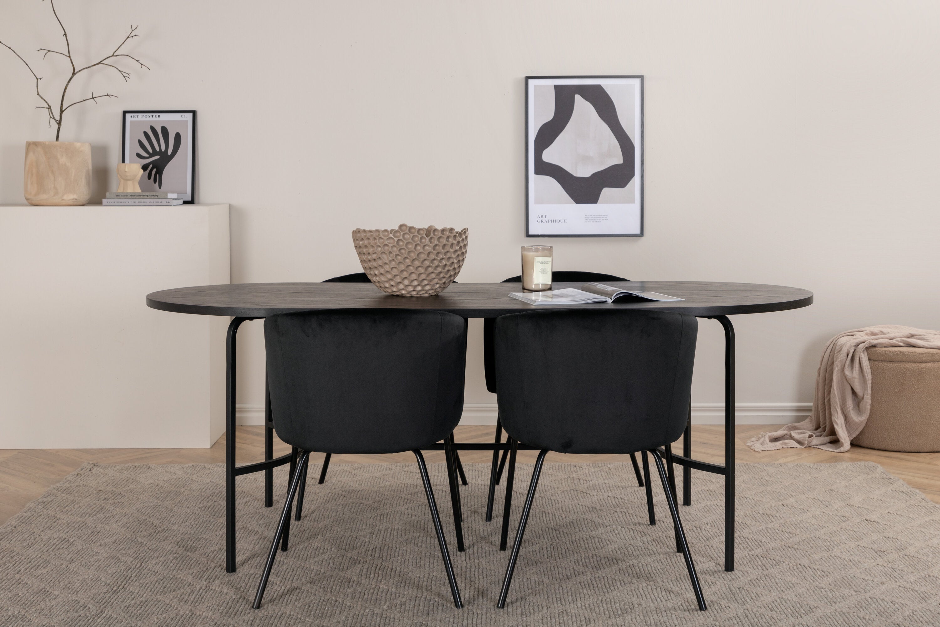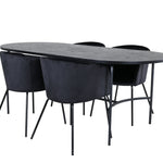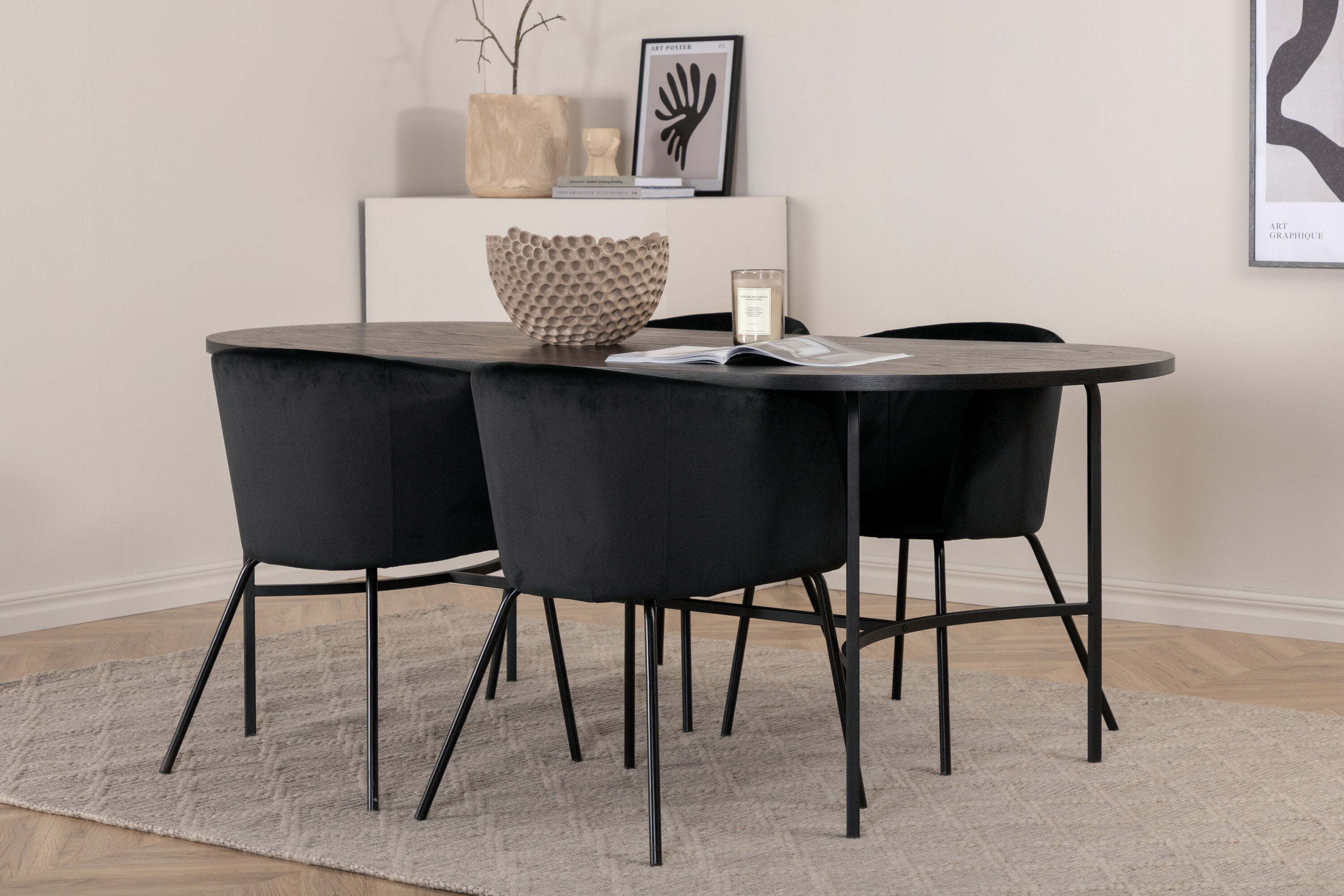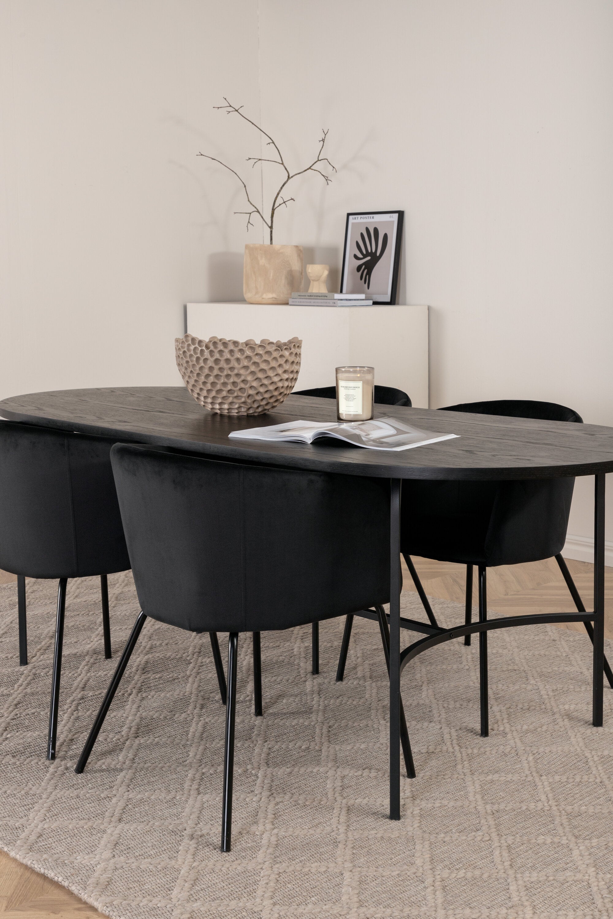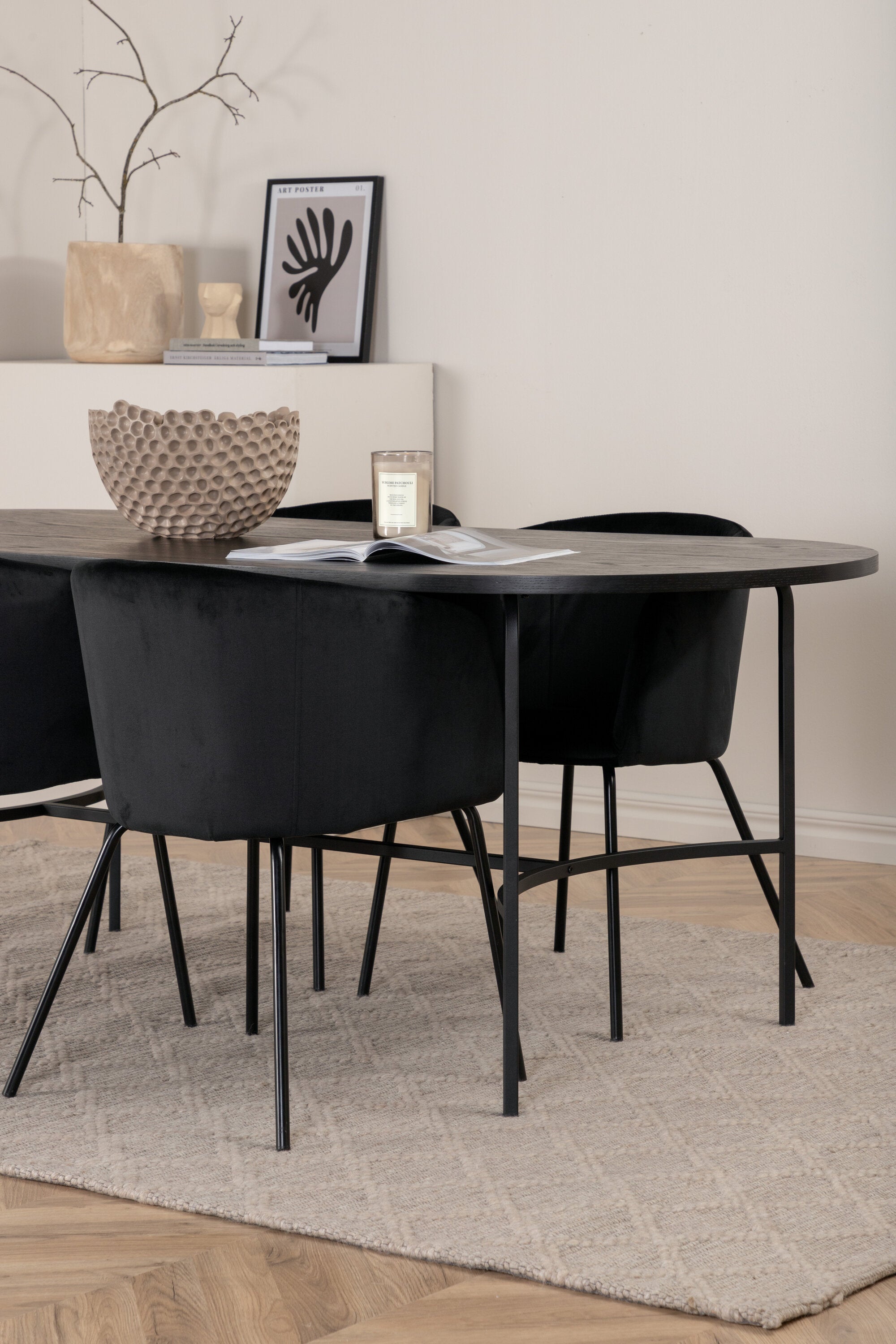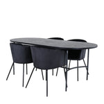 Pompézní a elegantní - skupina potravin zaměřující se na pohodlí a minimalismus! Naše oblíbené jídelní židle Berit jsou oblíbené v mnoha domácnostech. Mají příjemný design a nadčasovou černou barvu, která je neuvěřitelně přitažlivá. Sedák je ze sametové látky a nohy židle jsou stylově úzké z černého železa. Rozměry židle: výška: 78 cm, výška sedáku: 49 cm, šířka: 55 cm, hloubka: 55 cm. Zde jsou 4 jídelní židle sladěny s naším oválným jídelním stolem skate. Celkový design stolu je velmi promyšlený s tenkou horní deskou v černé MDF s dýhou a černými nohami stolu v kovu. Rozměry stolu: Délka: 200 cm, Šířka: 90 cm, Výška: 75 cm.