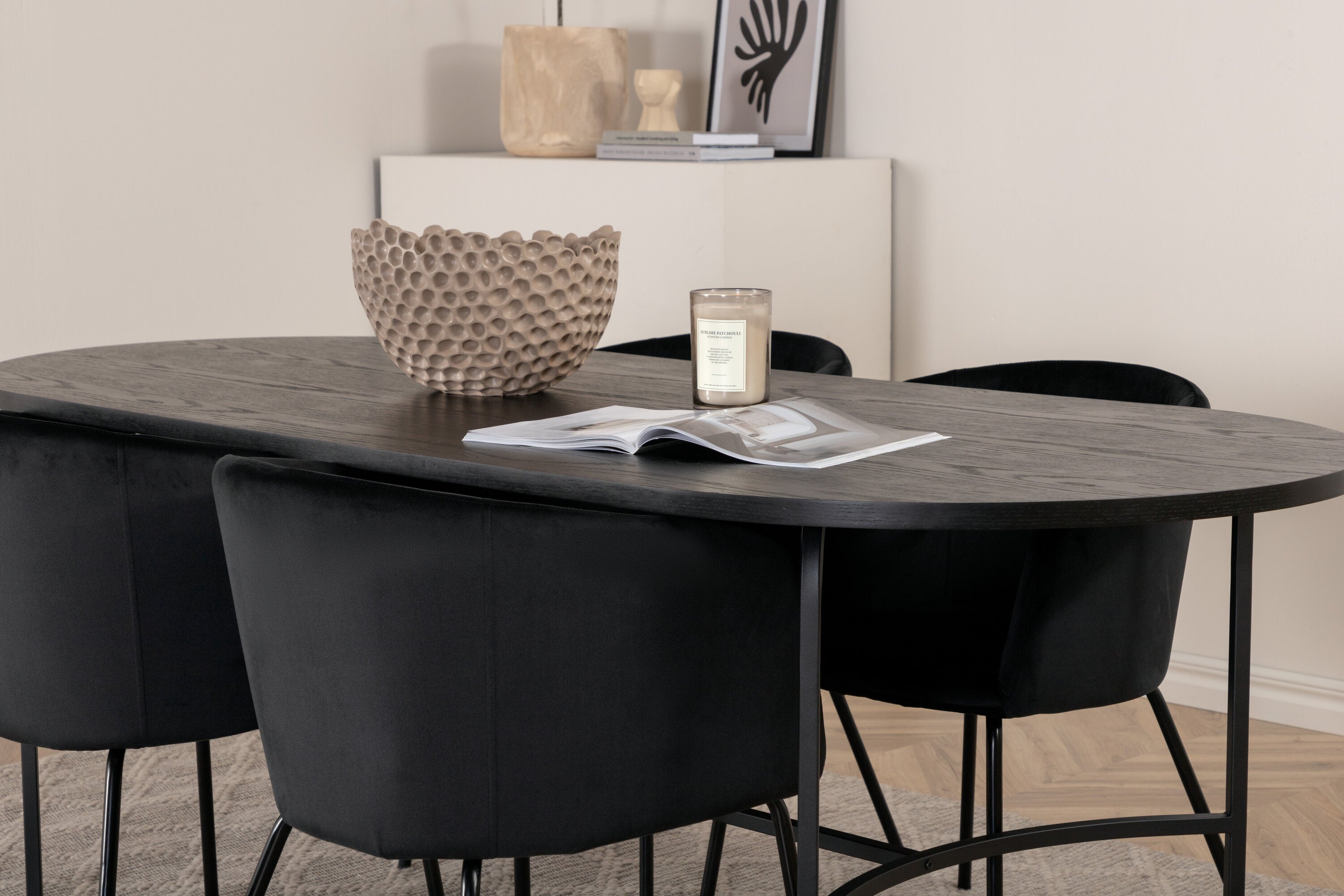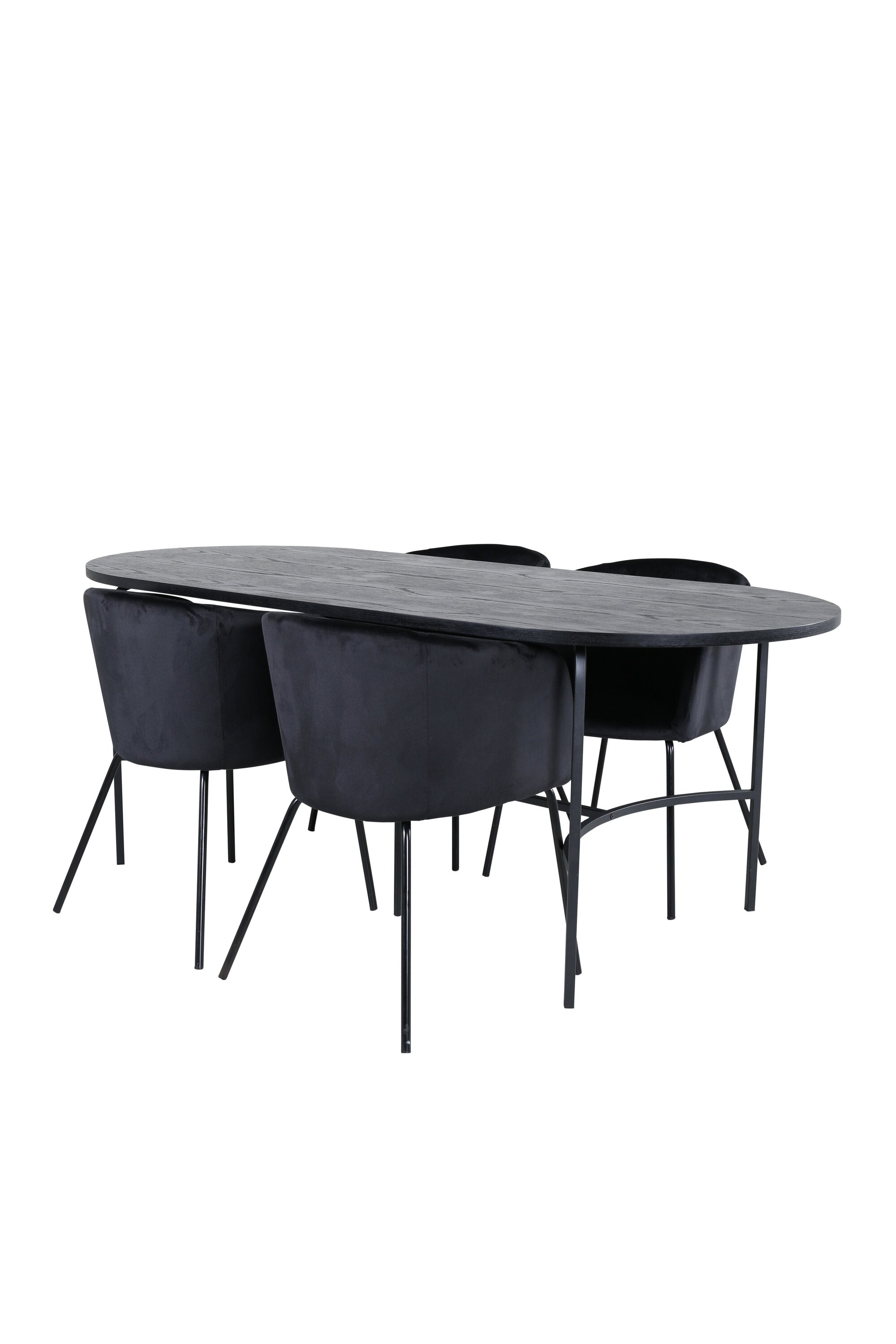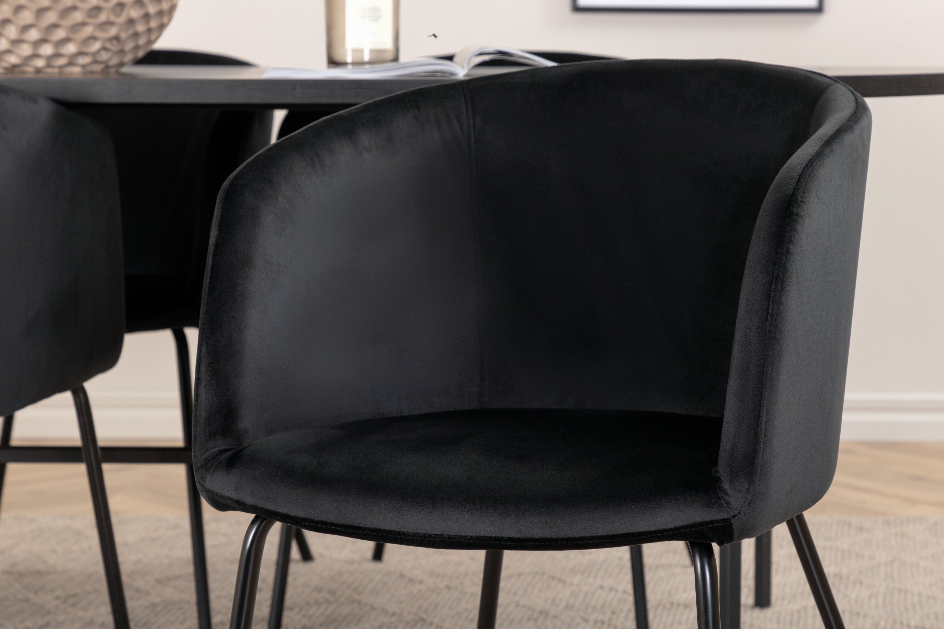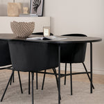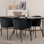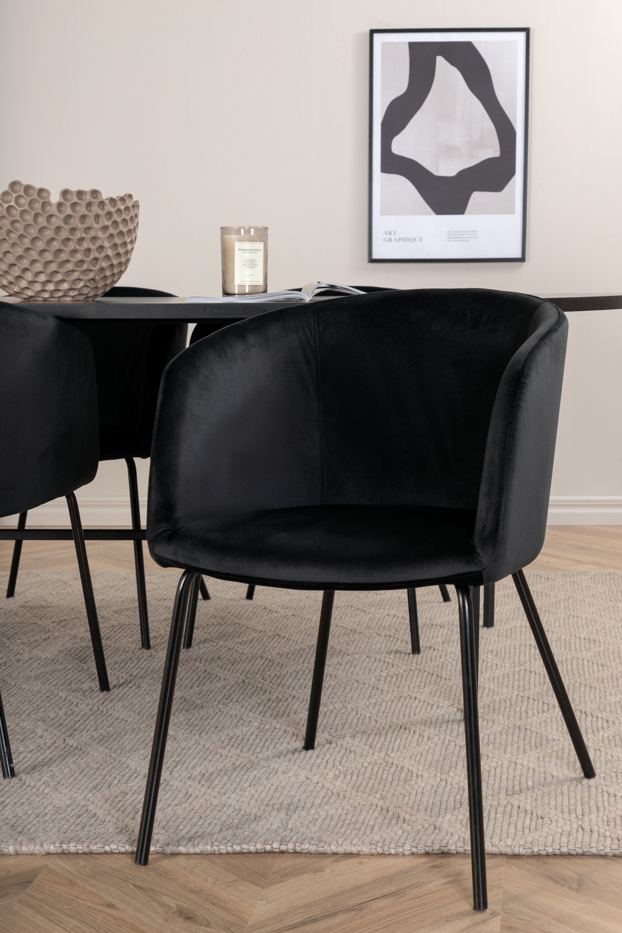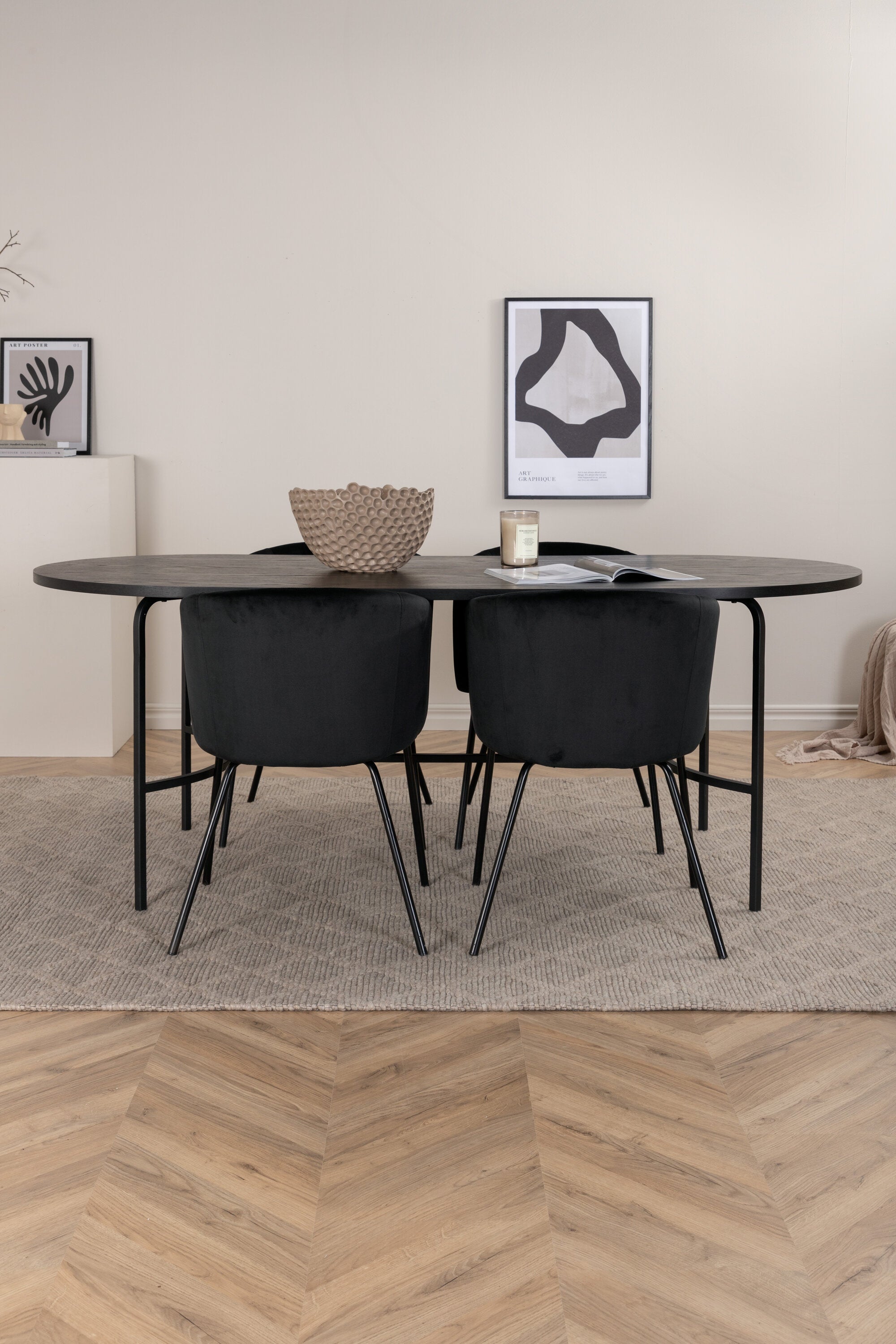 Pompézní a elegantní - skupina potravin zaměřující se na pohodlí a minimalismus! Naše oblíbené jídelní židle Berit jsou oblíbené v mnoha domácnostech. Mají příjemný design a nadčasovou černou barvu, která je neuvěřitelně přitažlivá. Sedák je ze sametové látky a nohy židle jsou stylově úzké z černého železa. Rozměry židle: výška: 78 cm, výška sedáku: 49 cm, šířka: 55 cm, hloubka: 55 cm. Zde jsou 4 jídelní židle sladěny s naším oválným jídelním stolem skate. Celkový design stolu je velmi promyšlený s tenkou horní deskou v černé MDF s dýhou a černými nohami stolu v kovu. Rozměry stolu: Délka: 200 cm, Šířka: 90 cm, Výška: 75 cm.