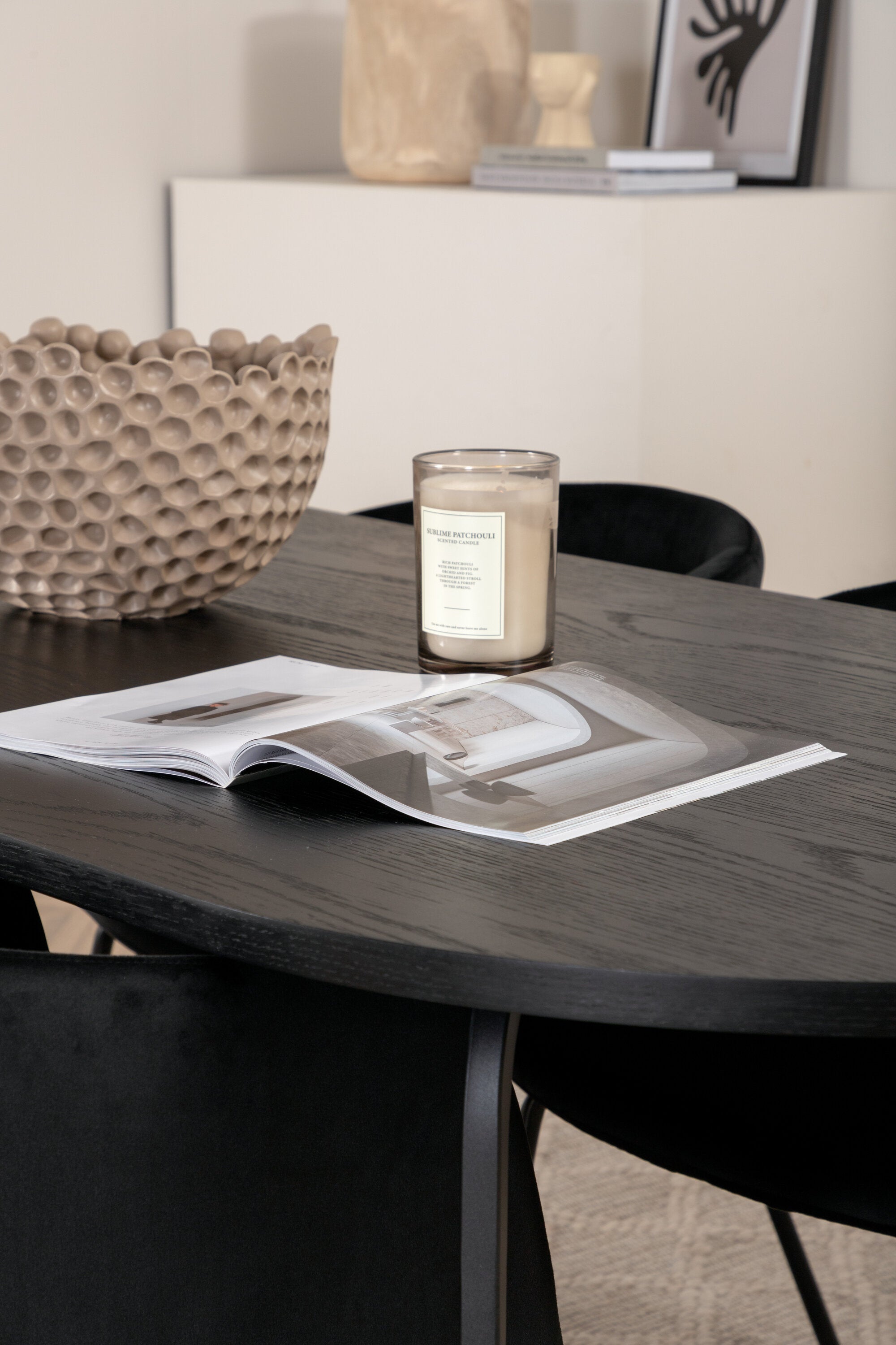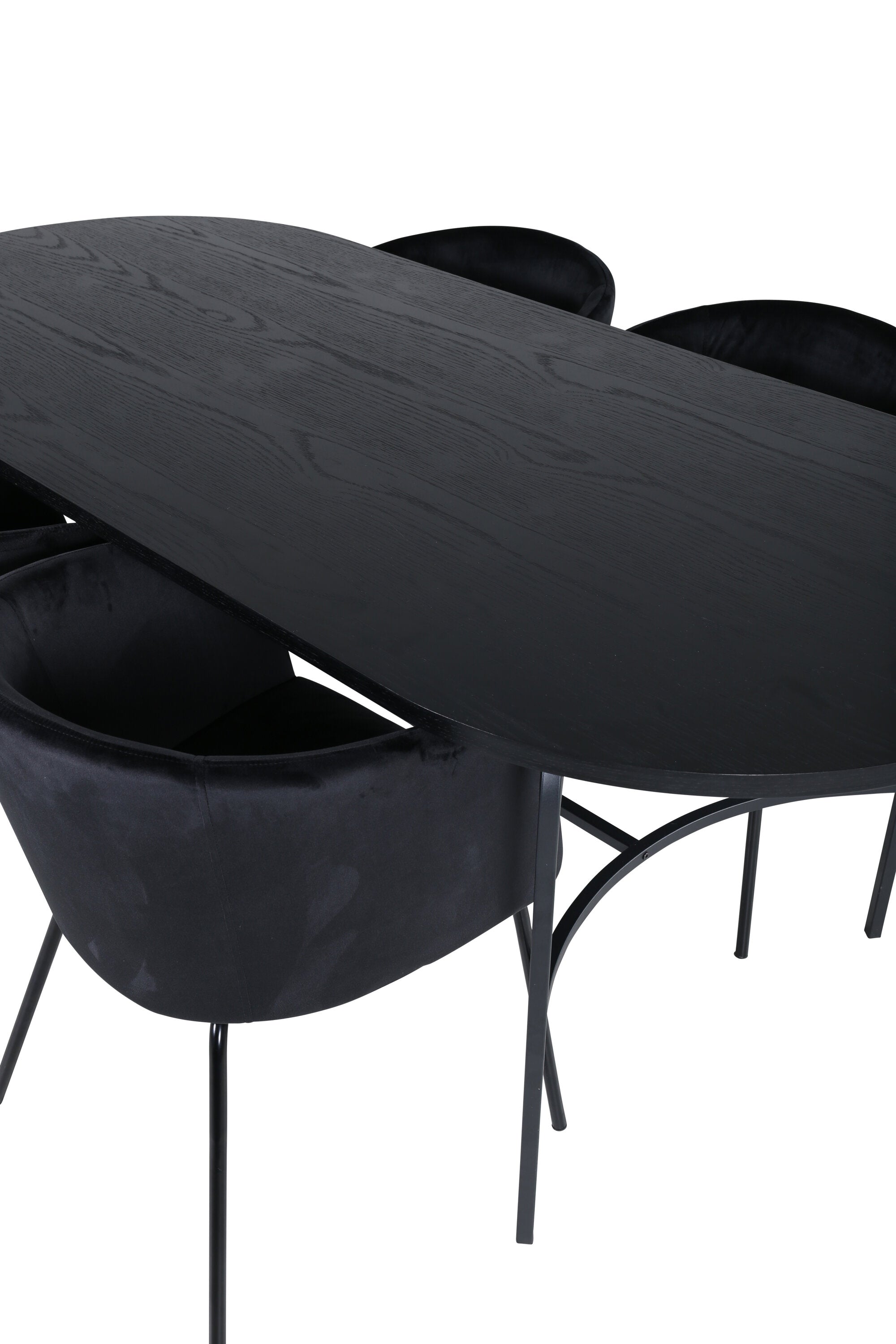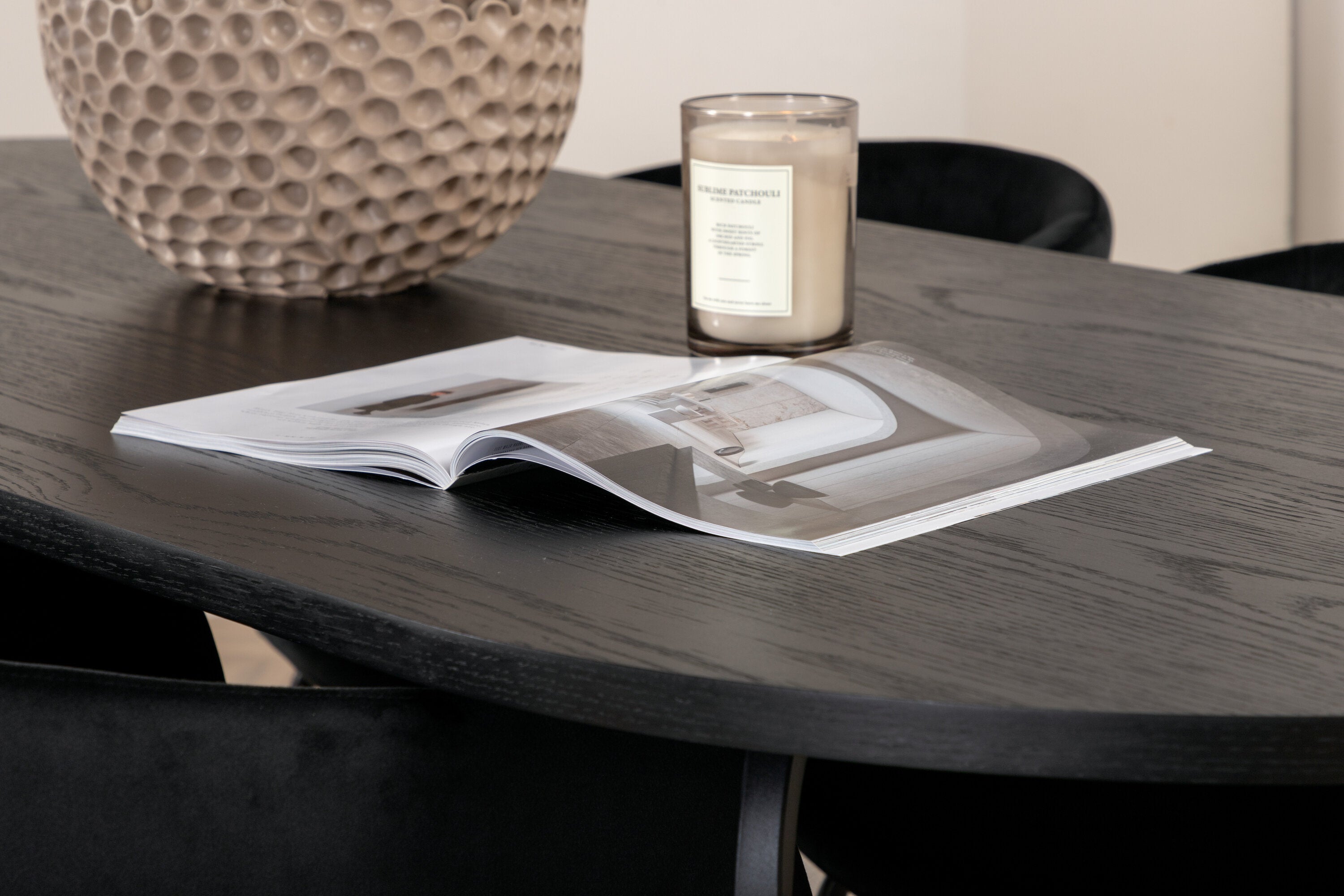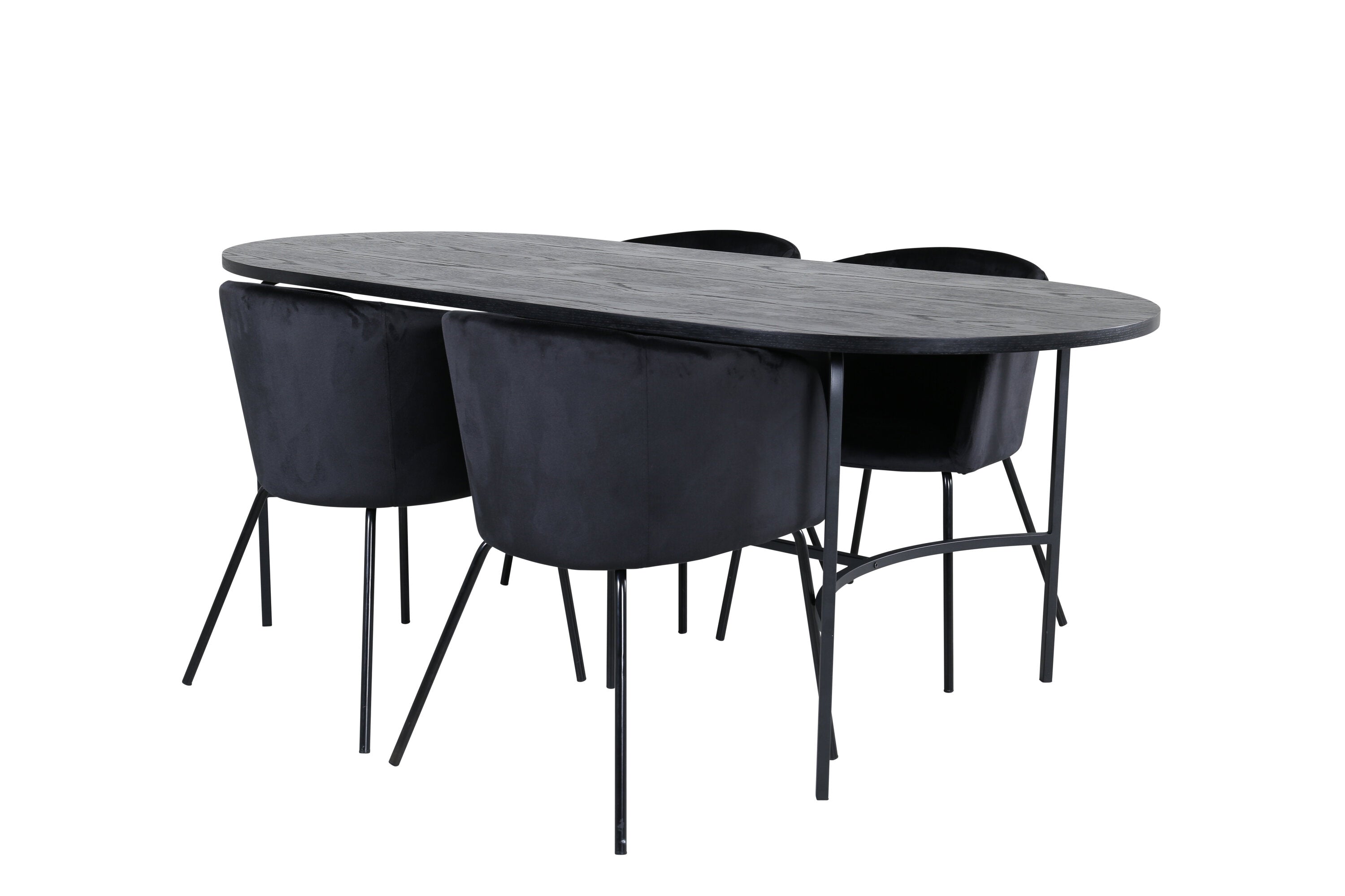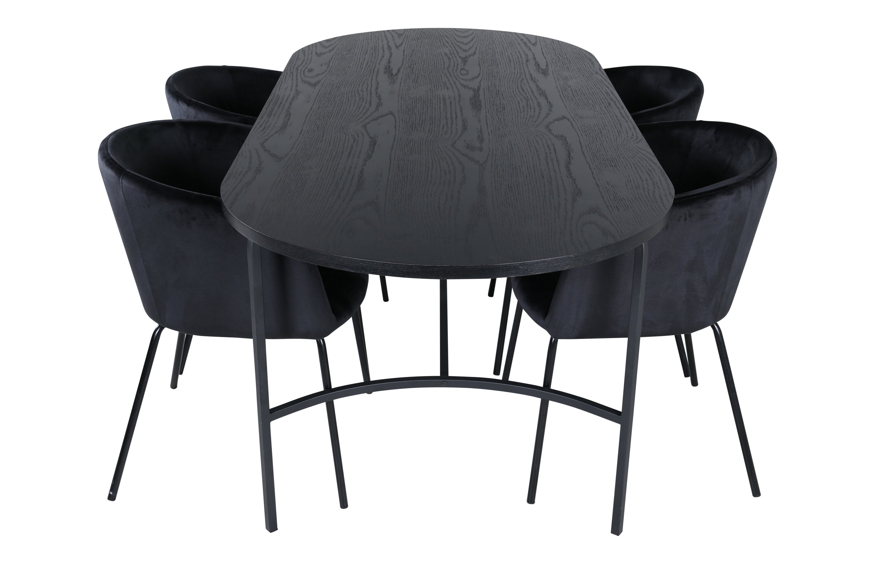 Pompézní a elegantní - skupina potravin zaměřující se na pohodlí a minimalismus! Naše oblíbené jídelní židle Berit jsou oblíbené v mnoha domácnostech. Mají příjemný design a nadčasovou černou barvu, která je neuvěřitelně přitažlivá. Sedák je ze sametové látky a nohy židle jsou stylově úzké z černého železa. Rozměry židle: výška: 78 cm, výška sedáku: 49 cm, šířka: 55 cm, hloubka: 55 cm. Zde jsou 4 jídelní židle sladěny s naším oválným jídelním stolem skate. Celkový design stolu je velmi promyšlený s tenkou horní deskou v černé MDF s dýhou a černými nohami stolu v kovu. Rozměry stolu: Délka: 200 cm, Šířka: 90 cm, Výška: 75 cm.