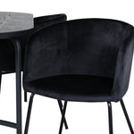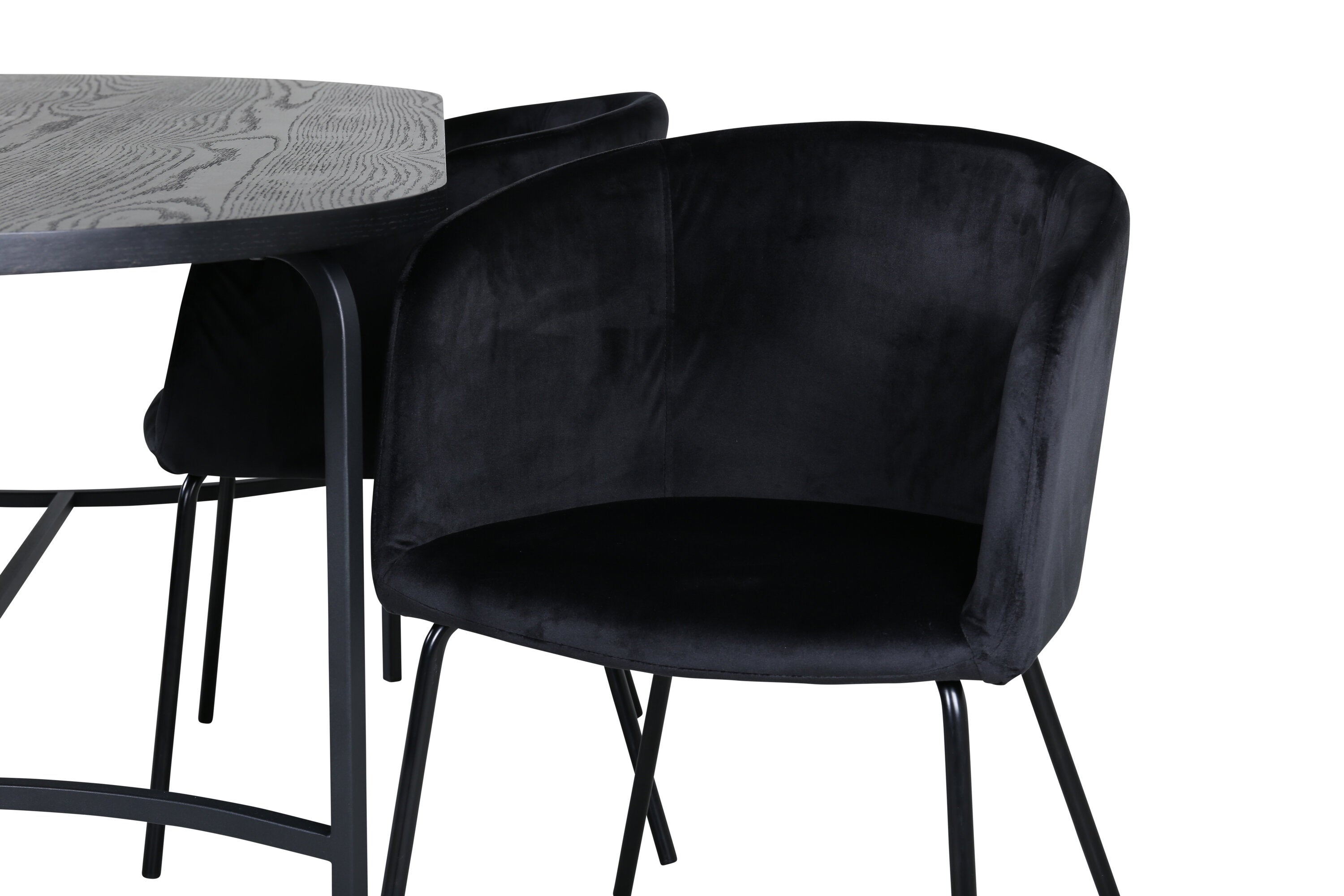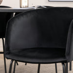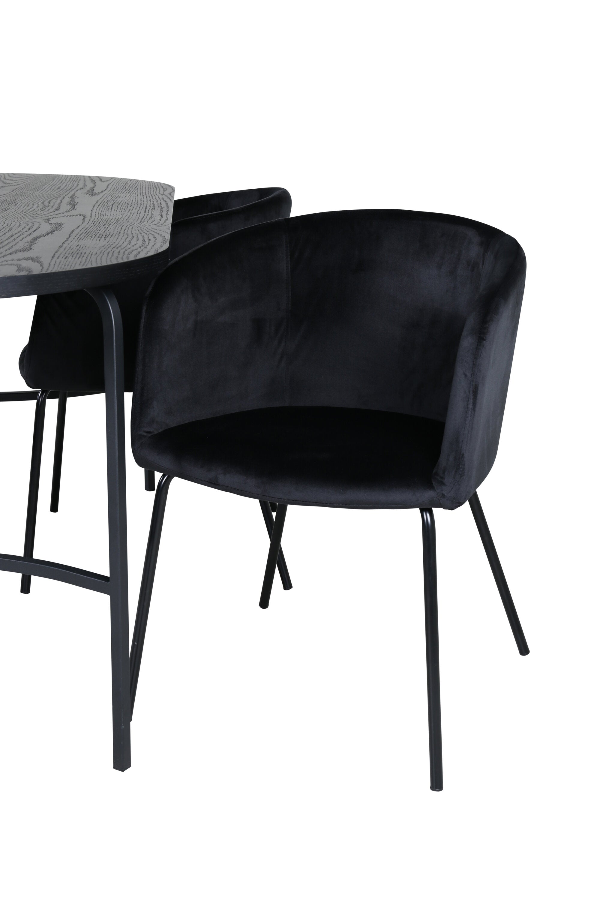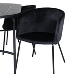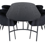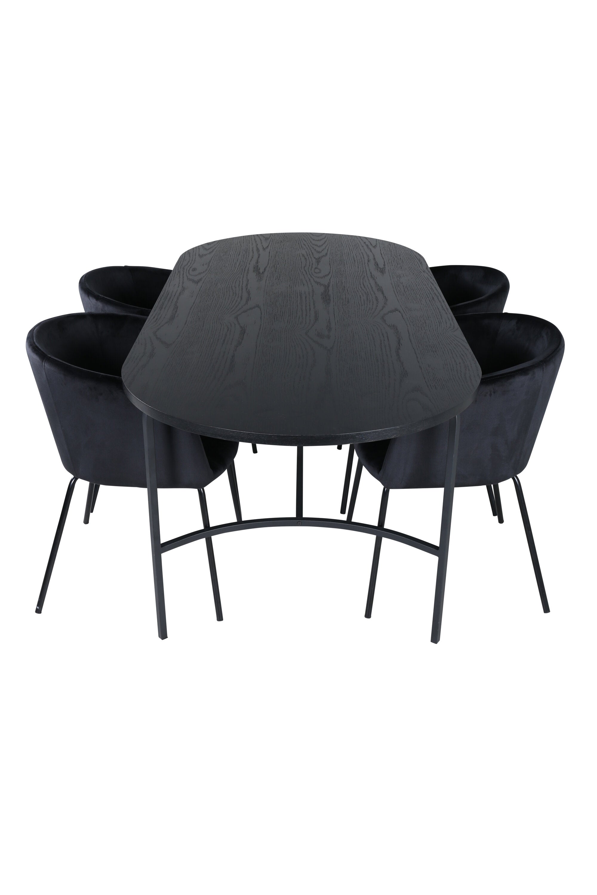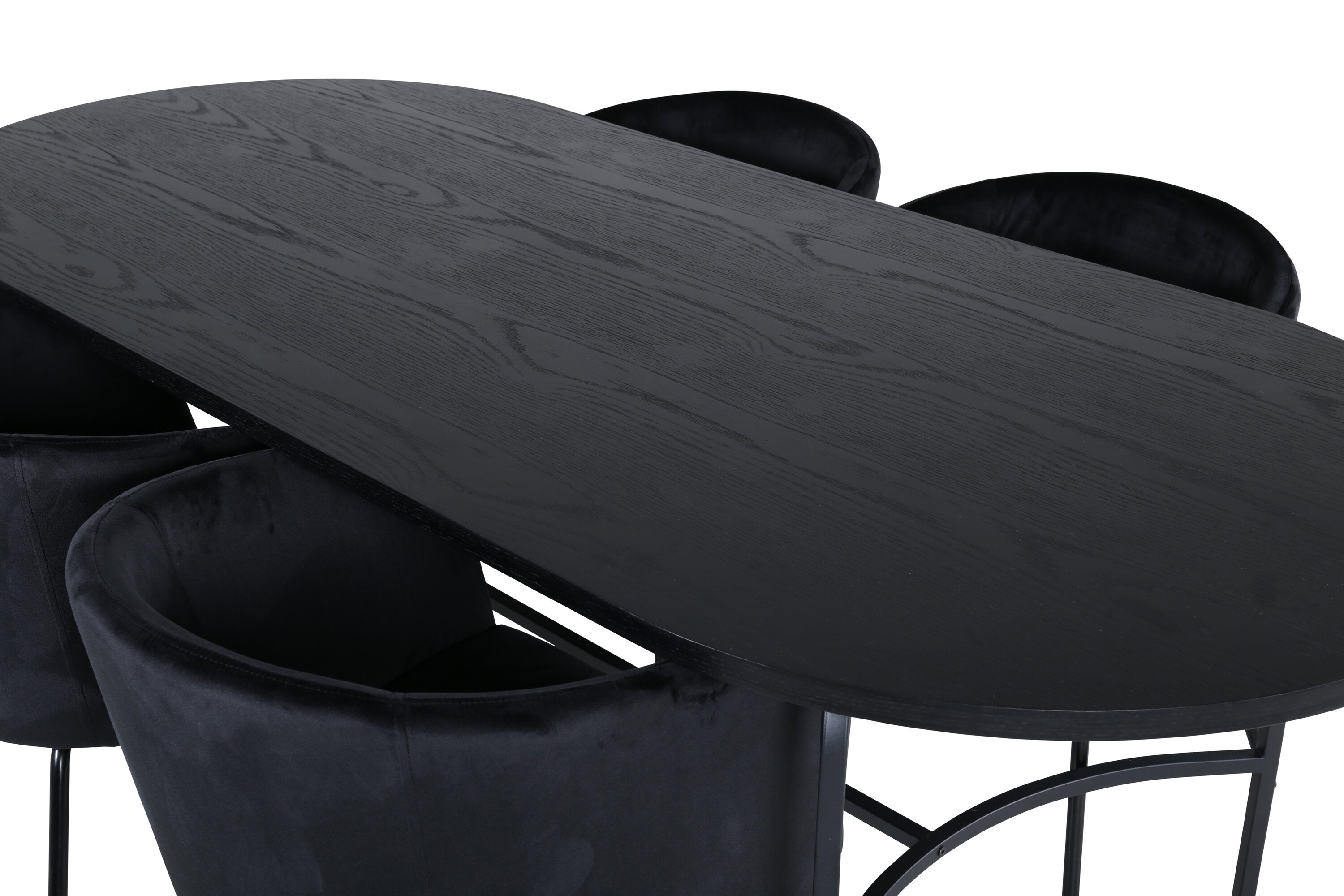 Pompézní a elegantní - skupina potravin zaměřující se na pohodlí a minimalismus! Naše oblíbené jídelní židle Berit jsou oblíbené v mnoha domácnostech. Mají příjemný design a nadčasovou černou barvu, která je neuvěřitelně přitažlivá. Sedák je ze sametové látky a nohy židle jsou stylově úzké z černého železa. Rozměry židle: výška: 78 cm, výška sedáku: 49 cm, šířka: 55 cm, hloubka: 55 cm. Zde jsou 4 jídelní židle sladěny s naším oválným jídelním stolem skate. Celkový design stolu je velmi promyšlený s tenkou horní deskou v černé MDF s dýhou a černými nohami stolu v kovu. Rozměry stolu: Délka: 200 cm, Šířka: 90 cm, Výška: 75 cm.