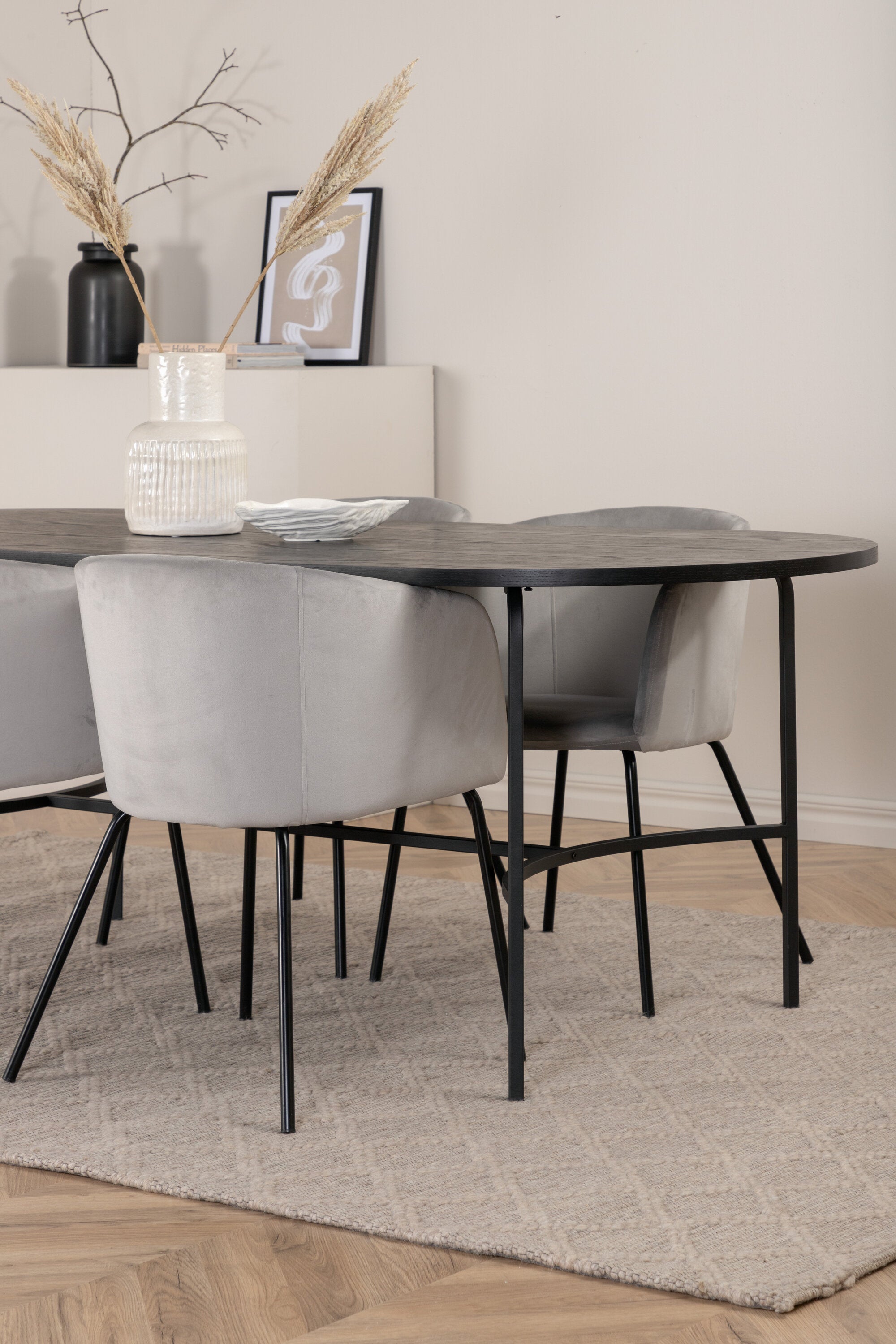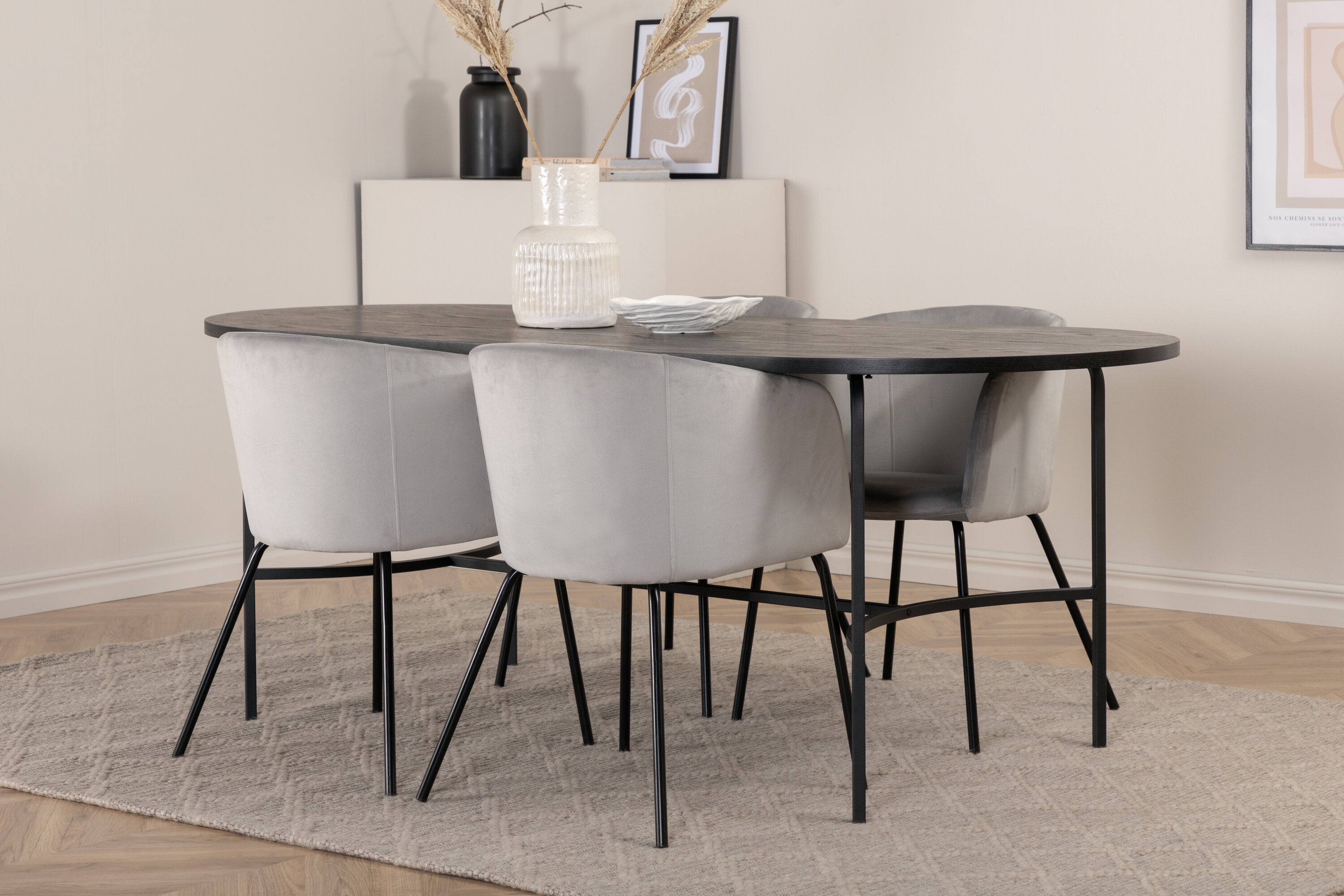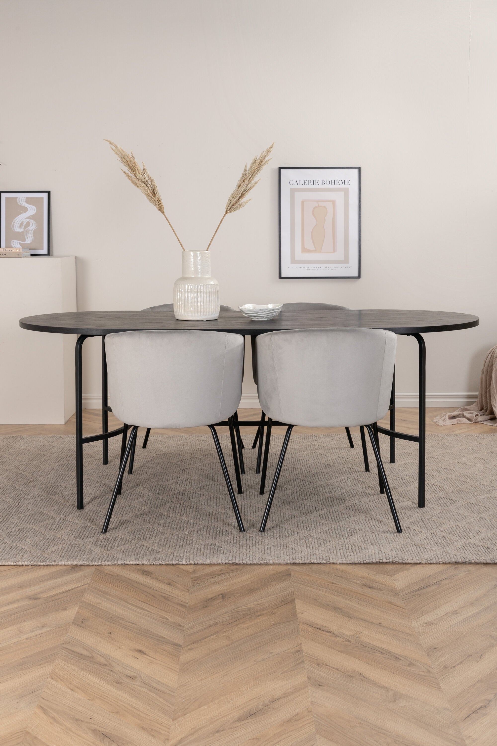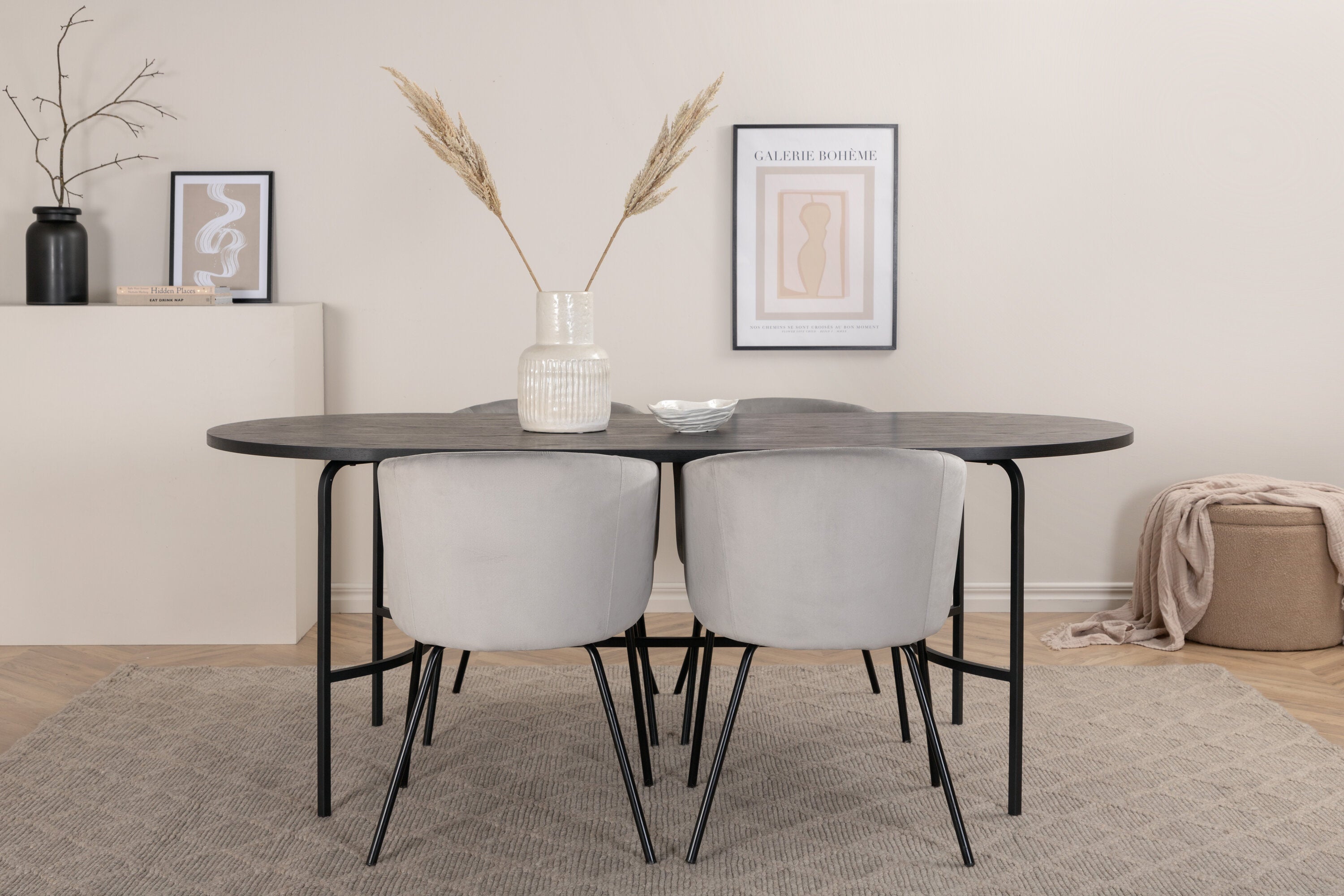Pompézní a elegantní - skupina potravin zaměřující se na pohodlí a minimalismus! Naše oblíbené jídelní židle Berit jsou oblíbené v mnoha domácnostech. Mají příjemný design a příjemnou šedou barvu, která neuvěřitelně osloví. Sedák je ze sametové látky a nohy židle jsou stylově úzké z černého železa. Rozměry židle: výška: 78 cm, výška sedáku: 49 cm, šířka: 55 cm, hloubka: 55 cm. Zde jsou 4 jídelní židle sladěny s naším oválným jídelním stolem skate. Celkový design stolu je velmi promyšlený s tenkou horní deskou v černé MDF s dýhou a černými nohami stolu v kovu. Rozměry stolu: Délka: 200 cm, Šířka: 90 cm, Výška: 75 cm.
