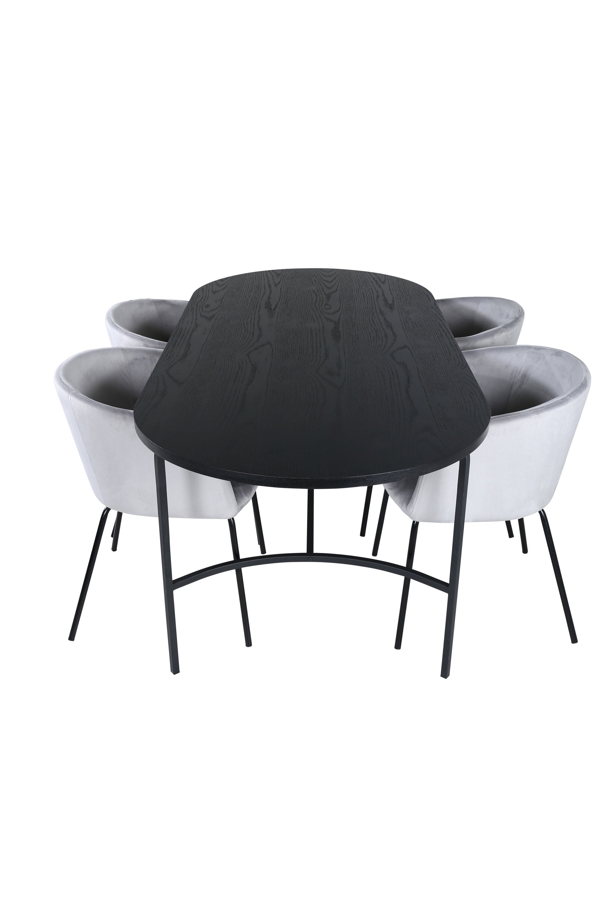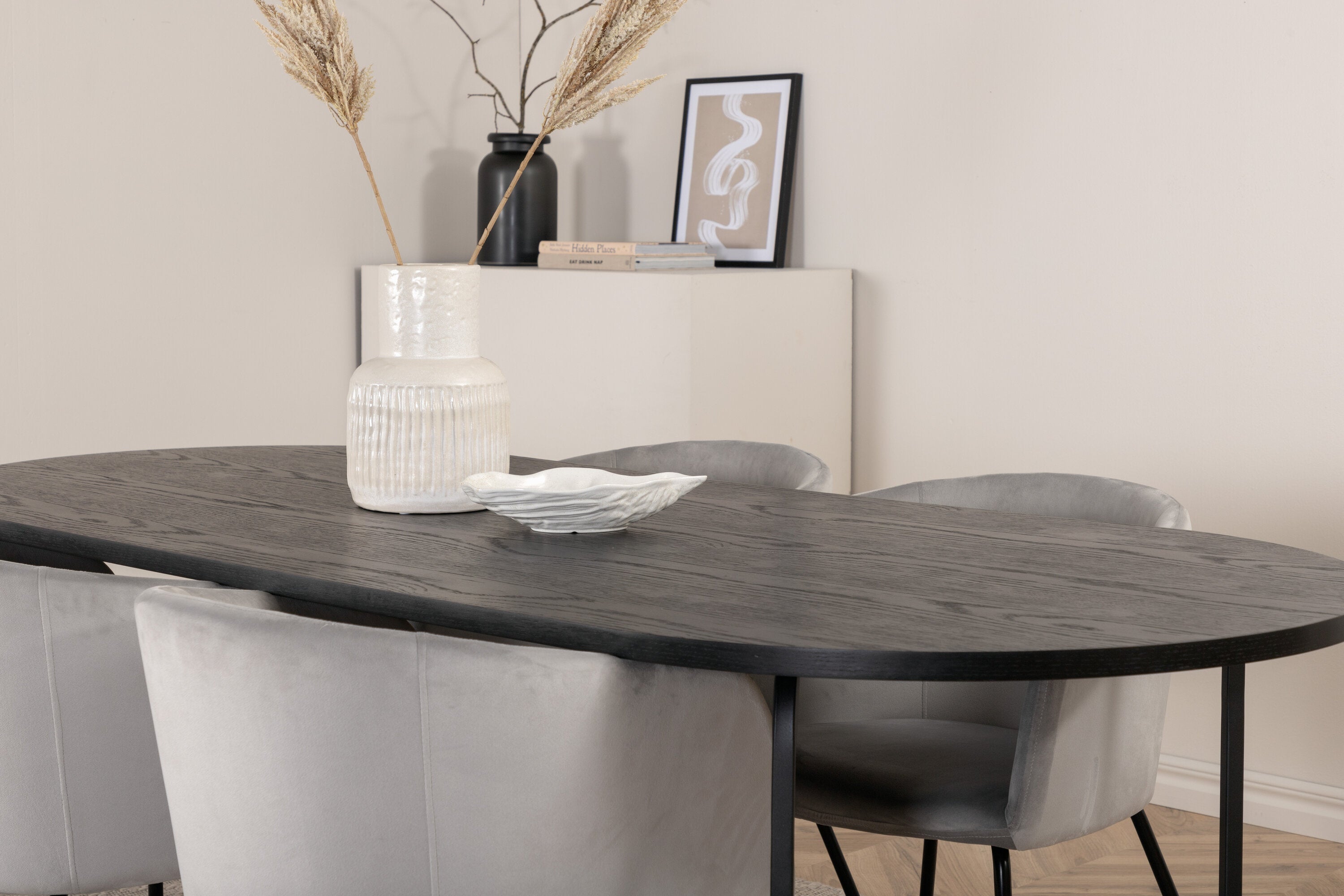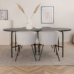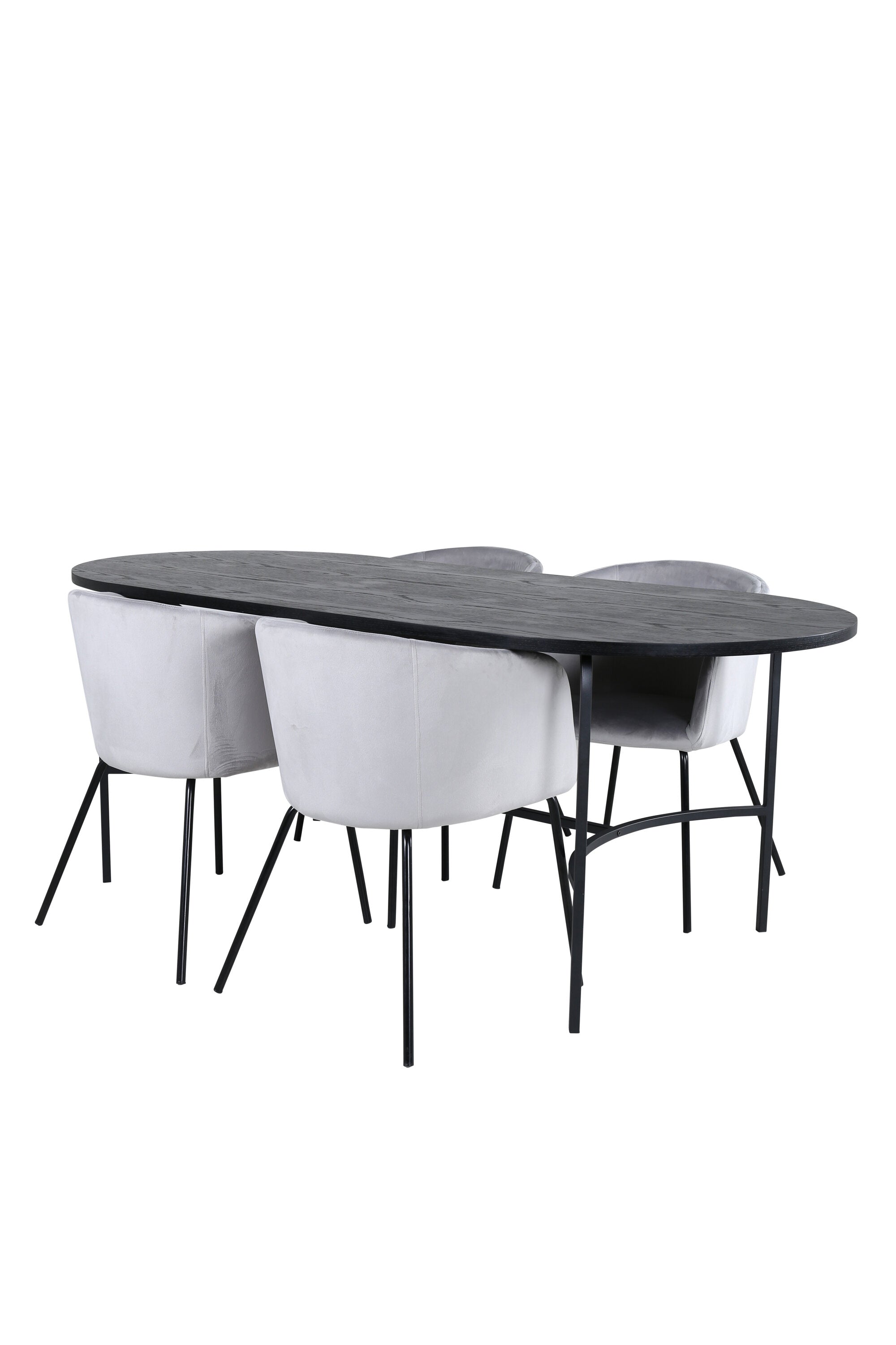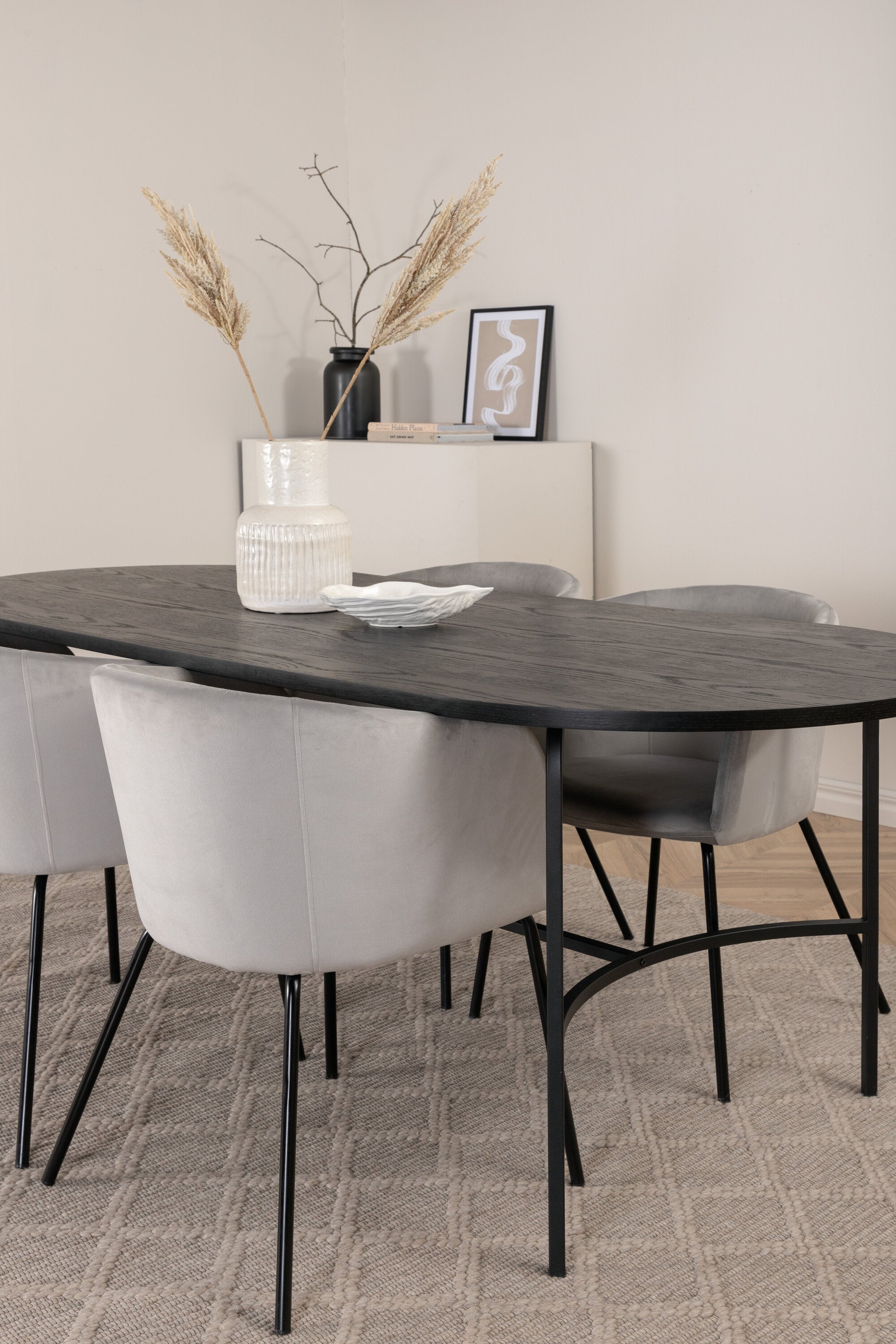 Pompézní a elegantní - skupina potravin zaměřující se na pohodlí a minimalismus! Naše oblíbené jídelní židle Berit jsou oblíbené v mnoha domácnostech. Mají příjemný design a příjemnou šedou barvu, která neuvěřitelně osloví. Sedák je ze sametové látky a nohy židle jsou stylově úzké z černého železa. Rozměry židle: výška: 78 cm, výška sedáku: 49 cm, šířka: 55 cm, hloubka: 55 cm. Zde jsou 4 jídelní židle sladěny s naším oválným jídelním stolem skate. Celkový design stolu je velmi promyšlený s tenkou horní deskou v černé MDF s dýhou a černými nohami stolu v kovu. Rozměry stolu: Délka: 200 cm, Šířka: 90 cm, Výška: 75 cm.