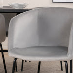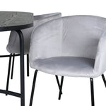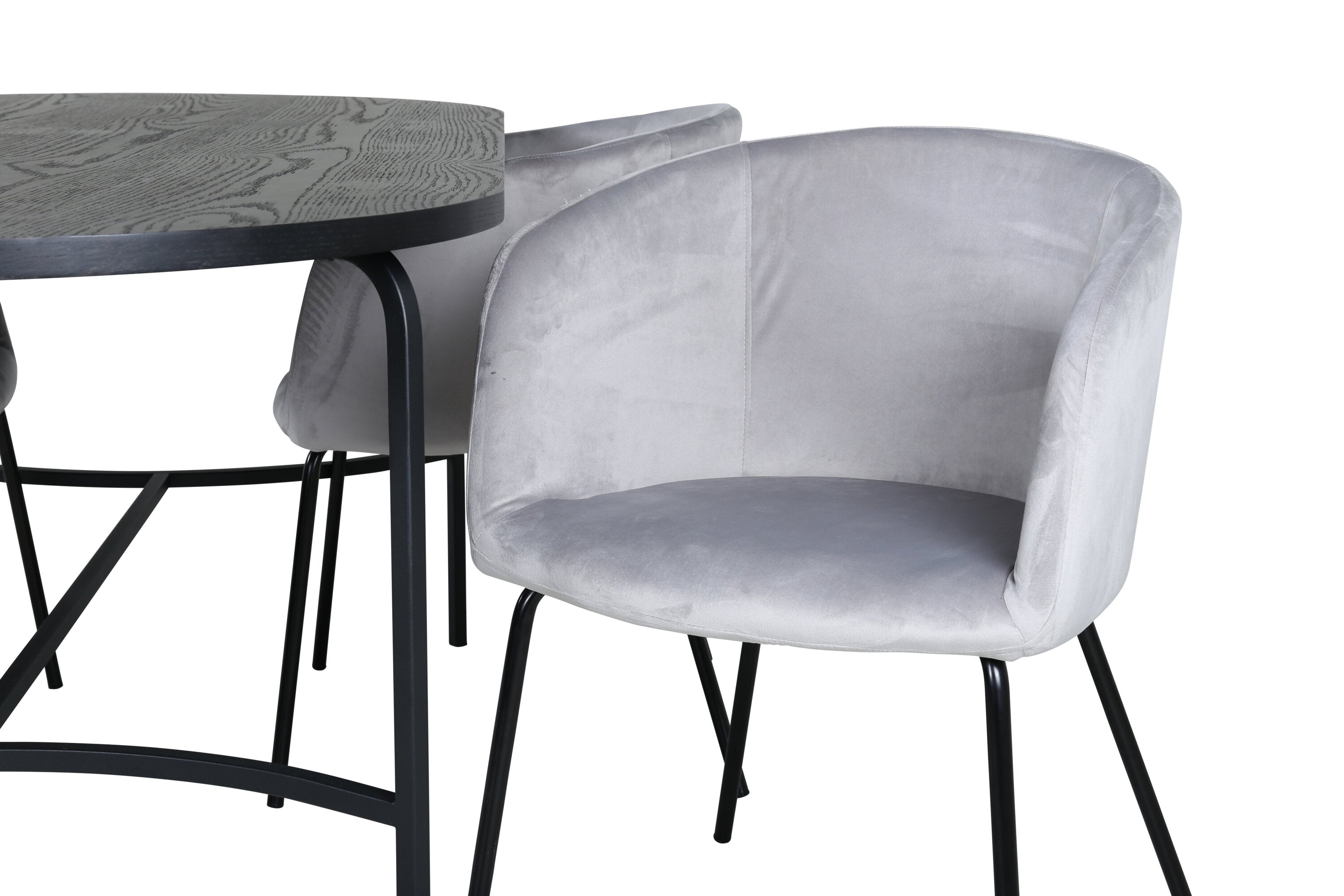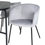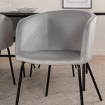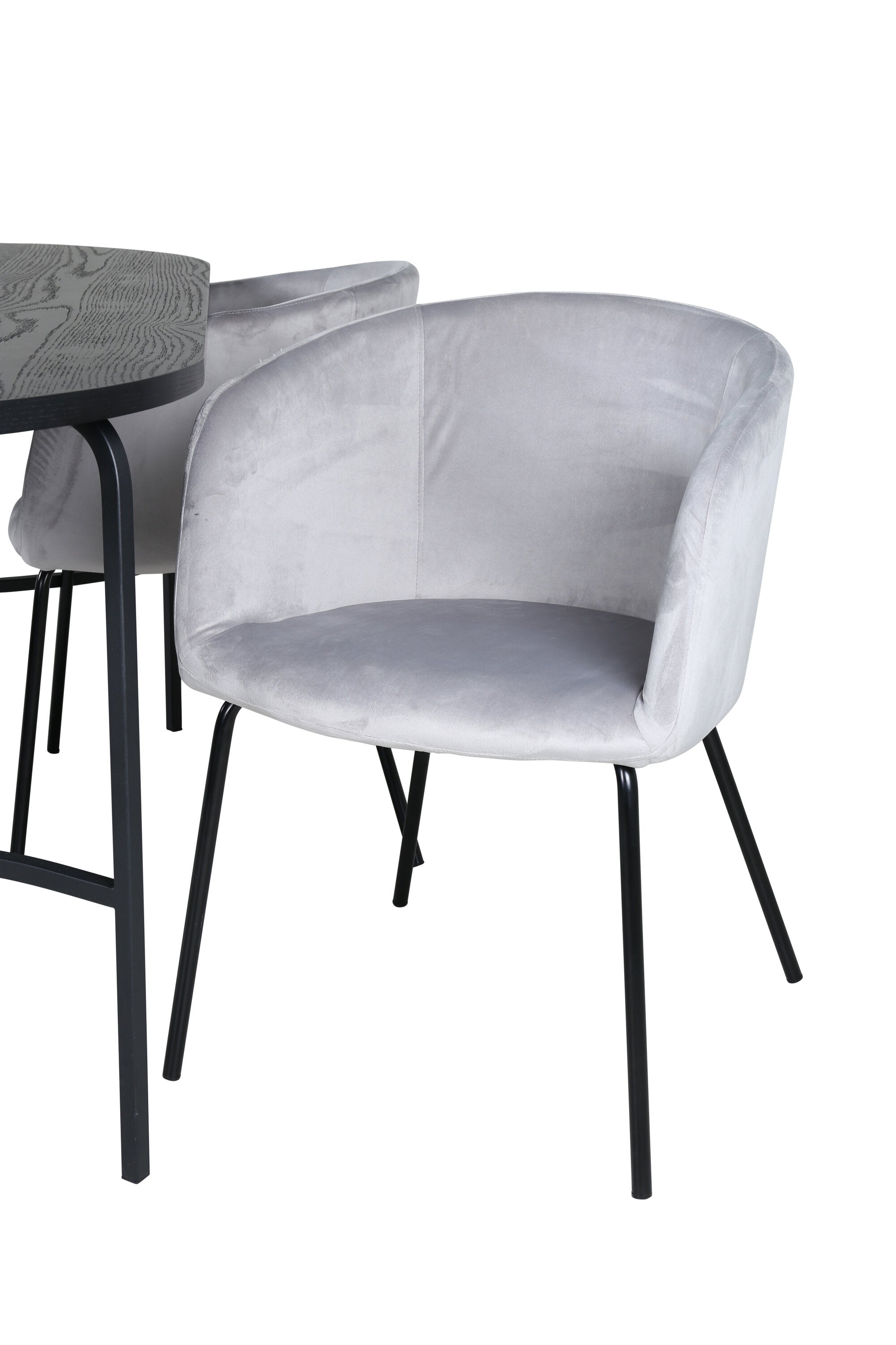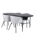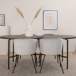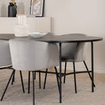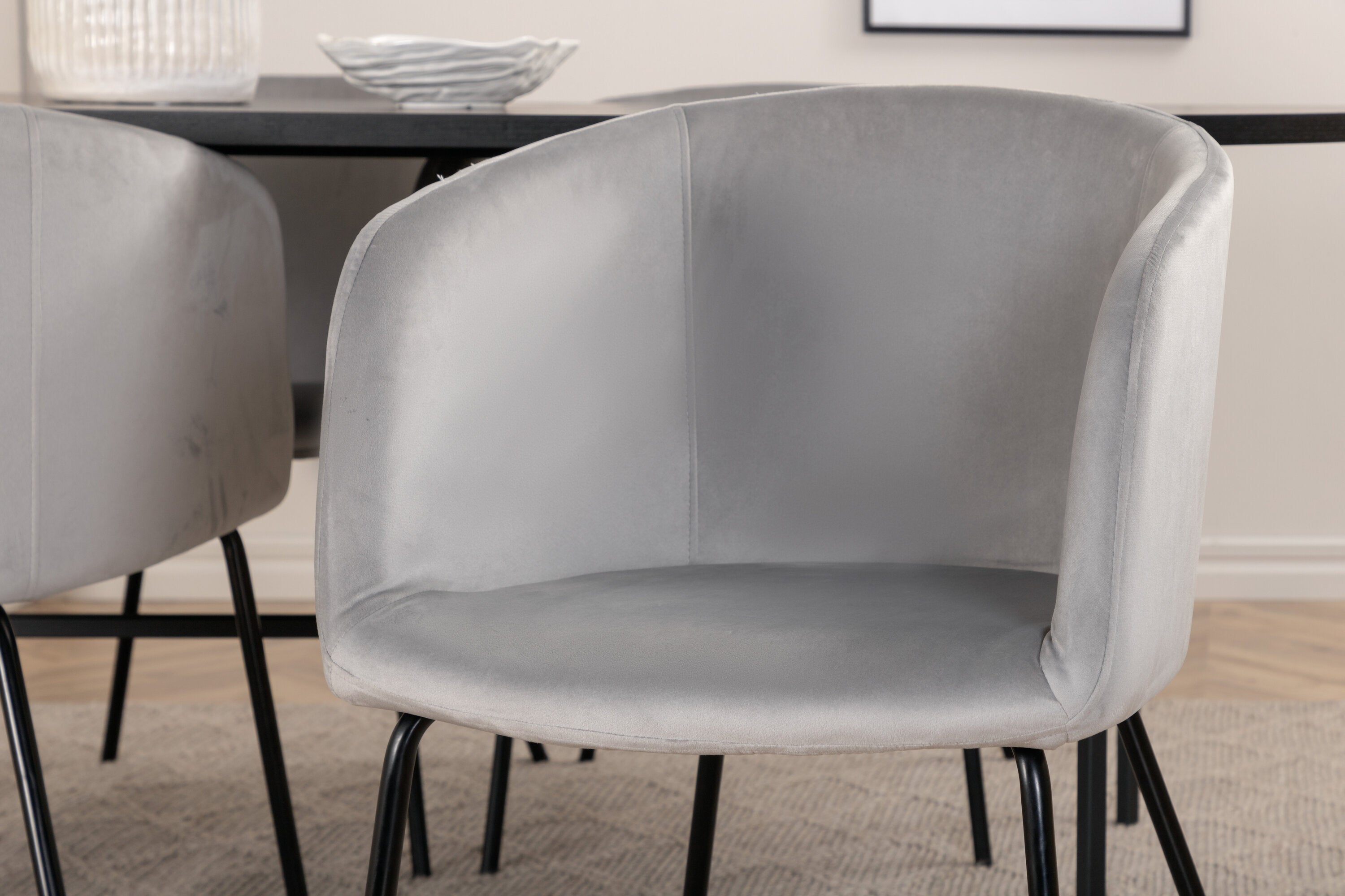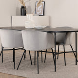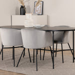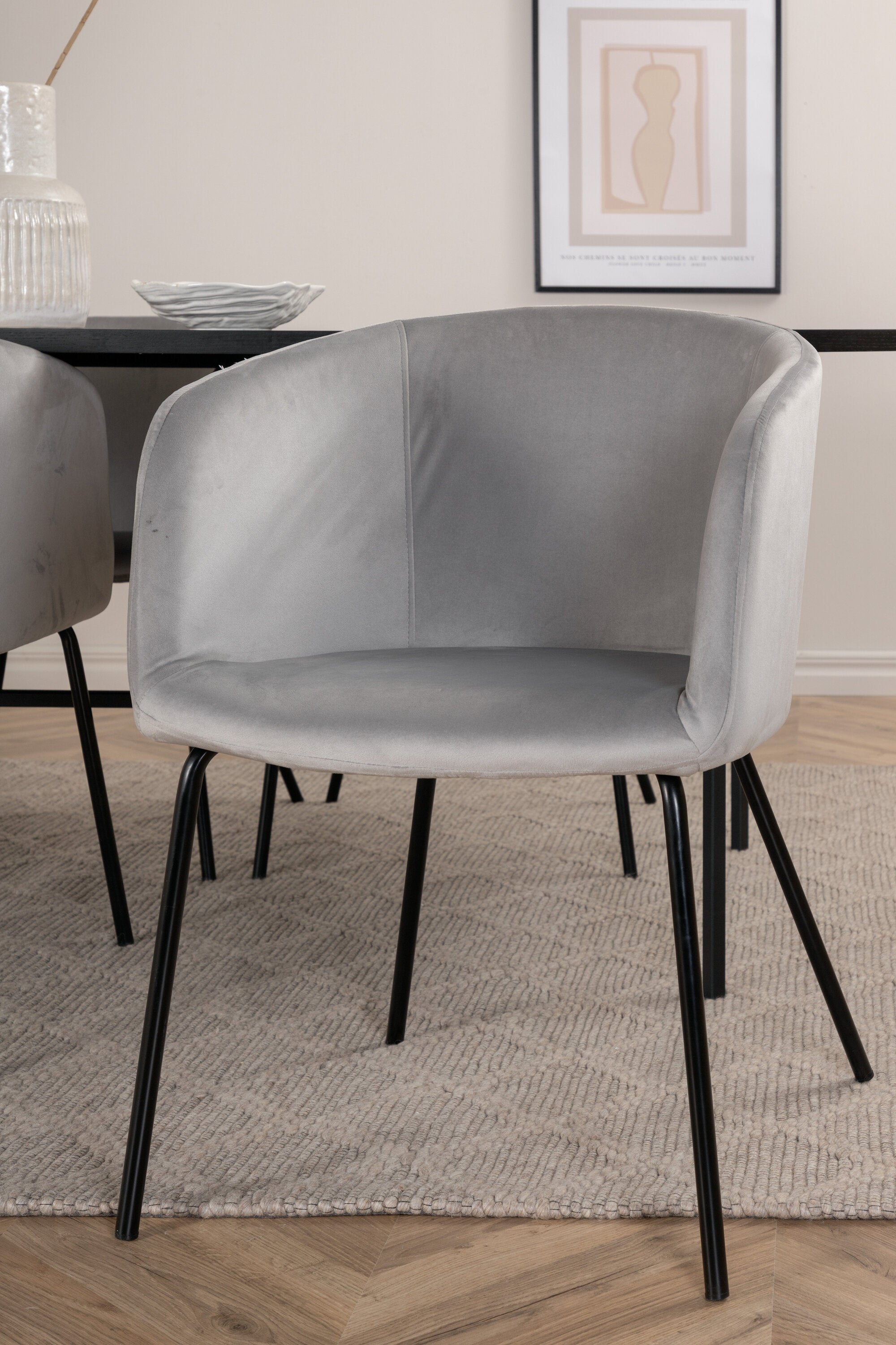 Pompézní a elegantní - skupina potravin zaměřující se na pohodlí a minimalismus! Naše oblíbené jídelní židle Berit jsou oblíbené v mnoha domácnostech. Mají příjemný design a příjemnou šedou barvu, která neuvěřitelně osloví. Sedák je ze sametové látky a nohy židle jsou stylově úzké z černého železa. Rozměry židle: výška: 78 cm, výška sedáku: 49 cm, šířka: 55 cm, hloubka: 55 cm. Zde jsou 4 jídelní židle sladěny s naším oválným jídelním stolem skate. Celkový design stolu je velmi promyšlený s tenkou horní deskou v černé MDF s dýhou a černými nohami stolu v kovu. Rozměry stolu: Délka: 200 cm, Šířka: 90 cm, Výška: 75 cm.