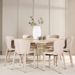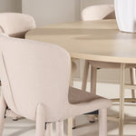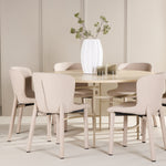 Jídelní židle Astoria je čalouněna elegantním béžovým buclé, která dodává luxusní pocit díky své měkké struktuře a jemné struktuře. Neutrální odstín usnadňuje integraci židle do různých stylů interiéru, od moderního minimalismu až po klasickou eleganci. Se svým ergonomickým opěradlem a velkorysým polstrováním na sedadle a opěradle poskytuje Astoria vynikající pohodlí, takže je ideální pro dlouhé večeře a společenské chvíle s rodinou a přáteli.