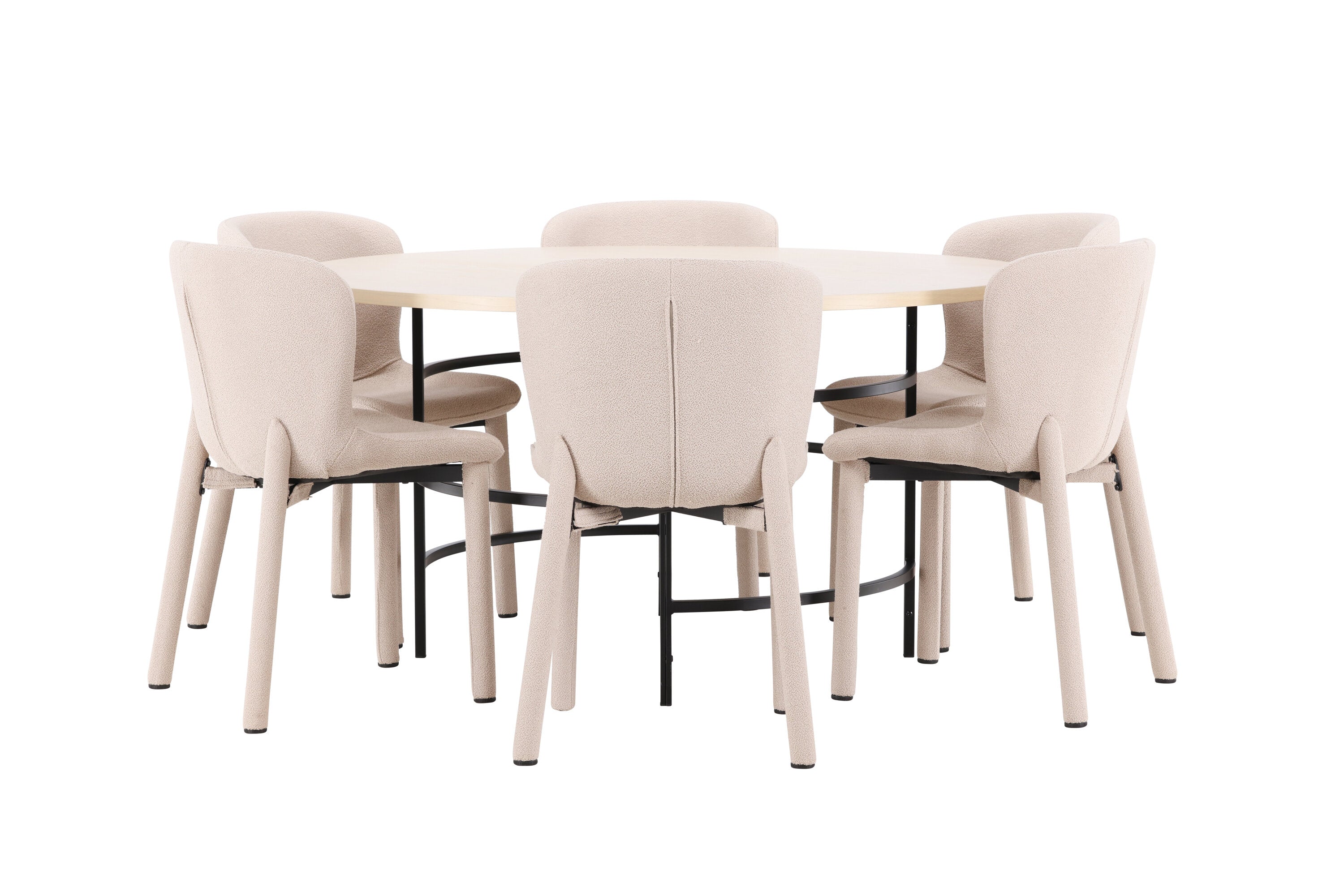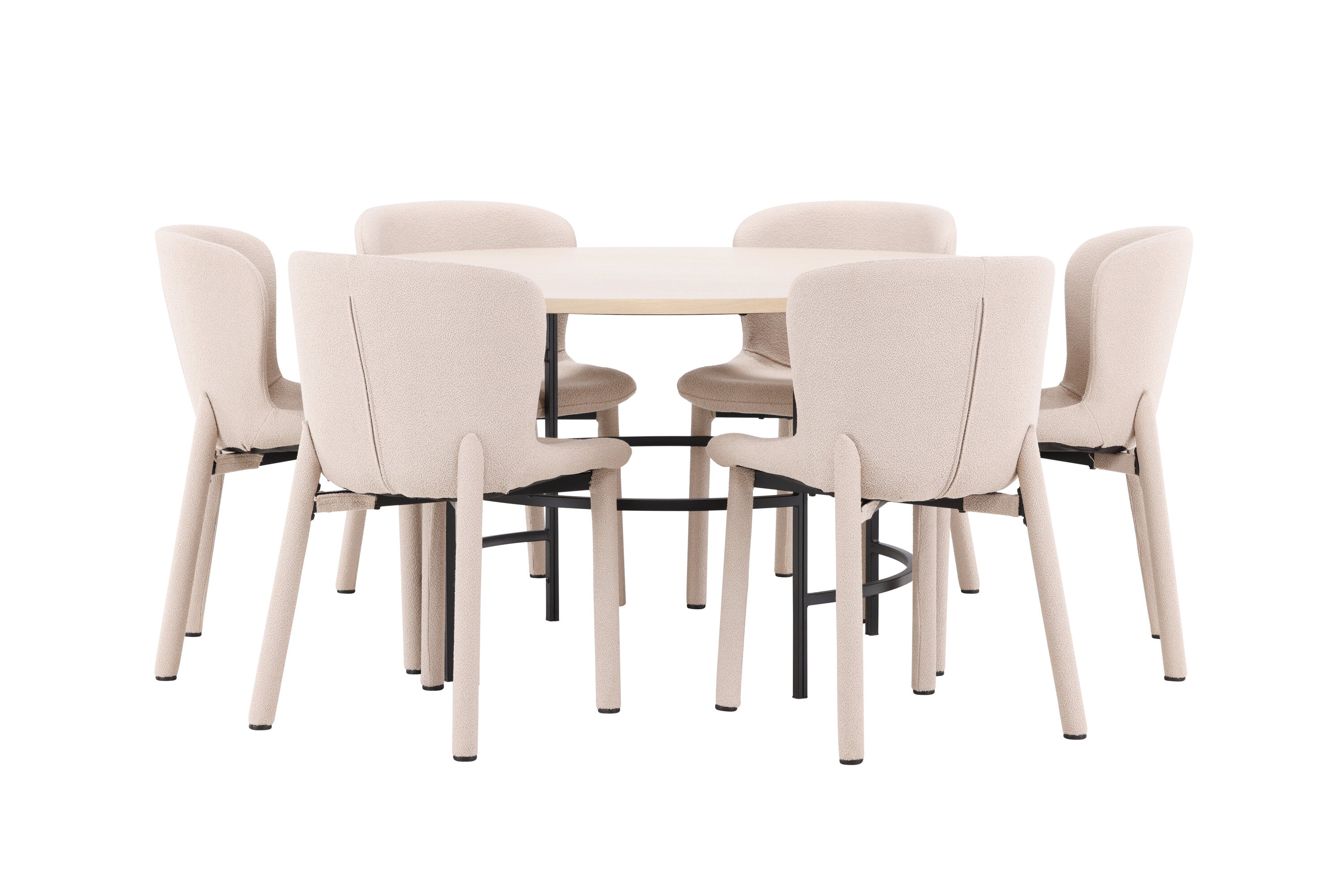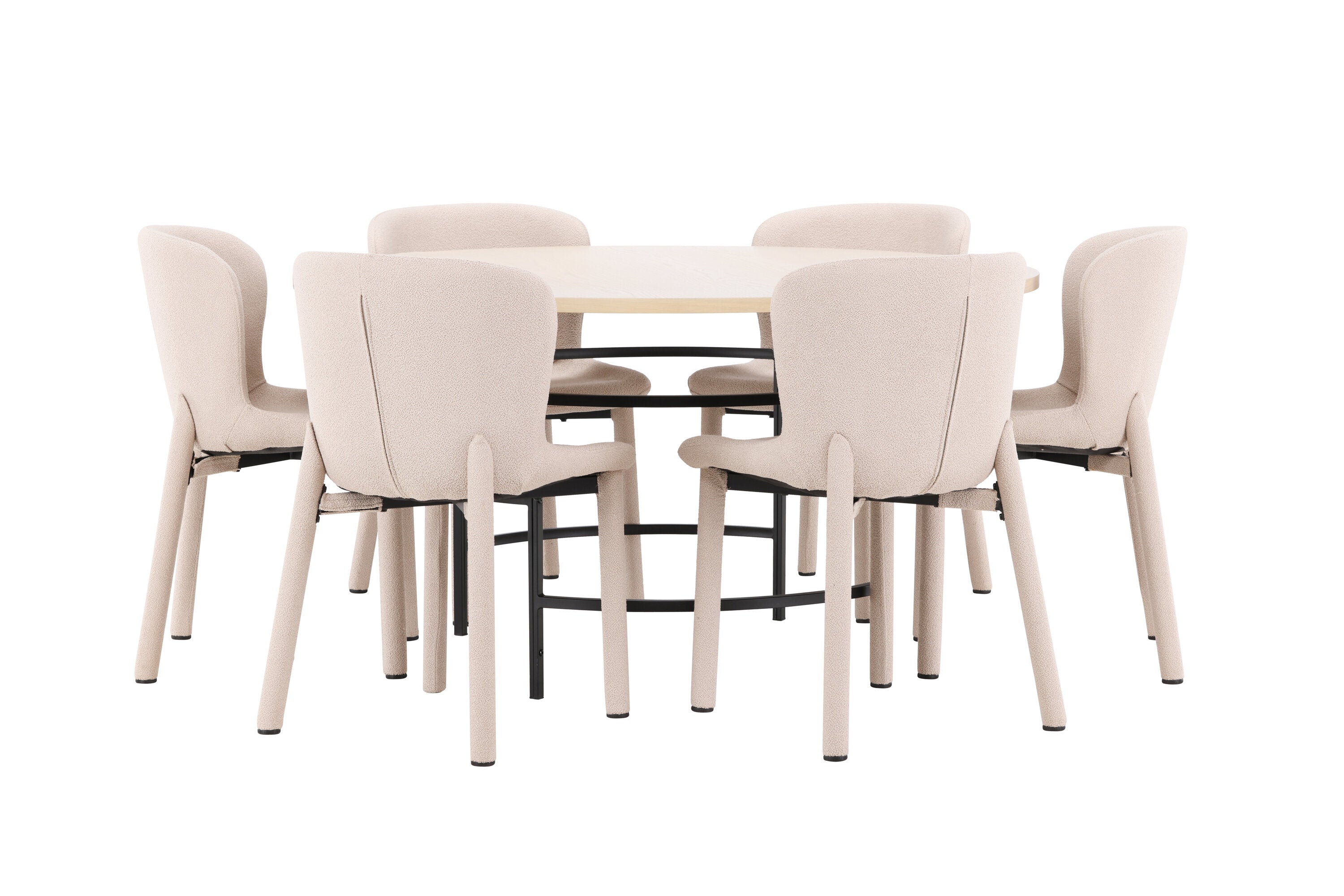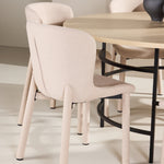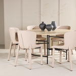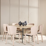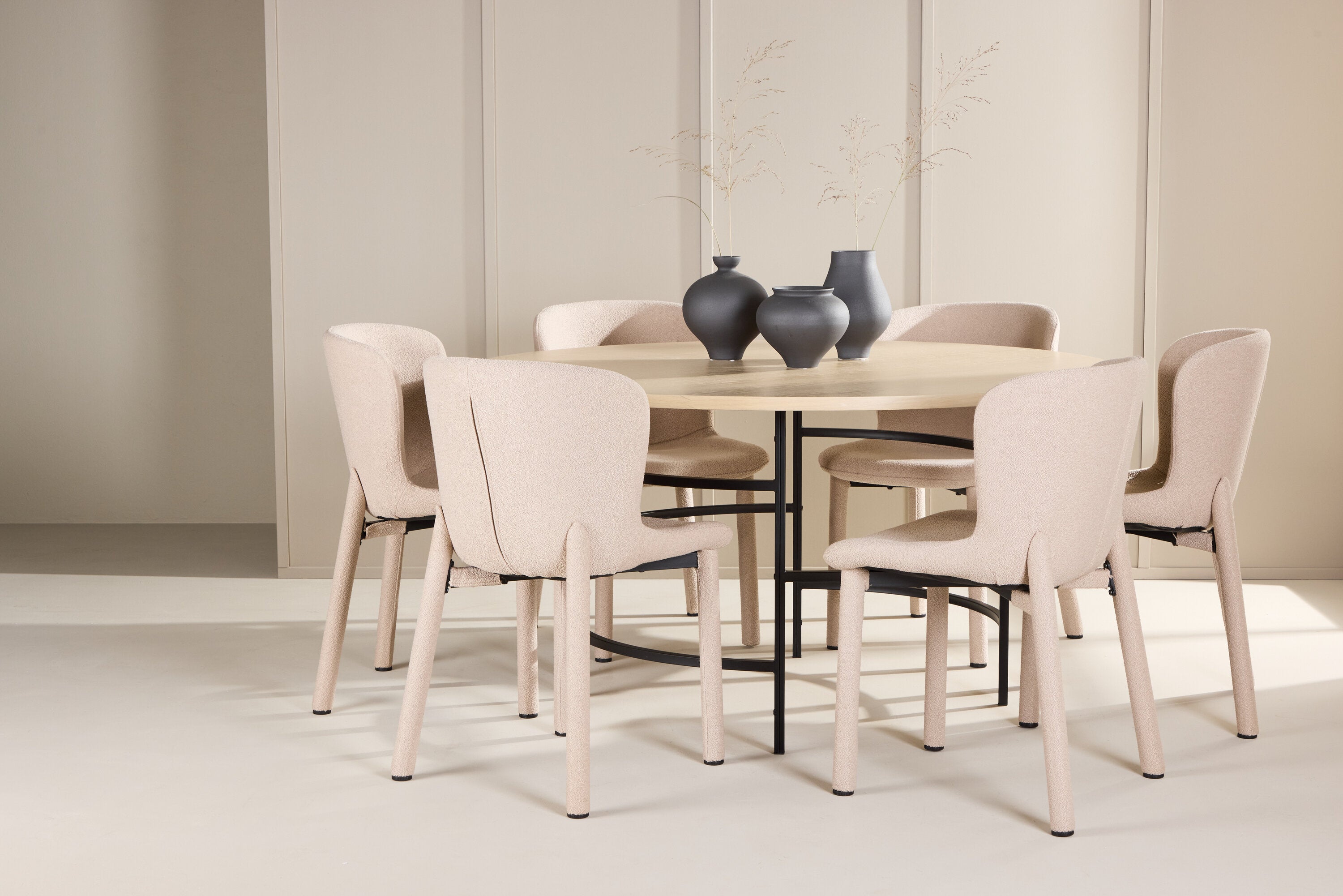 Ke stolu jsou připojeny jídelní židle Astoria, čalouněné prémiovou béžovou bouclé. Měkká a luxusní textura látky bouclé dodává židlím sofistikovaný a příjemný vzhled, ideální pro vytvoření teplého a útulného jídelního prostoru. Židle mají ergonomicky navrženou opěrku zad a pohodlný sedák, díky čemuž jsou ideální pro dlouhá a příjemná jídla. Jemná textura látky a její přirozený tón zajišťují, že židle hladce zapadnou do různých stylů interiéru.