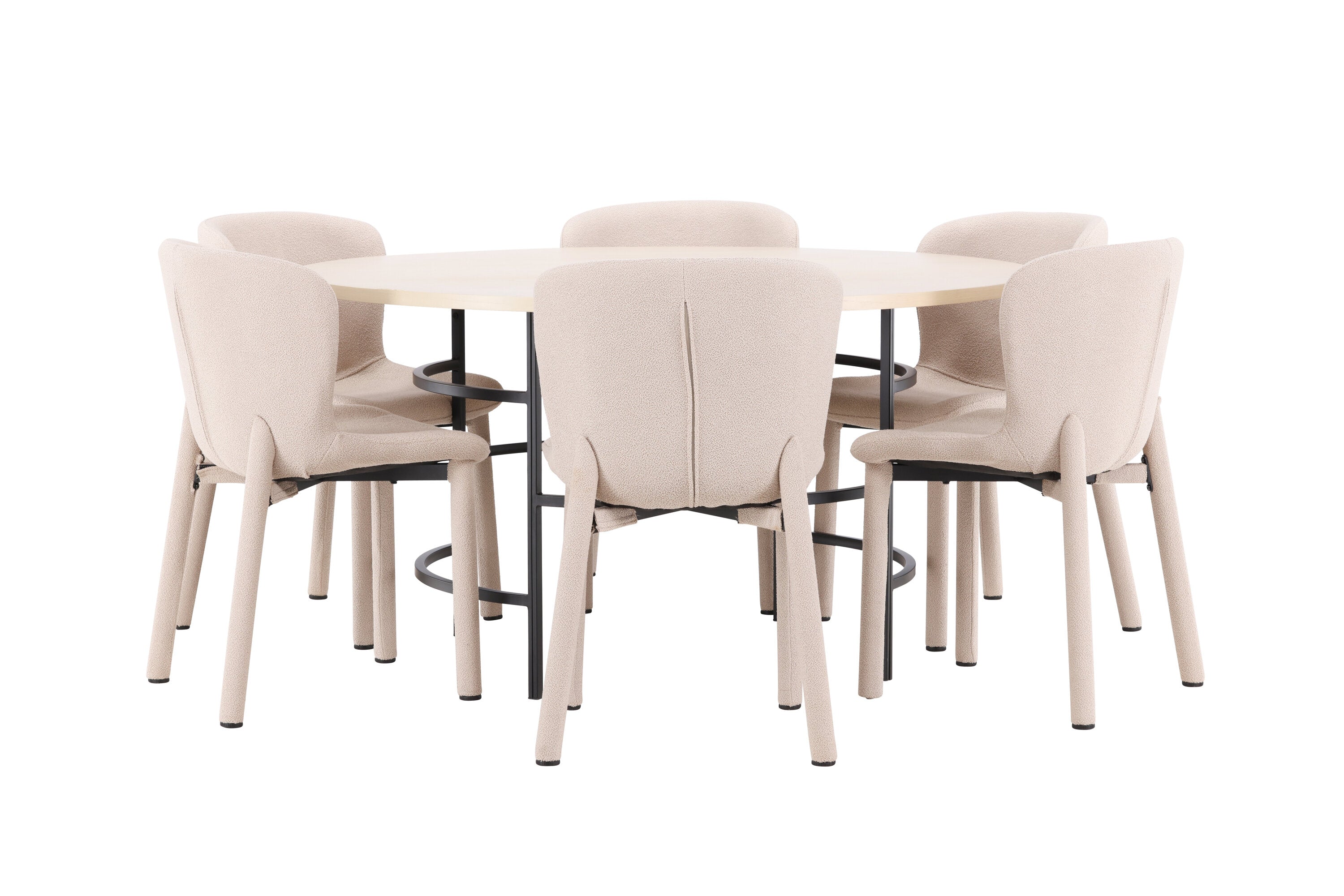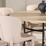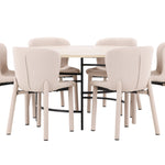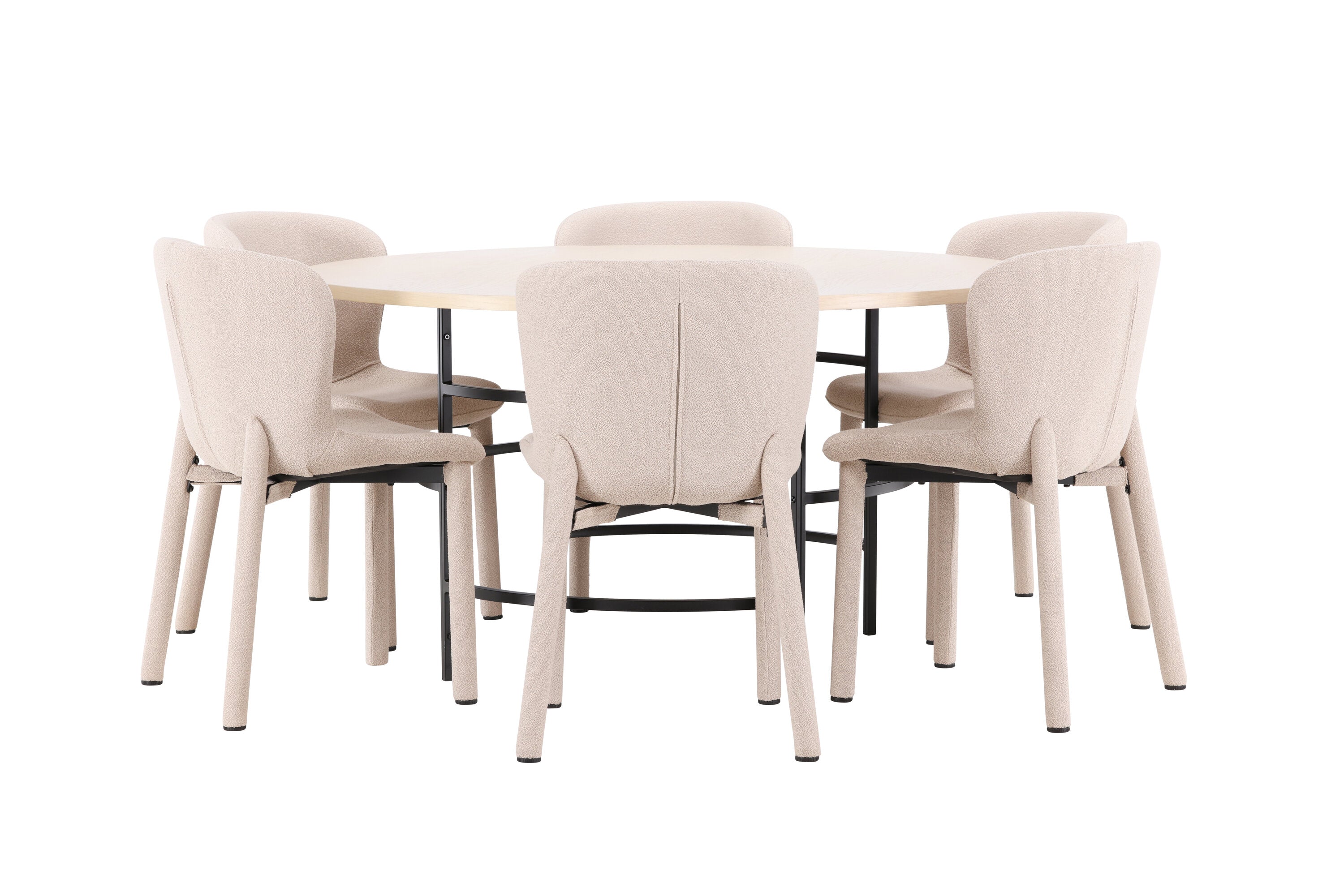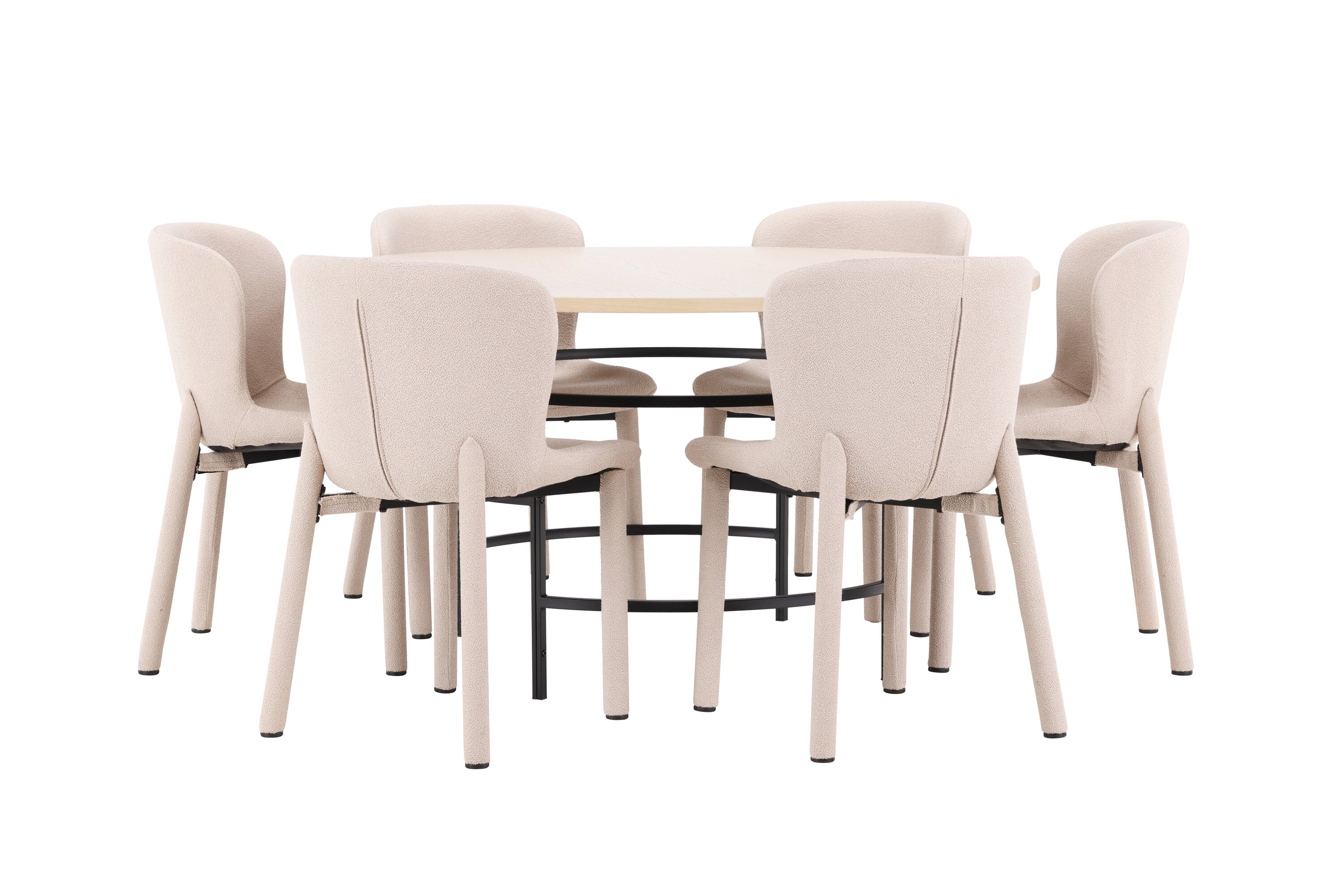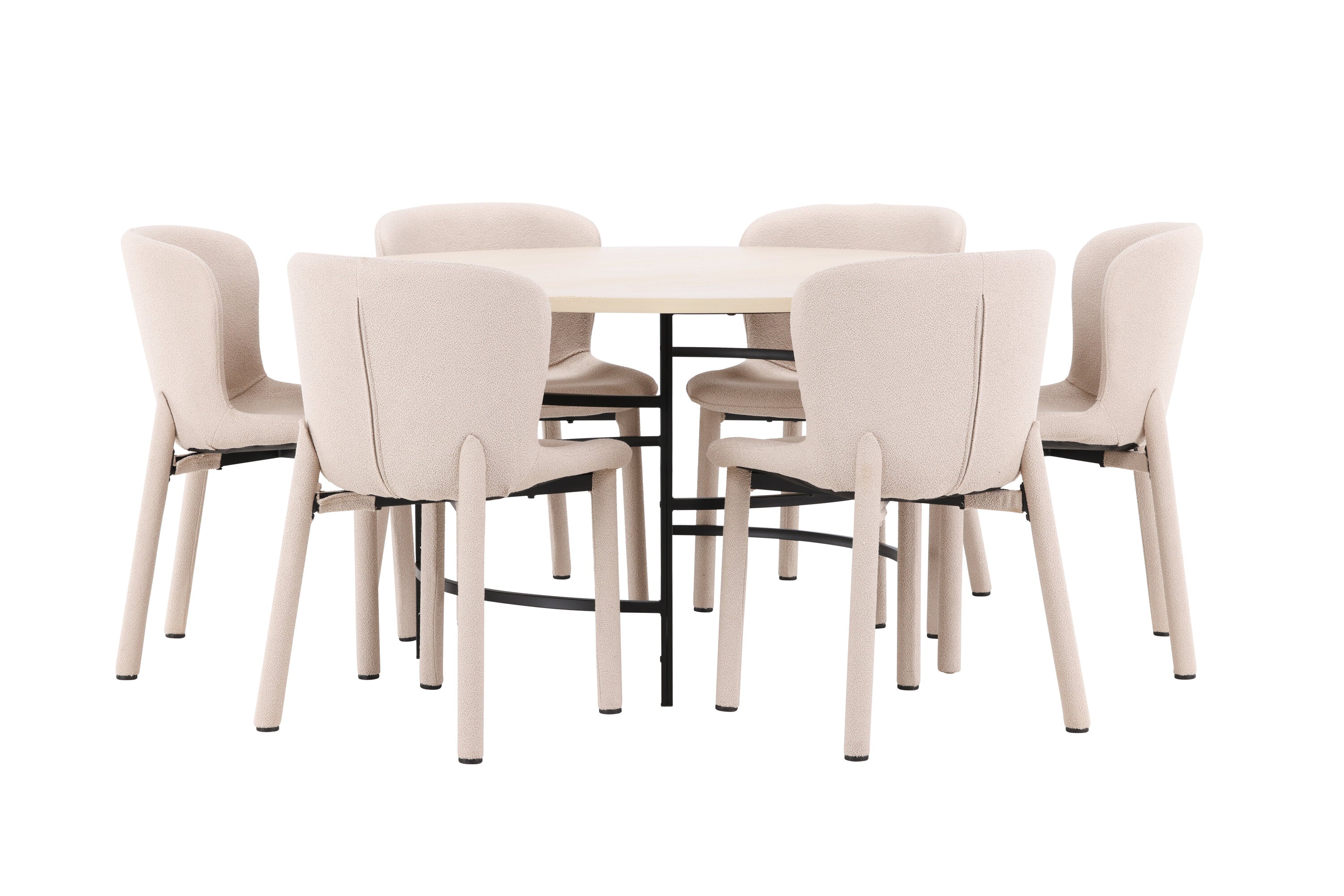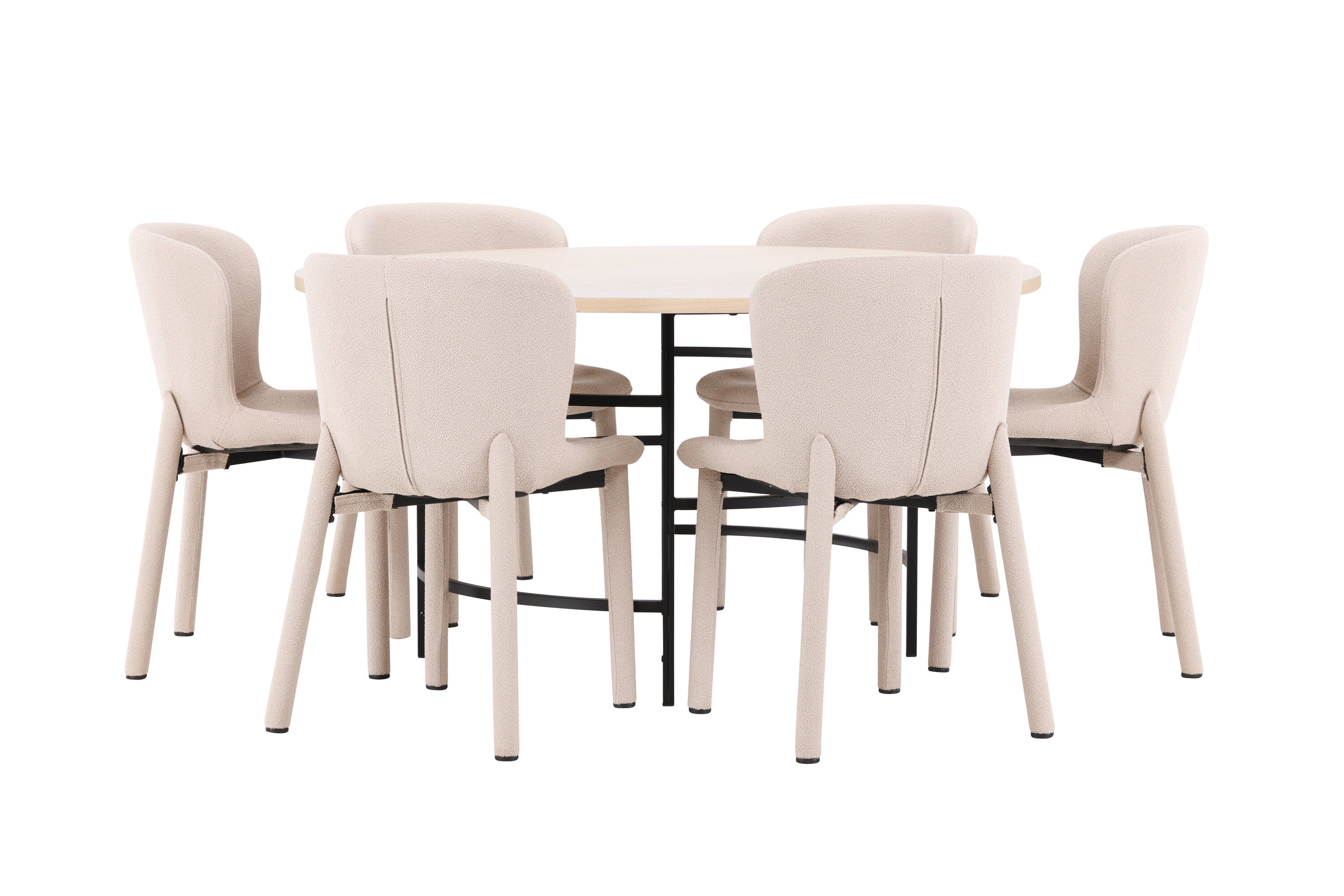Ke stolu jsou připojeny jídelní židle Astoria, čalouněné prémiovou béžovou bouclé. Měkká a luxusní textura látky bouclé dodává židlím sofistikovaný a příjemný vzhled, ideální pro vytvoření teplého a útulného jídelního prostoru. Židle mají ergonomicky navrženou opěrku zad a pohodlný sedák, díky čemuž jsou ideální pro dlouhá a příjemná jídla. Jemná textura látky a její přirozený tón zajišťují, že židle hladce zapadnou do různých stylů interiéru.