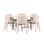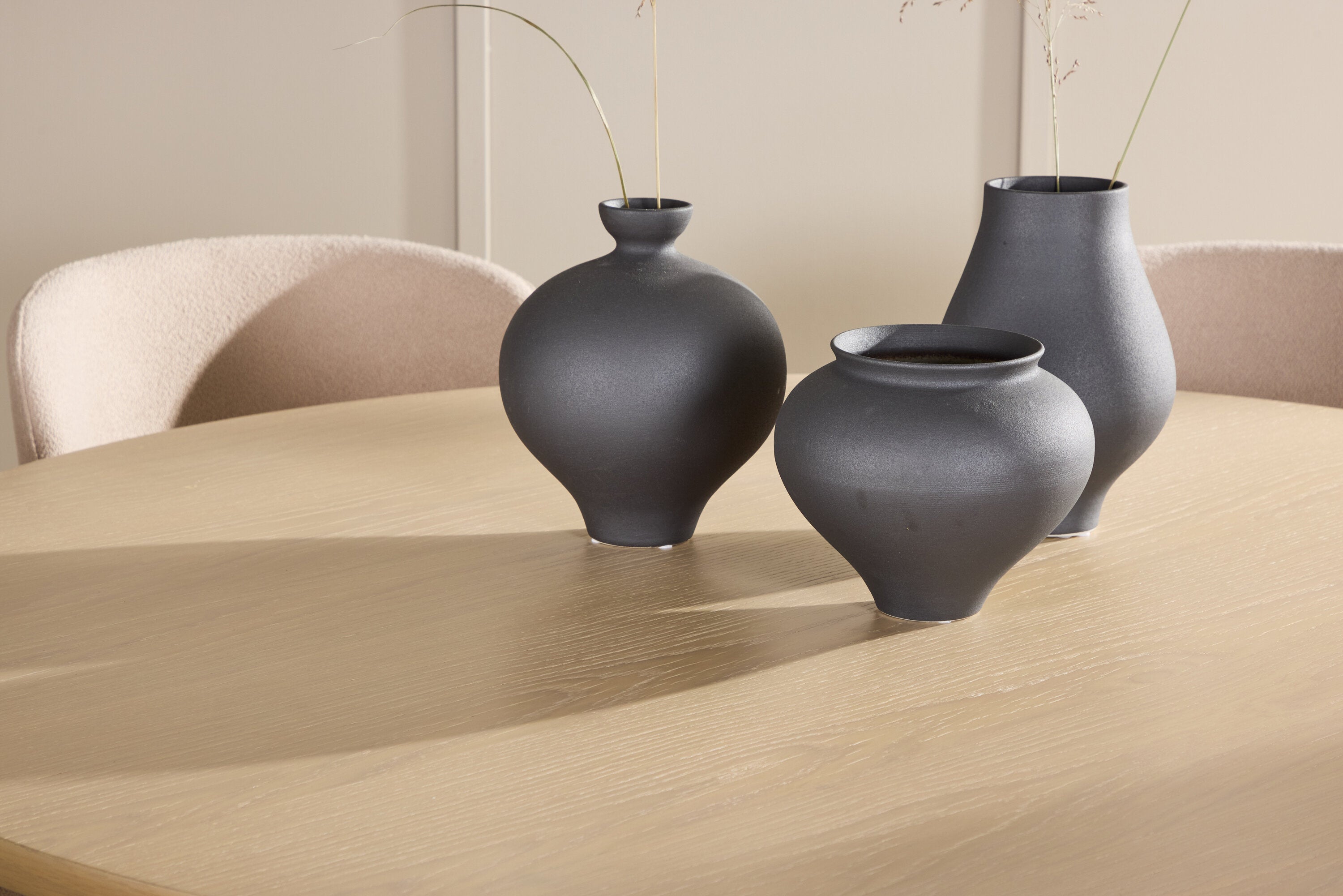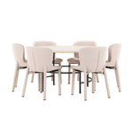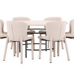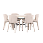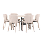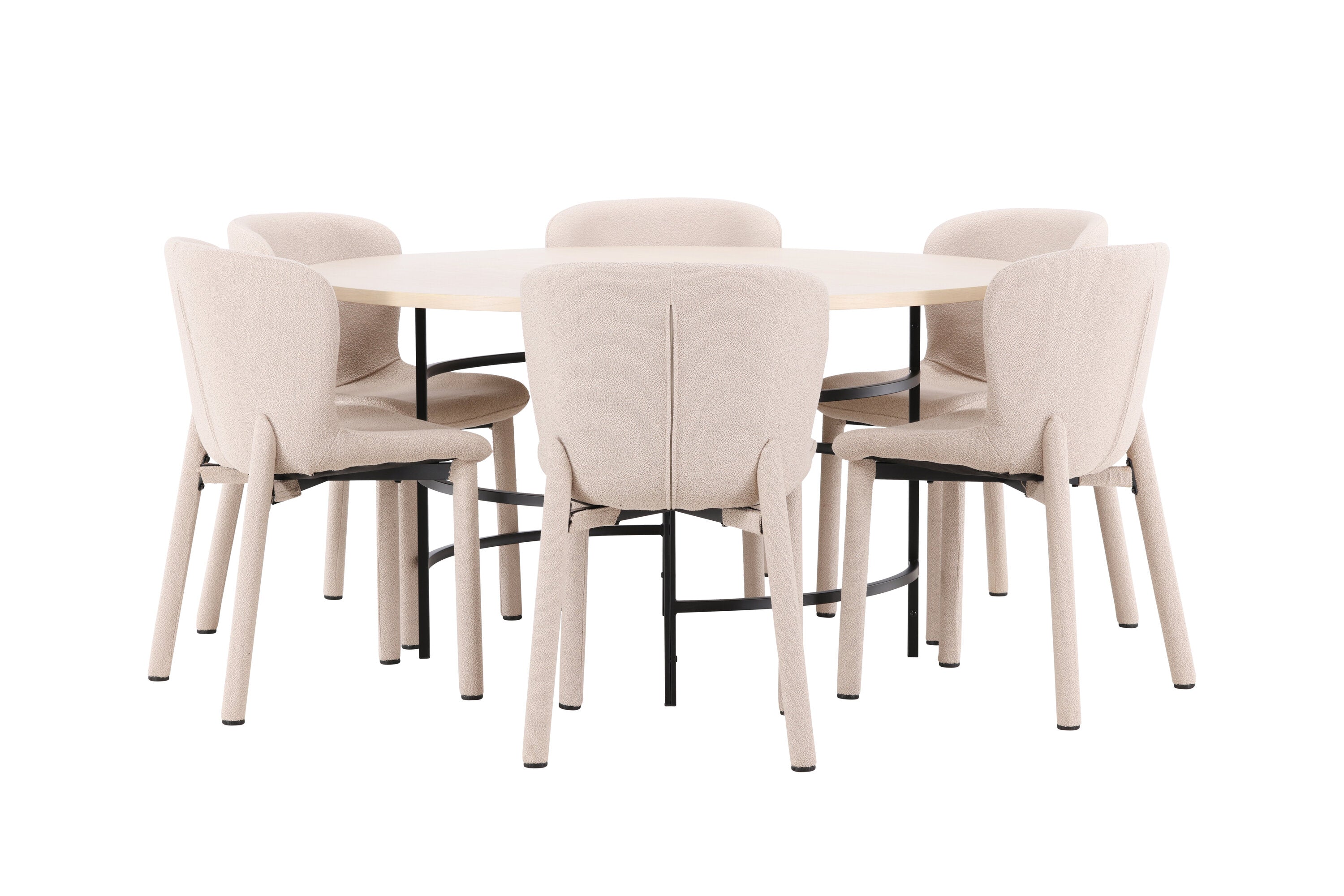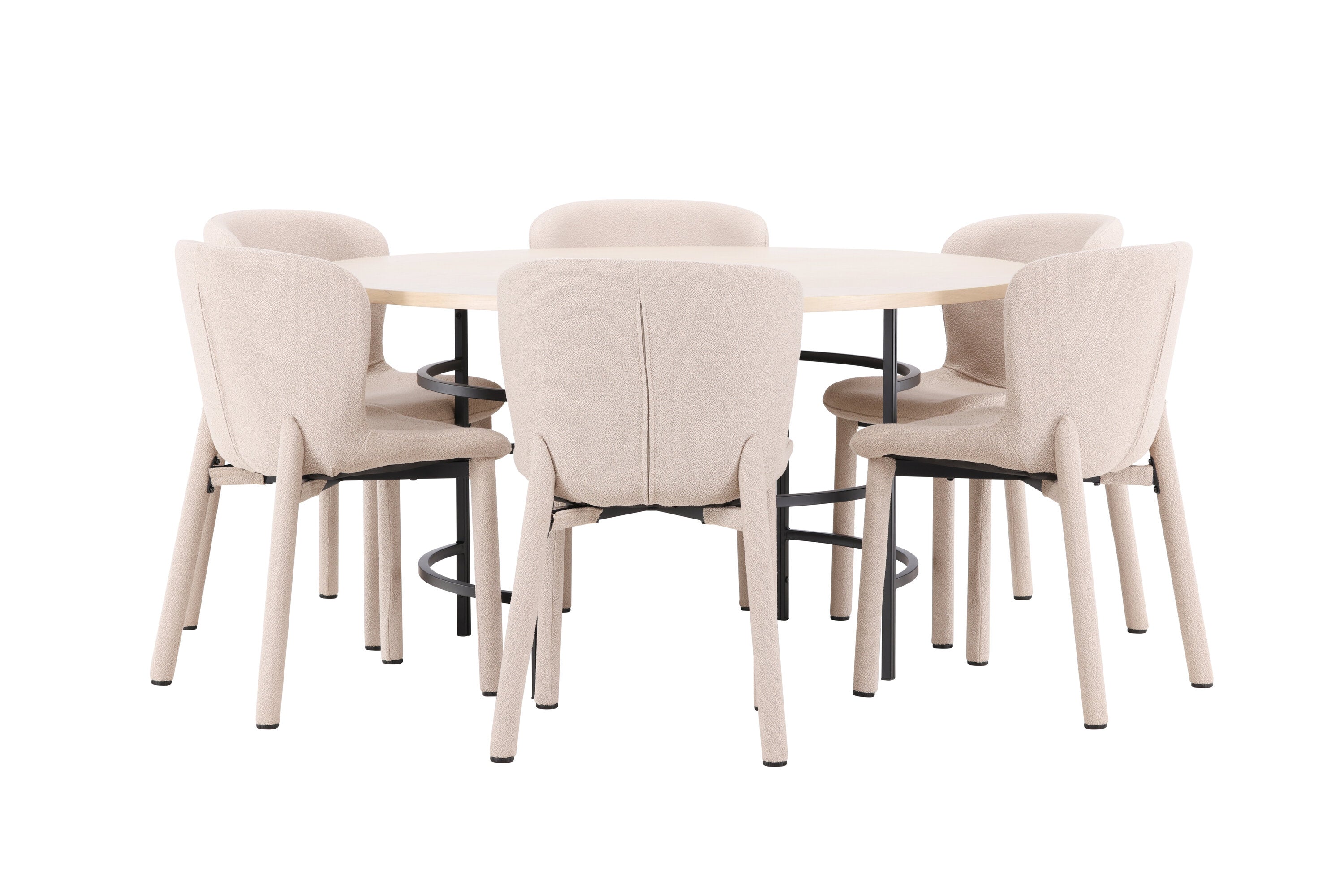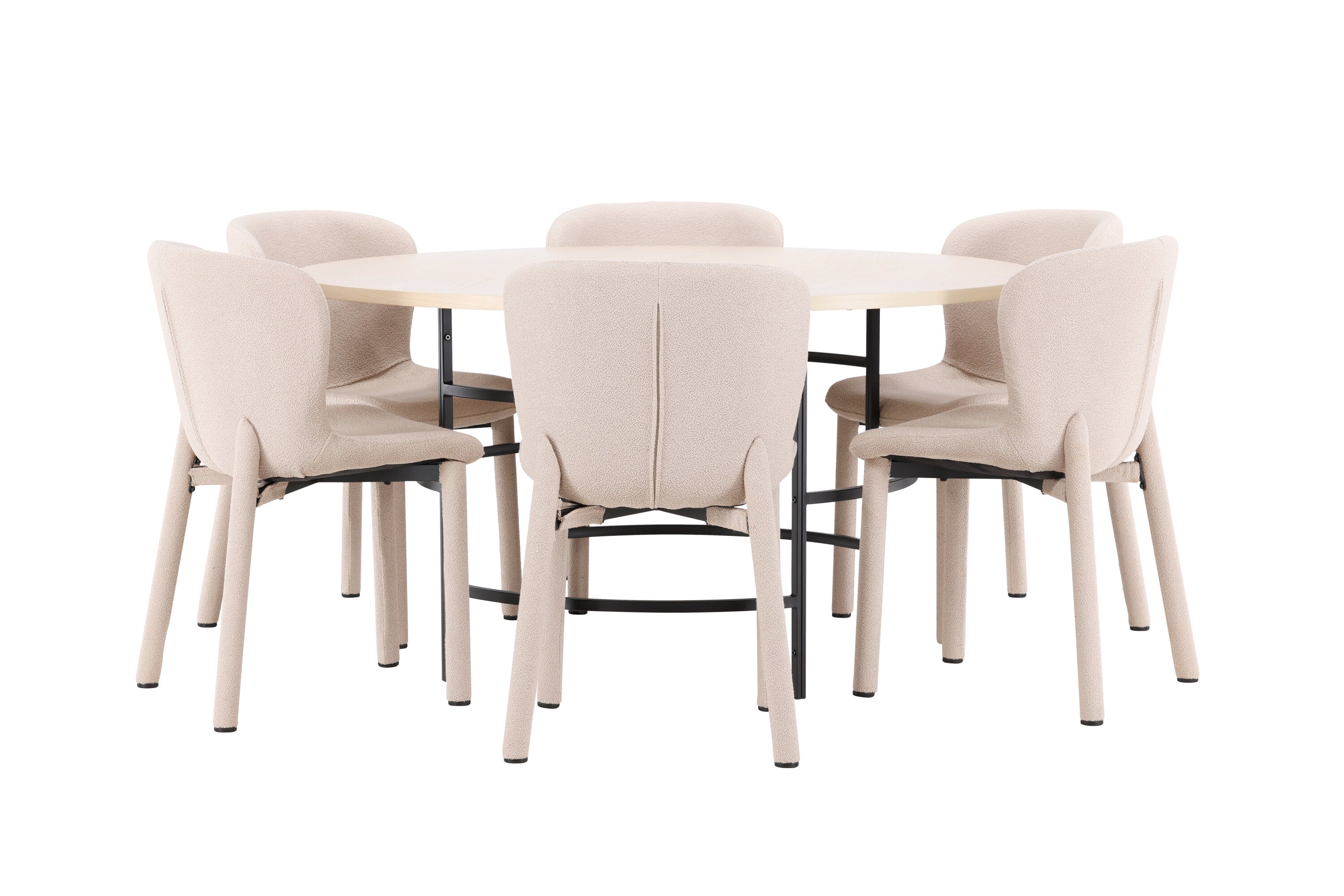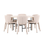 Ke stolu jsou připojeny jídelní židle Astoria, čalouněné prémiovou béžovou bouclé. Měkká a luxusní textura látky bouclé dodává židlím sofistikovaný a příjemný vzhled, ideální pro vytvoření teplého a útulného jídelního prostoru. Židle mají ergonomicky navrženou opěrku zad a pohodlný sedák, díky čemuž jsou ideální pro dlouhá a příjemná jídla. Jemná textura látky a její přirozený tón zajišťují, že židle hladce zapadnou do různých stylů interiéru.