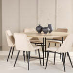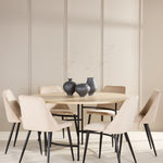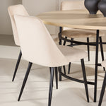 Ke stolu je doplněna jídelní židle Night, elegantní kousek čalouněný jemným béžovým sametem. Neutrální béžový tón dodává nádech sofistikované elegance a hladce zapadne do jakéhokoli stylu interiéru, od moderního minimalismu po klasický šarm. Černé nohy poskytují výrazný kontrast se světlým sametem a vytvářejí stylový a rafinovaný profil. Židle je nejen vizuálně přitažlivá, ale je také ergonomicky navržena tak, aby poskytovala vynikající podporu a pohodlí během dlouhých večeří.