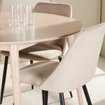 Jídelní židle Night skvěle doplňují stůl svým propracovaným a pohodlným designem. Jsou čalouněné měkkým béžovým sametem a přinášejí luxusní dotek, který dodá vašemu jídelnímu prostoru teplo a eleganci. Neutrální béžový tón se krásně hodí k přírodním odstínům stolu Flora, zatímco černé nohy poskytují výrazný kontrast a vytvářejí vyvážený a stylový vzhled. Noční židle jsou nejen vizuálně přitažlivé, ale také ergonomicky navržené tak, aby poskytovaly vynikající podporu při dlouhých večeřích. Jejich pevná konstrukce a pohodlné sezení zajišťují odolnost a pohodlí jak pro každodenní použití, tak pro speciální příležitosti.