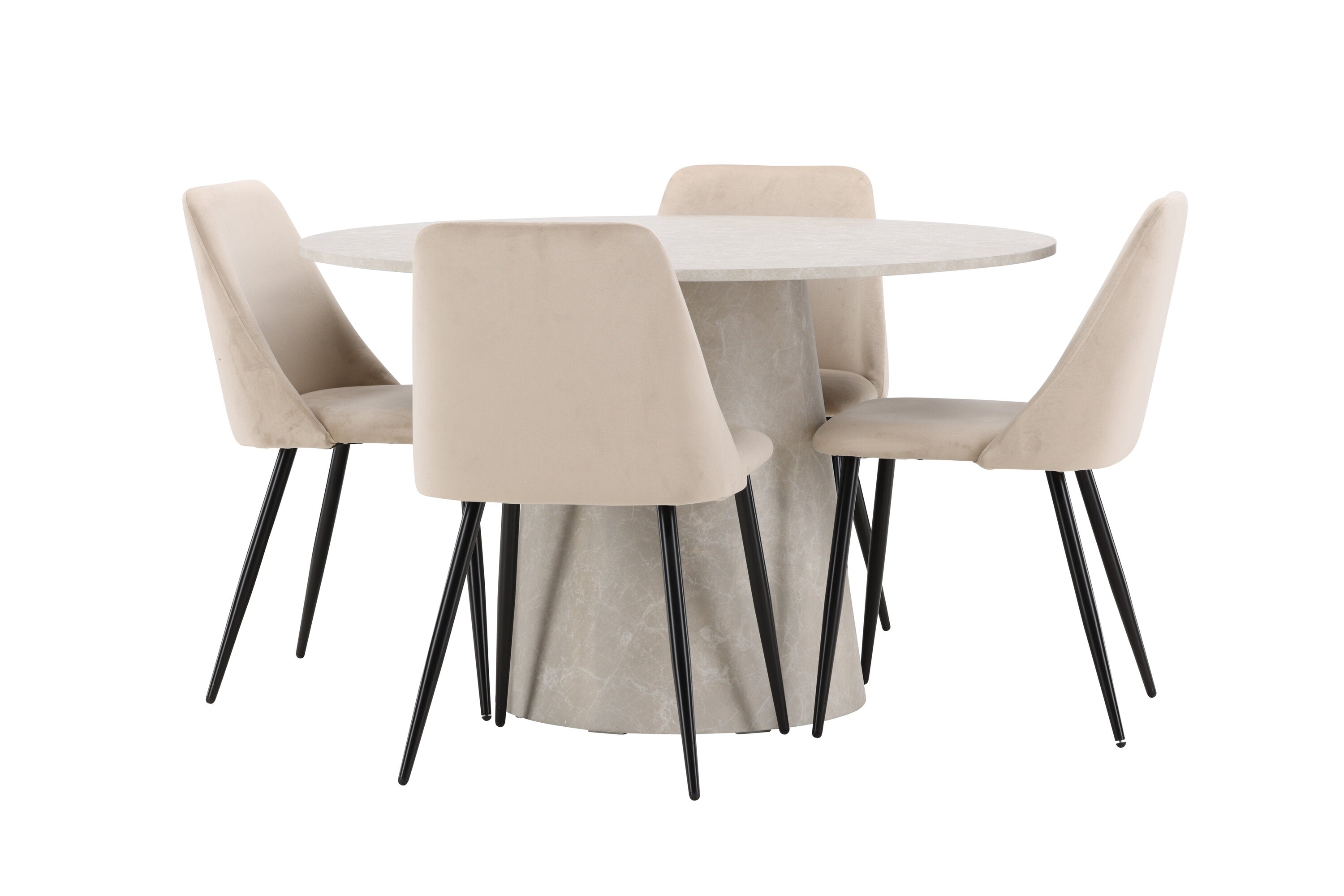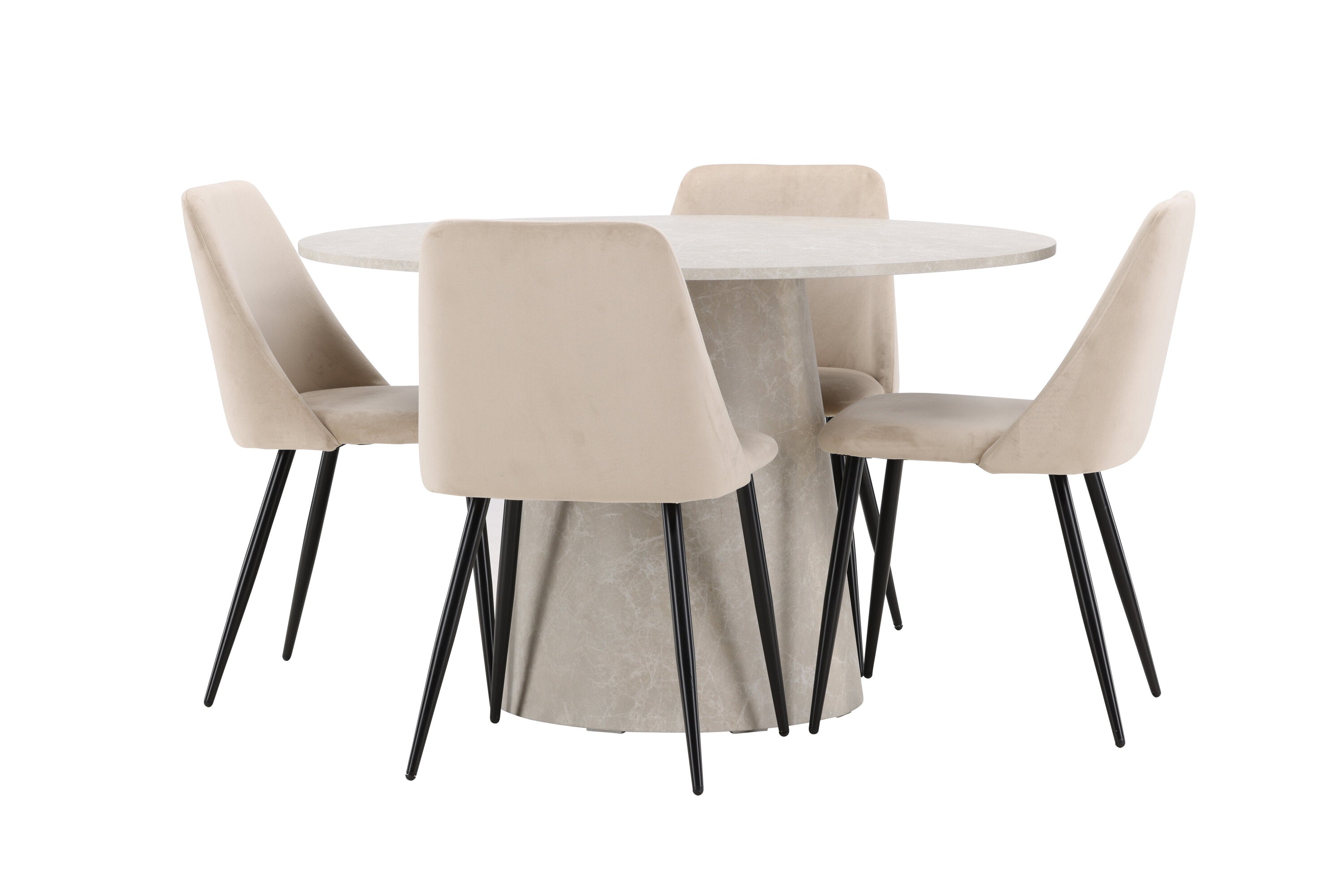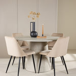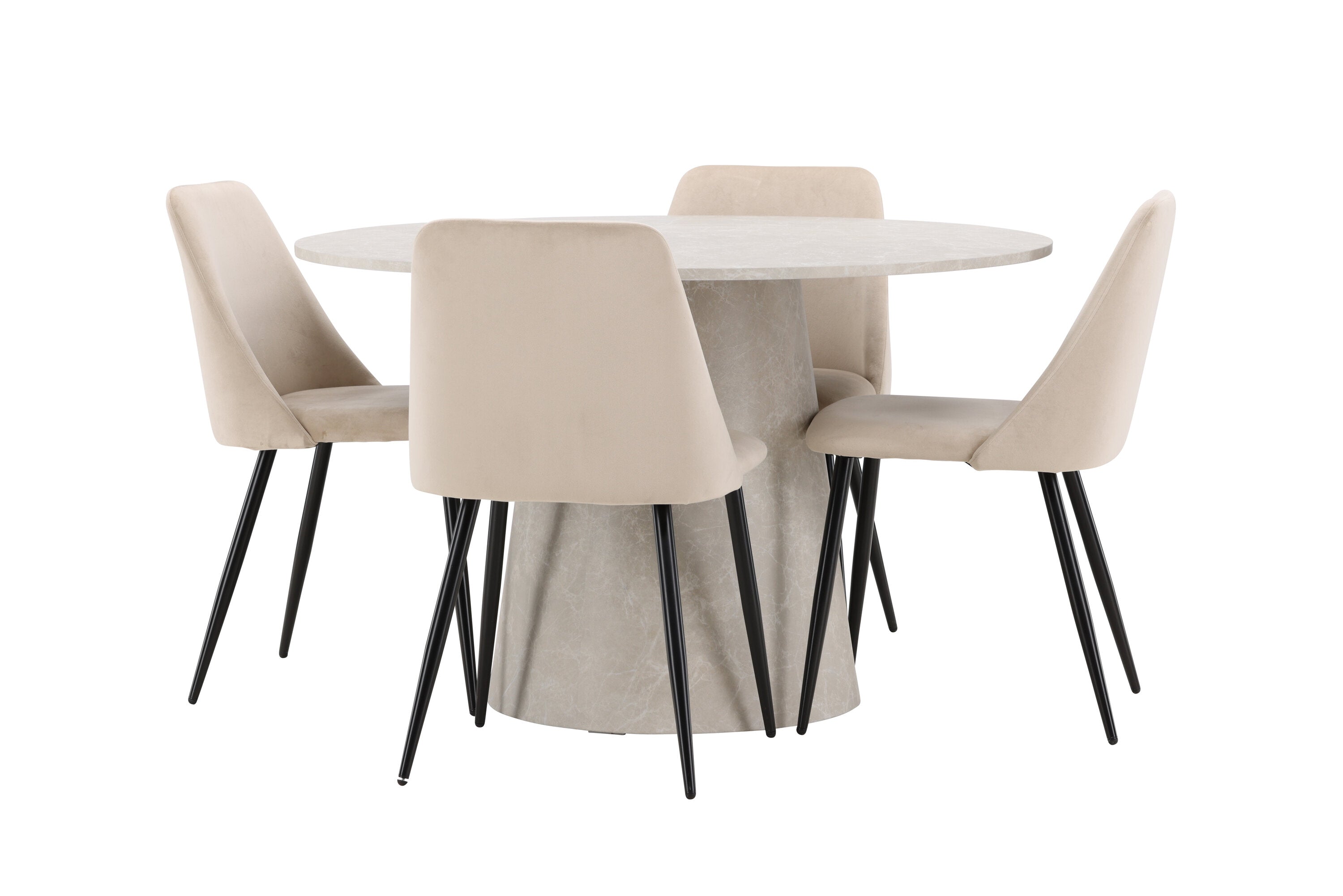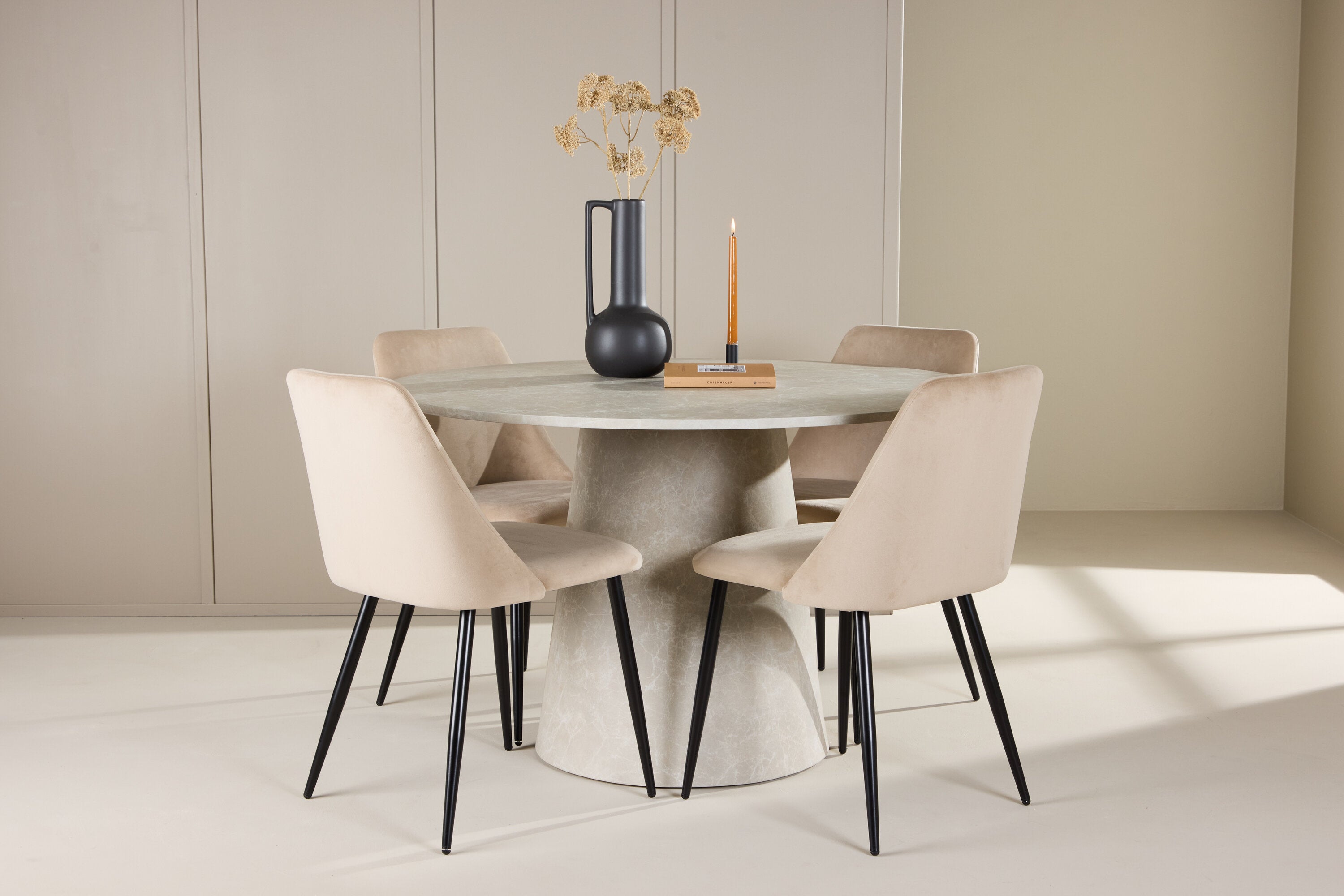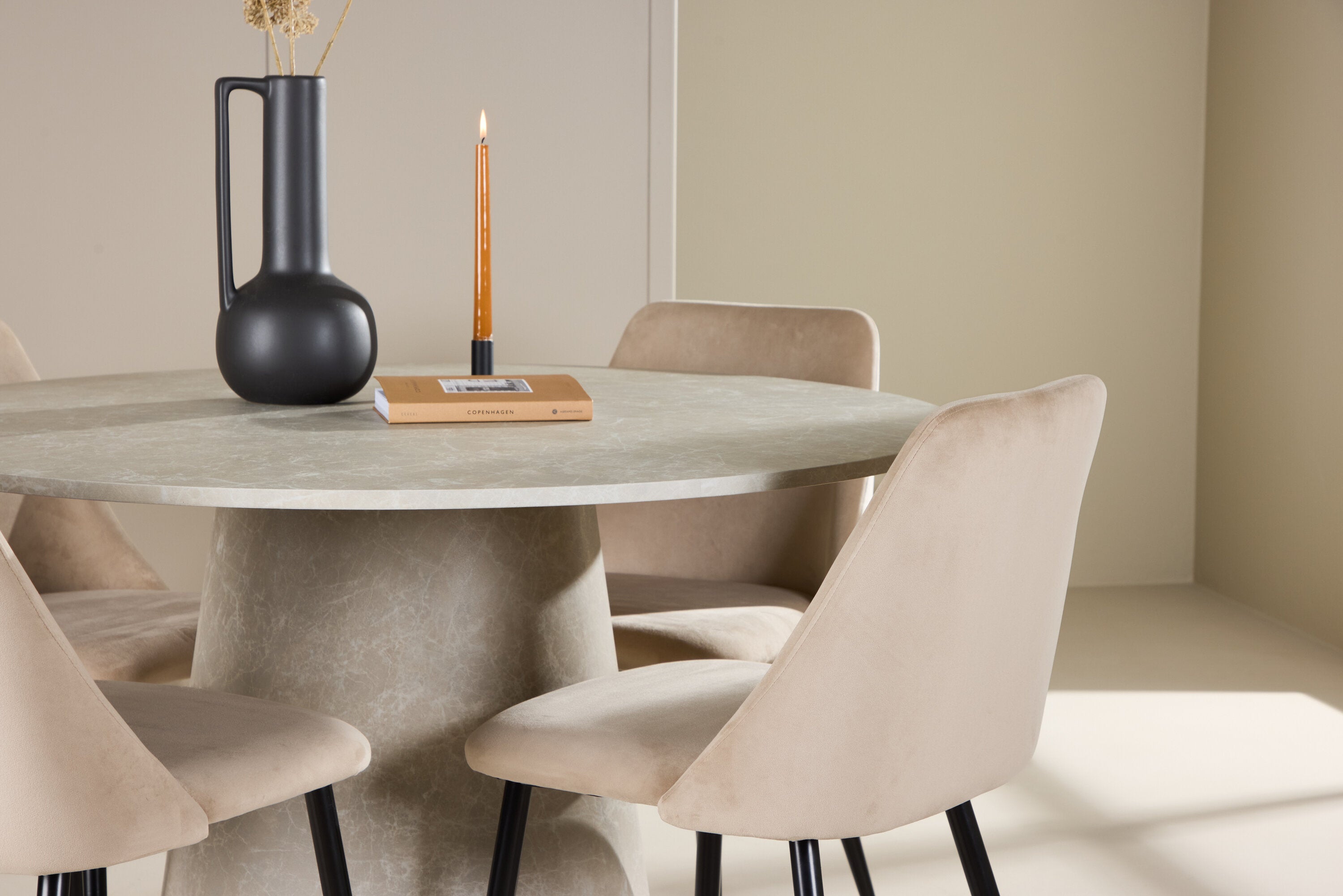 Jídelní stůl Lanzo nabízí sofistikovaný a exkluzivní pocit s úžasným béžovým mramorovaným povrchem, který napodobuje nadčasovou krásu přírodního kamene. Stůl je ideální pro moderní i klasické interiéry a vytváří příjemnou atmosféru pro každé jídlo. Jeho kulatý tvar podporuje spojení, takže se všichni sedící mohou snadno zapojit do konverzace a společenských aktivit. Lanzo je stejně praktické jako krásné a vyznačuje se hladkým povrchem, který se snadno čistí – ideální pro každodenní použití a slavnostní setkání.