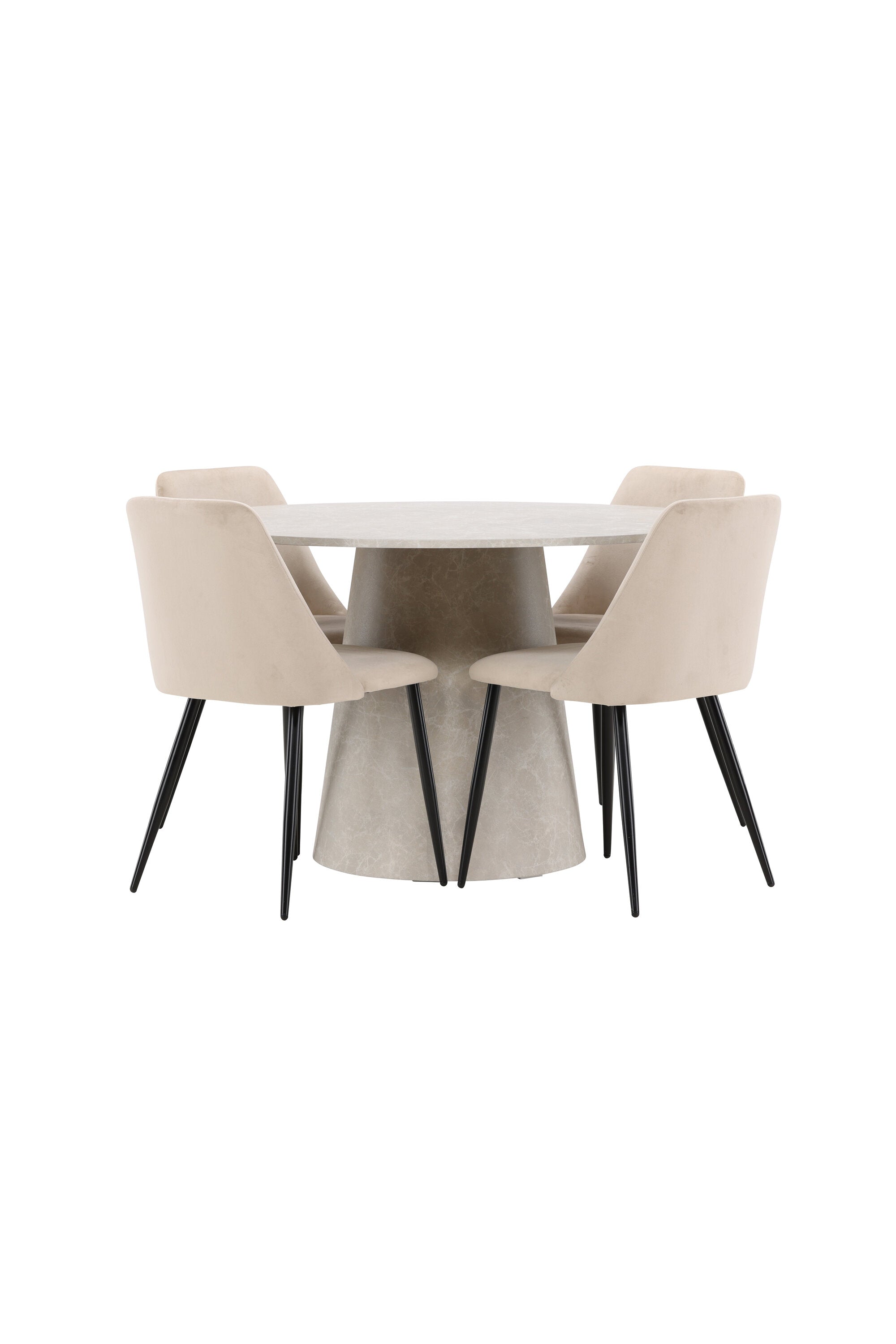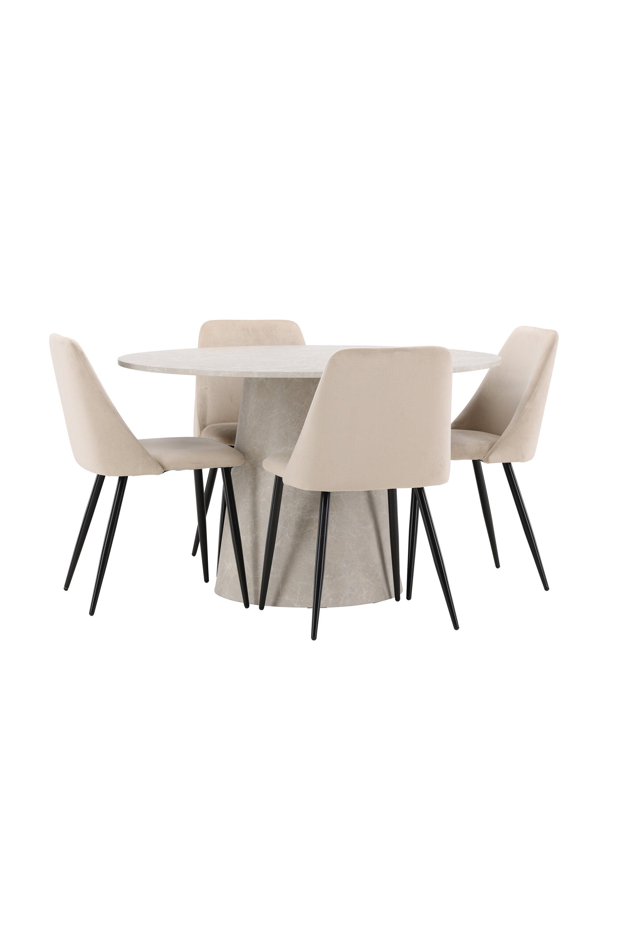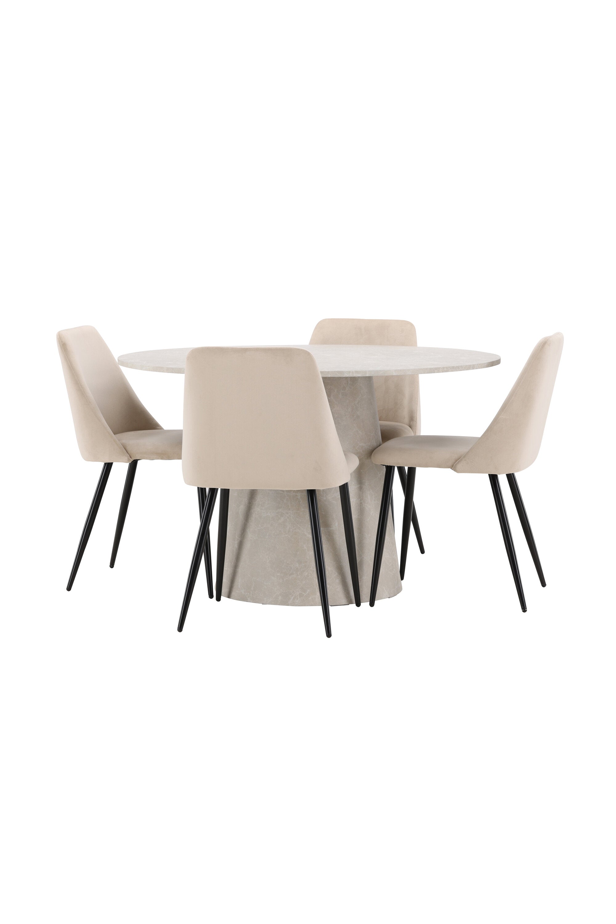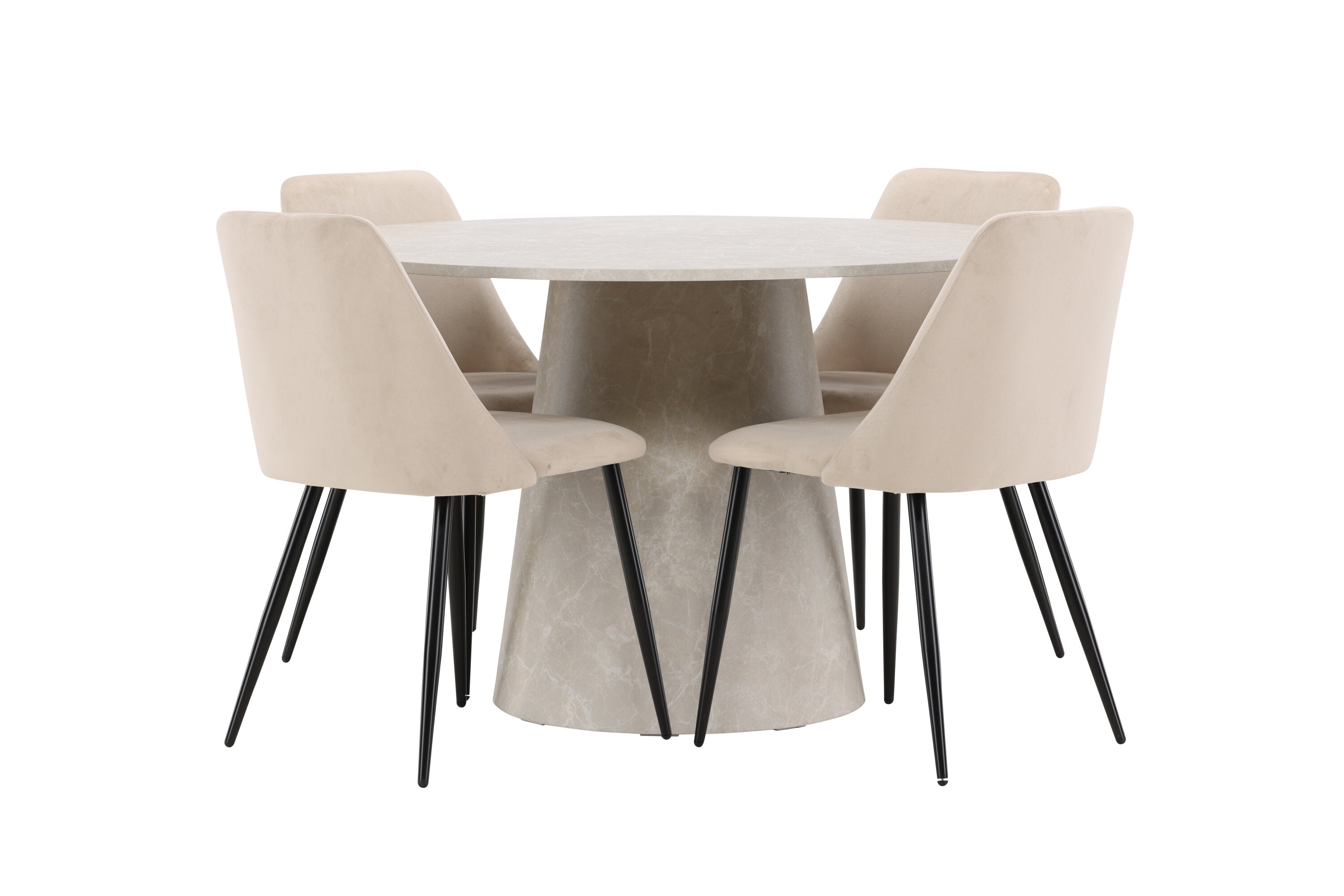 Jídelní stůl Lanzo nabízí sofistikovaný a exkluzivní pocit s úžasným béžovým mramorovaným povrchem, který napodobuje nadčasovou krásu přírodního kamene. Stůl je ideální pro moderní i klasické interiéry a vytváří příjemnou atmosféru pro každé jídlo. Jeho kulatý tvar podporuje spojení, takže se všichni sedící mohou snadno zapojit do konverzace a společenských aktivit. Lanzo je stejně praktické jako krásné a vyznačuje se hladkým povrchem, který se snadno čistí – ideální pro každodenní použití a slavnostní setkání.