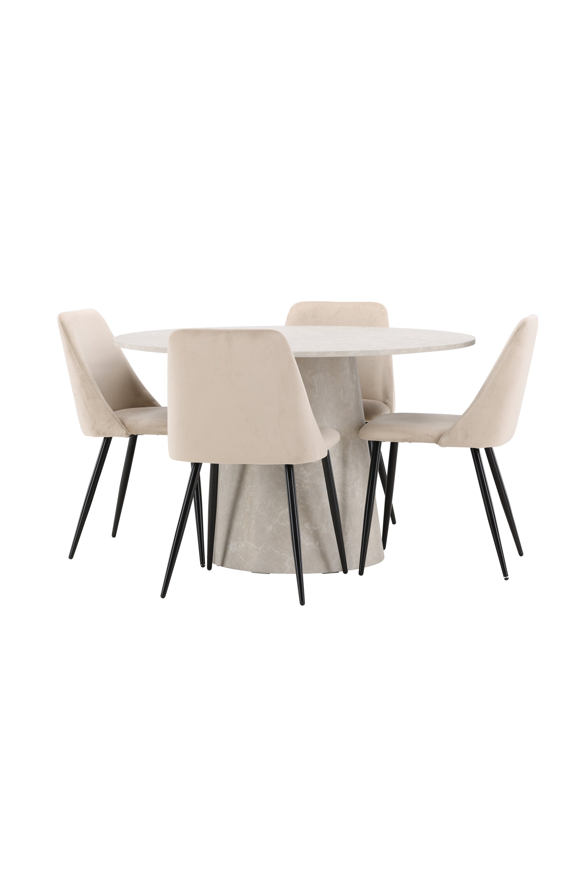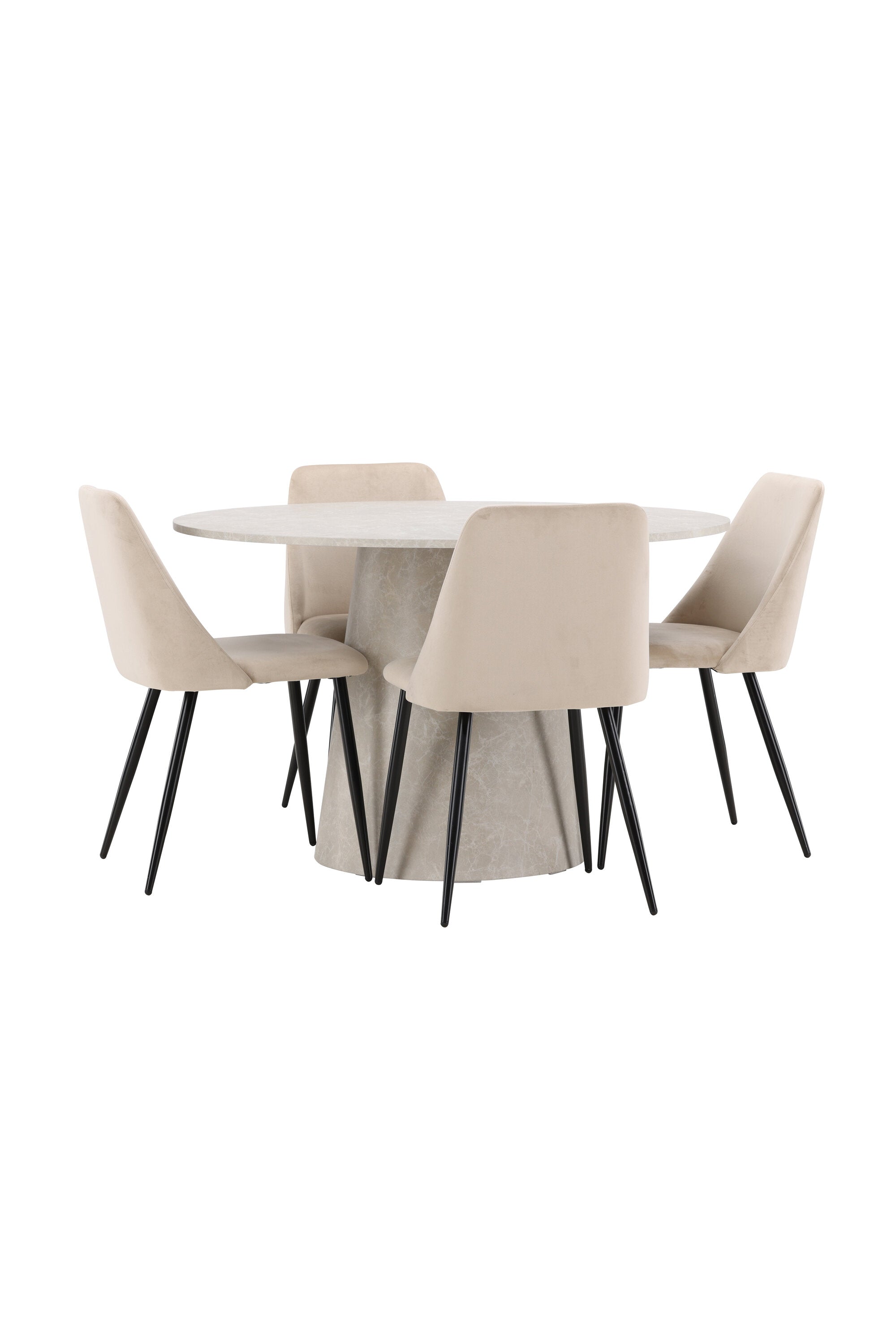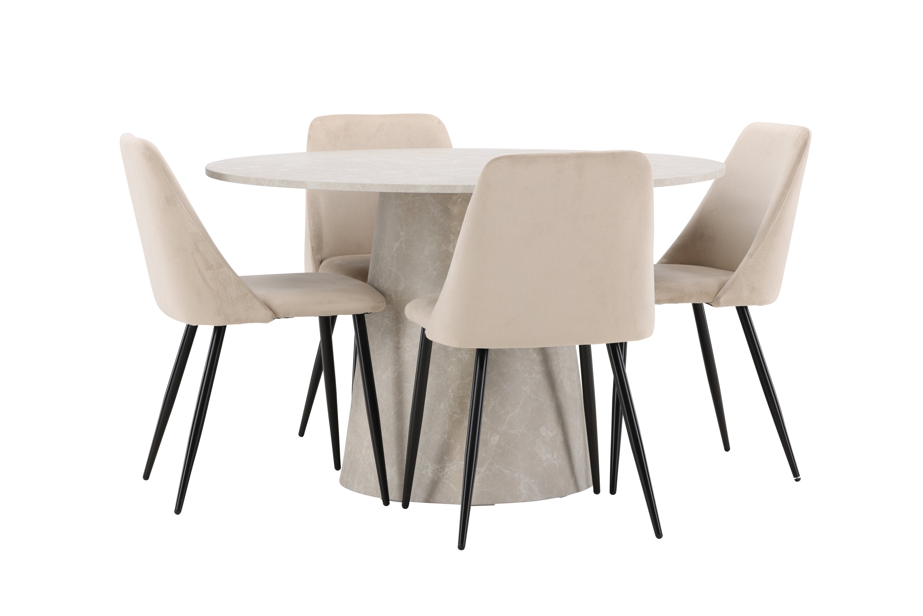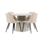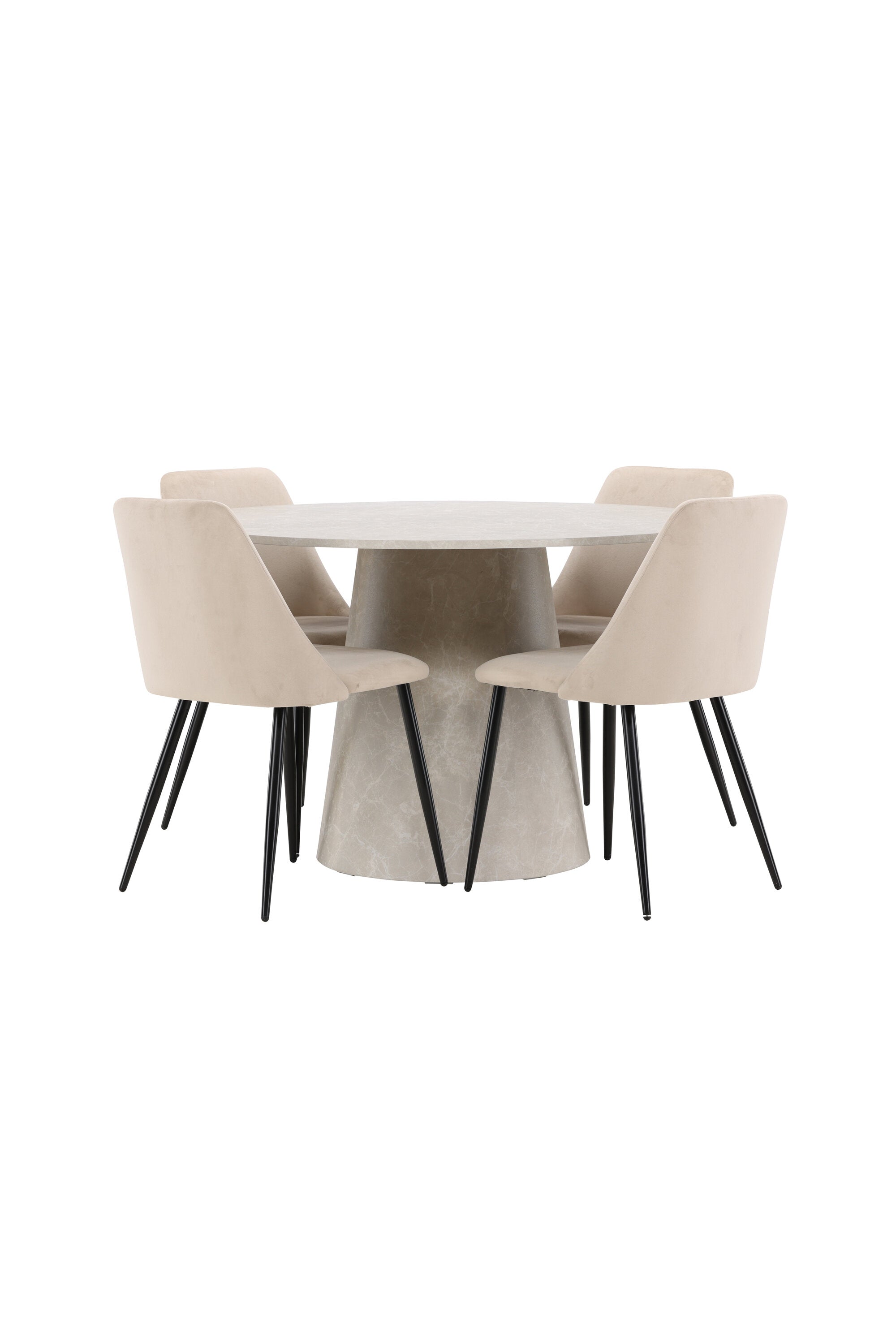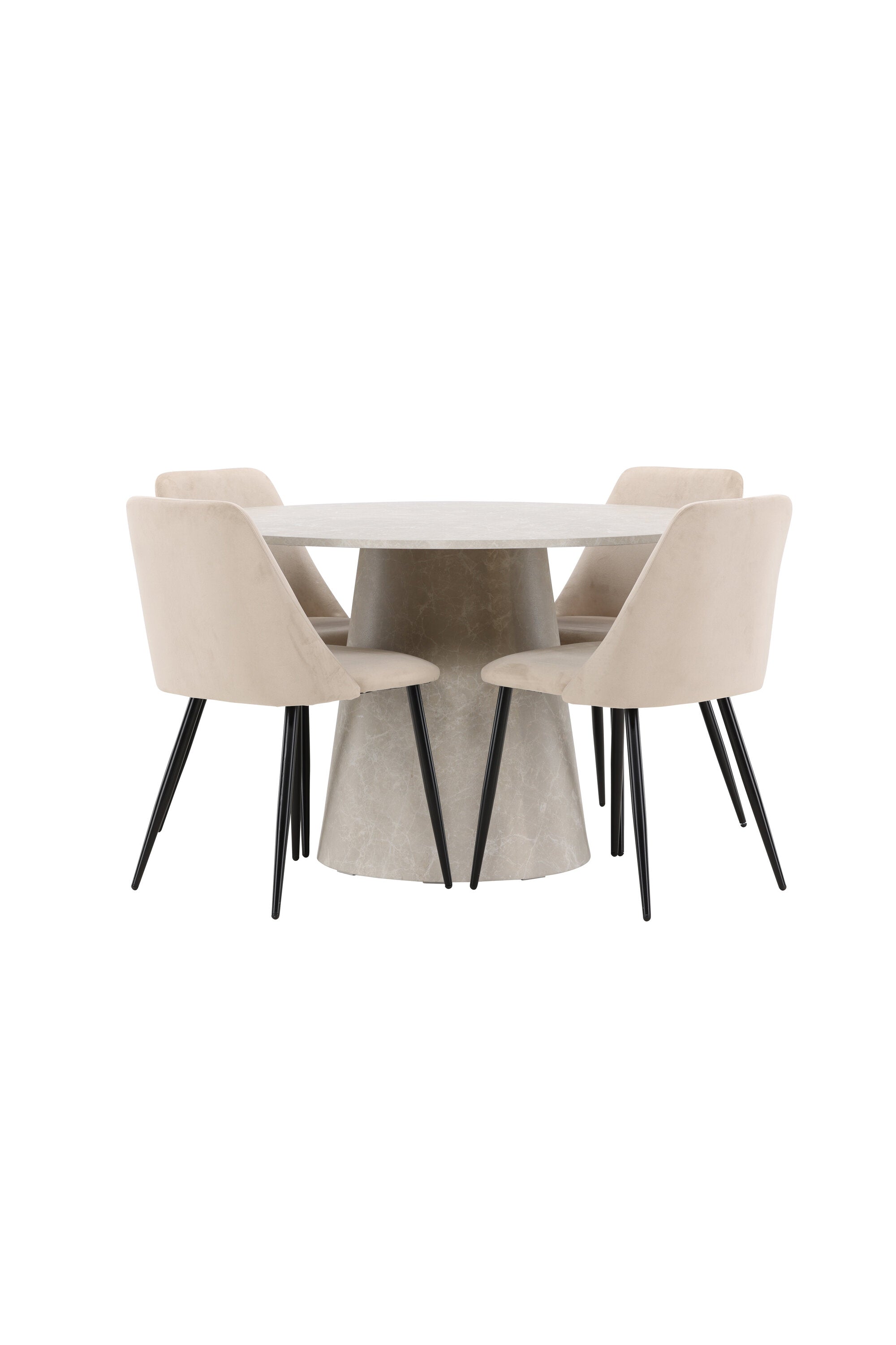 Jídelní stůl Lanzo nabízí sofistikovaný a exkluzivní pocit s úžasným béžovým mramorovaným povrchem, který napodobuje nadčasovou krásu přírodního kamene. Stůl je ideální pro moderní i klasické interiéry a vytváří příjemnou atmosféru pro každé jídlo. Jeho kulatý tvar podporuje spojení, takže se všichni sedící mohou snadno zapojit do konverzace a společenských aktivit. Lanzo je stejně praktické jako krásné a vyznačuje se hladkým povrchem, který se snadno čistí – ideální pro každodenní použití a slavnostní setkání.