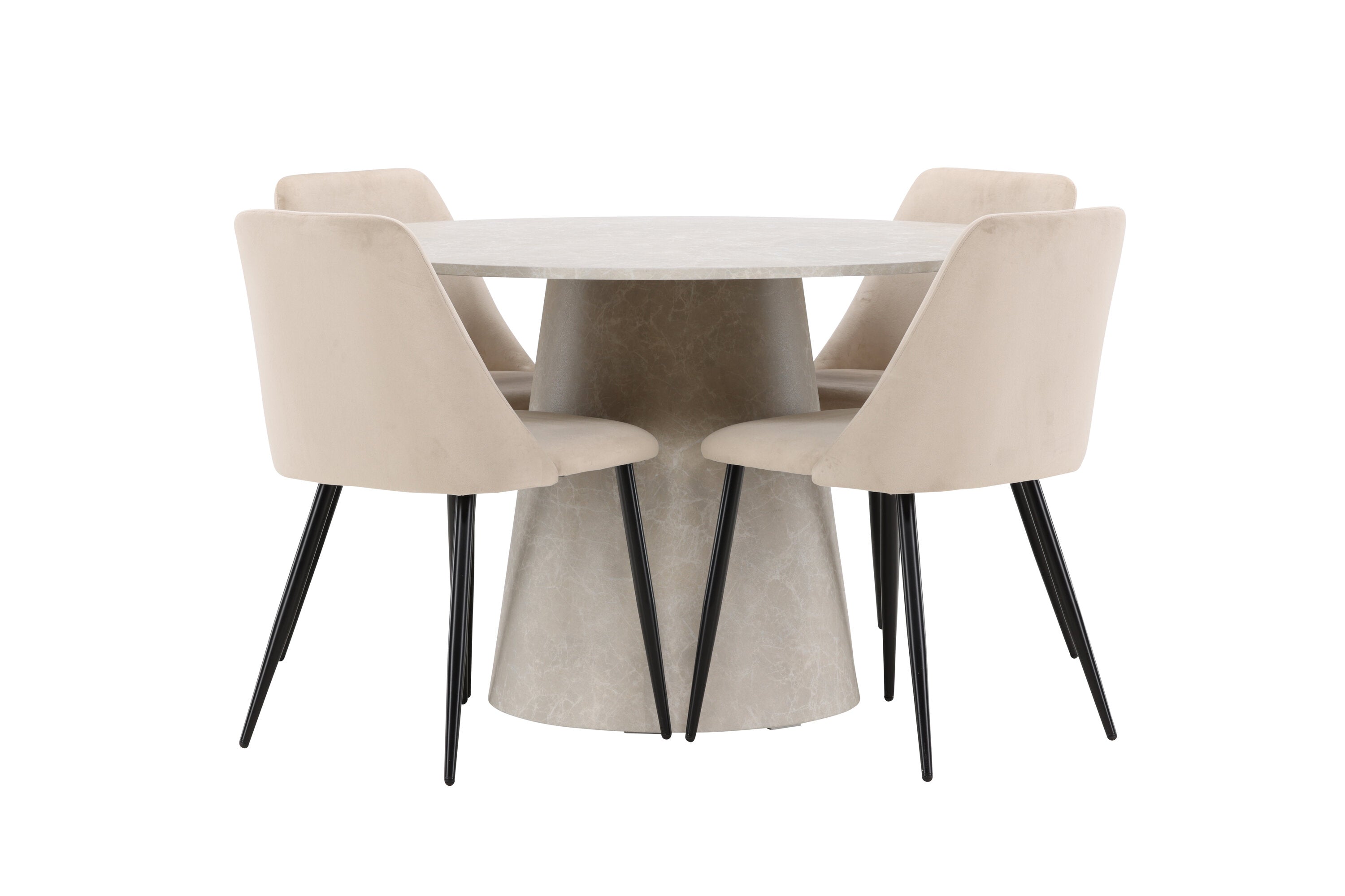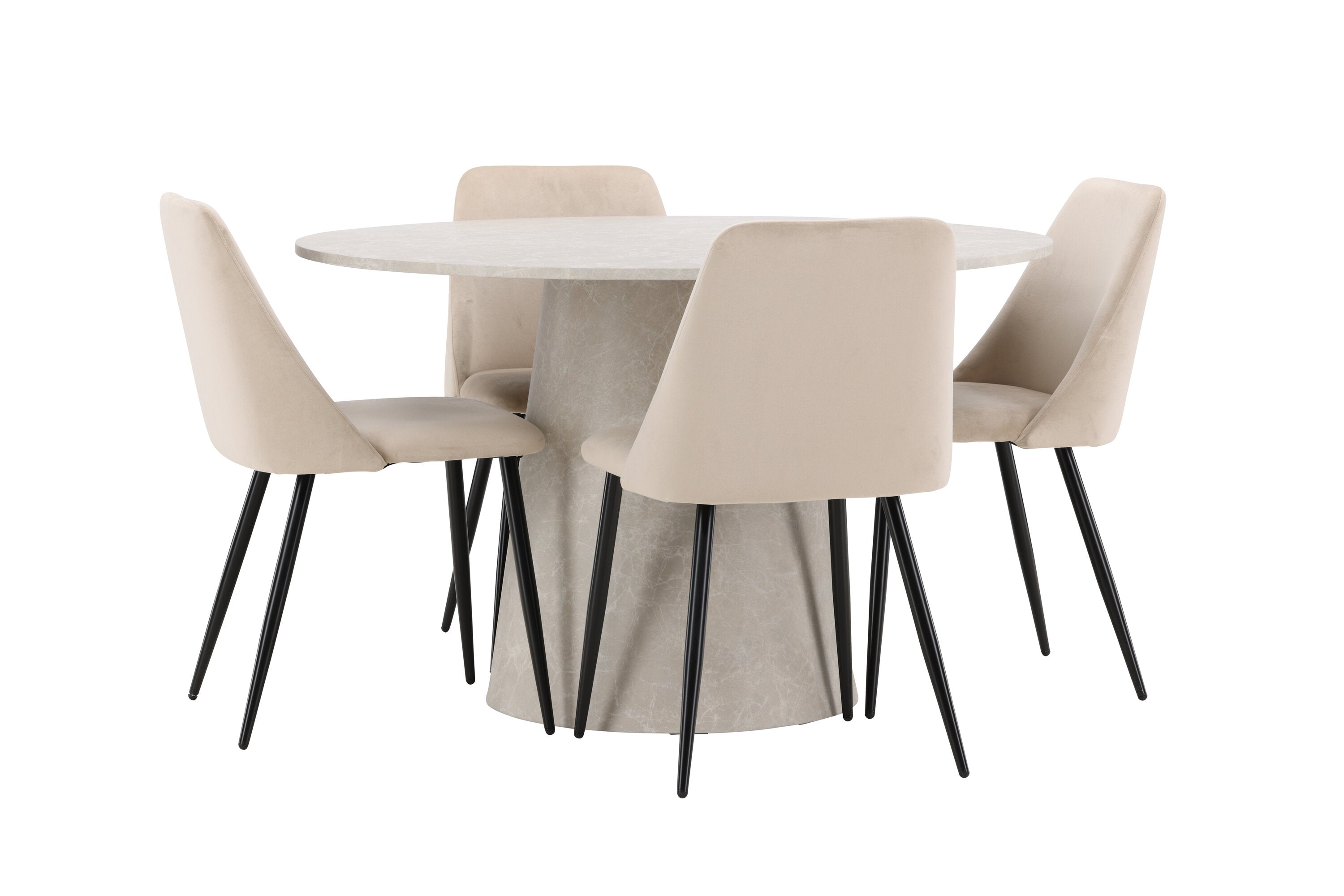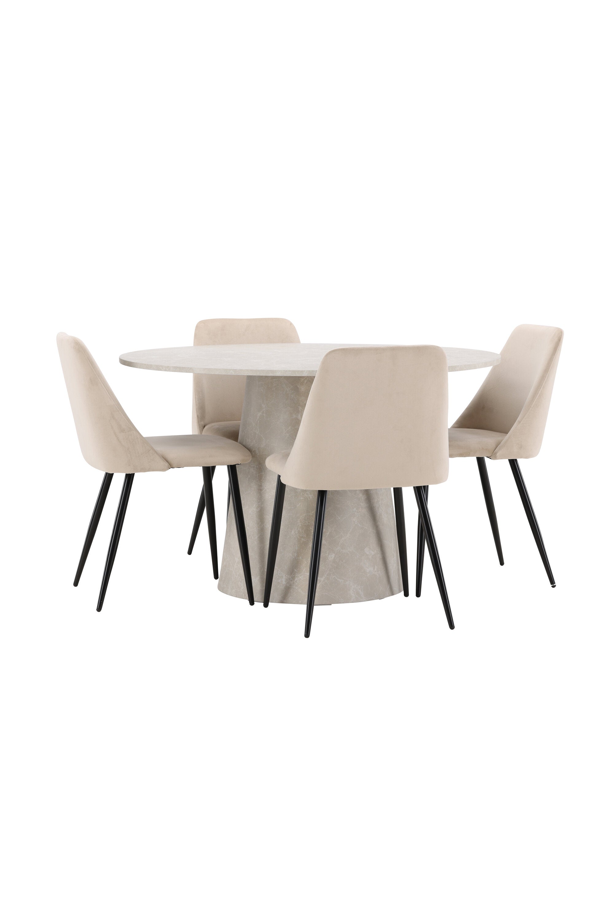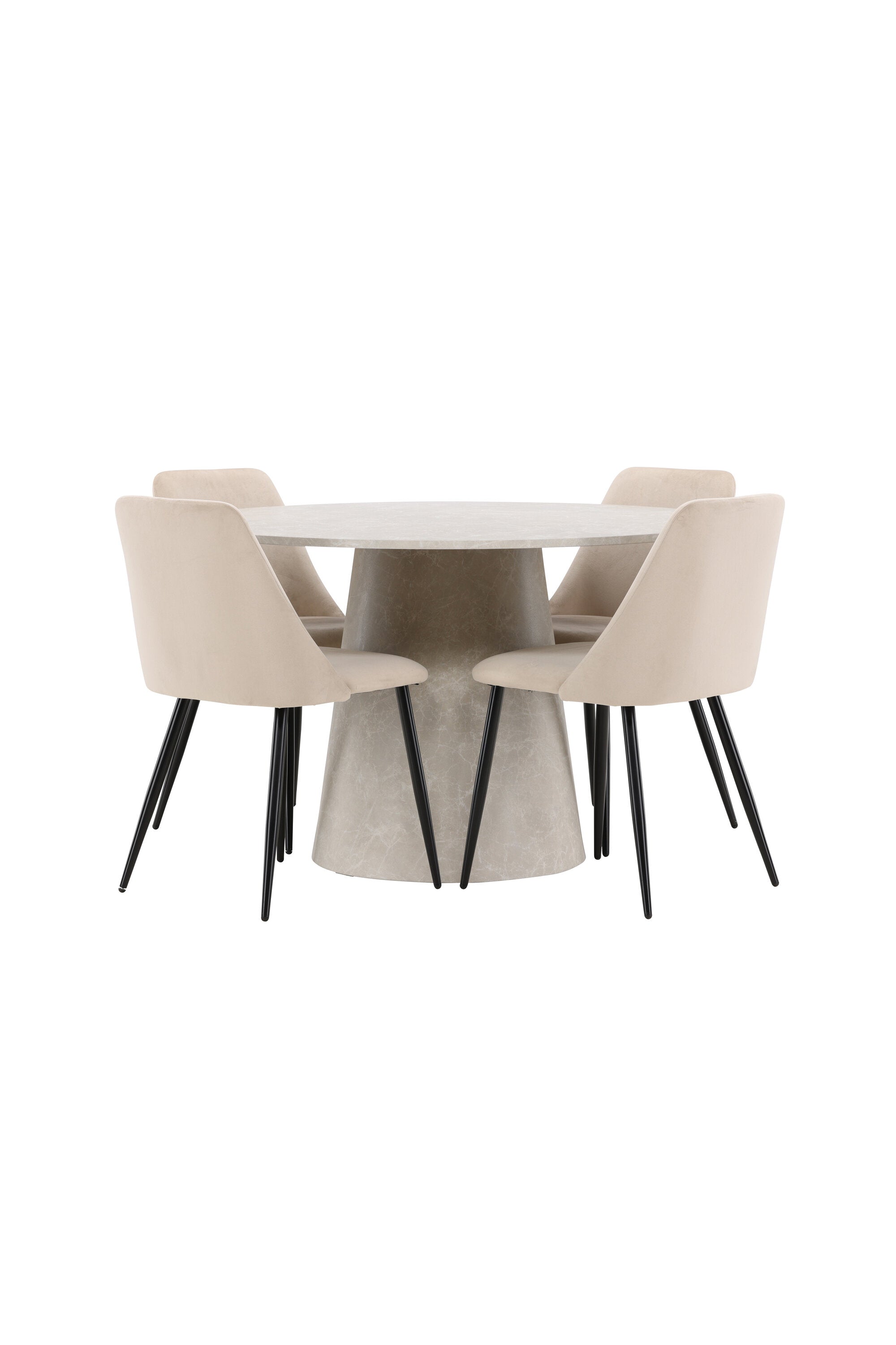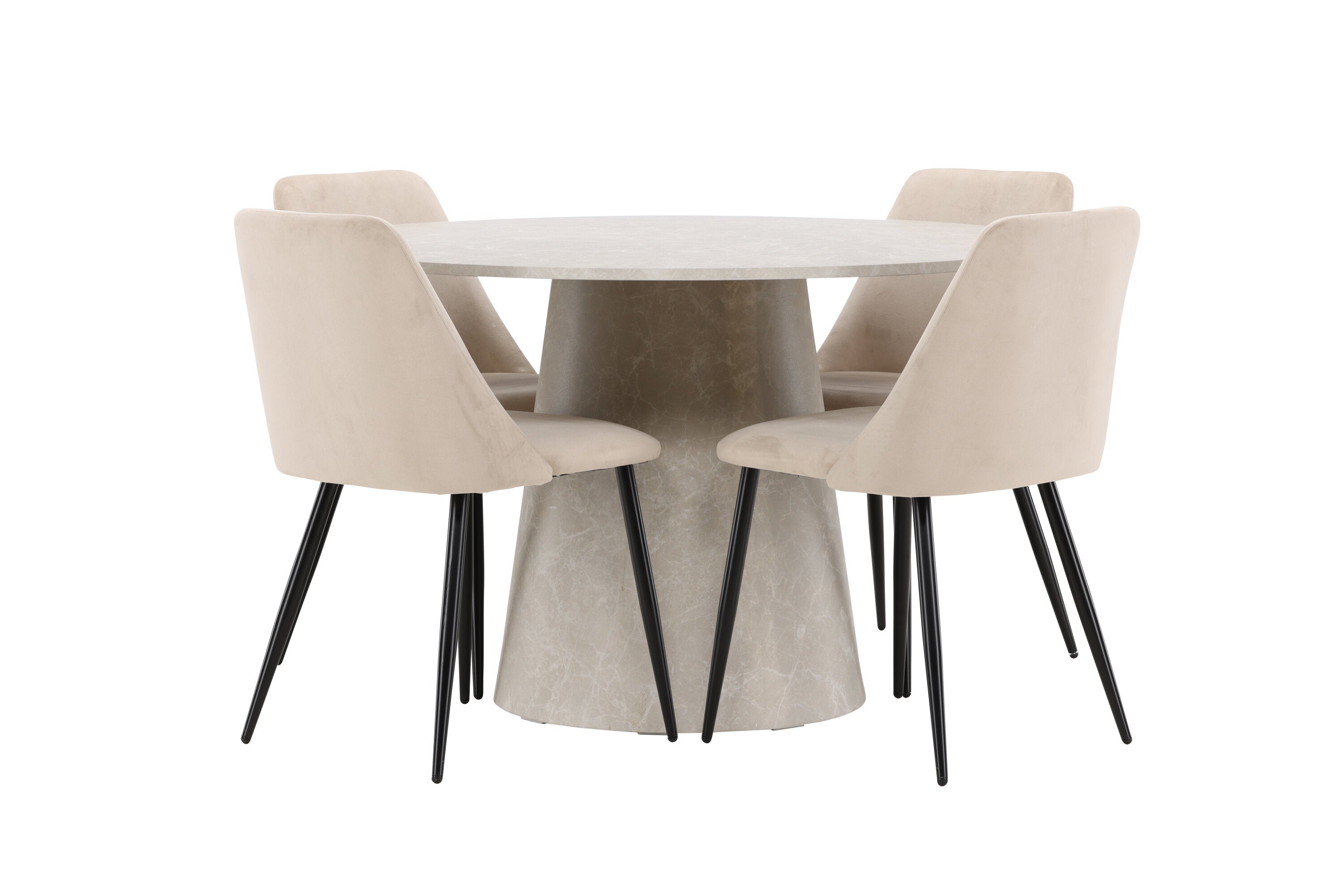 Jídelní stůl Lanzo nabízí sofistikovaný a exkluzivní pocit s úžasným béžovým mramorovaným povrchem, který napodobuje nadčasovou krásu přírodního kamene. Stůl je ideální pro moderní i klasické interiéry a vytváří příjemnou atmosféru pro každé jídlo. Jeho kulatý tvar podporuje spojení, takže se všichni sedící mohou snadno zapojit do konverzace a společenských aktivit. Lanzo je stejně praktické jako krásné a vyznačuje se hladkým povrchem, který se snadno čistí – ideální pro každodenní použití a slavnostní setkání.