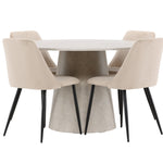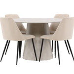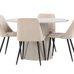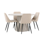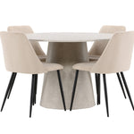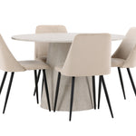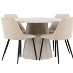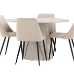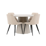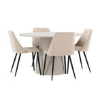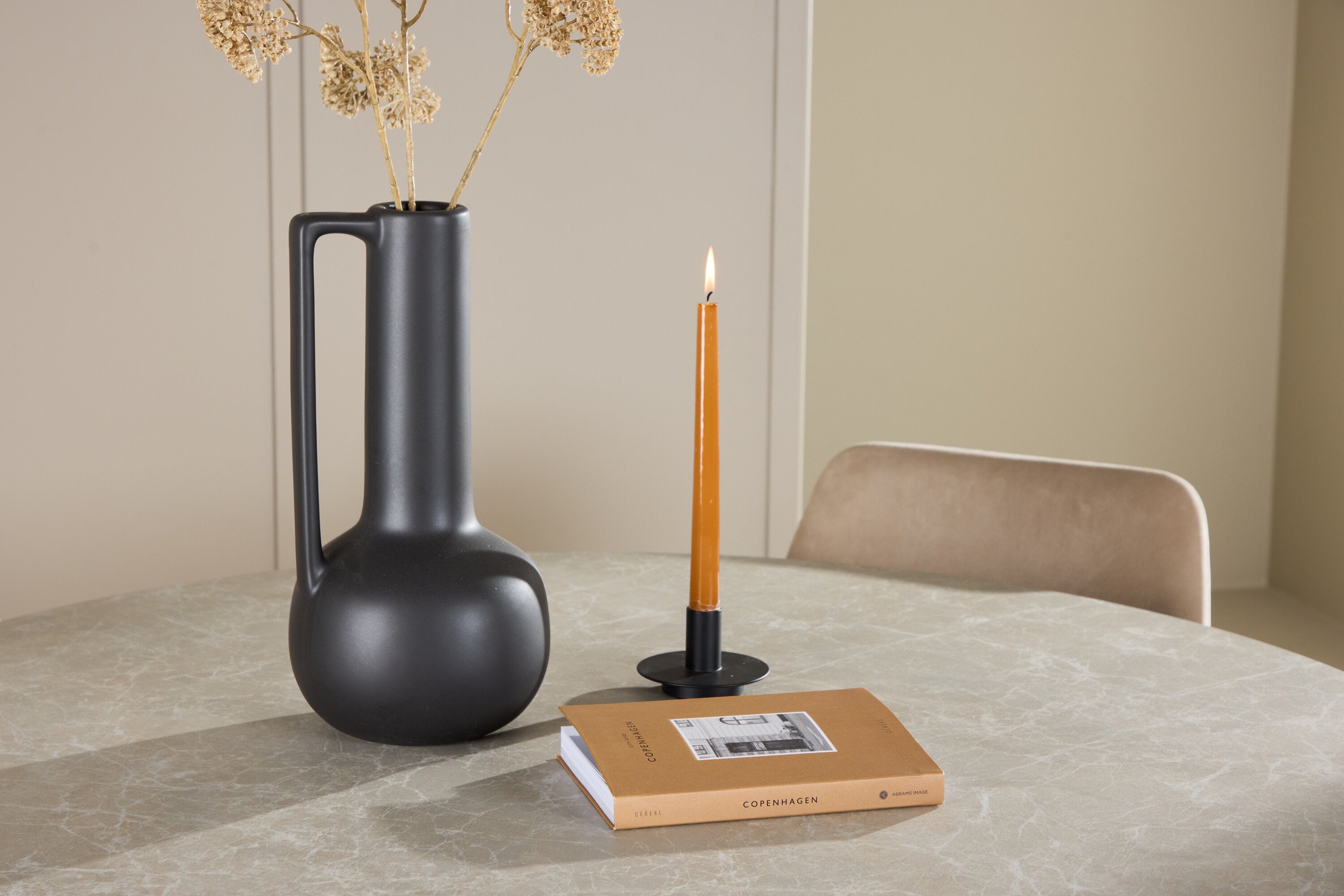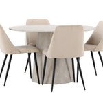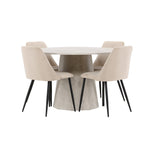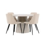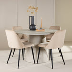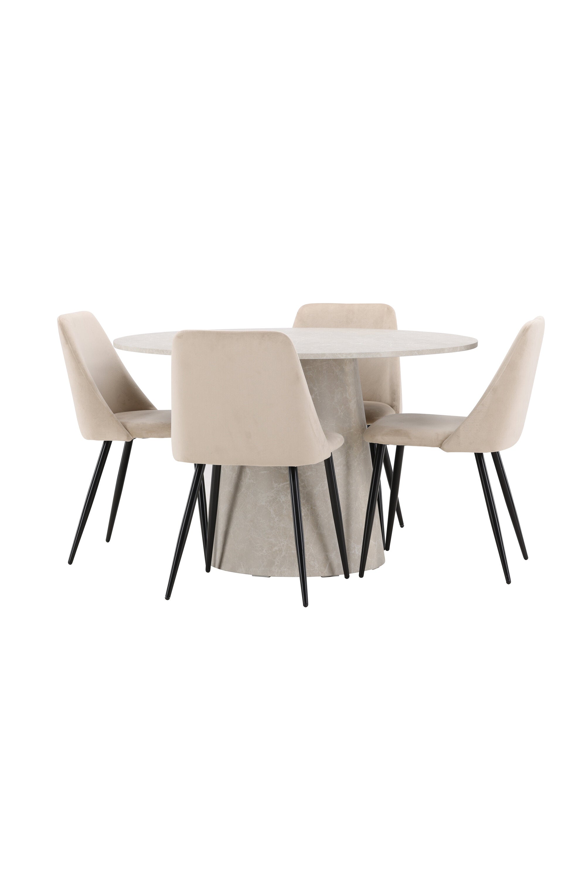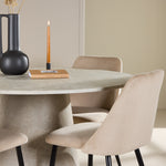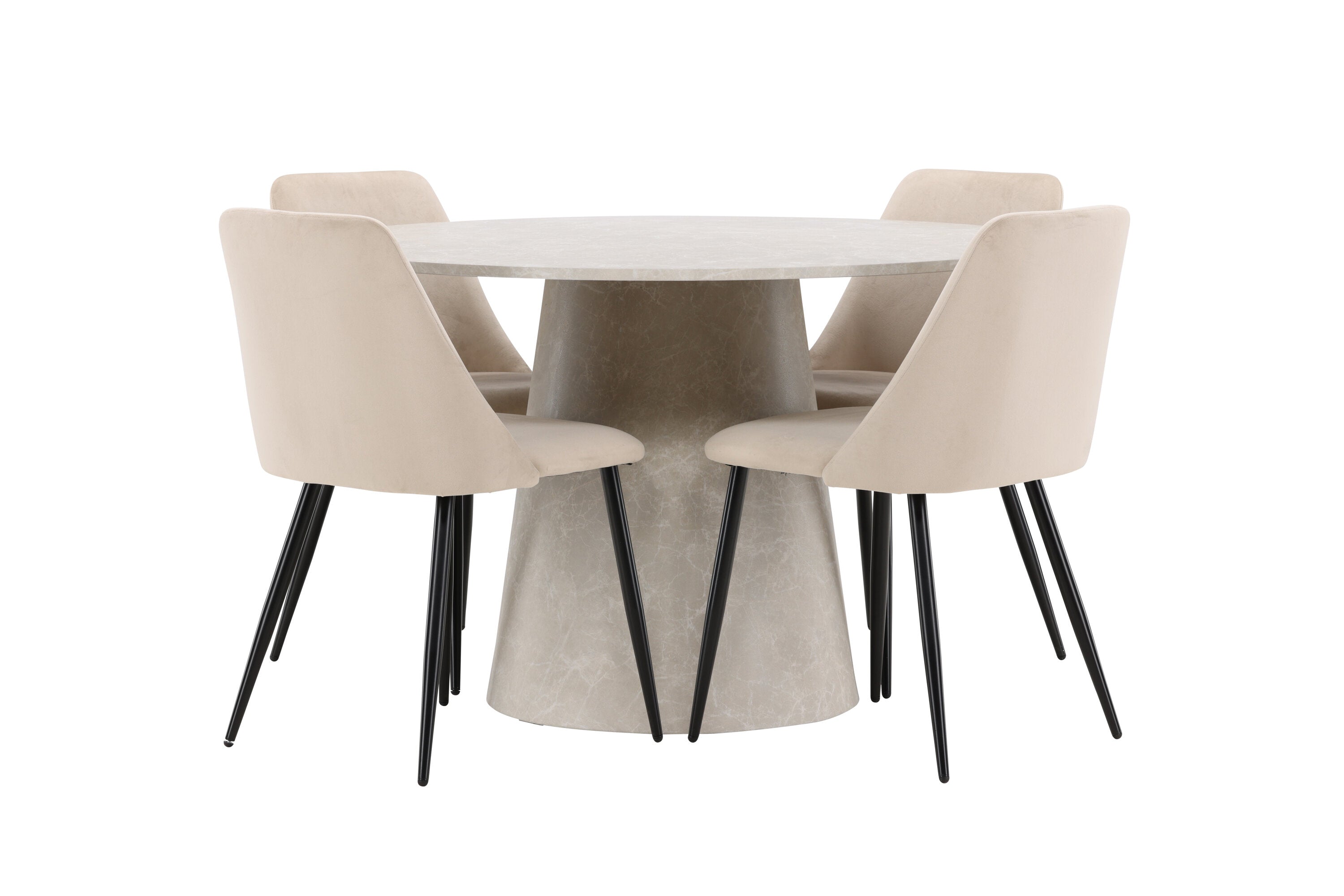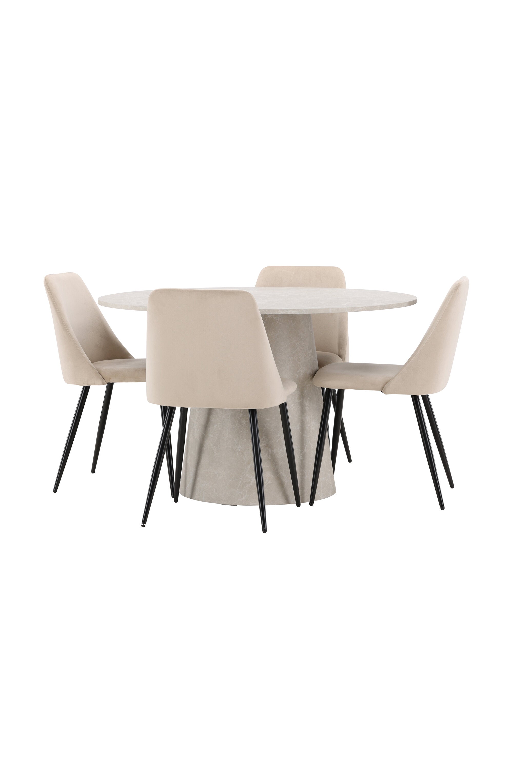 Jídelní stůl Lanzo nabízí sofistikovaný a exkluzivní pocit s úžasným béžovým mramorovaným povrchem, který napodobuje nadčasovou krásu přírodního kamene. Stůl je ideální pro moderní i klasické interiéry a vytváří příjemnou atmosféru pro každé jídlo. Jeho kulatý tvar podporuje spojení, takže se všichni sedící mohou snadno zapojit do konverzace a společenských aktivit. Lanzo je stejně praktické jako krásné a vyznačuje se hladkým povrchem, který se snadno čistí – ideální pro každodenní použití a slavnostní setkání.
