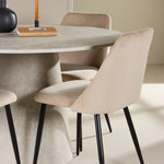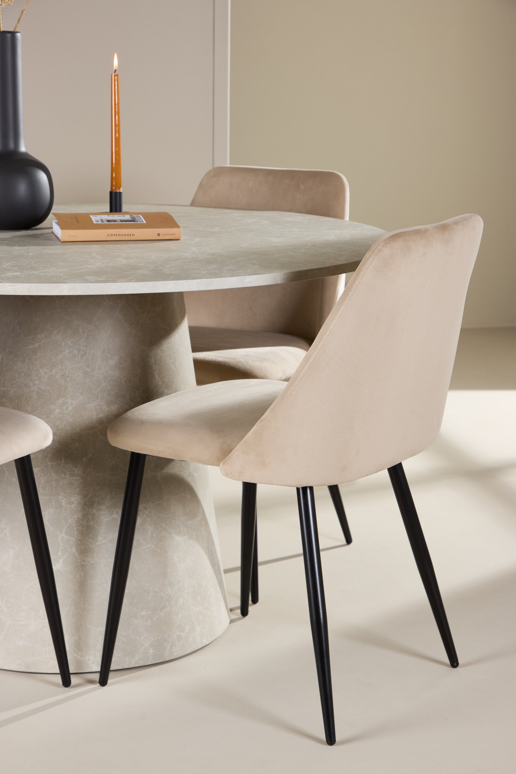Stůl doplňuje jídelní židle Night, elegantní a pohodlný doplněk, který do vašeho jídelního prostoru vnese dotek sofistikovanosti. Židle, čalouněná měkkým béžovým sametem, poskytuje příjemný zážitek ze sezení, zatímco černé nohy vytvářejí výrazný kontrast oproti světlému sedadlu. Ergonomicky navržený Night nabízí vynikající podporu zad, takže je ideální pro dlouhé večeře. Kombinace luxusního sametu a elegantních černých nohou dodává židli vyvážený a moderní vzhled, který umocní eleganci vašeho interiéru.