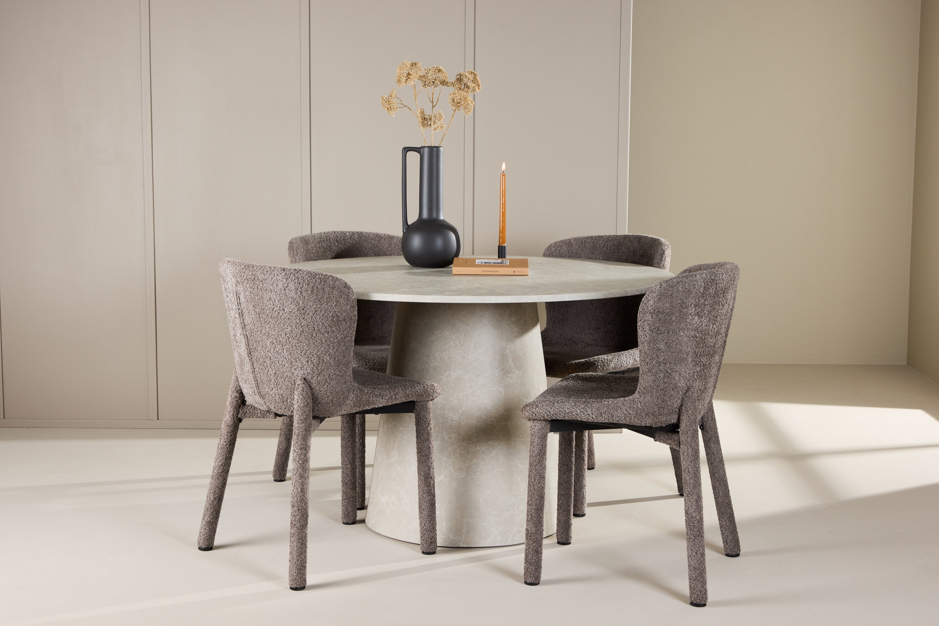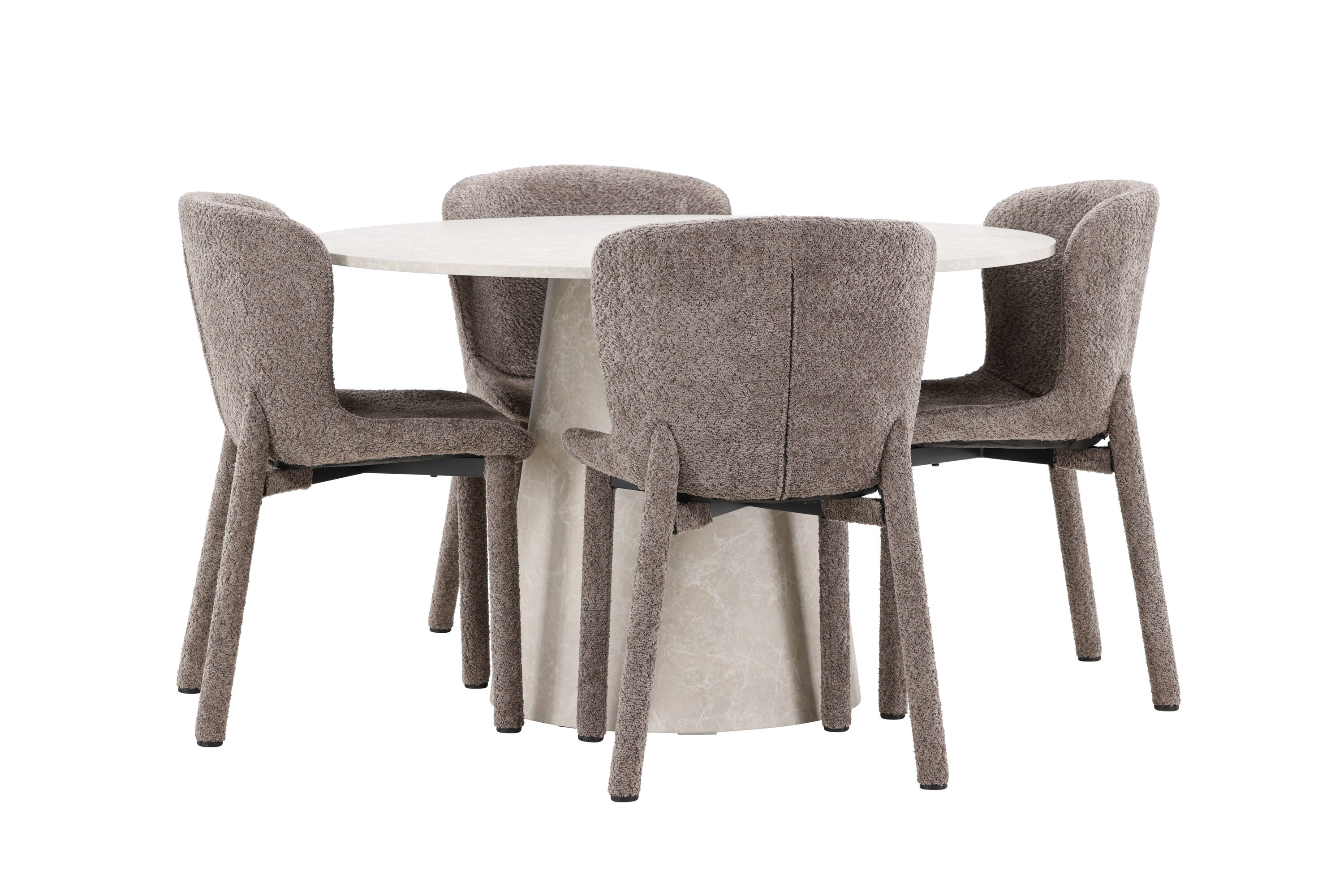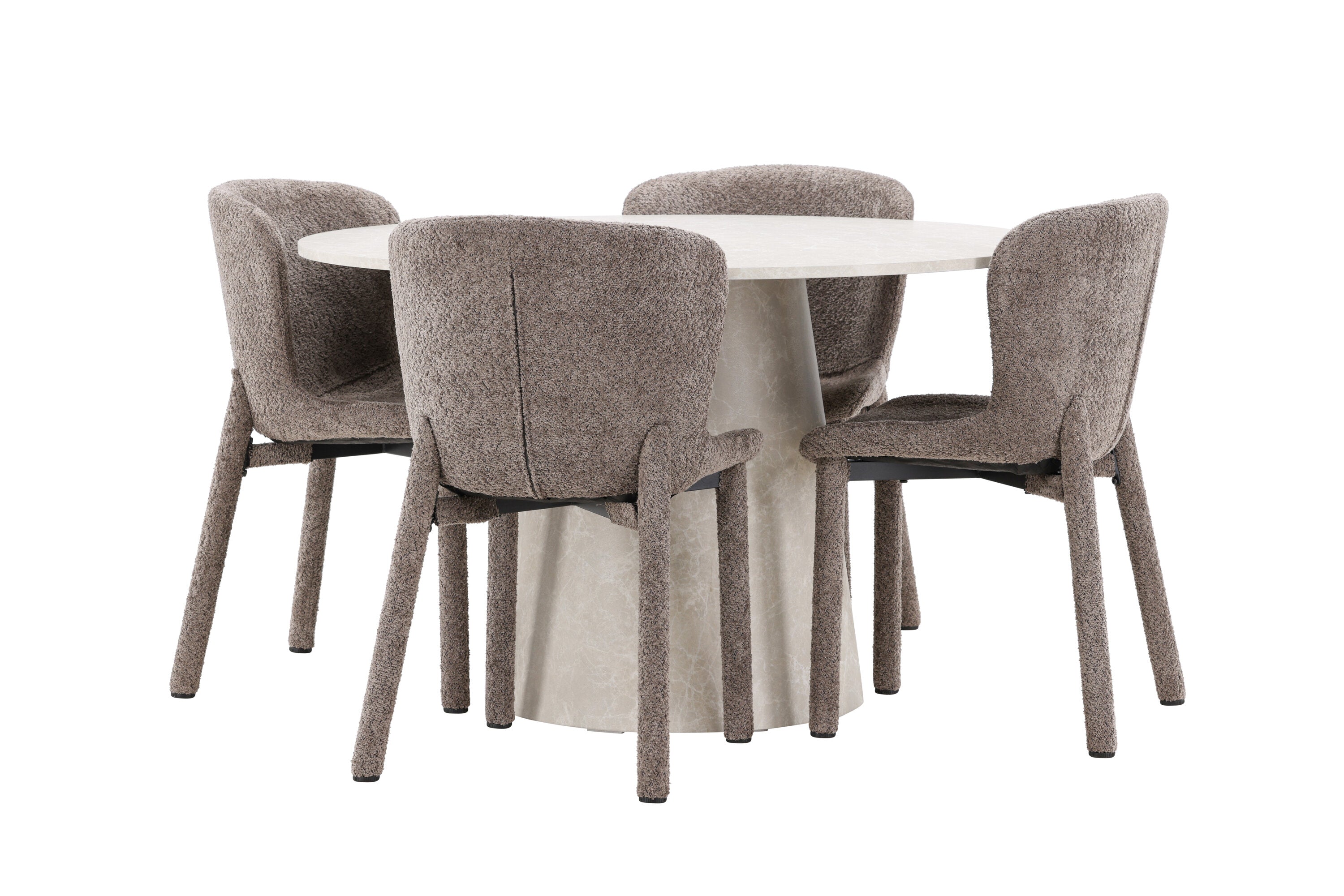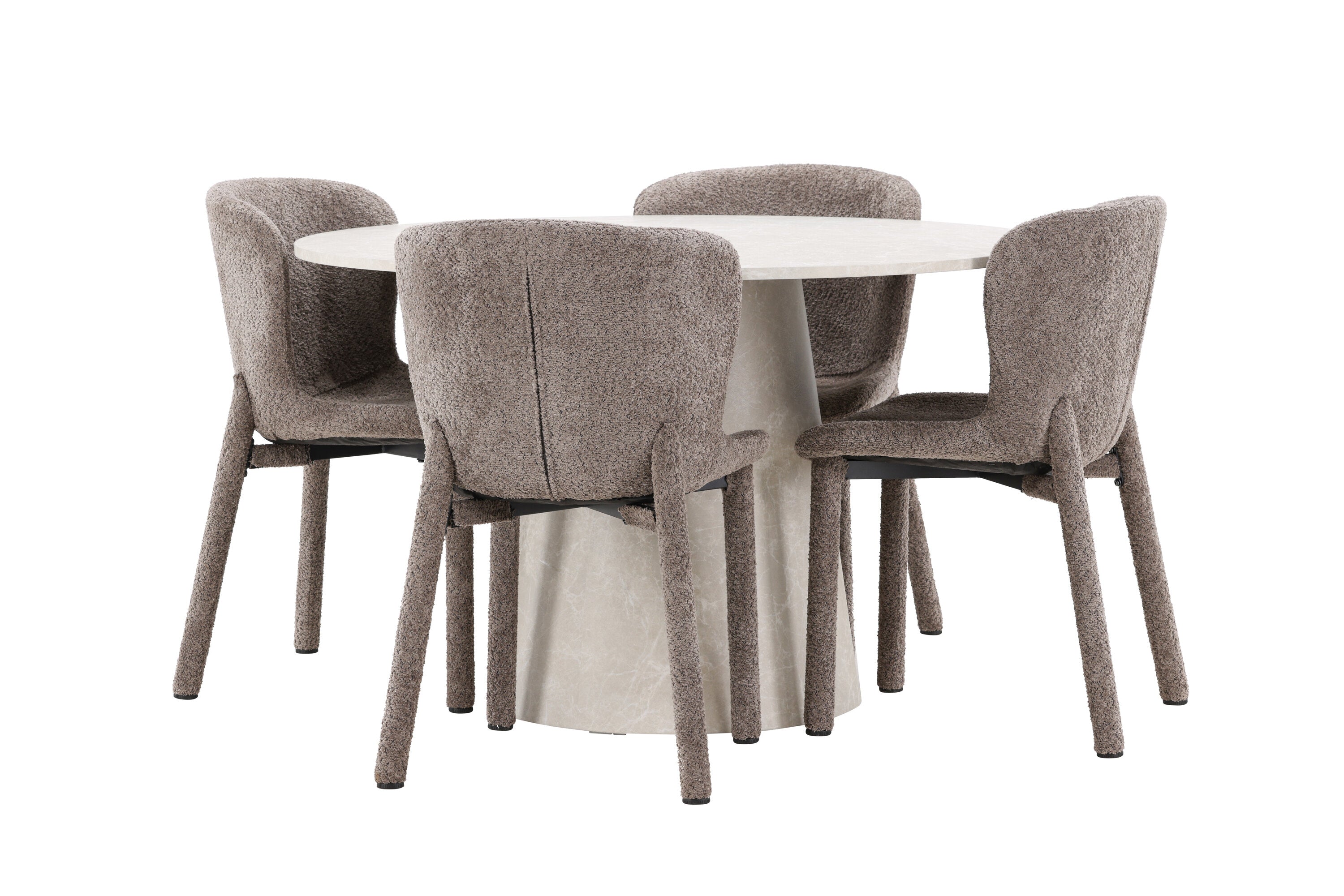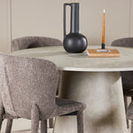 Ke stolu se hodí jídelní židle Astoria, čalouněná elegantním hnědým buklé. Z křesla vyzařuje teplo a příjemný pocit s měkkou texturou buclé, která dodává nádech luxusu. Bohaté barvy a složitá textura činí z Astoria pozoruhodný prvek v moderním i klasickém prostředí. Židle byla navržena s ohledem na ergonomii a má obepínající opěradlo a pohodlné polstrované sedadlo, takže je ideální pro dlouhé, relaxační večeře.