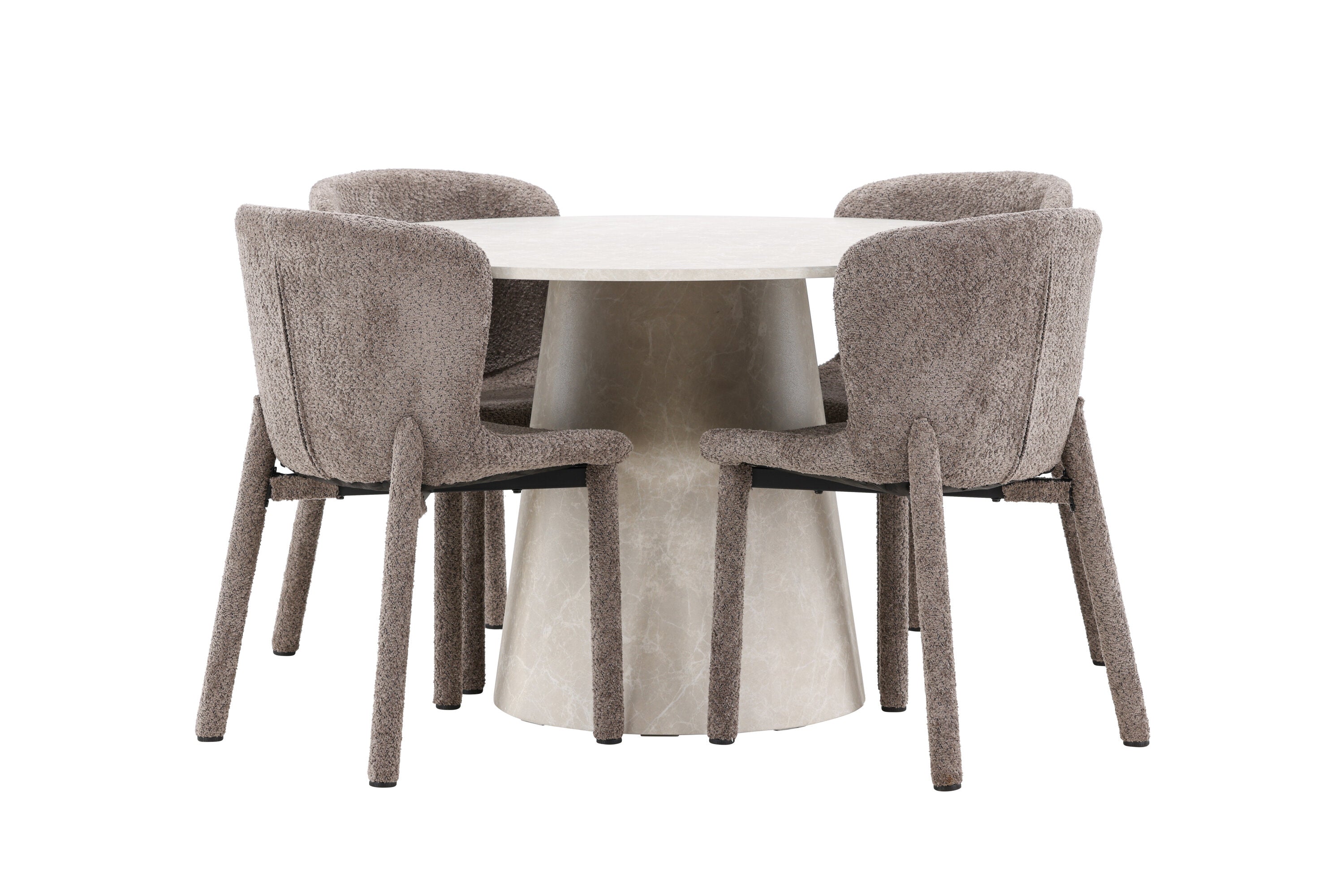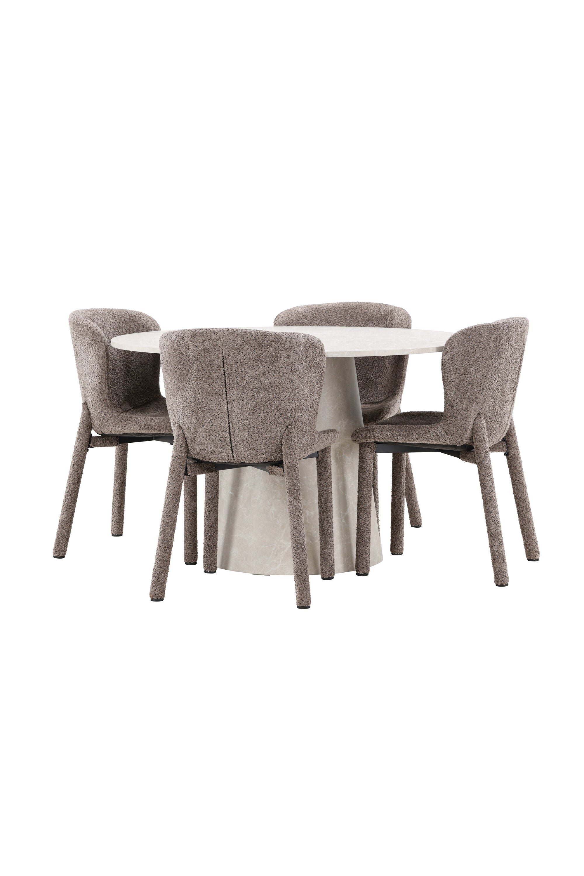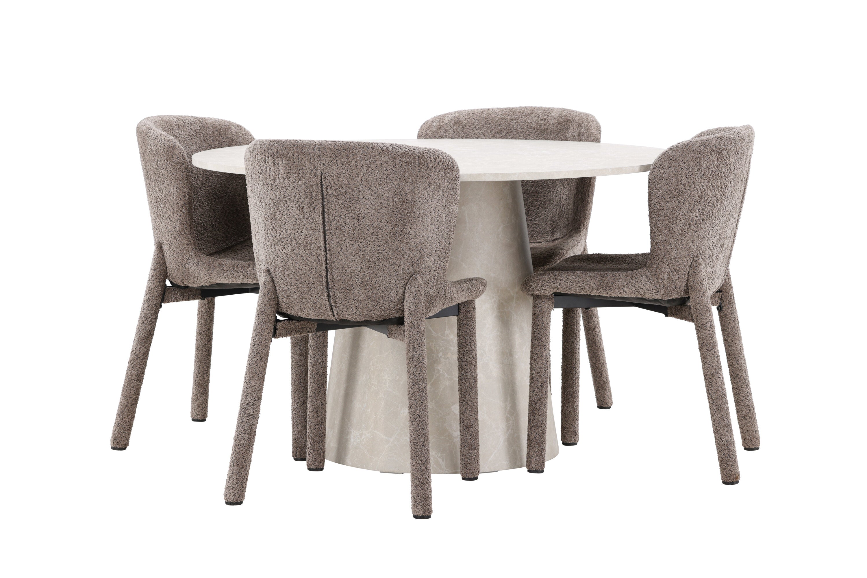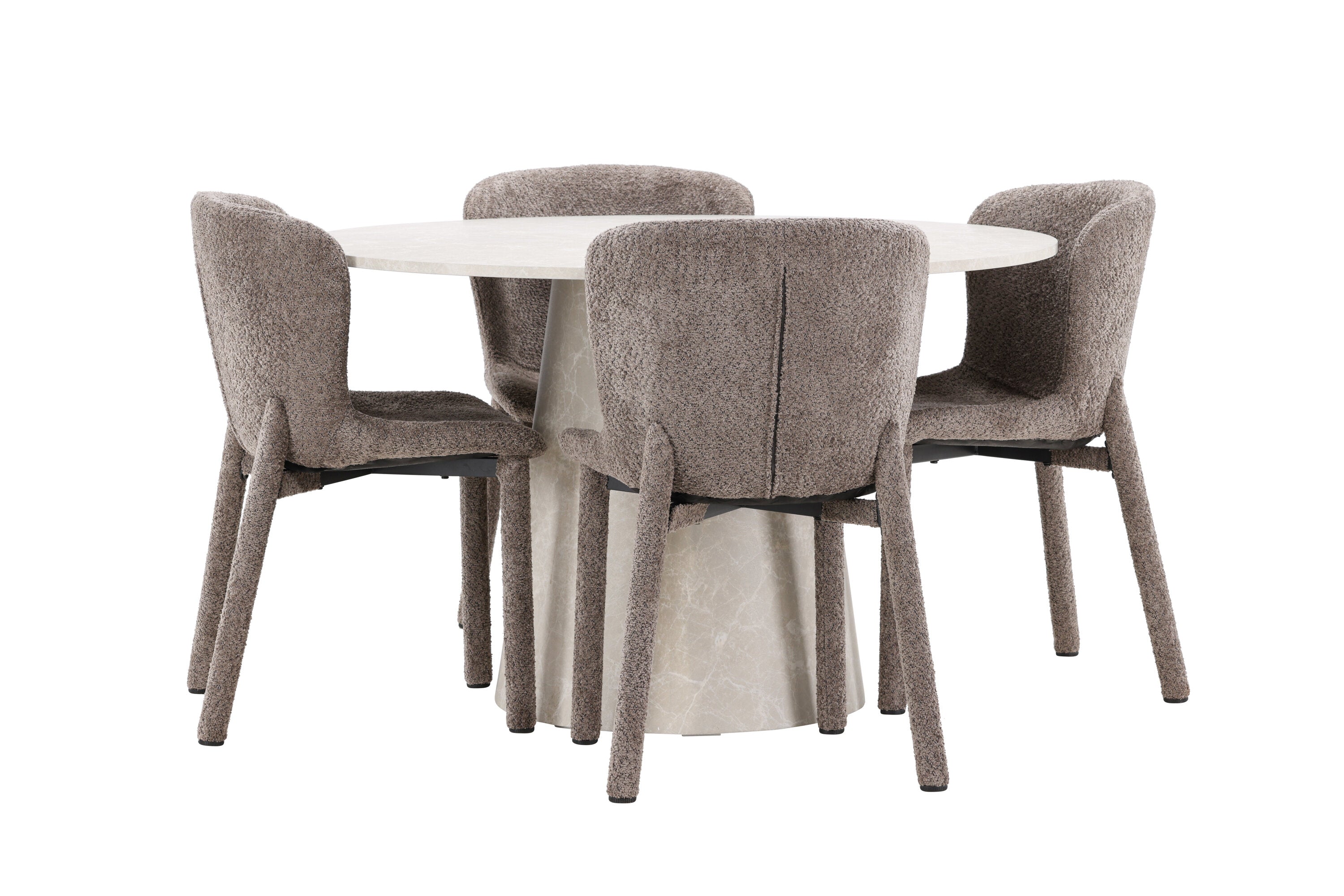 Ke stolu se hodí jídelní židle Astoria, čalouněná elegantním hnědým buklé. Z křesla vyzařuje teplo a příjemný pocit s měkkou texturou buclé, která dodává nádech luxusu. Bohaté barvy a složitá textura činí z Astoria pozoruhodný prvek v moderním i klasickém prostředí. Židle byla navržena s ohledem na ergonomii a má obepínající opěradlo a pohodlné polstrované sedadlo, takže je ideální pro dlouhé, relaxační večeře.
