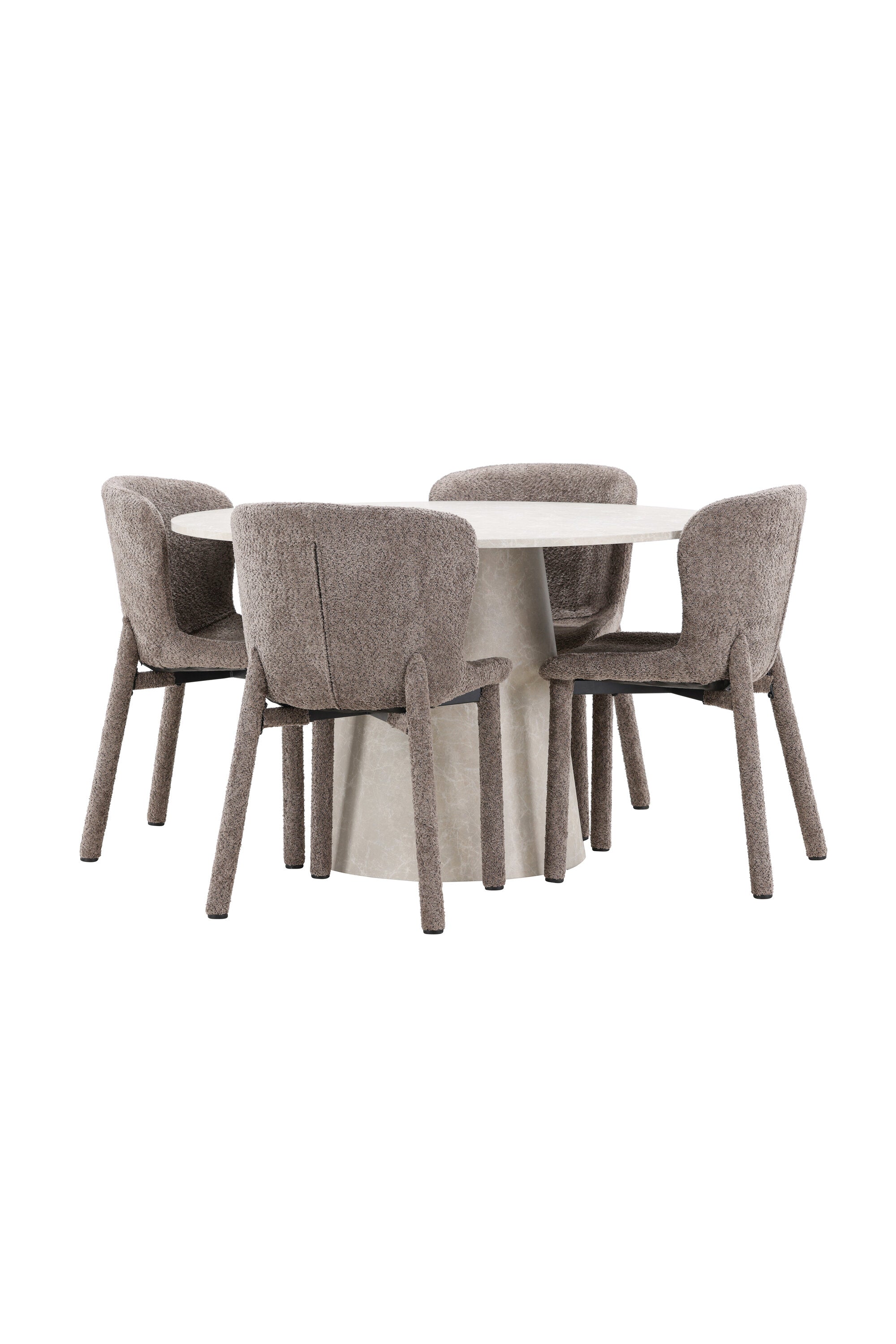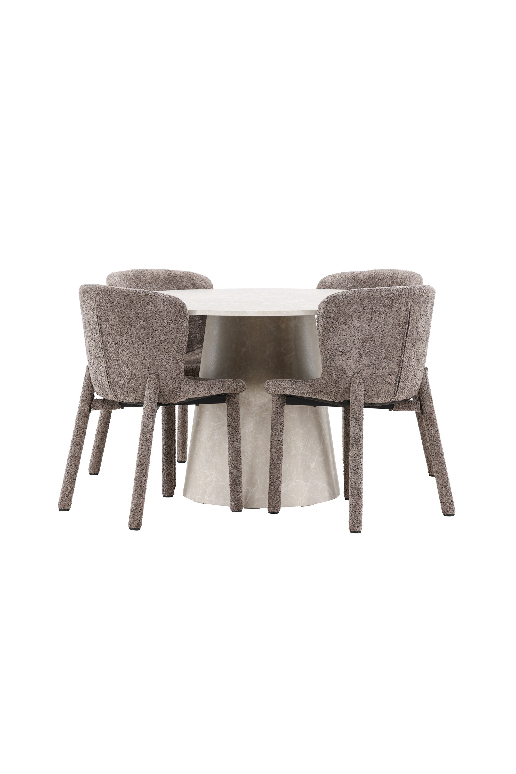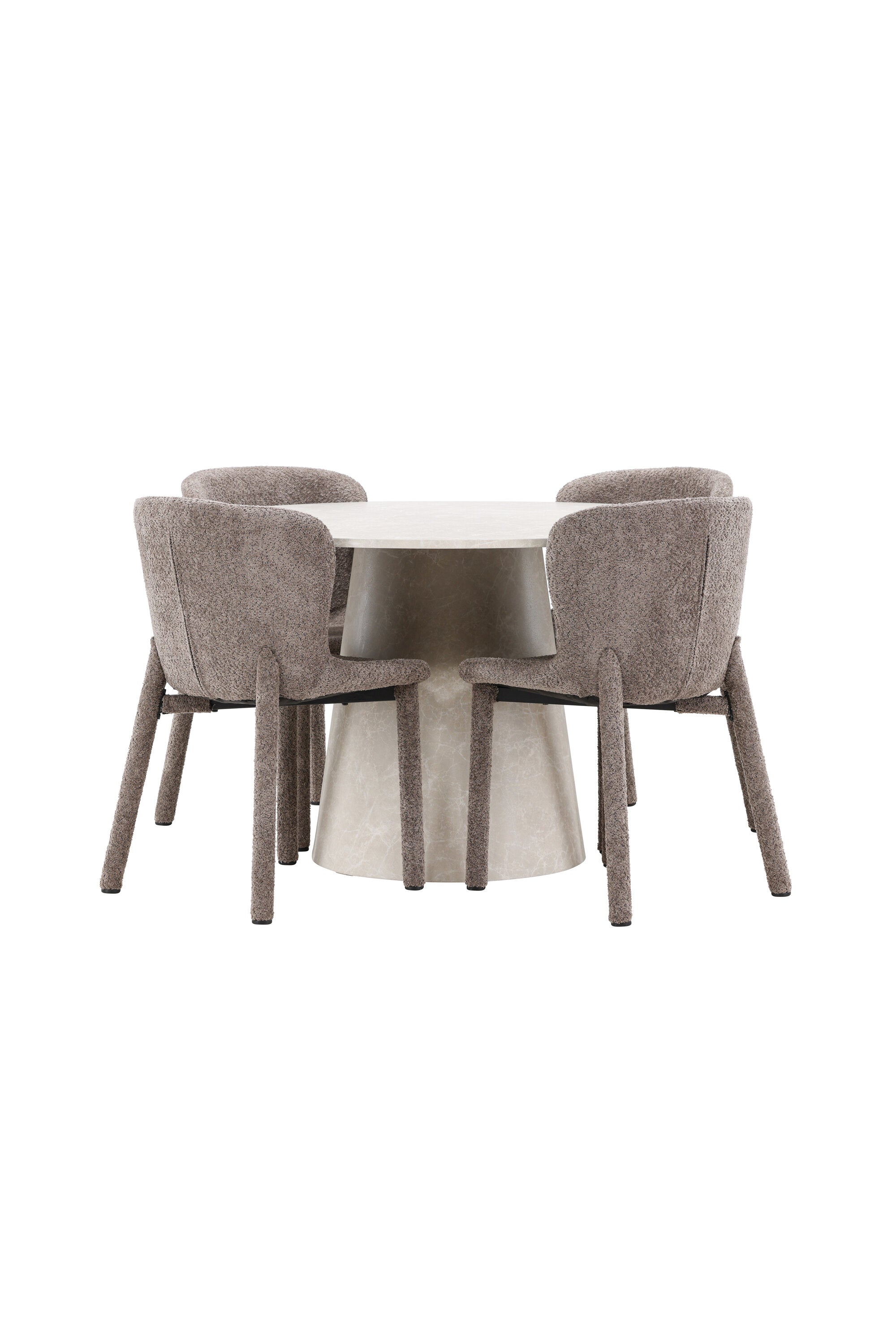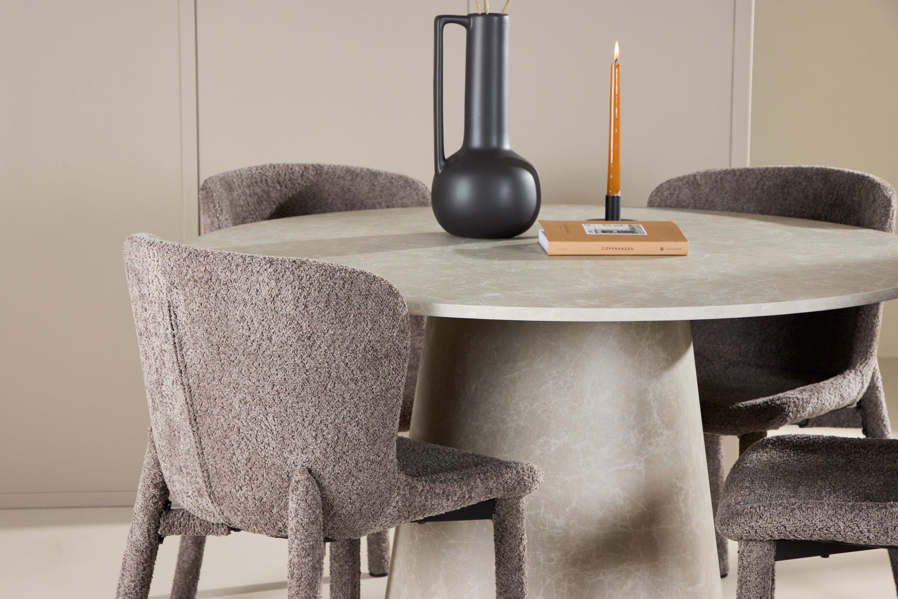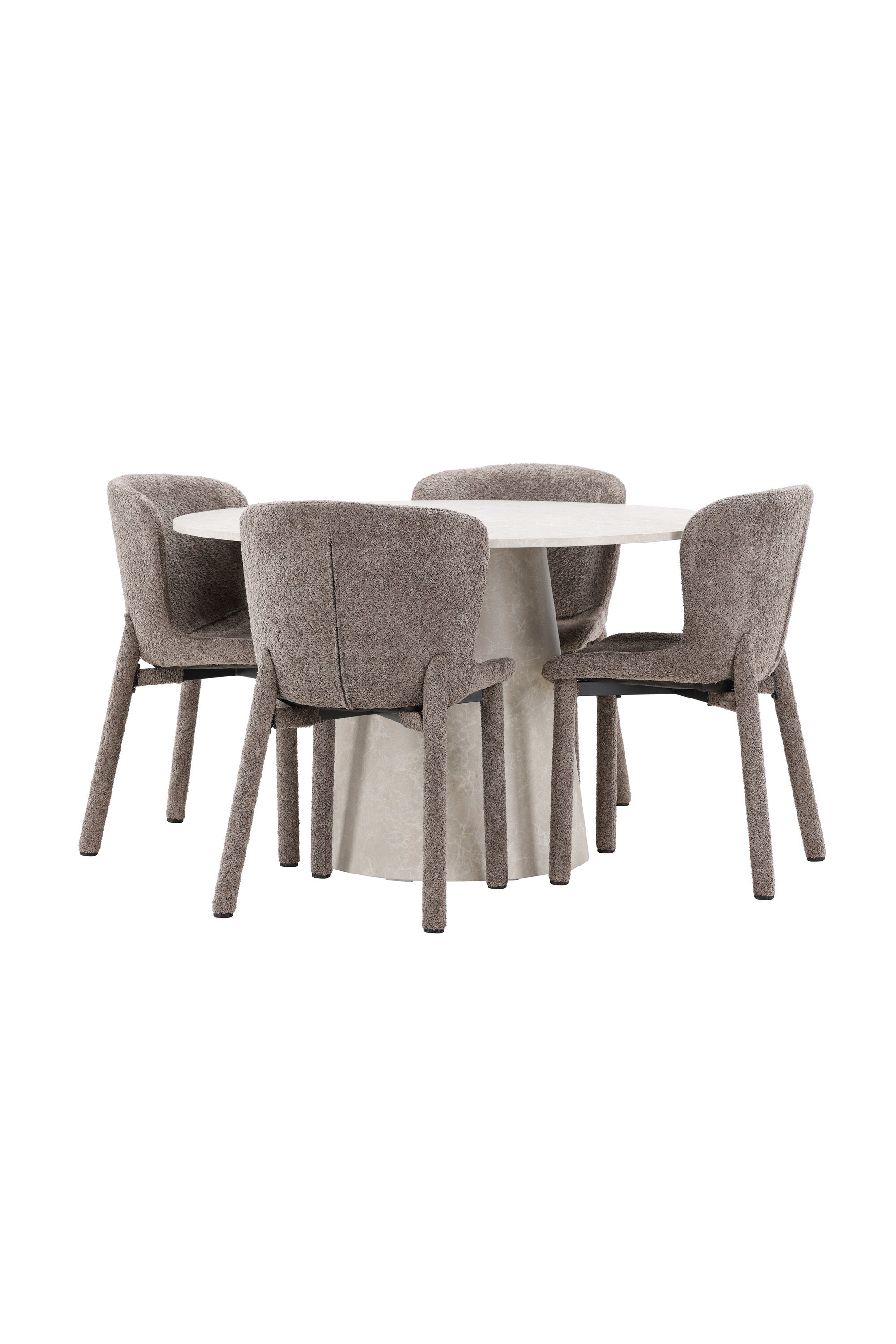 Lanzo a Astoria společně vytvářejí harmonický a stylový jídelní prostor, který pozvedne každé jídlo a setkání. Se svým elegantním mramorovým povrchem a luxusním buclé přináší tato sada do vašeho domova sofistikovanou a přívětivou atmosféru.