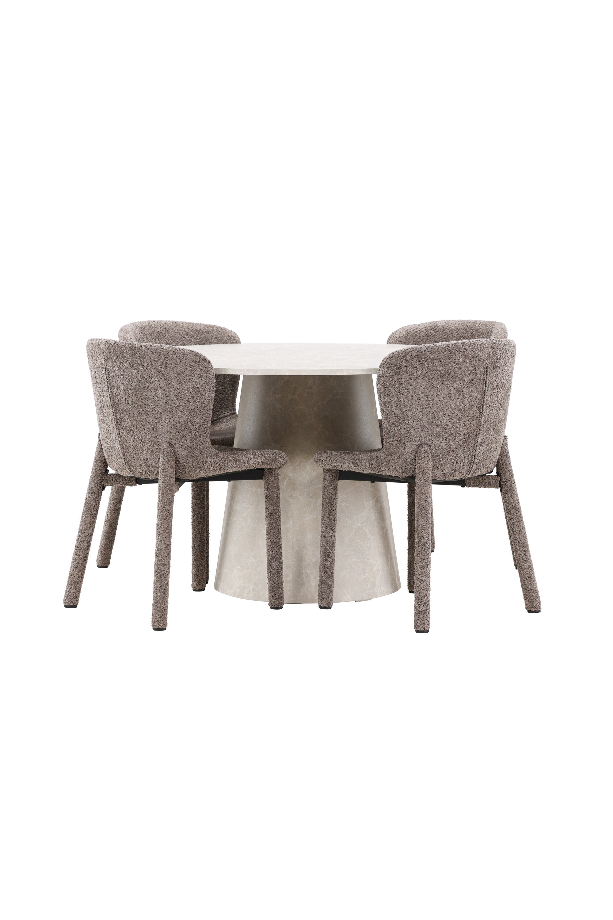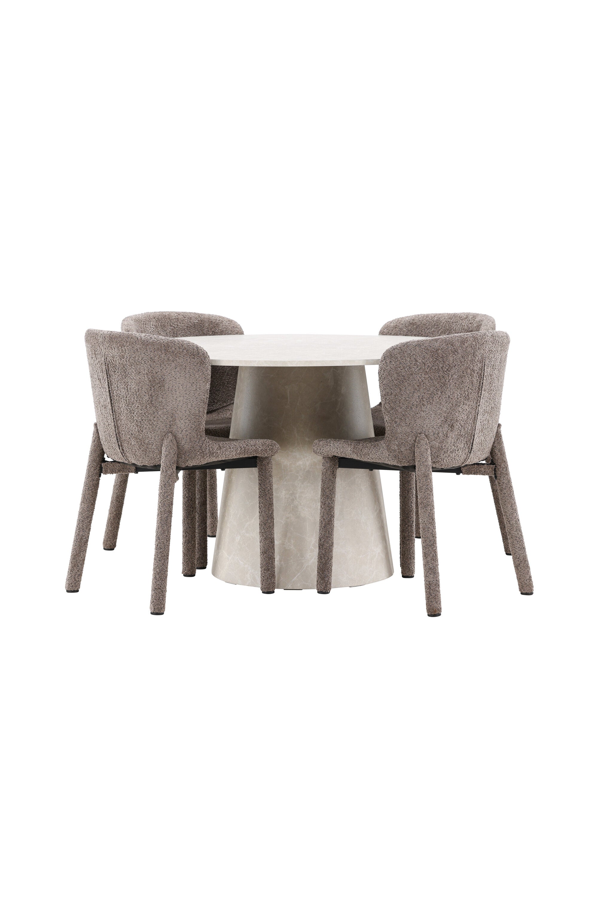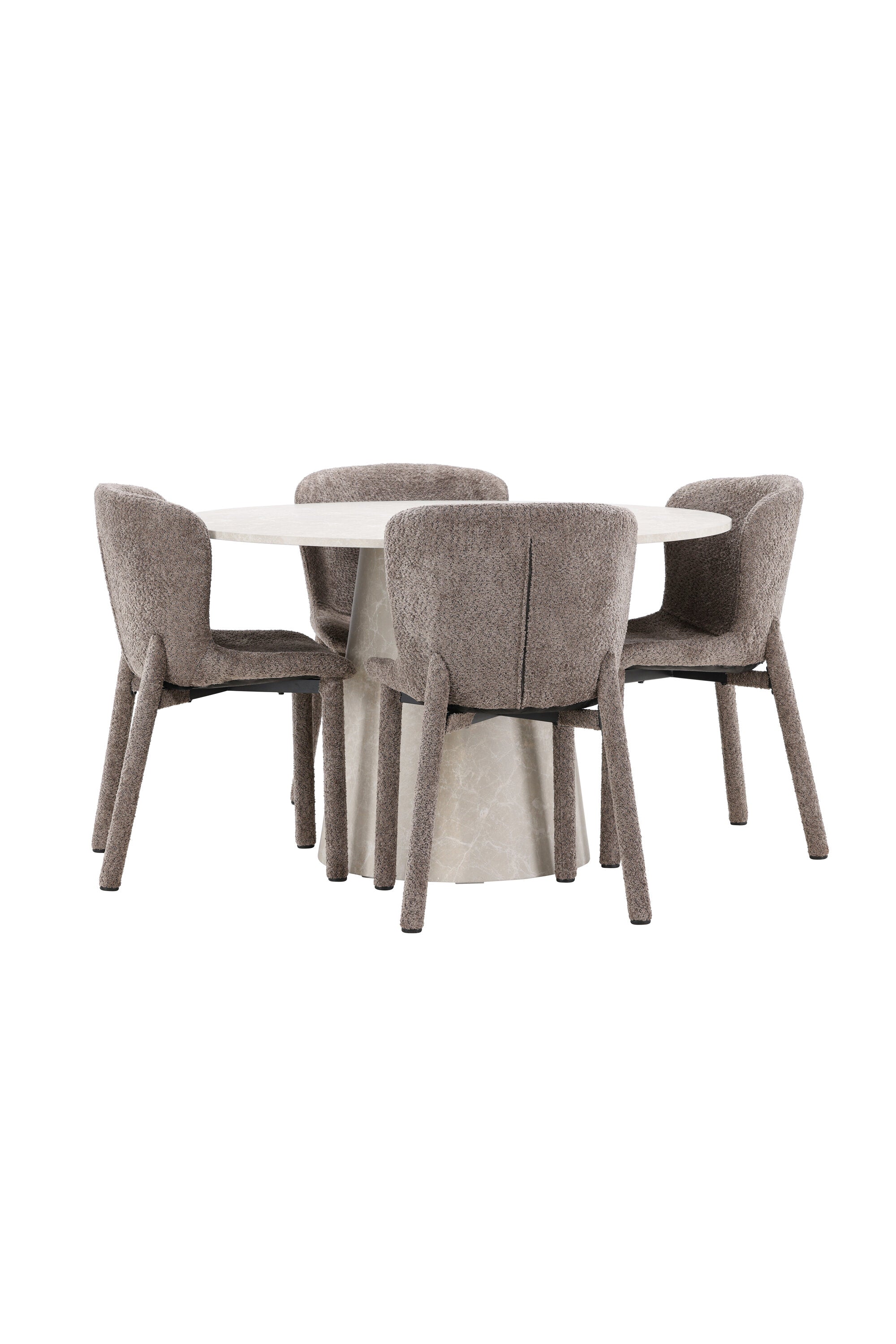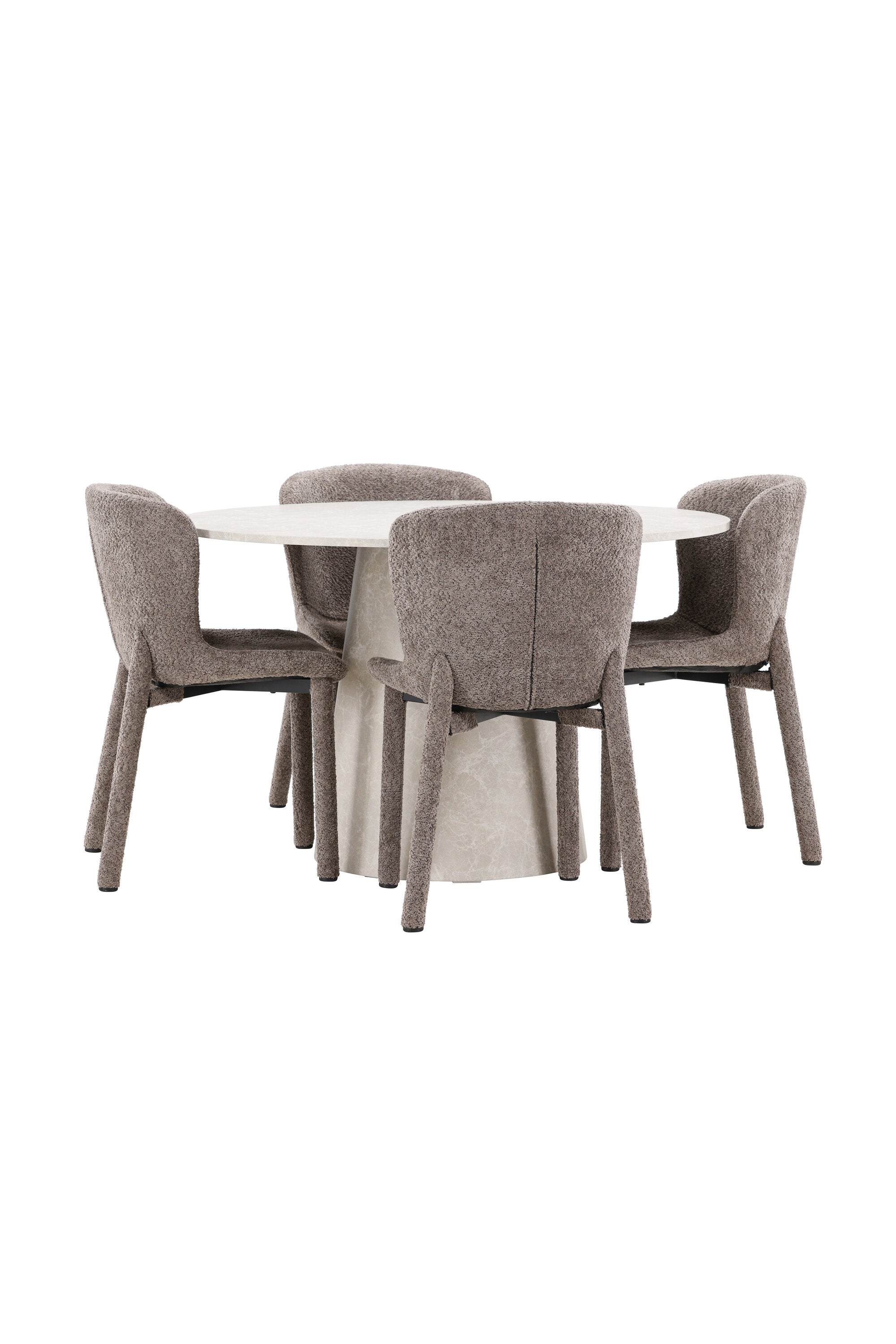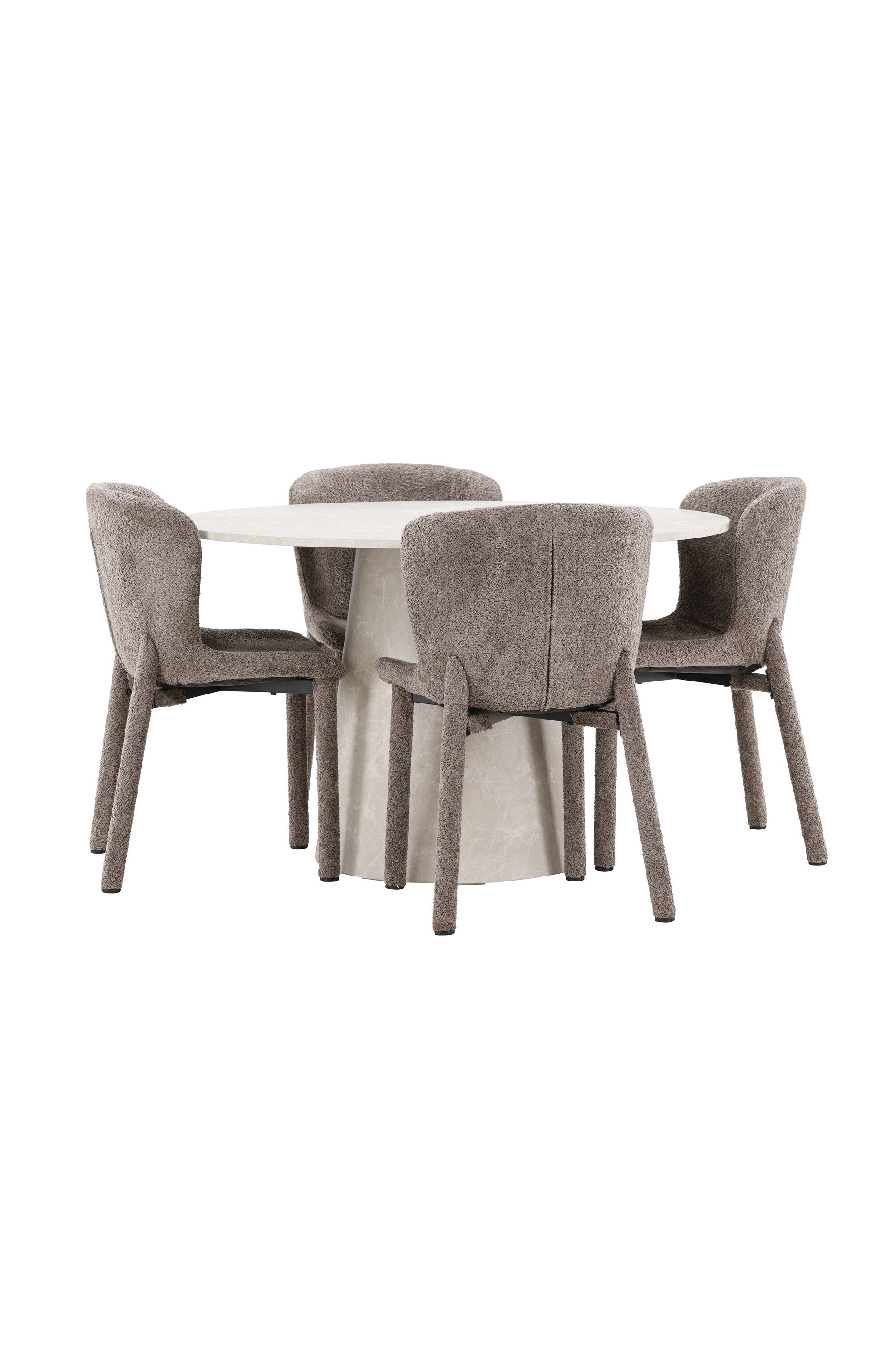 Lanzo a Astoria společně vytvářejí harmonický a stylový jídelní prostor, který pozvedne každé jídlo a setkání. Se svým elegantním mramorovým povrchem a luxusním buclé přináší tato sada do vašeho domova sofistikovanou a přívětivou atmosféru.
