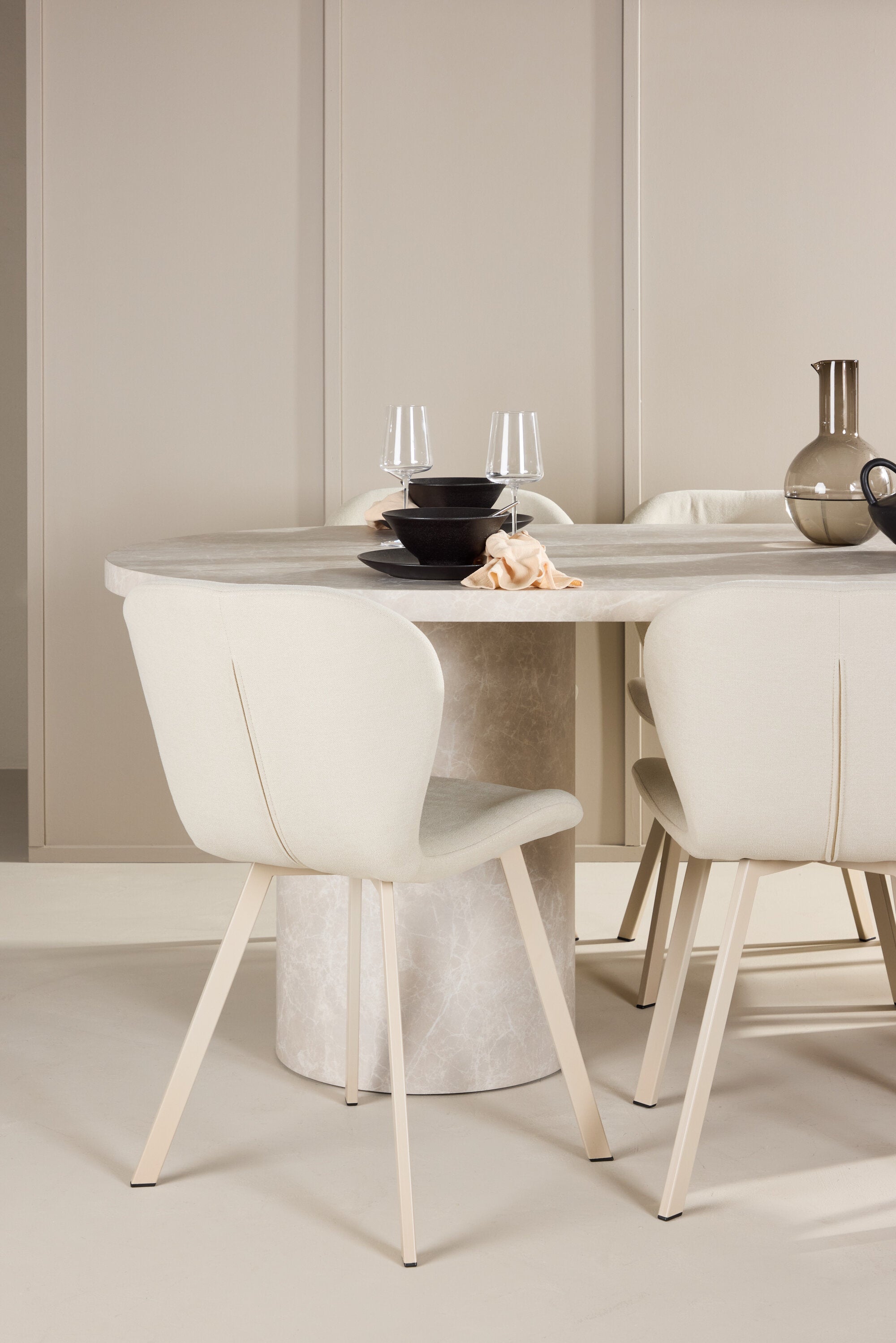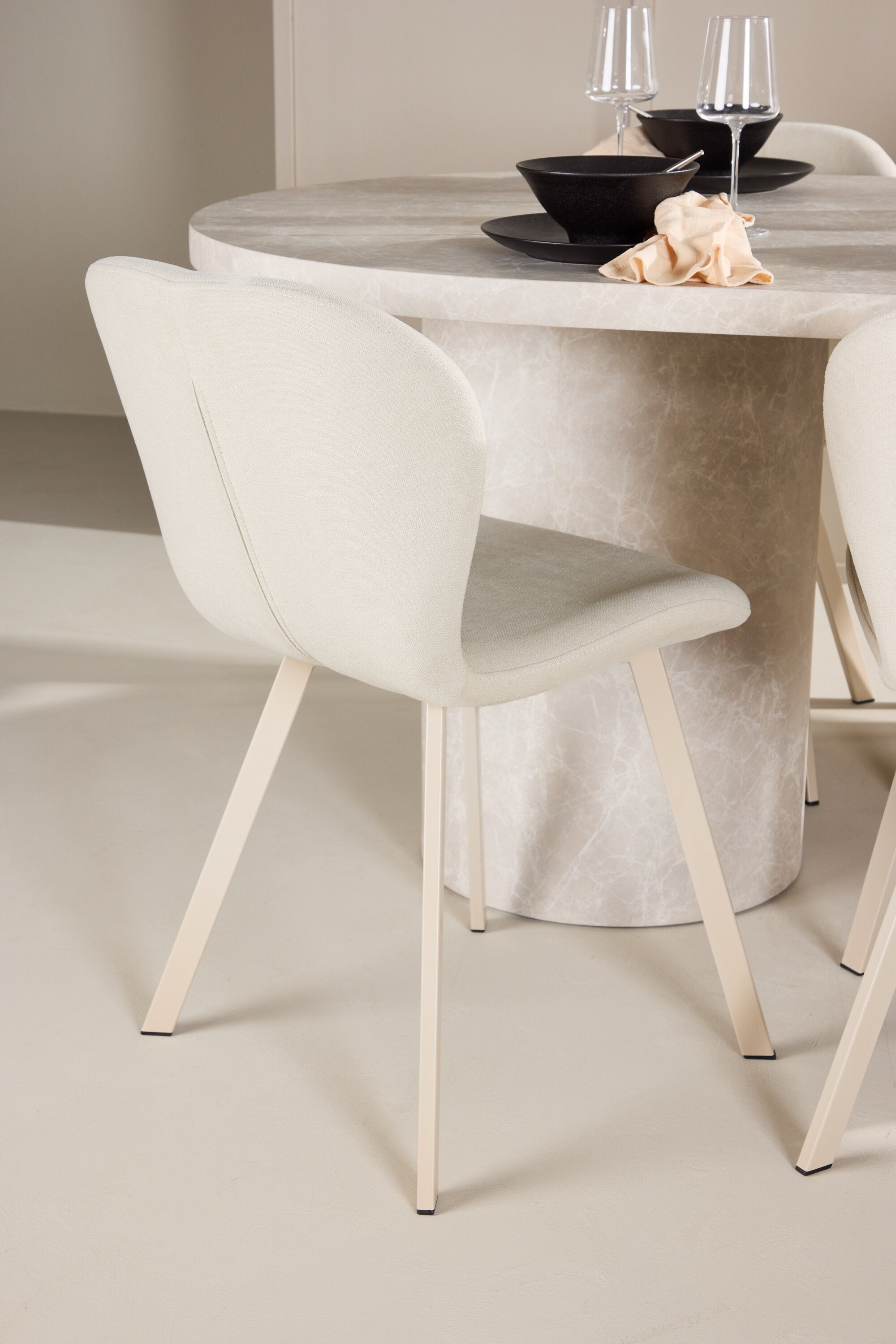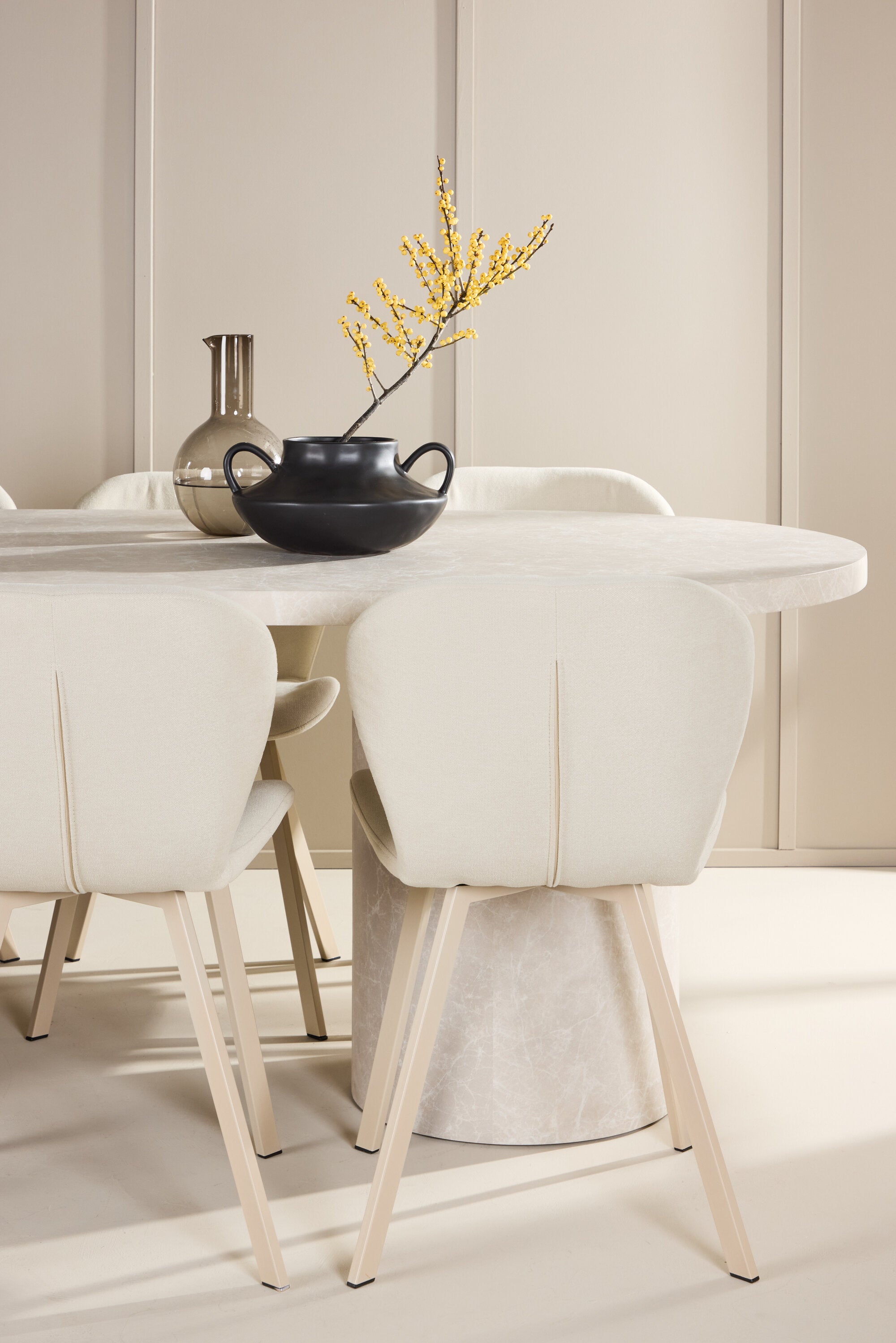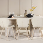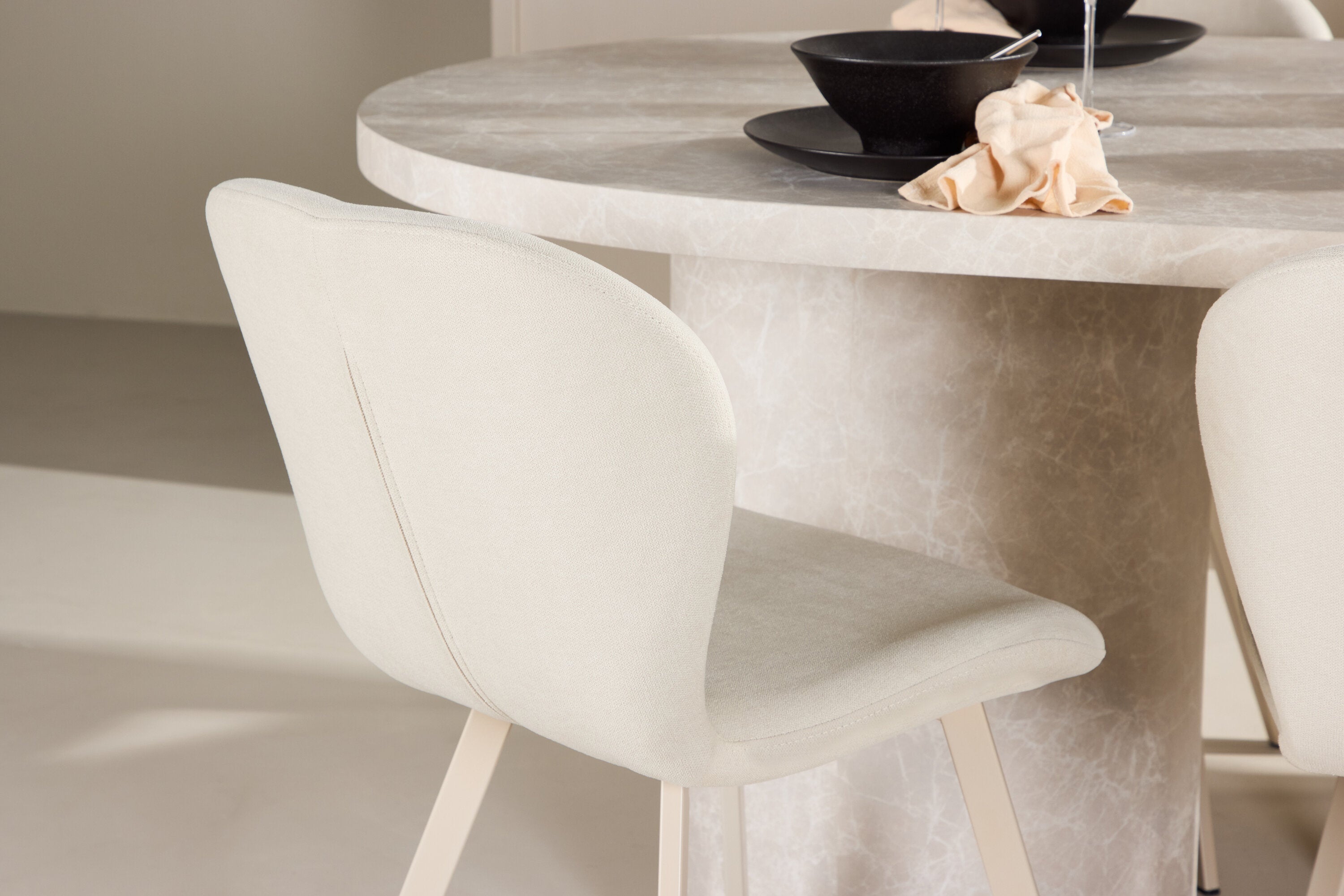 Ke stolu se hodí jídelní židle Lilja, navržená tak, aby svým měkkým béžovým čalouněním dodala teplo a příjemný pocit. Díky neutrální barvě je židle univerzální a lze ji snadno spárovat s různými styly dekorů. Ergonomicky navržená pro pohodlí, Lilja má podpůrné opěradlo a velkoryse polstrované sedadlo, které zajišťuje pohodlný zážitek během dlouhých jídel.