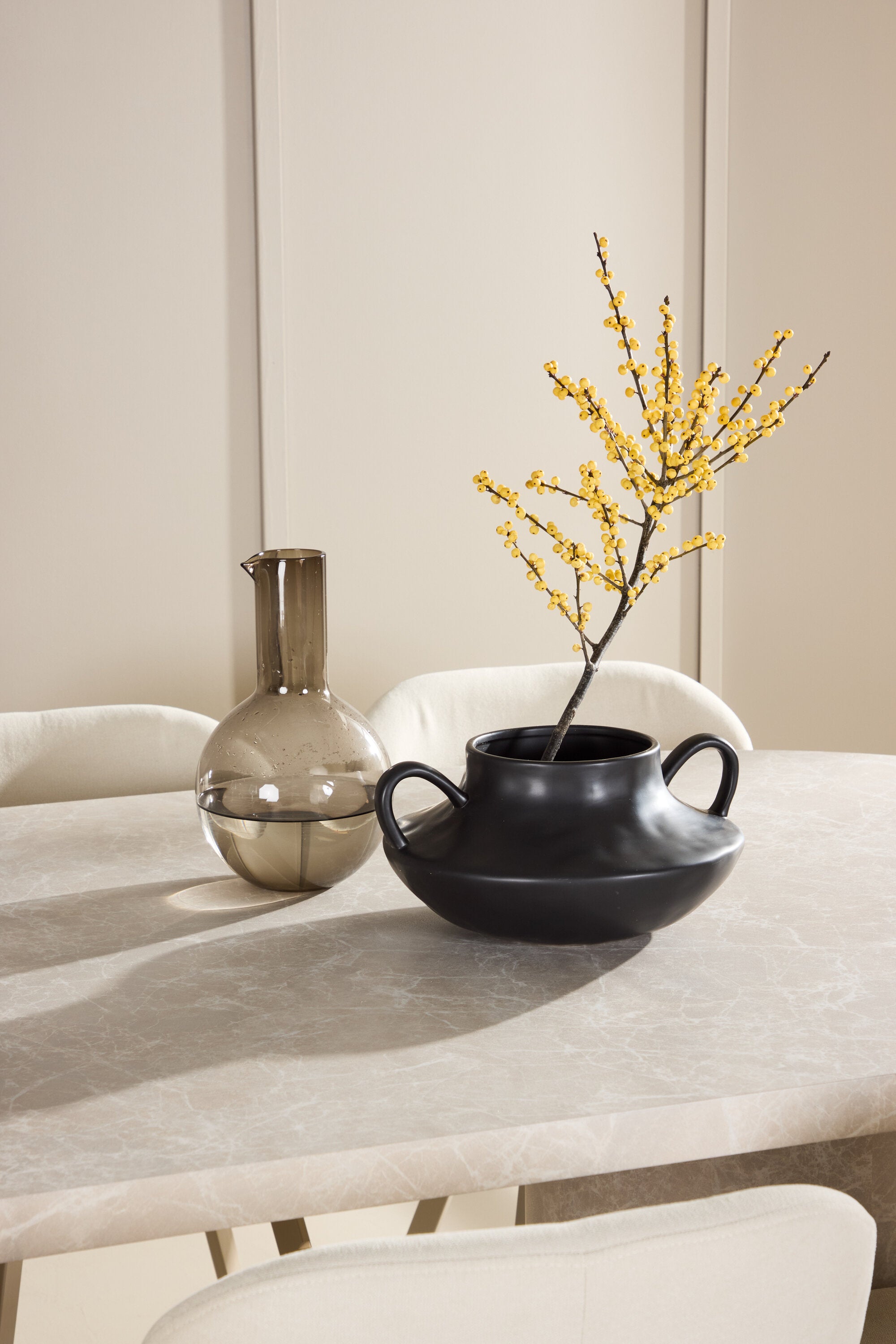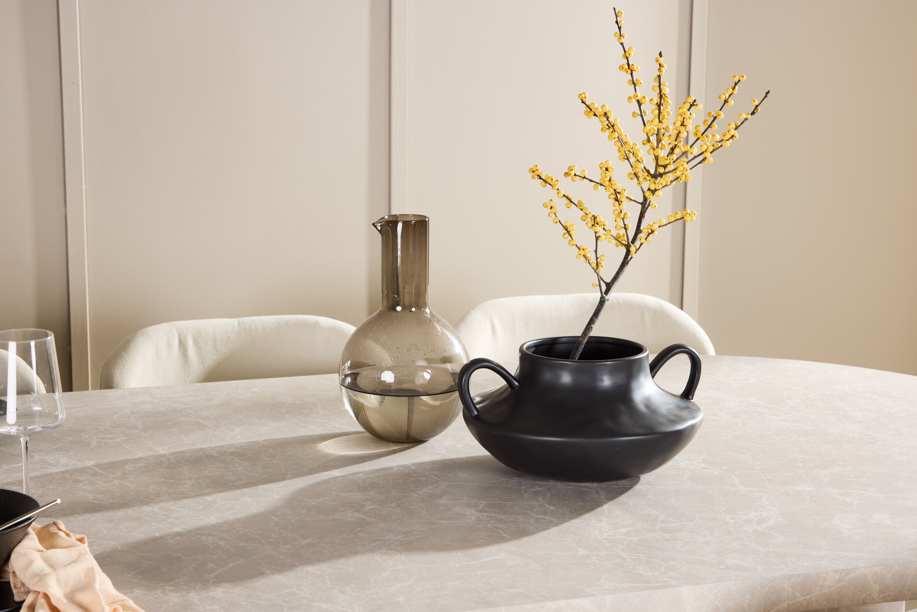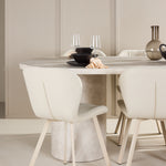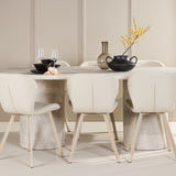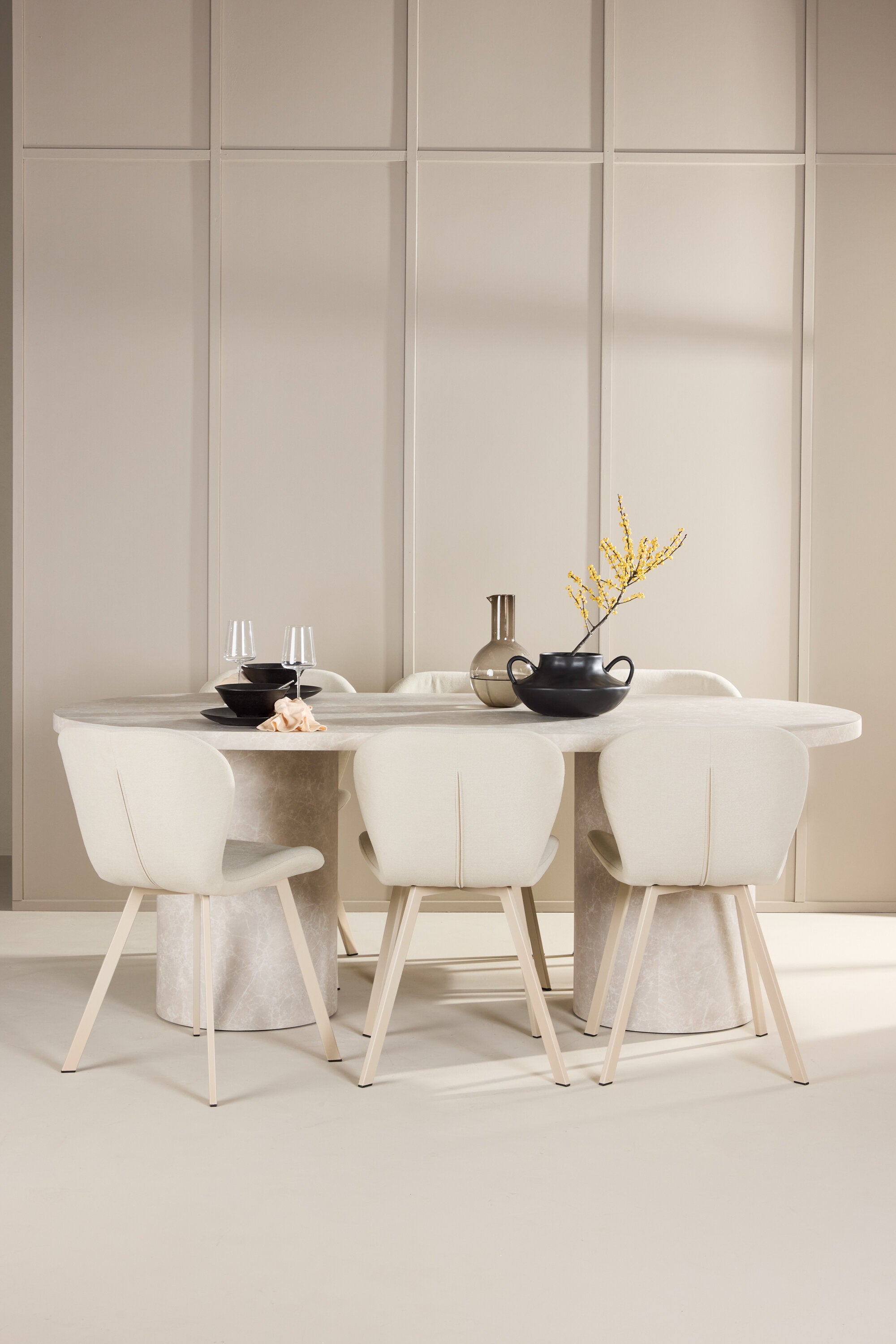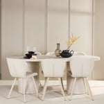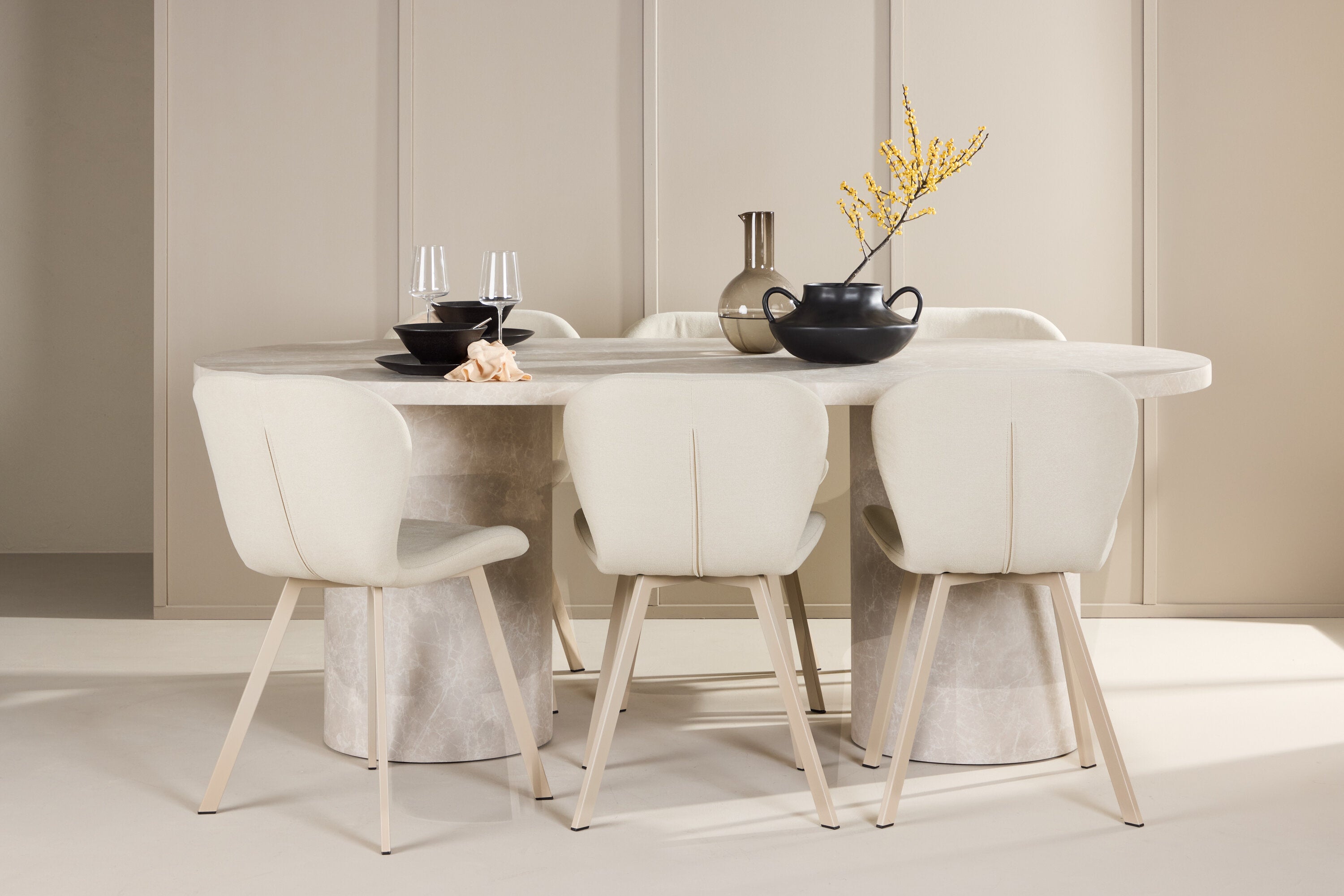 Ke stolu se hodí jídelní židle Lilja, navržená tak, aby svým měkkým béžovým čalouněním dodala teplo a příjemný pocit. Díky neutrální barvě je židle univerzální a lze ji snadno spárovat s různými styly dekorů. Ergonomicky navržená pro pohodlí, Lilja má podpůrné opěradlo a velkoryse polstrované sedadlo, které zajišťuje pohodlný zážitek během dlouhých jídel.