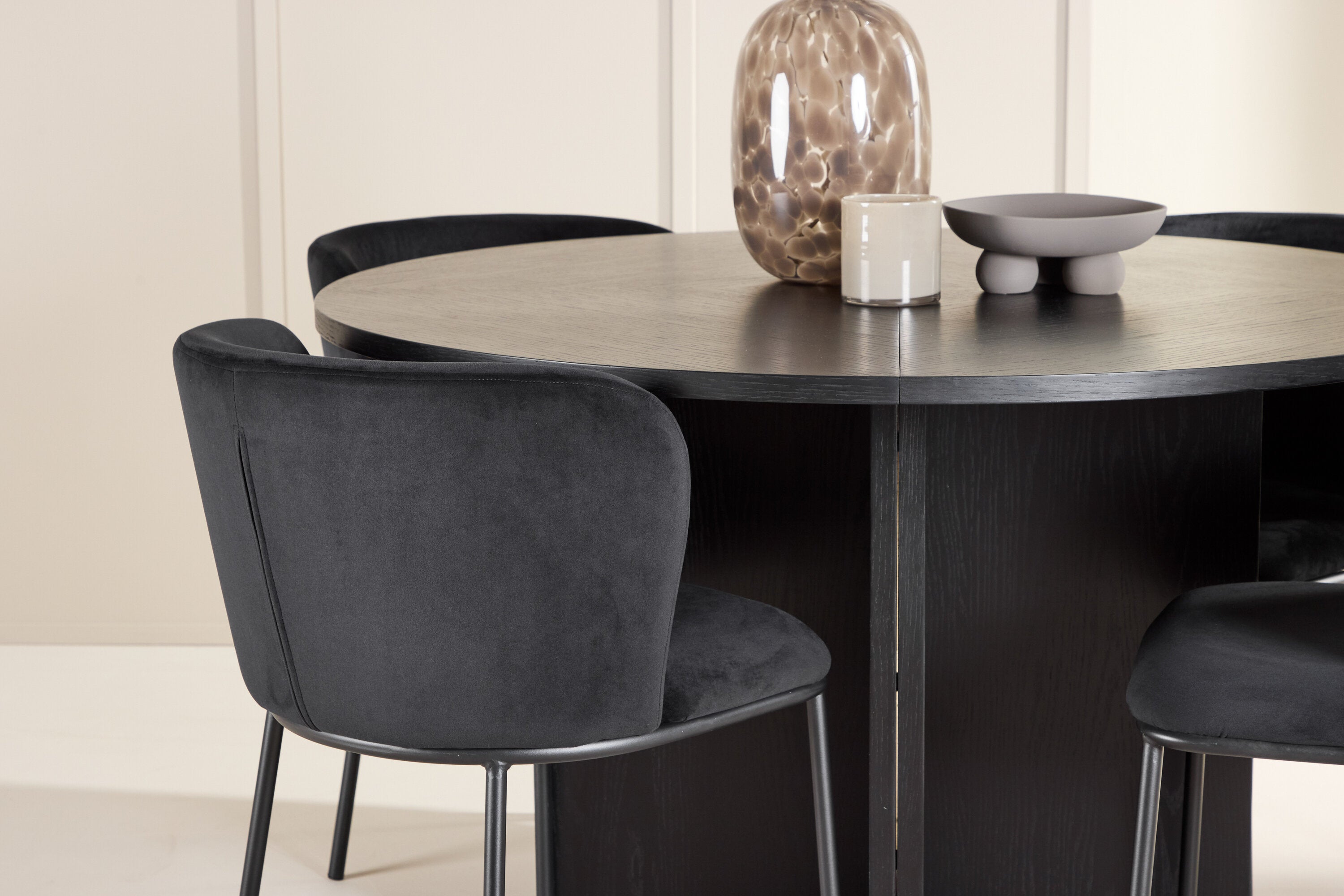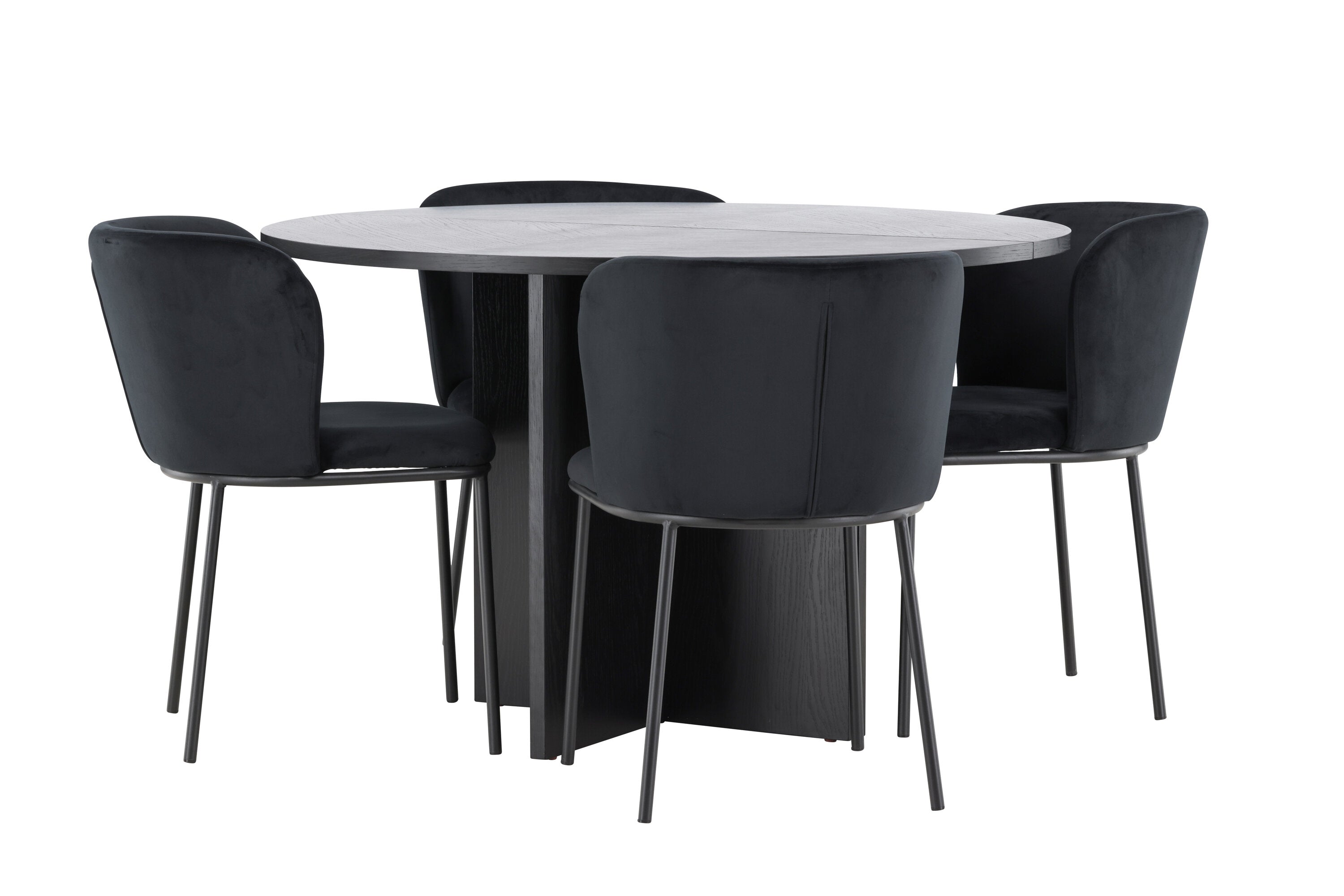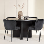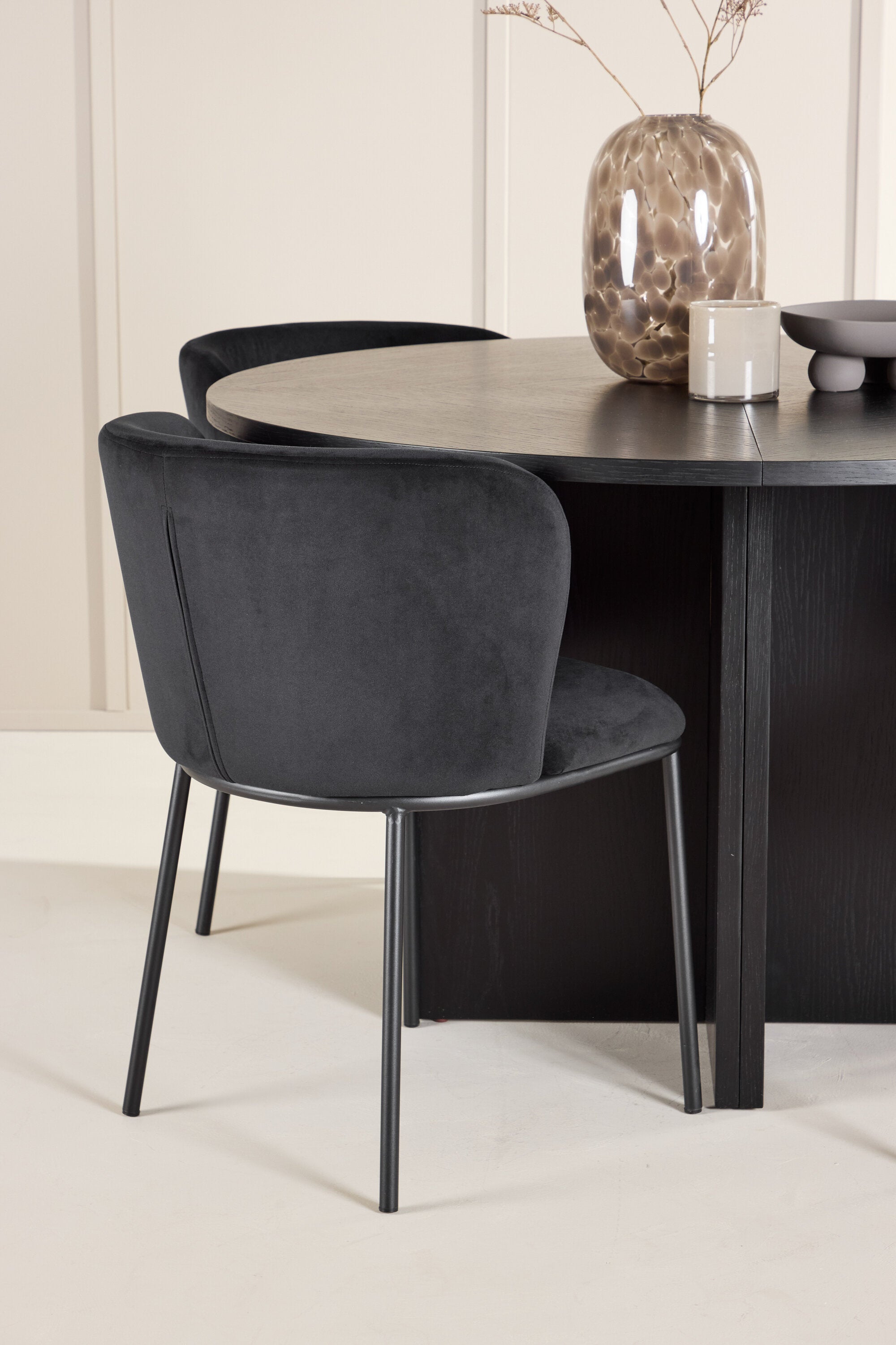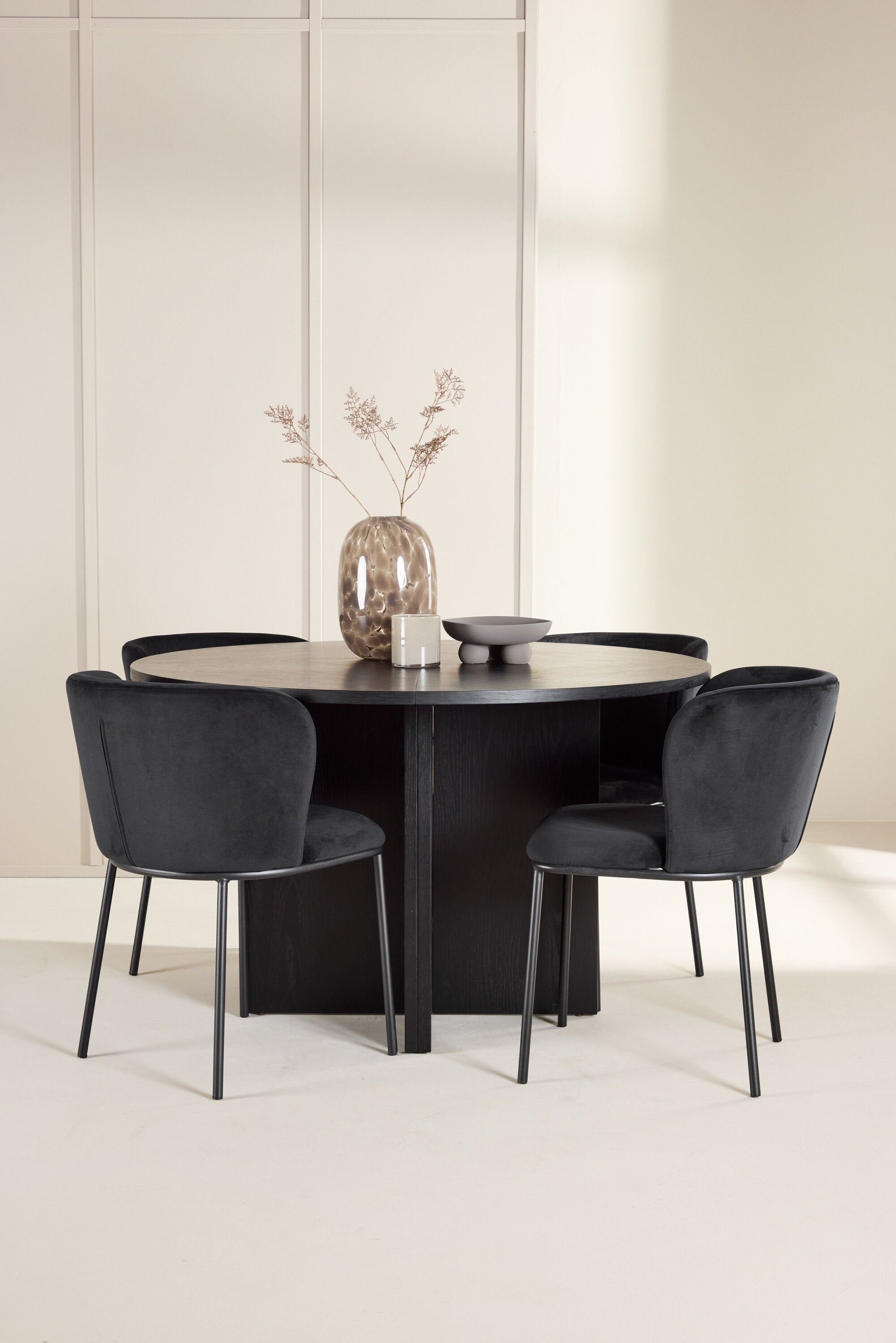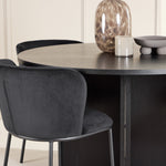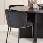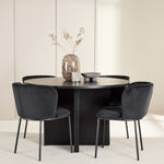 Jídelní židle Edina jsou čalouněny luxusním černým sametem, který dodává bohatý a příjemný nádech. Hluboký černý tón přináší nádech půvabu, zatímco jemný sametový povrch zajišťuje výjimečné pohodlí. Židle jsou navrženy s ohledem na estetiku i ergonomii a jsou ideální pro každodenní stolování i společenská setkání.