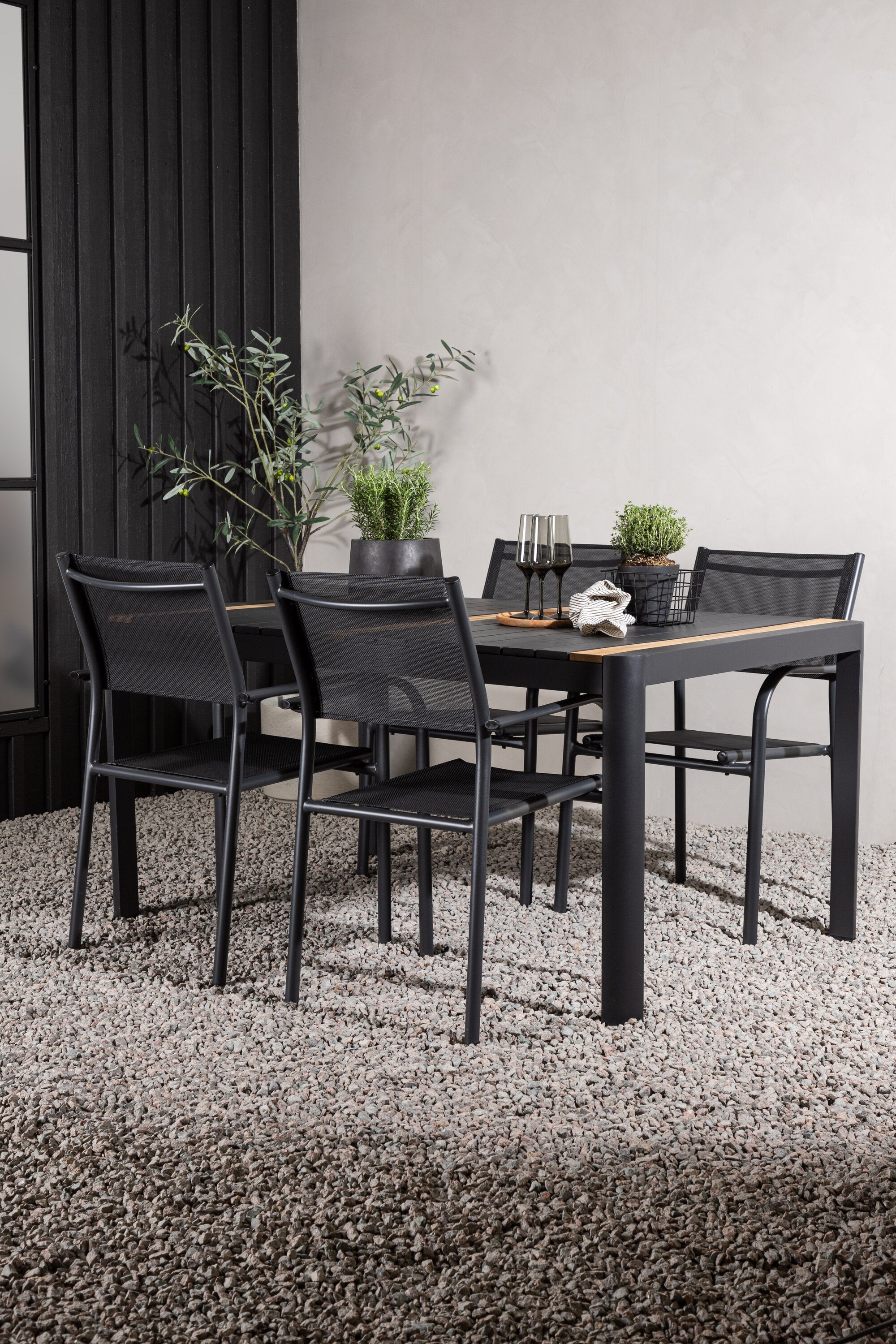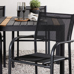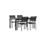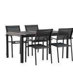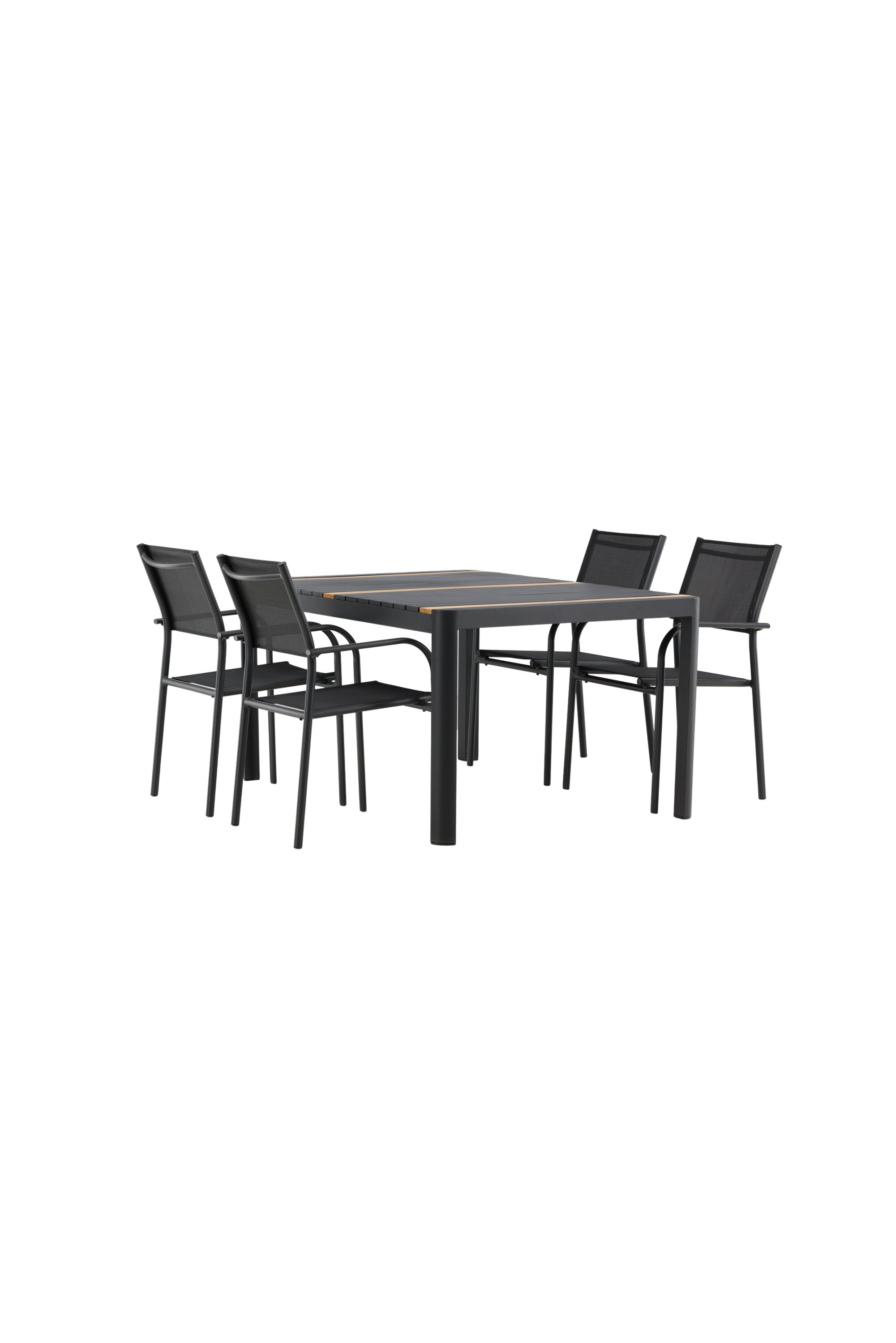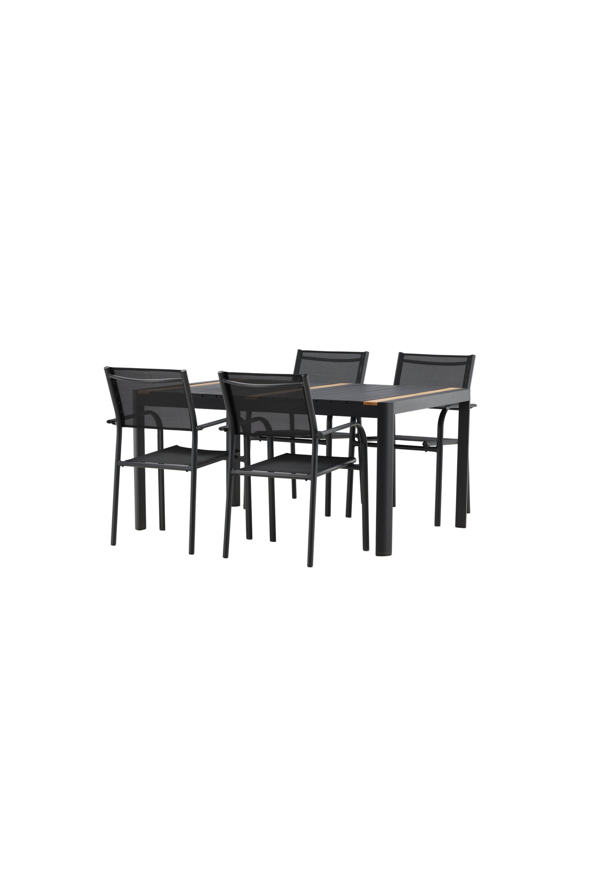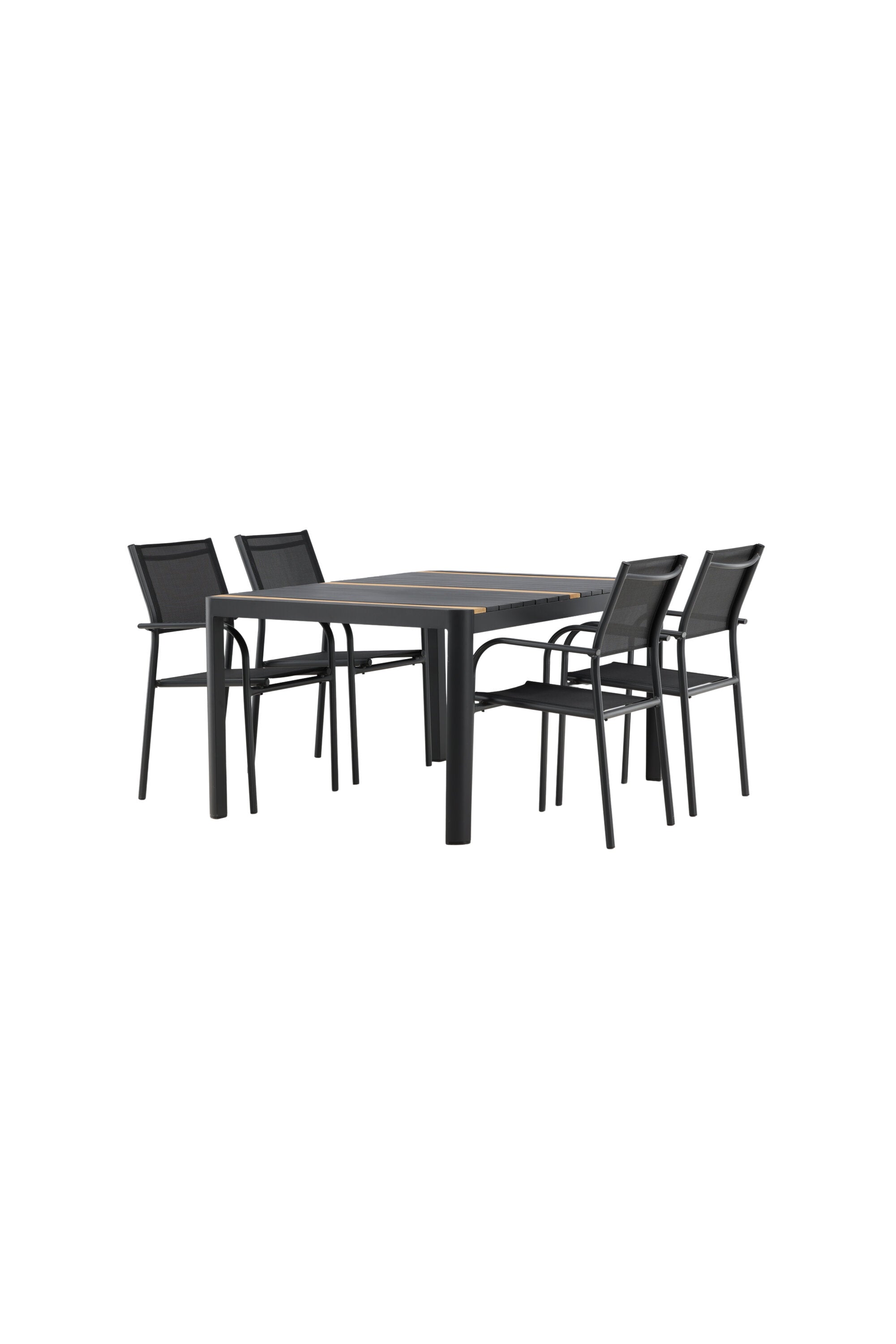 Togo - Jídelní stůl - Černá / Teak - Allu / Teak - 150*100 _1+ křeslo Santorini (stohovatelné) - Černá alu / Černá textilie _4