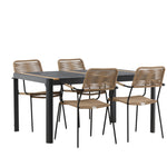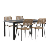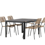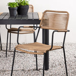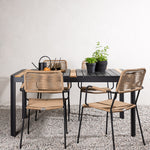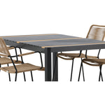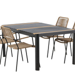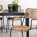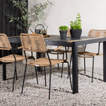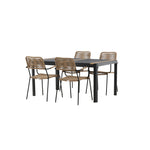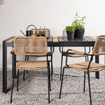 Stylový, odolný a elegantní – skupina potravin, kde má každý pravdu! Jídelní stůl Togo má vkusnou verzi s obdélníkovou stolní deskou v černé a teakové barvě dřeva a podvozkem v černém hliníku. Přímý severský design je klasický i nadčasový. Rozměry: 150x100 cm. Zde v moderní kombinaci s jídelními židlemi v barvě latte ze série Lindos. Židle mají stylové úzké nohy a integrované područky z černé oceli a sedák z odolného béžového lana. Zemitá barva působí na nábytek hřejivým dojmem. Pozvěte dopředu na mnoho příjemných jídel!