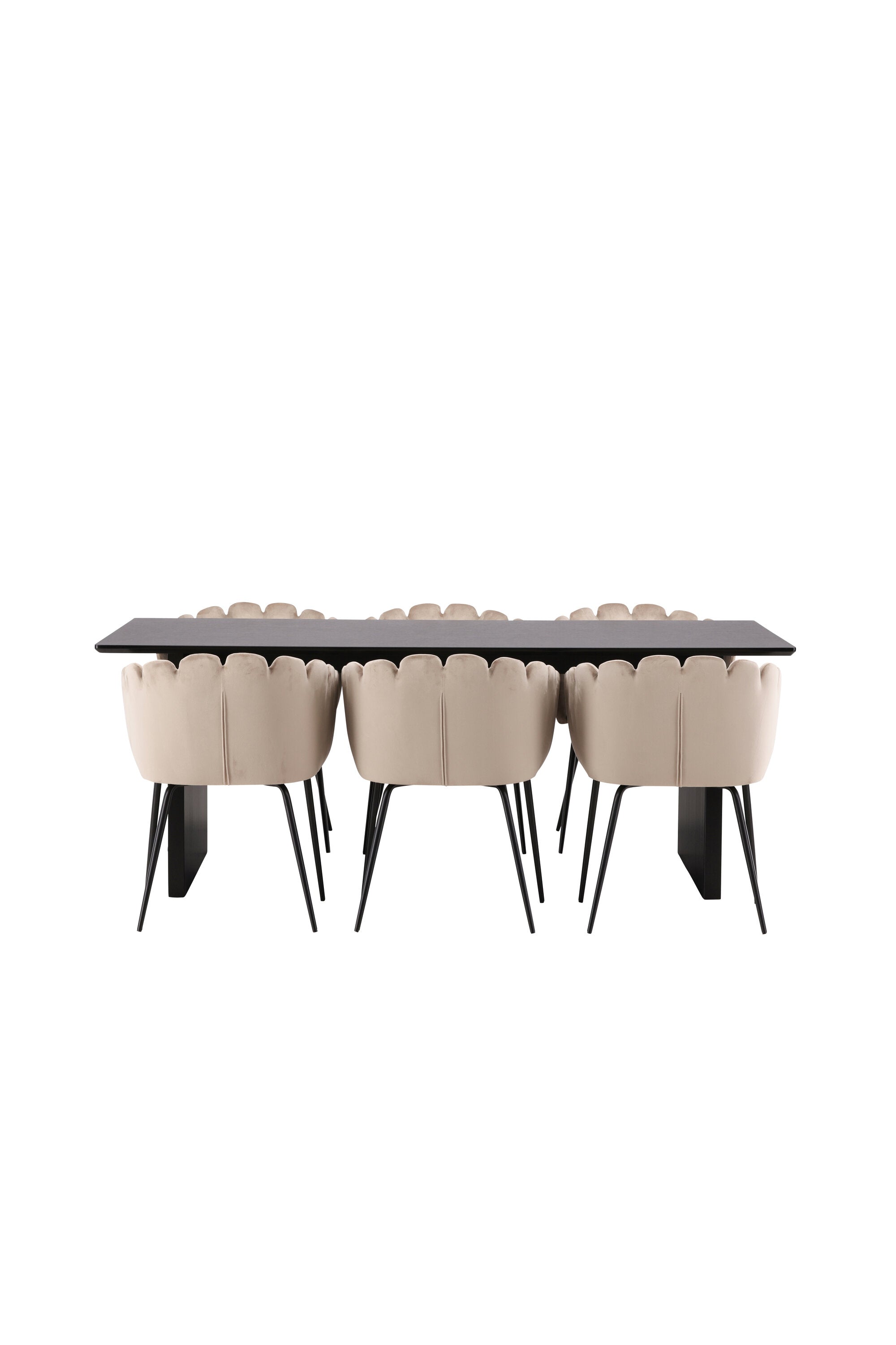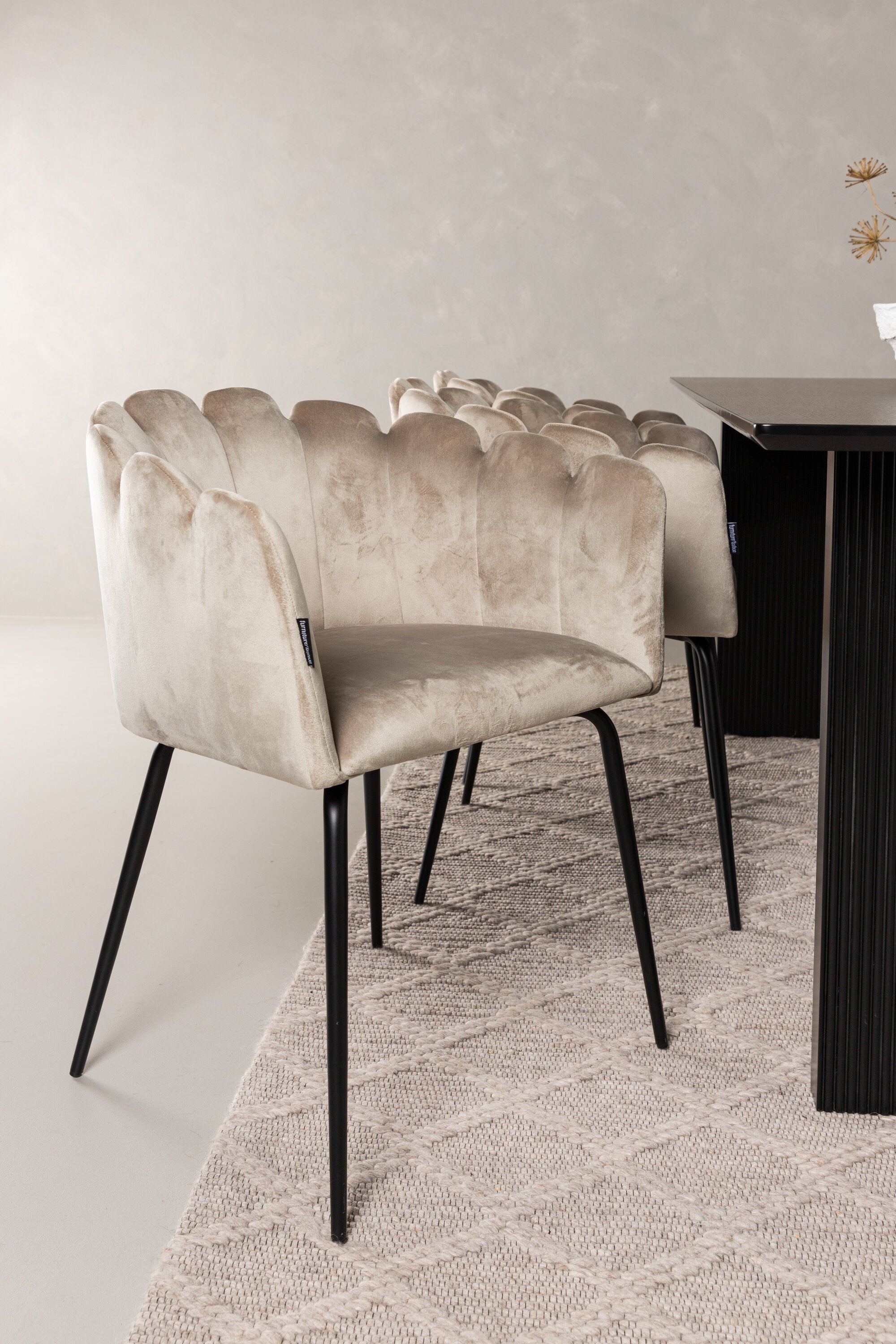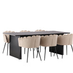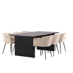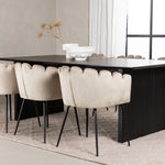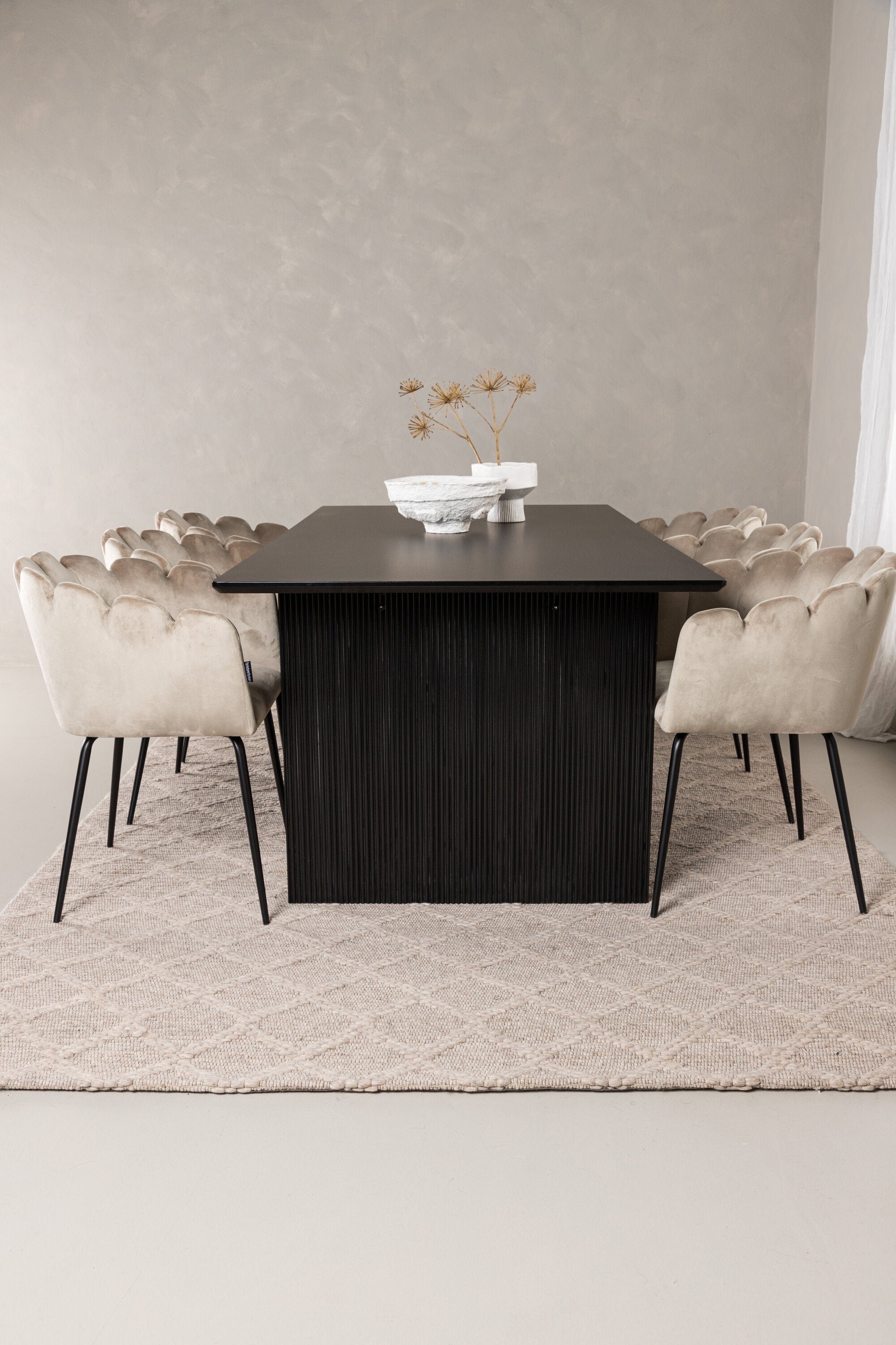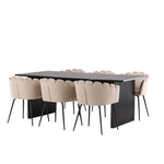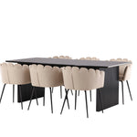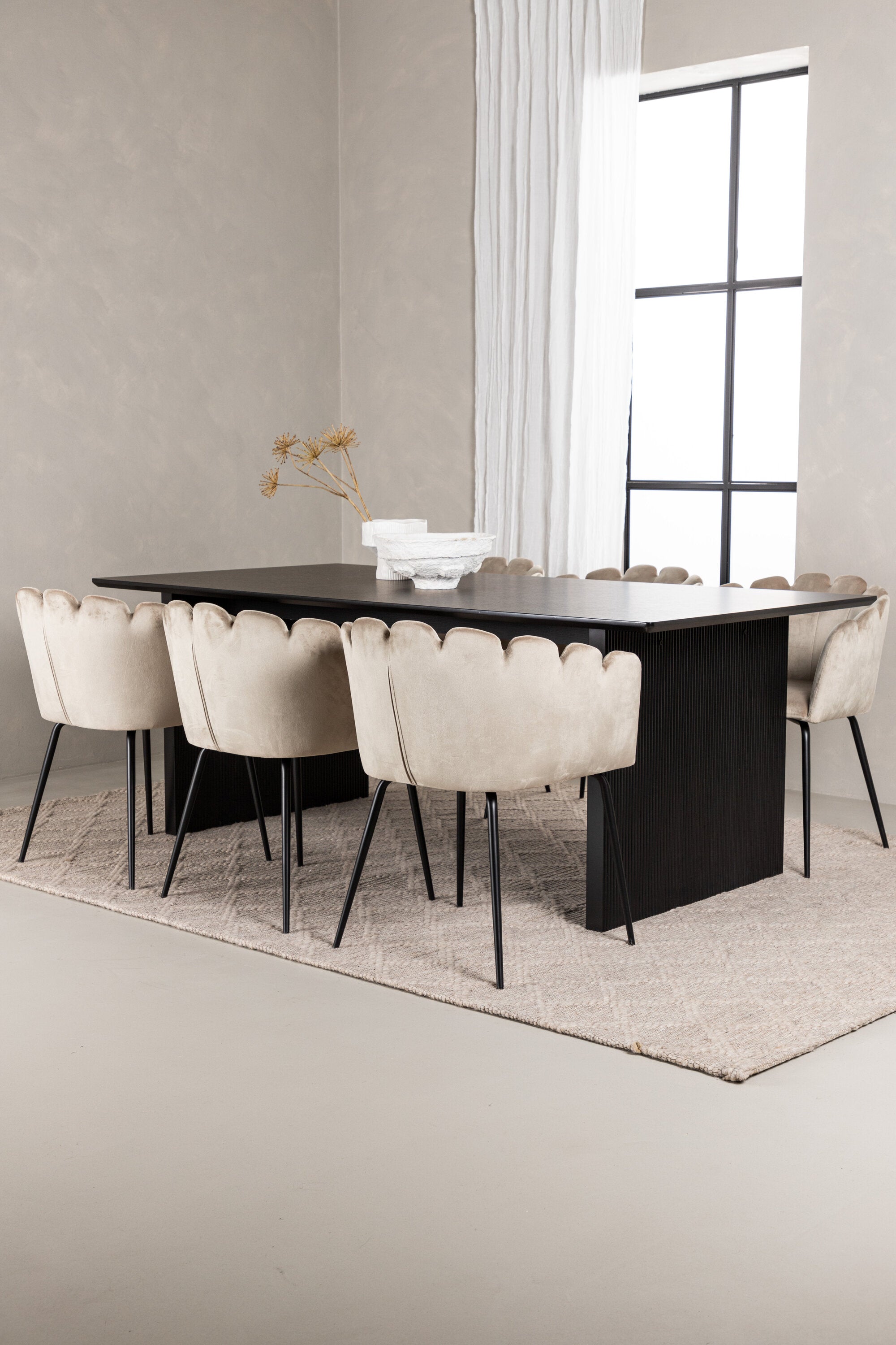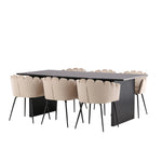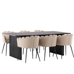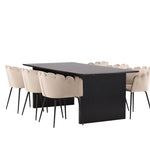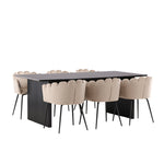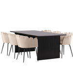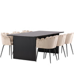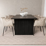 Zařiďte srdce svého domova půvabně a lákavě! Náš obdélníkový jídelní stůl ze série Vail má rovné severské tvary a je vyroben z odolné MDF v ušpiněné černé barvě. Deska stolu je tenká a balancuje na dvou pevných dřevěných deskách, které tvoří podvozek – stejně úhledné a odolné. Zde společně s jídelními židlemi ze série Limhamn v luxusní béžové barvě. Židle je moderním favoritem mnoha domácností se svým lákavým designem, ozdobným opěradlem ve tvaru mušle s ozdobným prošíváním a kulatým sedákem z vkusné béžové sametové látky. Nohy jsou z kovu s černou práškovou barvou. Pohodlně se usaďte a užívejte si!