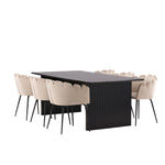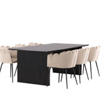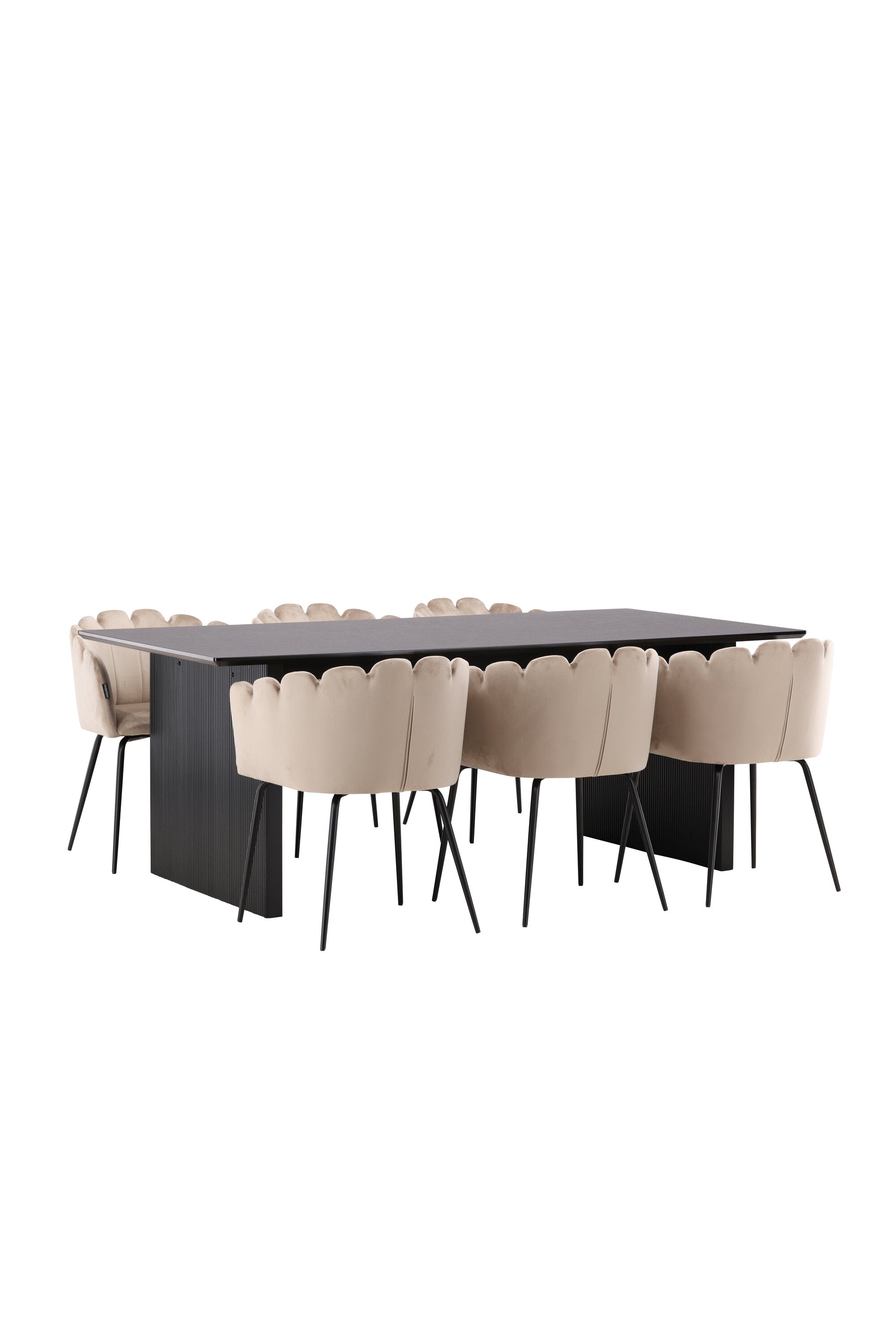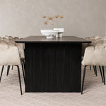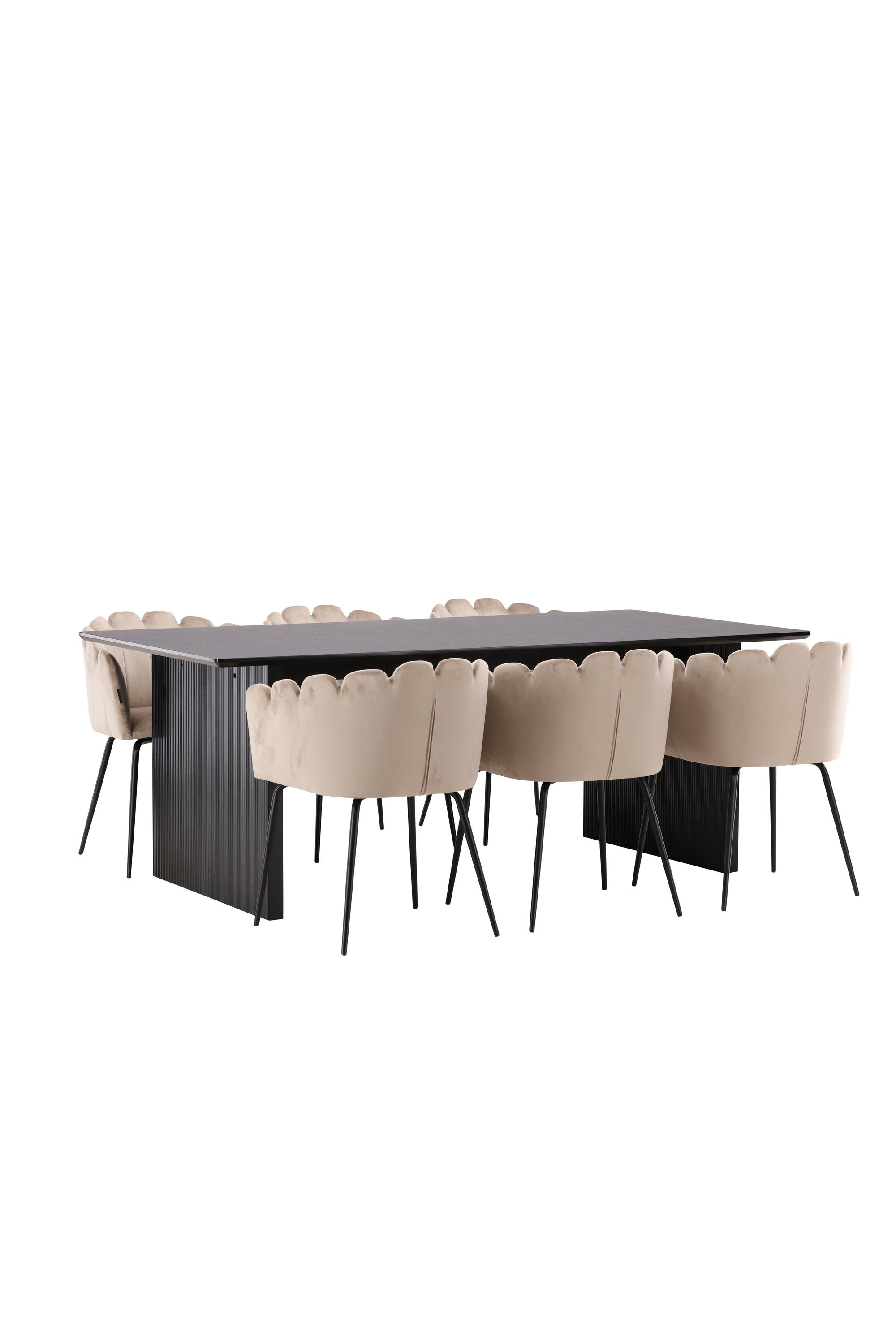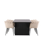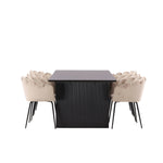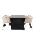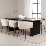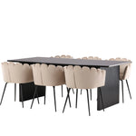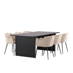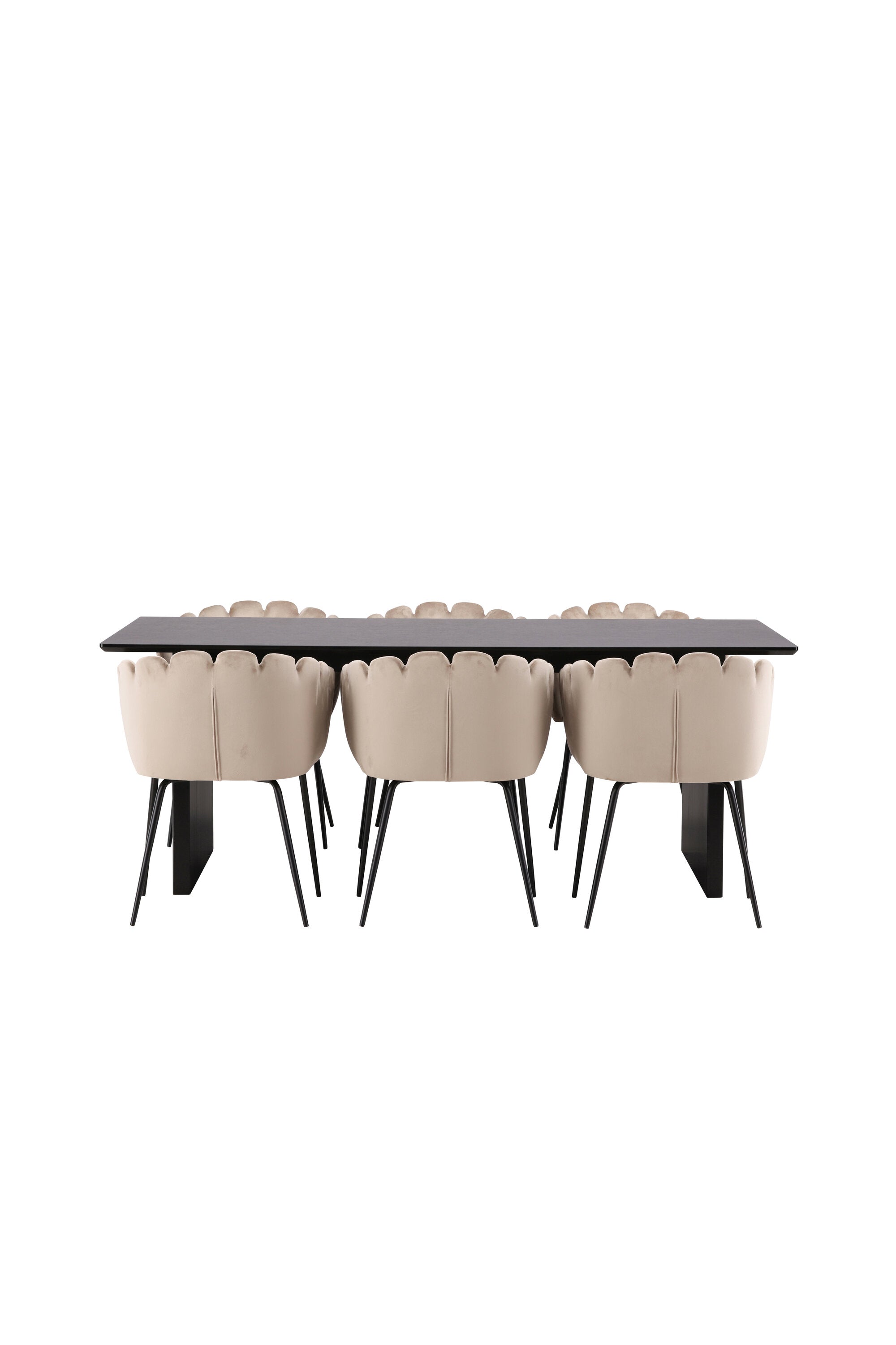 Zařiďte srdce svého domova půvabně a lákavě! Náš obdélníkový jídelní stůl ze série Vail má rovné severské tvary a je vyroben z odolné MDF v ušpiněné černé barvě. Deska stolu je tenká a balancuje na dvou pevných dřevěných deskách, které tvoří podvozek – stejně úhledné a odolné. Zde společně s jídelními židlemi ze série Limhamn v luxusní béžové barvě. Židle je moderním favoritem mnoha domácností se svým lákavým designem, ozdobným opěradlem ve tvaru mušle s ozdobným prošíváním a kulatým sedákem z vkusné béžové sametové látky. Nohy jsou z kovu s černou práškovou barvou. Pohodlně se usaďte a užívejte si!